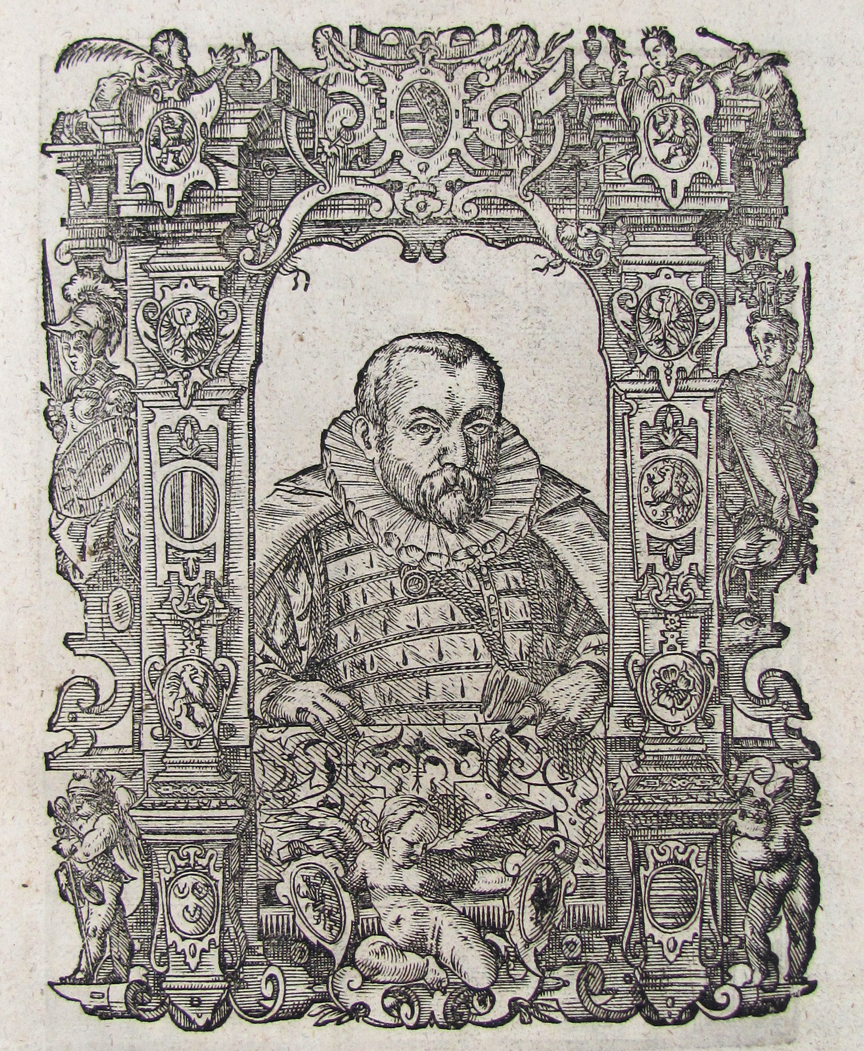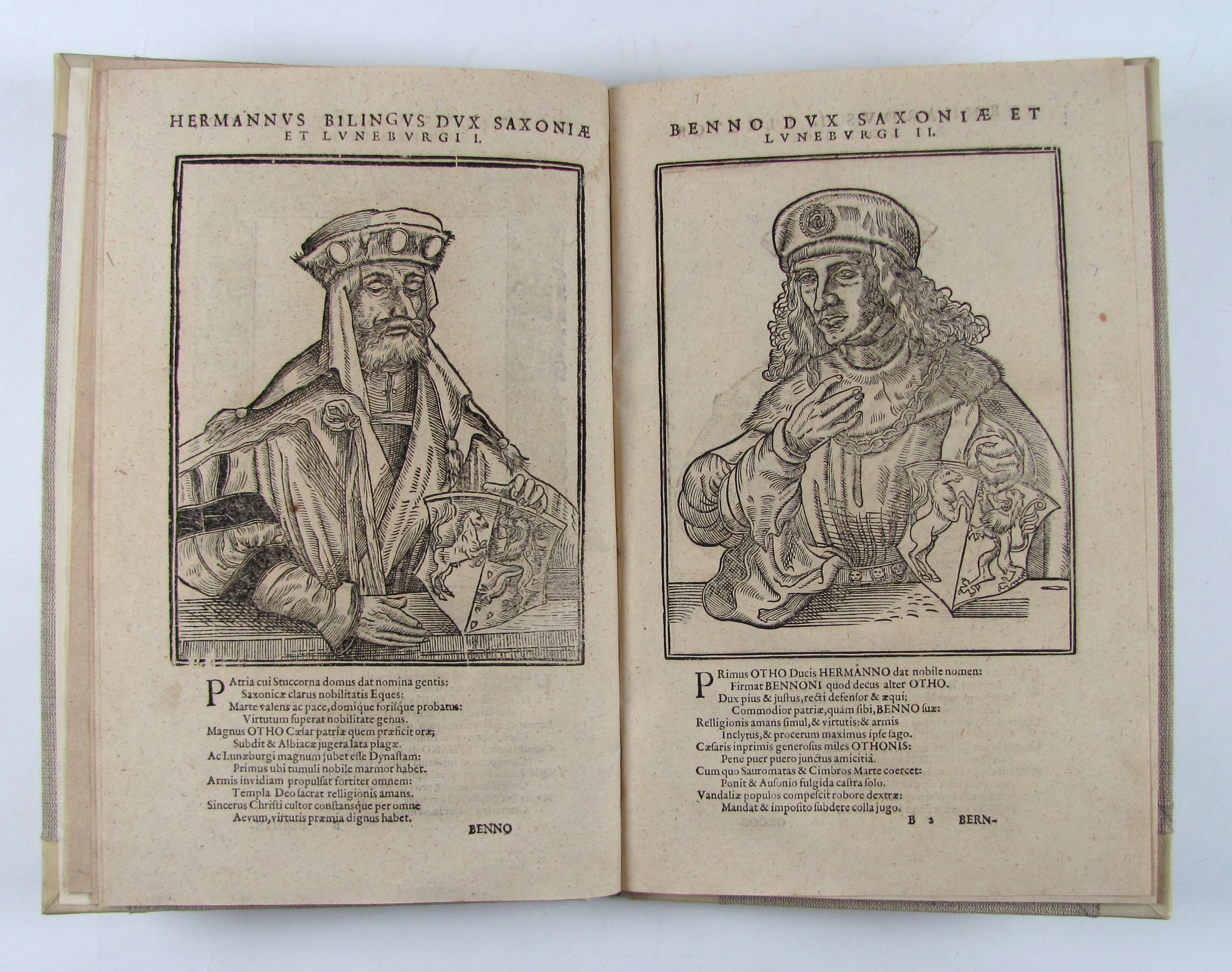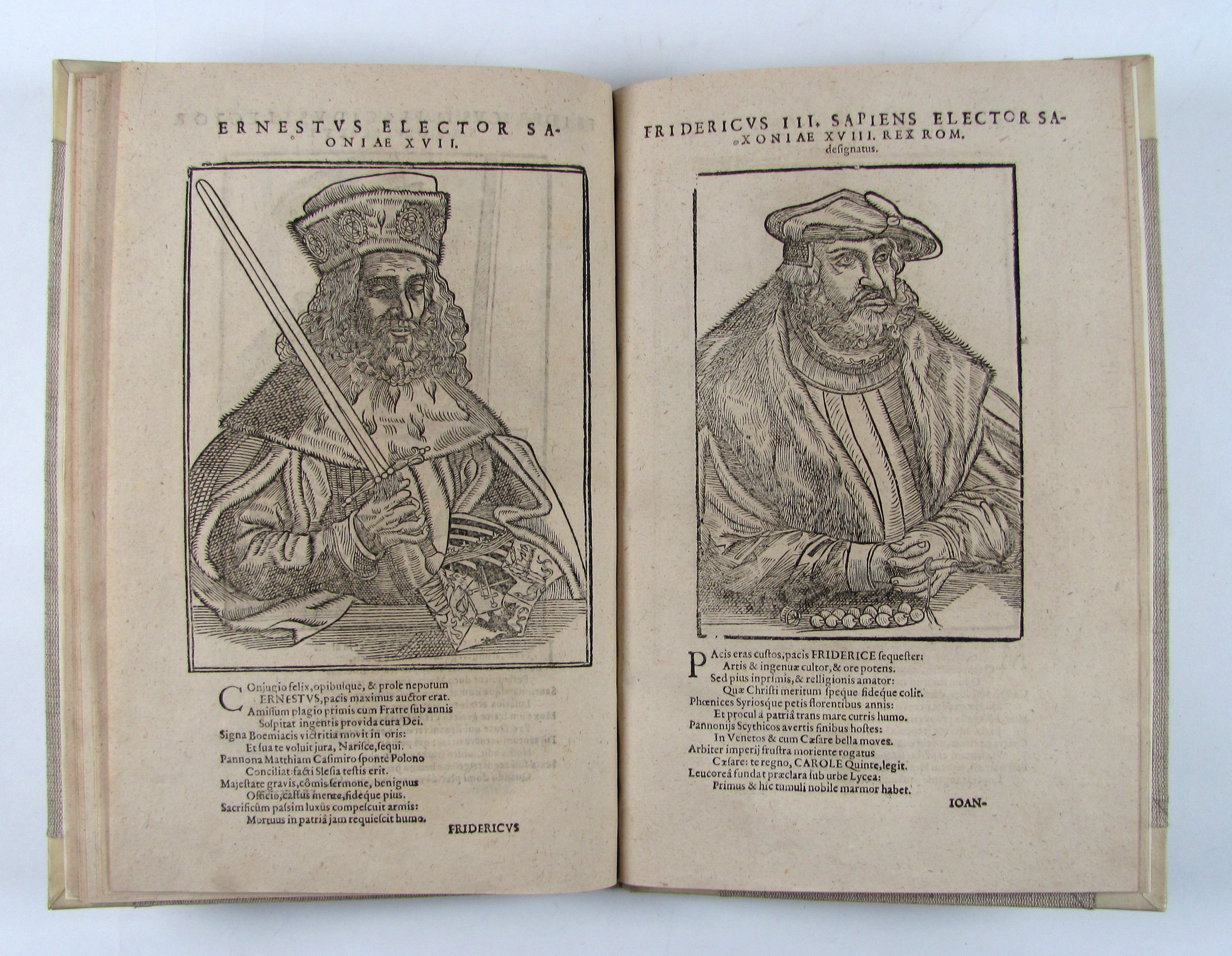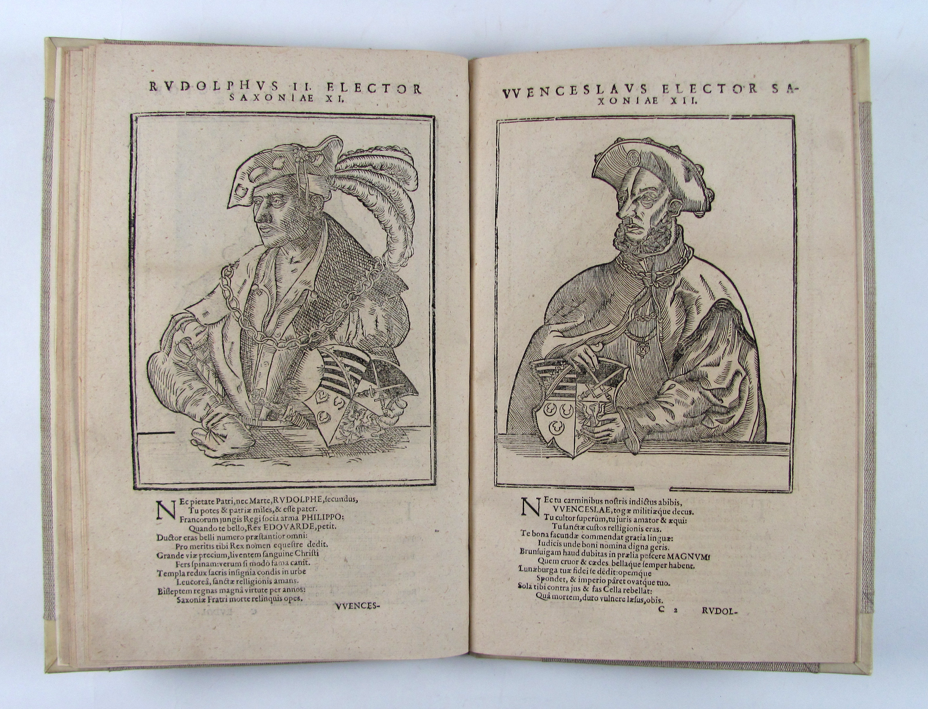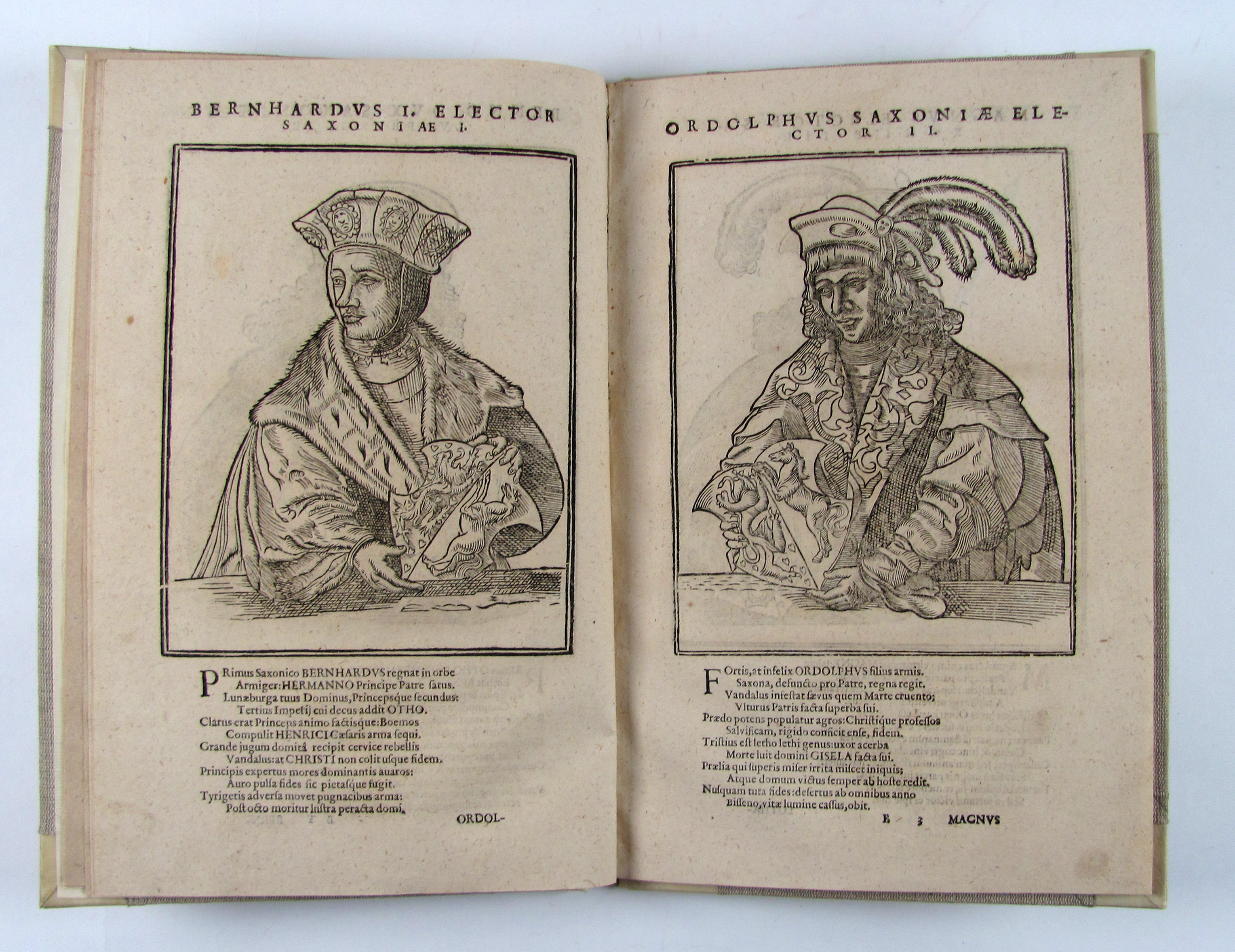 Erste Ausgabe des Porträtwerks der sächsischen Herrscher von Heinrich I. (876-936), über Friedrich III. den Weisen (1463-1525) bis zu Johann Ernst dem Jüngeren von sachsen-Weimar (1594-1626). „Die Bildnisse entsprechen denen der Porträtsammlung Gabriel Schnellholz zu Wittenberg“ (Lipperheide Da 5). Die Urheberschaft der Porträts wird Lukas Cranach d.J. zugeschrieben, da sie mit den Porträtgemälden der Cranach-Sammlung im Schloss Ambras bei Innsbruck weitgehend übereinstimmen. Drei Schnitte sind mit „C.K.“ monogrammiert. Dieser ist nach Nagler, Die Monogrammisten, II, 106, 299 ein „unbekannter Meister, welcher der Schule des jüngeren Lukas Cranach angehört, und um 1590-1610 in Sachsen thätig war“ Die leer gebliebenen Rahmen waren für die Porträts von Otto II. und Heinrich II. vorgesehen.– Das vorliegende Werk erschien sowohl einzeln und selbstständig (VD 16, R 1425) , als auch als 2. Teil (von 4) in G. Fabricius’ „Originum illustrissimae saxonica…“, VD 16, F 332).– Schönes Exemplar, sauber und mit nur leichter Papierbräunung. Das Blatt A 6 verbunden.– BM, STC 296. Adams R 412.