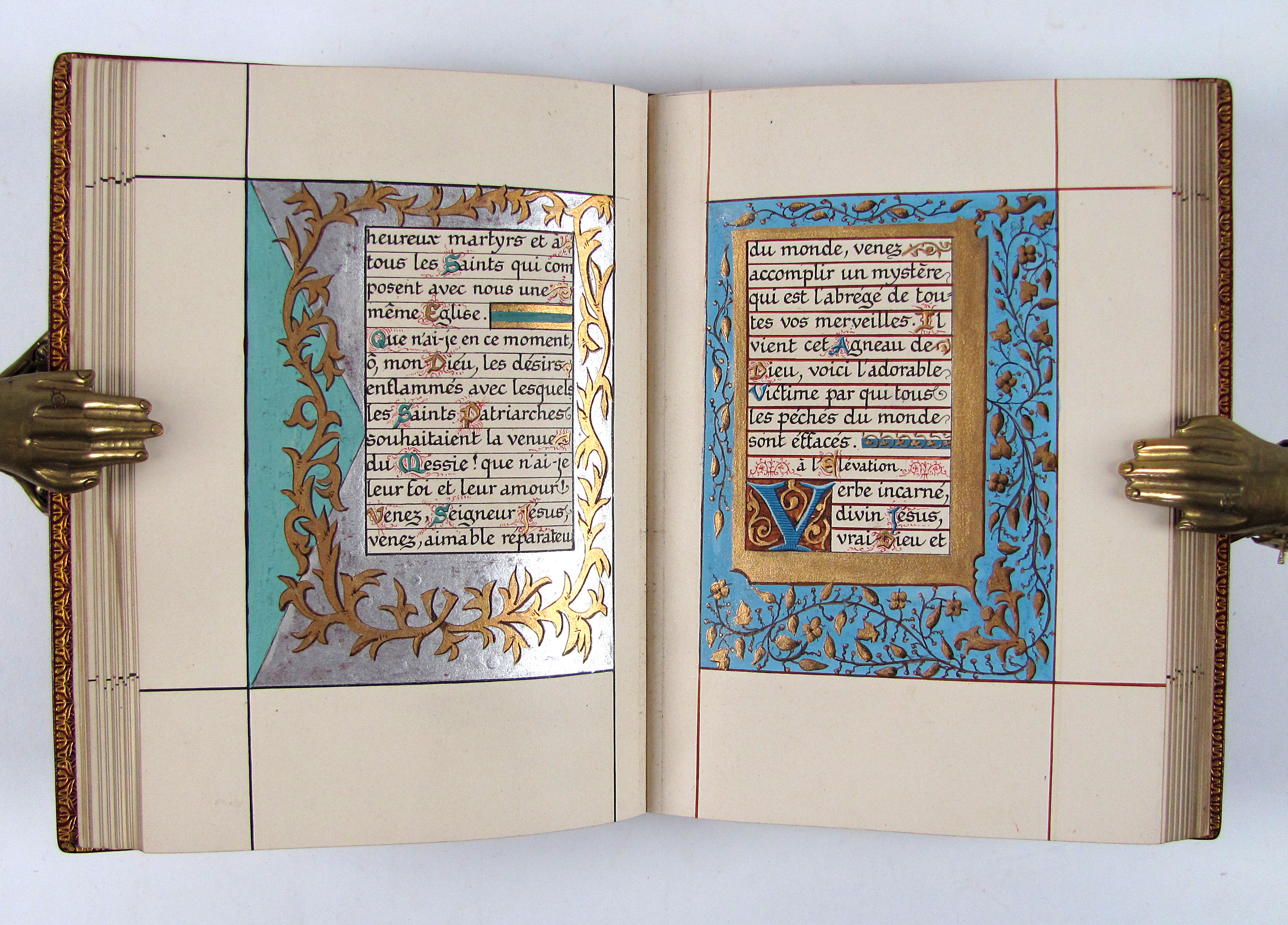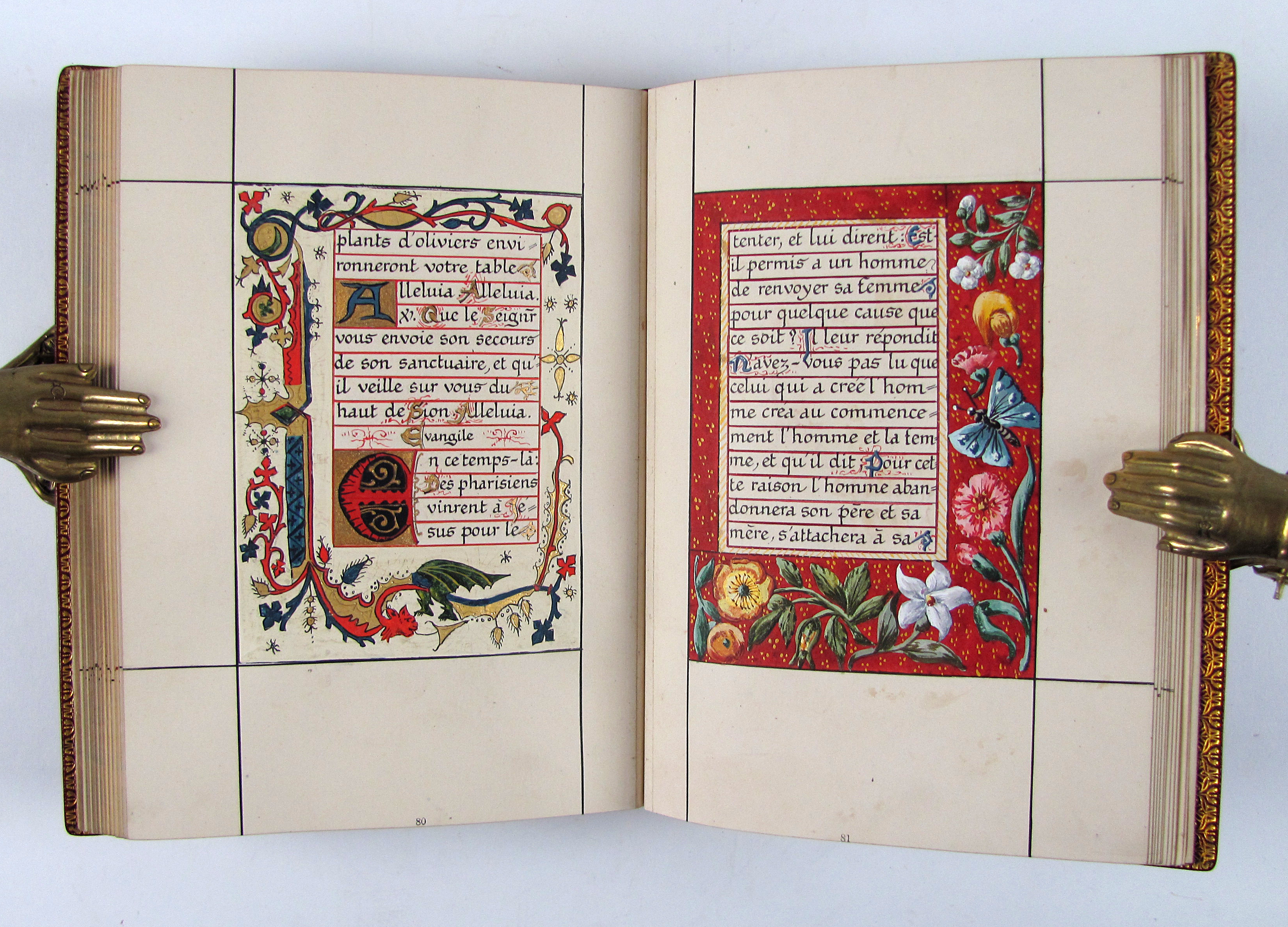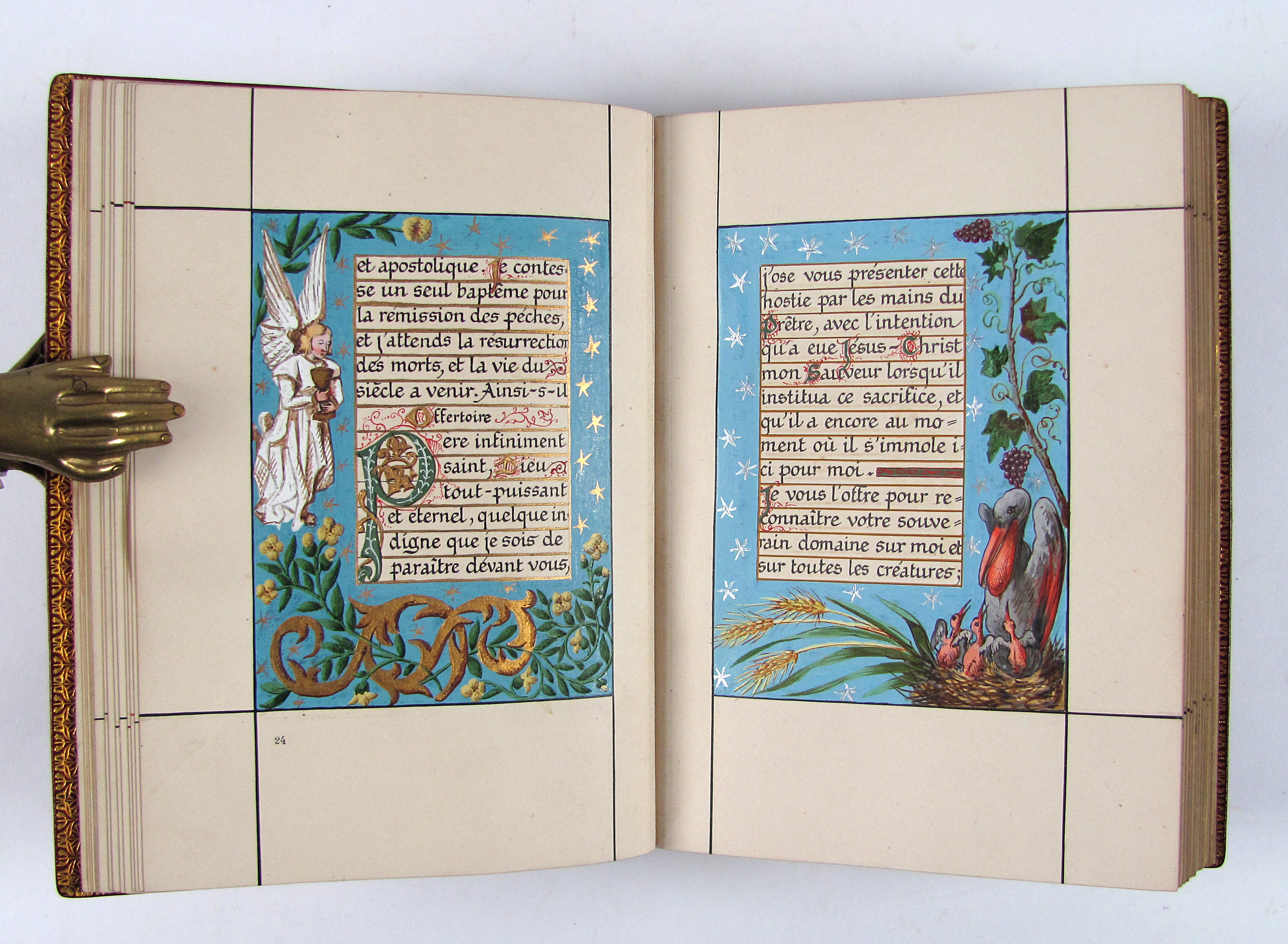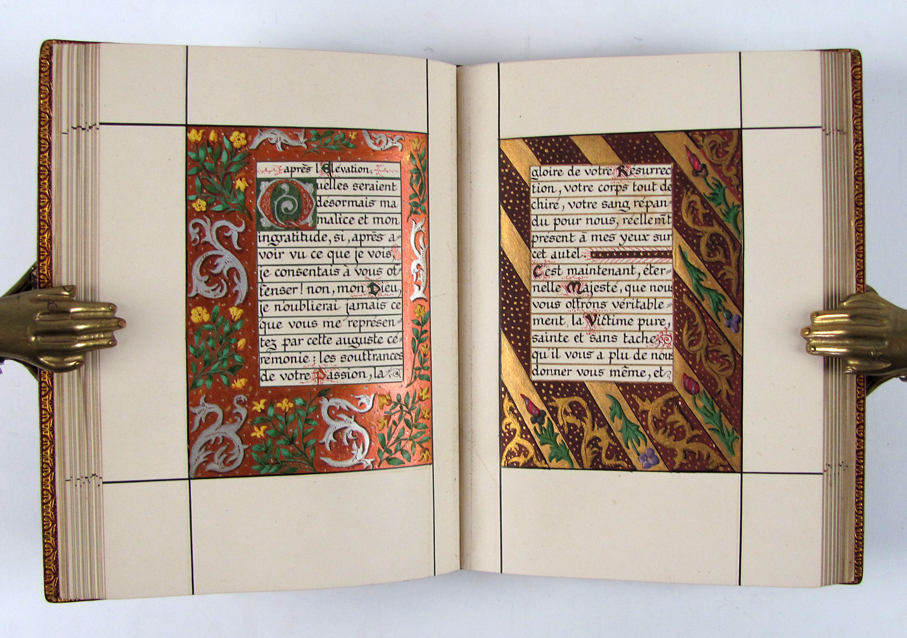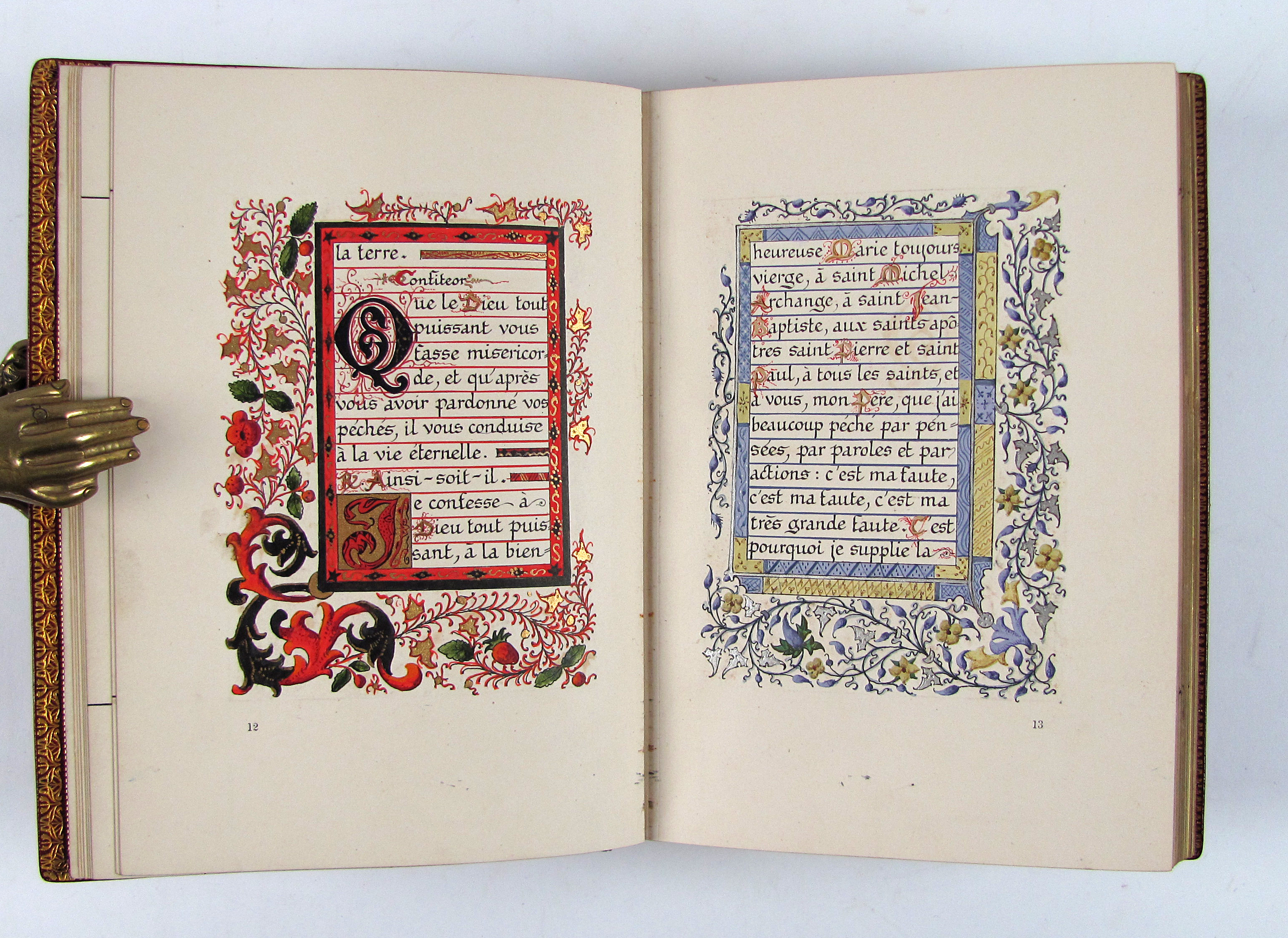 Prächtiges Stundenbuch im Stil der illuminierten Stundenbücher des 15. Jahrhunderts. Es handelt sich hier wohl um eine der frühesten Publikationen von Léon Cumer, der als Verleger mit „Paul & Virginie“ (1836) bekannt wurde und später vor allem auf dem Gebiet der Chromolithographie und Fotographie neue Druckverfahren voranbrachte (″Imitation de Jesus-Christ“, 1854, und „Évangiles des Dimanches“, 1864). Das vorliegende Stundenbuch besticht durch die sehr aufwändige, prächtige Illumination. Es wurden Exemplare auf Papier und Pergament schwarz-weiß gedruckt und sie wurden wahrscheinlich durch Künstler, die der Verlag entweder beschäftigte oder empfahl illuminiert. Dafür spricht die professionelle und ähnliche Ausführung des Kolorits, welches meist auch sehr reich mit Gold und Silber gehöht wurde. Im vorliegenden Exemplar sind die Silber- oder Goldaufträge oft zudem sehr sorgfältig punziert. Es gab aber kein festgelegtes Farbschema und die Ausführungen sind dadurch individuell. Das vorliegende Exemplar beispielsweise verfügt über eine fast durchgehende Reglierung, die bei einem Pergamentexemplar, welches ich zuletzt gehandelt habe, nicht vorhanden war. Da es sich bei dieser Art Bücher meist um Hochzeitsgeschenke handelte, hatte der Käufer die Möglichkeit, im Teil der „Céremonie de marriage“ und „Messe de marriage“ die Wappen des Brautpaars malen zu lassen, überdies sind am Ende drei Seiten für Familieneinträge vorgesehen. Von beiden Möglichkeiten haben die Vorbesitzer dieses Exemplares keinen Gebrauch gemacht, es findet sich aber eine Seite mit den kunstvoll verschlungenen Initialen „L.S. und „V.E“.– Von tadelloser Gesamterhaltung, Schuber und Chemise leicht berieben.