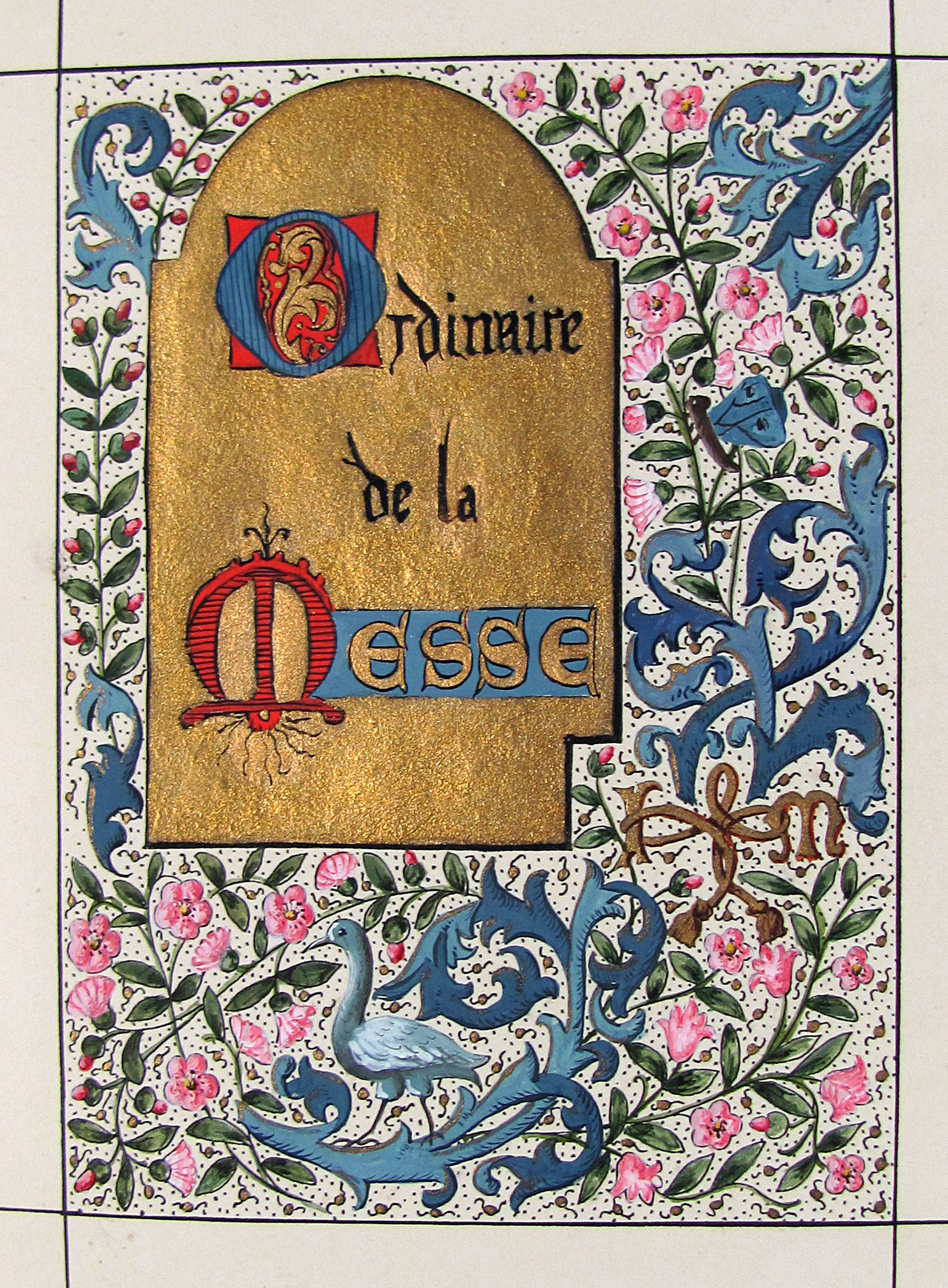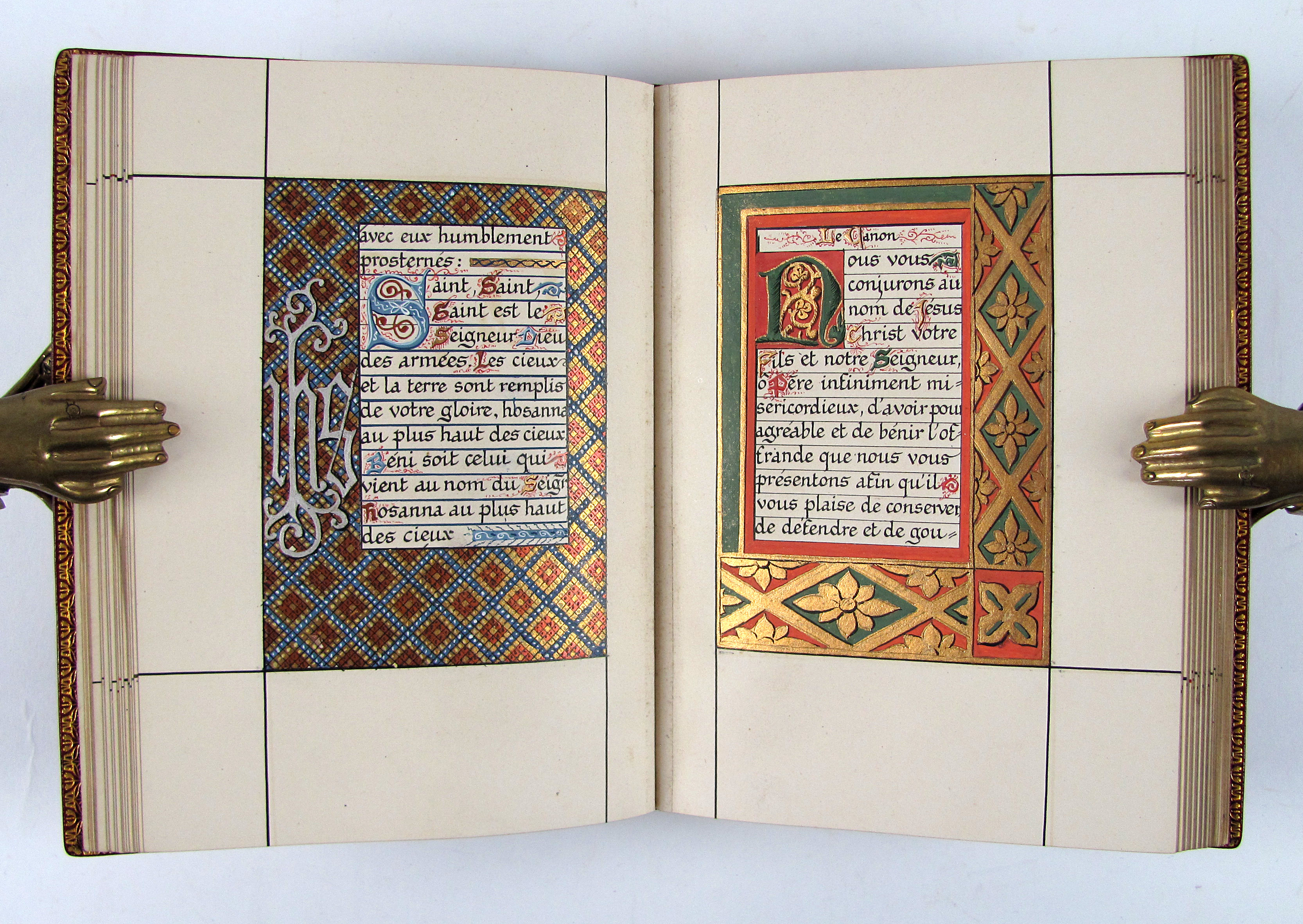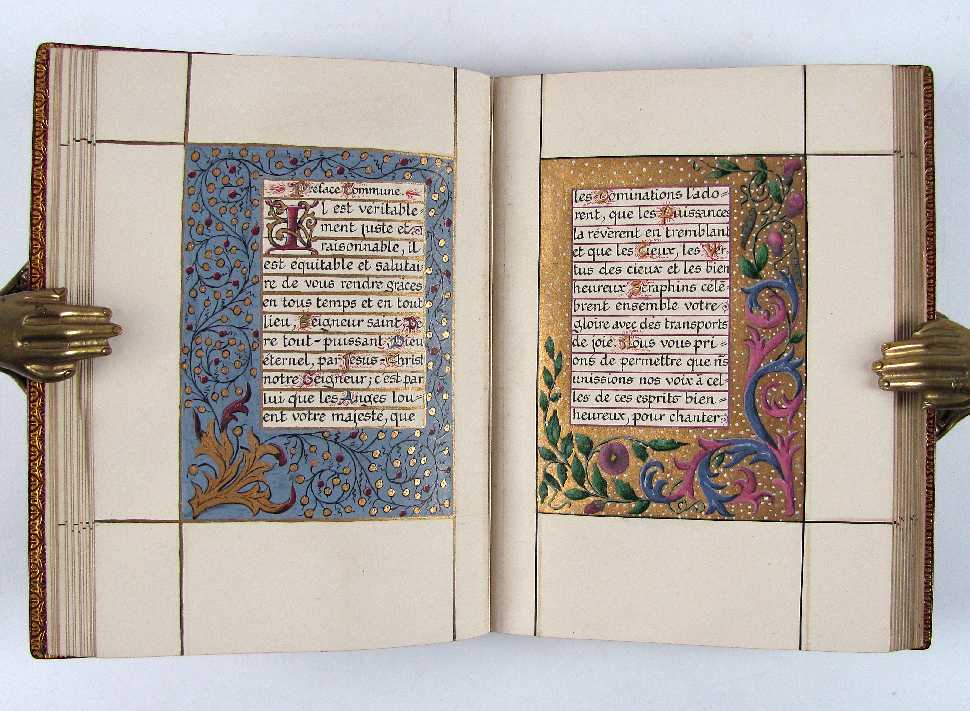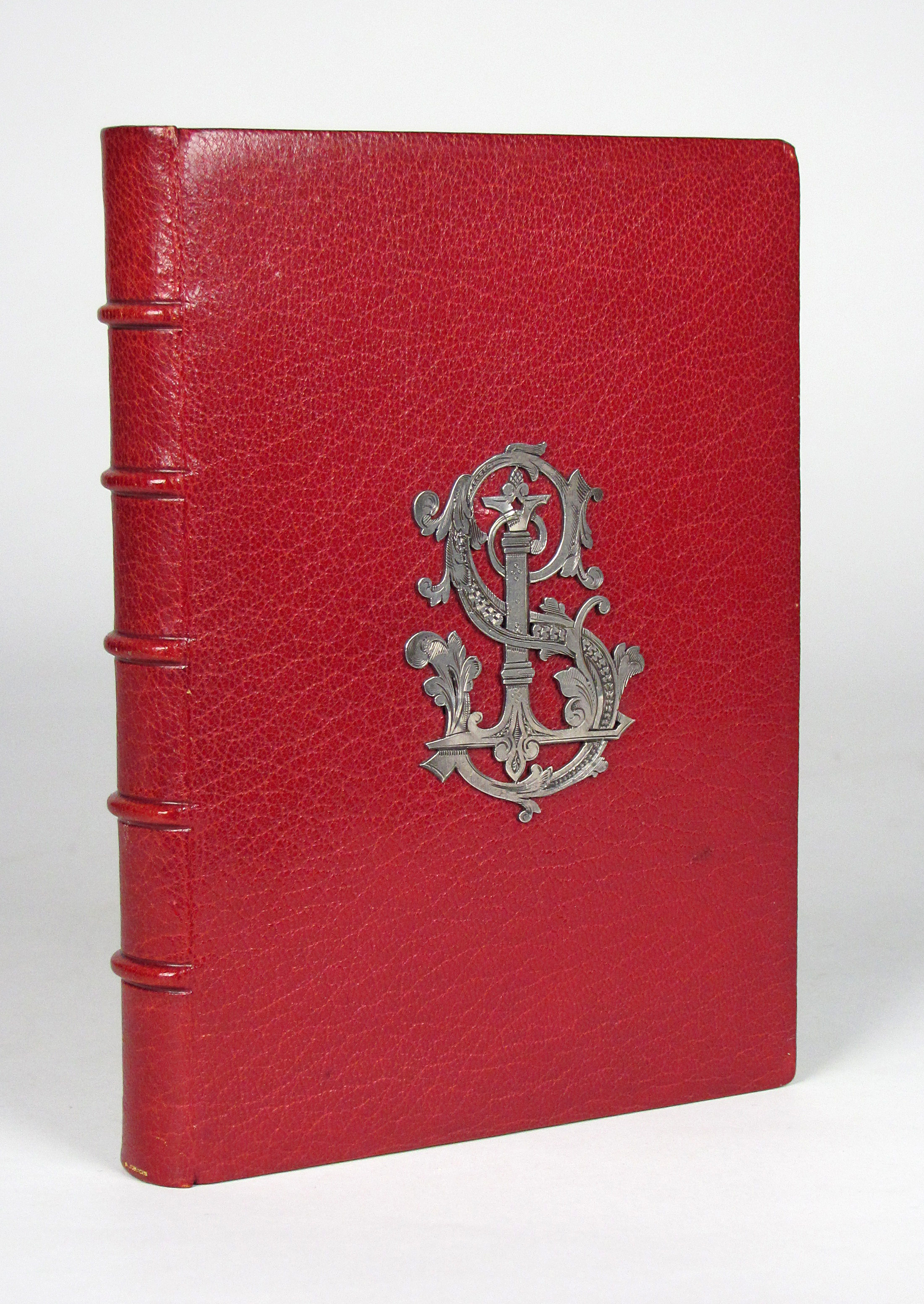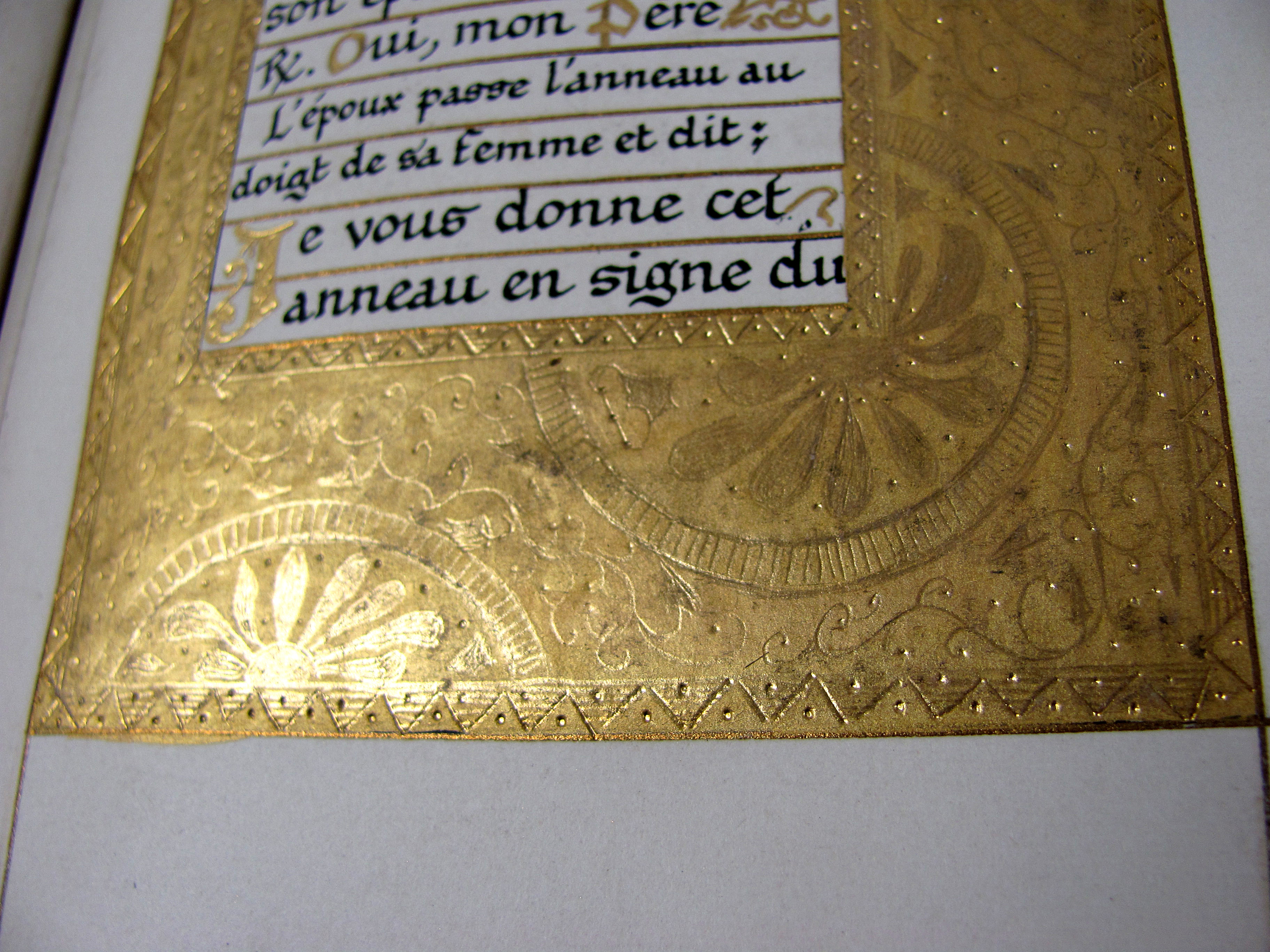 Prächtiges Stundenbuch im Stil der illuminierten Stundenbücher des 15. Jahrhunderts. Es handelt sich hier wohl um eine der frühesten Publikationen von Léon Cumer, der als Verleger mit „Paul & Virginie“ (1836) bekannt wurde und später vor allem auf dem Gebiet der Chromolithographie und Fotographie neue Druckverfahren voranbrachte (″Imitation de Jesus-Christ“, 1854, und „Évangiles des Dimanches“, 1864). Das vorliegende Stundenbuch besticht durch die sehr aufwändige, prächtige Illumination. Es wurden Exemplare auf Papier und Pergament schwarz-weiß gedruckt und sie wurden wahrscheinlich durch Künstler, die der Verlag entweder beschäftigte oder empfahl illuminiert. Dafür spricht die professionelle und ähnliche Ausführung des Kolorits, welches meist auch sehr reich mit Gold und Silber gehöht wurde. Im vorliegenden Exemplar sind die Silber- oder Goldaufträge oft zudem sehr sorgfältig punziert. Es gab aber kein festgelegtes Farbschema und die Ausführungen sind dadurch individuell. Das vorliegende Exemplar beispielsweise verfügt über eine fast durchgehende Reglierung, die bei einem Pergamentexemplar, welches ich zuletzt gehandelt habe, nicht vorhanden war. Da es sich bei dieser Art Bücher meist um Hochzeitsgeschenke handelte, hatte der Käufer die Möglichkeit, im Teil der „Céremonie de marriage“ und „Messe de marriage“ die Wappen des Brautpaars malen zu lassen, überdies sind am Ende drei Seiten für Familieneinträge vorgesehen. Von beiden Möglichkeiten haben die Vorbesitzer dieses Exemplares keinen Gebrauch gemacht, es findet sich aber eine Seite mit den kunstvoll verschlungenen Initialen „L.S. und „V.E“.– Von tadelloser Gesamterhaltung, Schuber und Chemise leicht berieben.