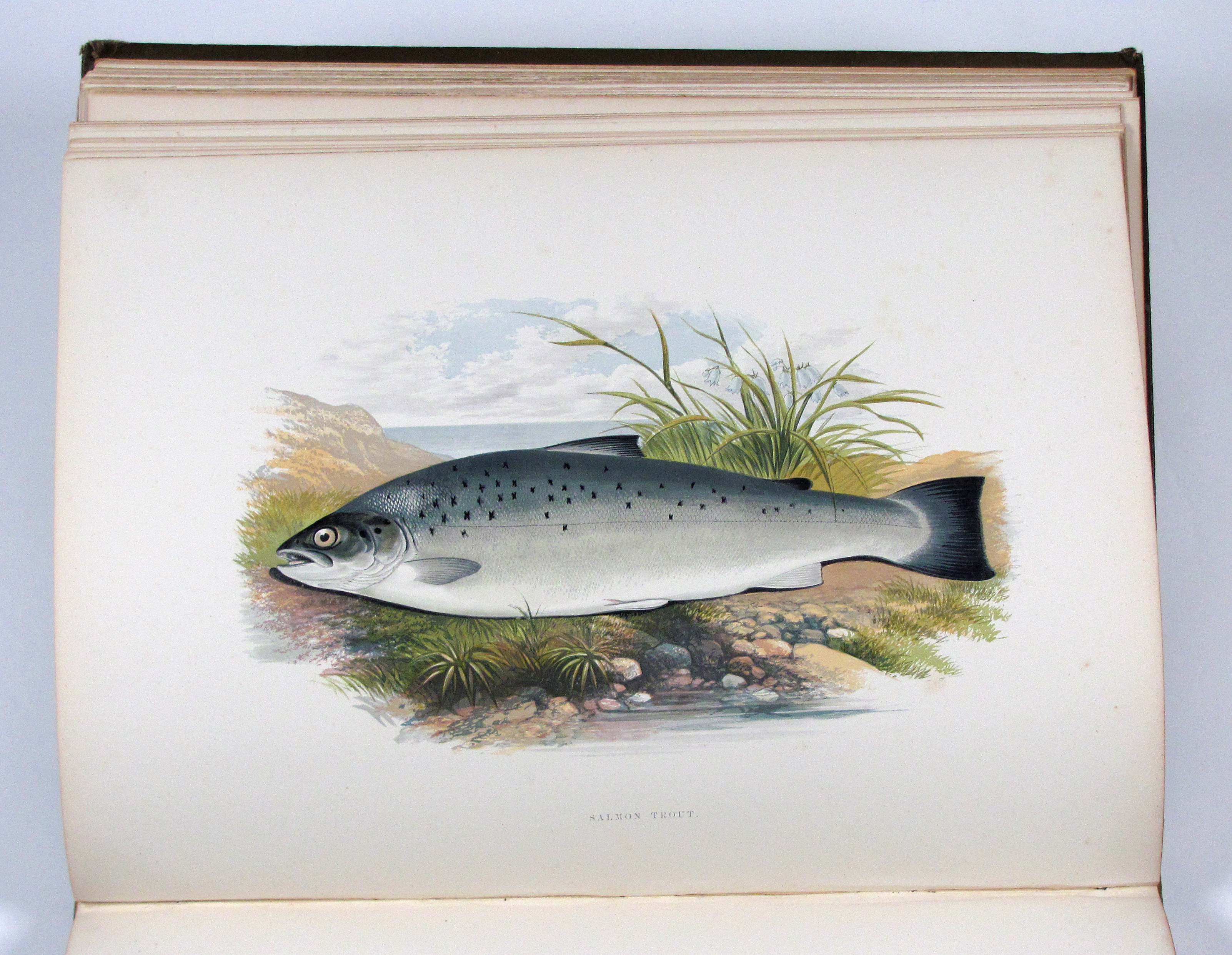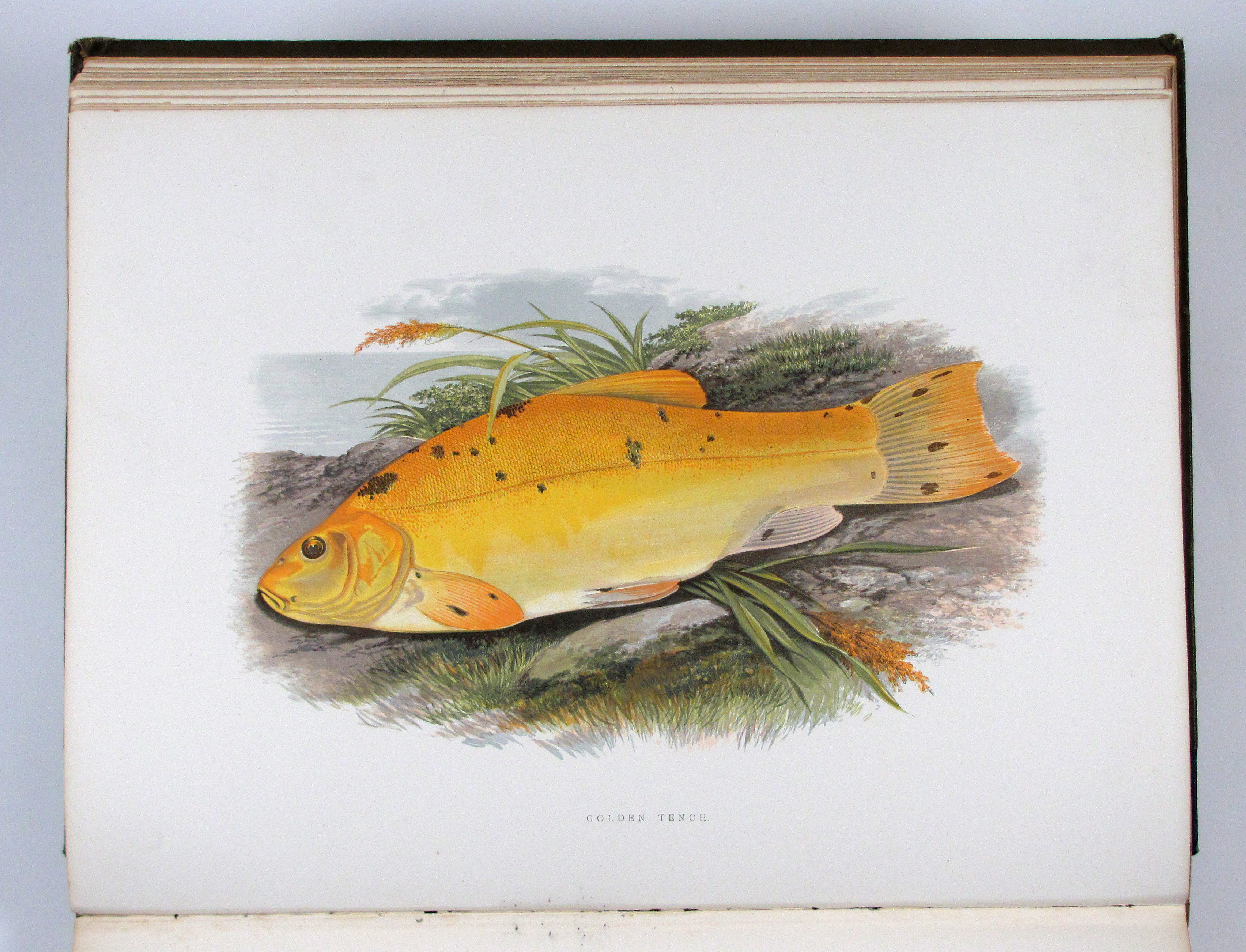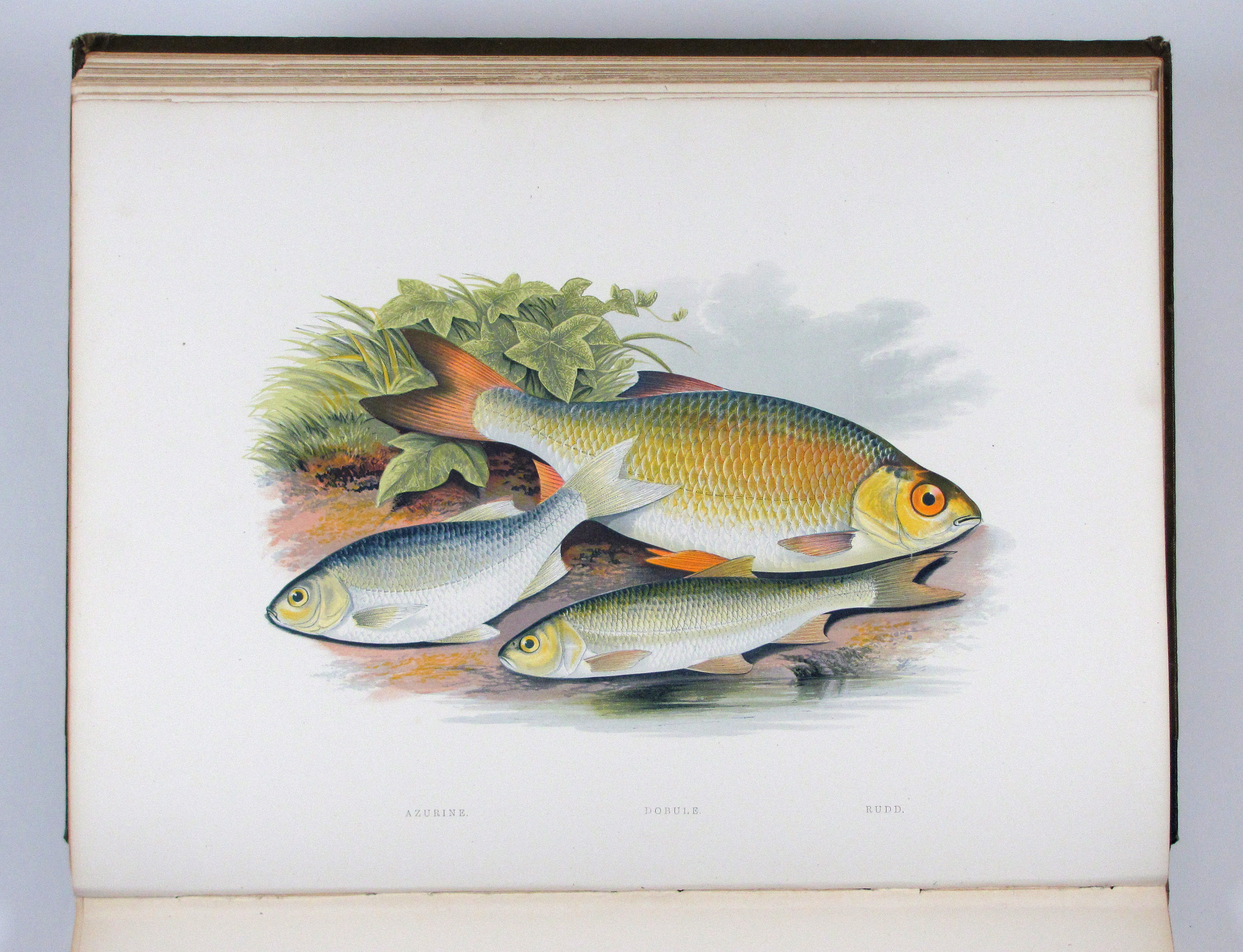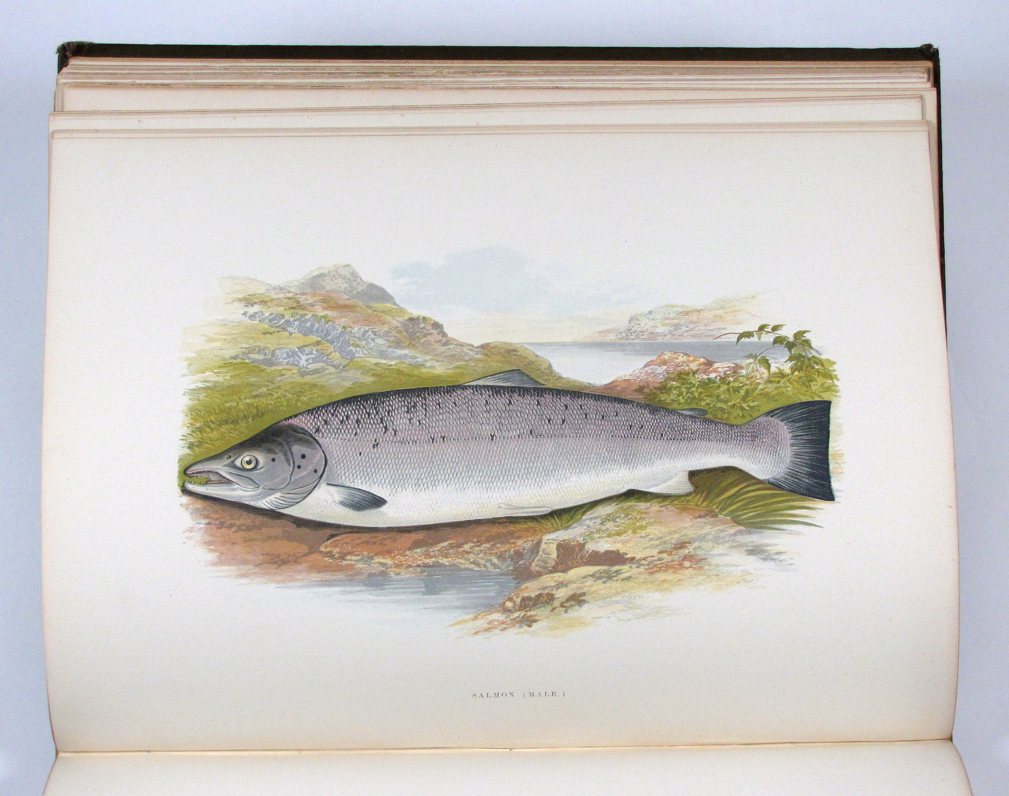 Erste Ausgabe eines der am besten illustrierten Werke zu Süßwasserfischen. Die Tafeln sind in dem von Benjamin Fawcett entwickelten Verfahren in kräftigen Farben gedruckt. „Wichtig für die ichthyologische Illustration wurden die Bemühungen Fawcett’s, des Meisterdruckers von Driffield, um eine getreue und doch billige mechanische Wiedergabe der Farbe. Die Werke von J. Couch und W. Houghton mit ihren Farbholzschnitten… zeugen vom hohen Rang seines Könnens. Doch konnte sein Verfahren wohl nur in seinen eigenen Händen solch hervorragende Leistungen hervorbringen“ (Nissen, Schöne Fischbücher, S. 33). Die Textholzstiche mit hübschen Anglerszenen vor Flußlandschaften und einigen anatomischen Details.– Gutes, sauberes Exemplar des papierbedingt öfters recht stockfleckigen Buches.– Nissen, 78 und ZBI 2009. Westwood-S., Suppl. 247.