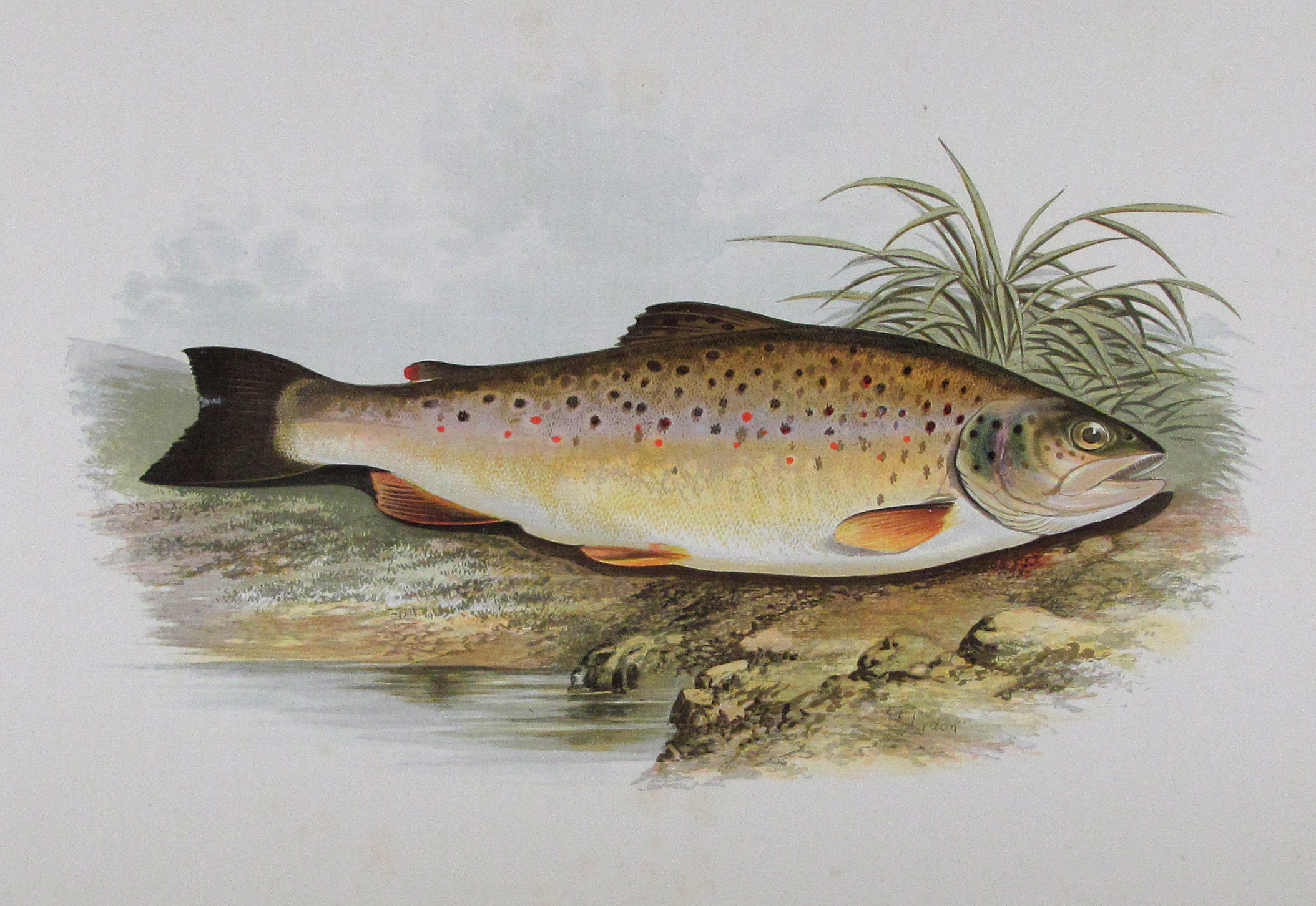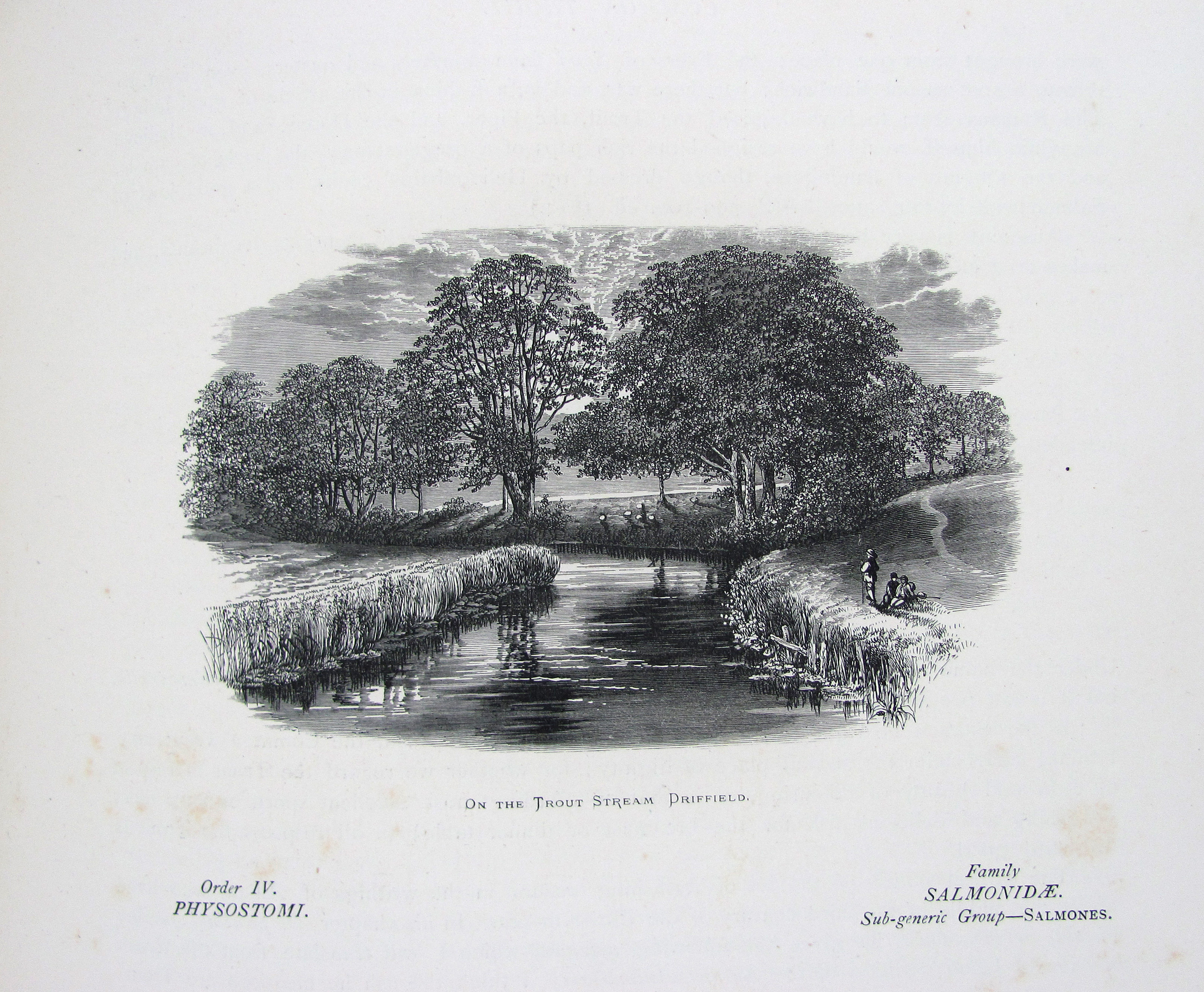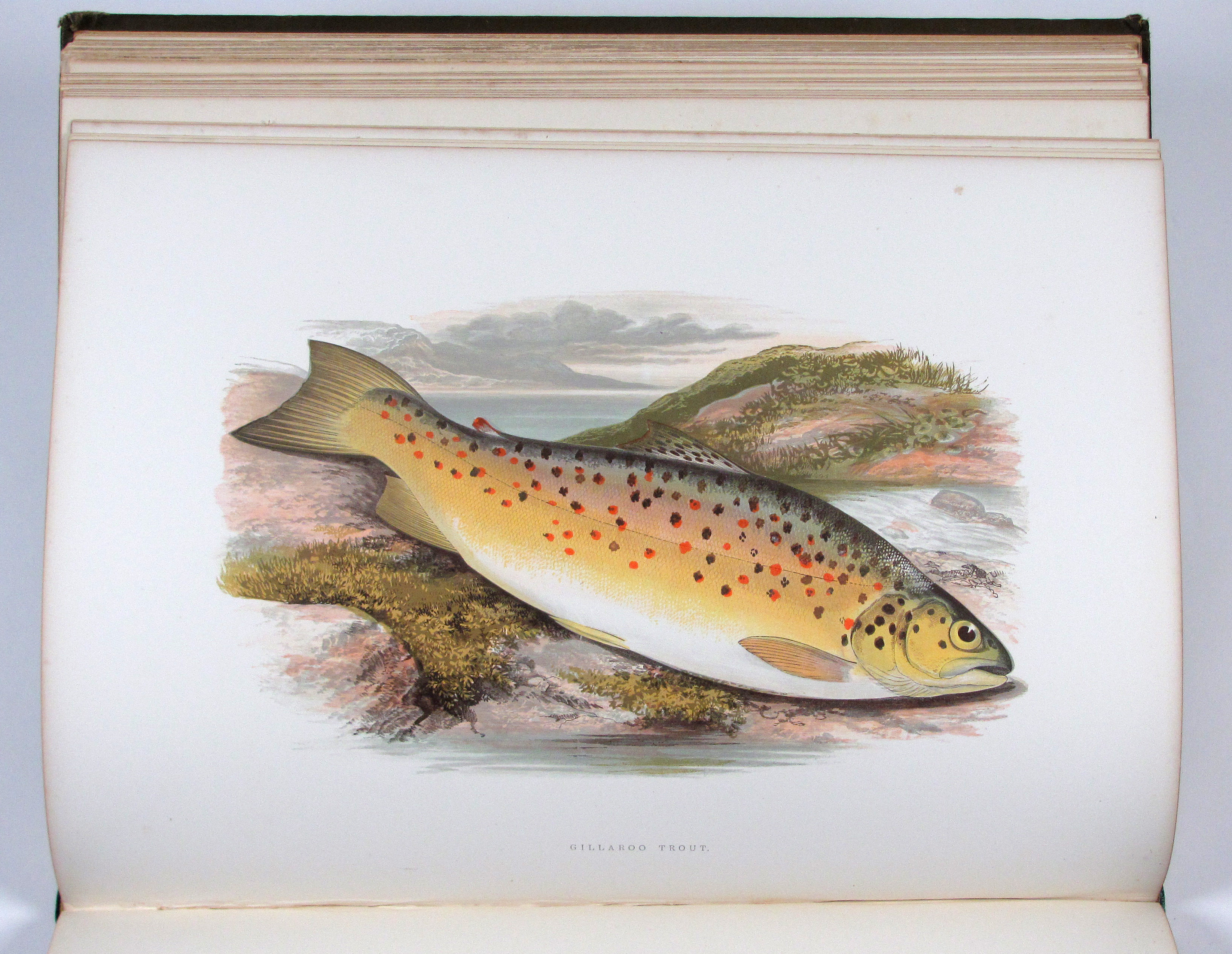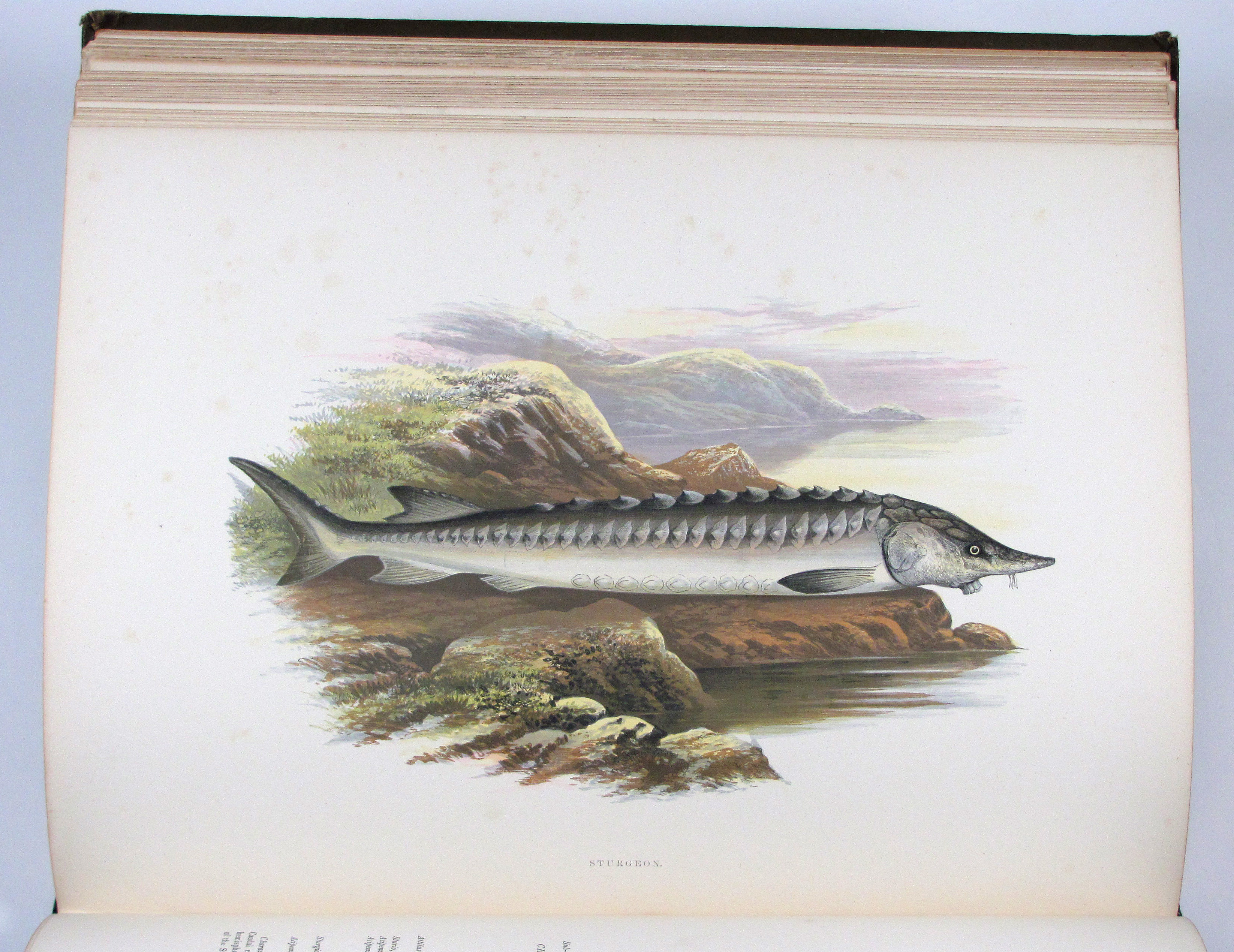 Erste Ausgabe eines der am besten illustrierten Werke zu Süßwasserfischen. Die Tafeln sind in dem von Benjamin Fawcett entwickelten Verfahren in kräftigen Farben gedruckt. „Wichtig für die ichthyologische Illustration wurden die Bemühungen Fawcett’s, des Meisterdruckers von Driffield, um eine getreue und doch billige mechanische Wiedergabe der Farbe. Die Werke von J. Couch und W. Houghton mit ihren Farbholzschnitten… zeugen vom hohen Rang seines Könnens. Doch konnte sein Verfahren wohl nur in seinen eigenen Händen solch hervorragende Leistungen hervorbringen“ (Nissen, Schöne Fischbücher, S. 33). Die Textholzstiche mit hübschen Anglerszenen vor Flußlandschaften und einigen anatomischen Details.– Gutes, sauberes Exemplar des papierbedingt öfters recht stockfleckigen Buches.– Nissen, 78 und ZBI 2009. Westwood-S., Suppl. 247.