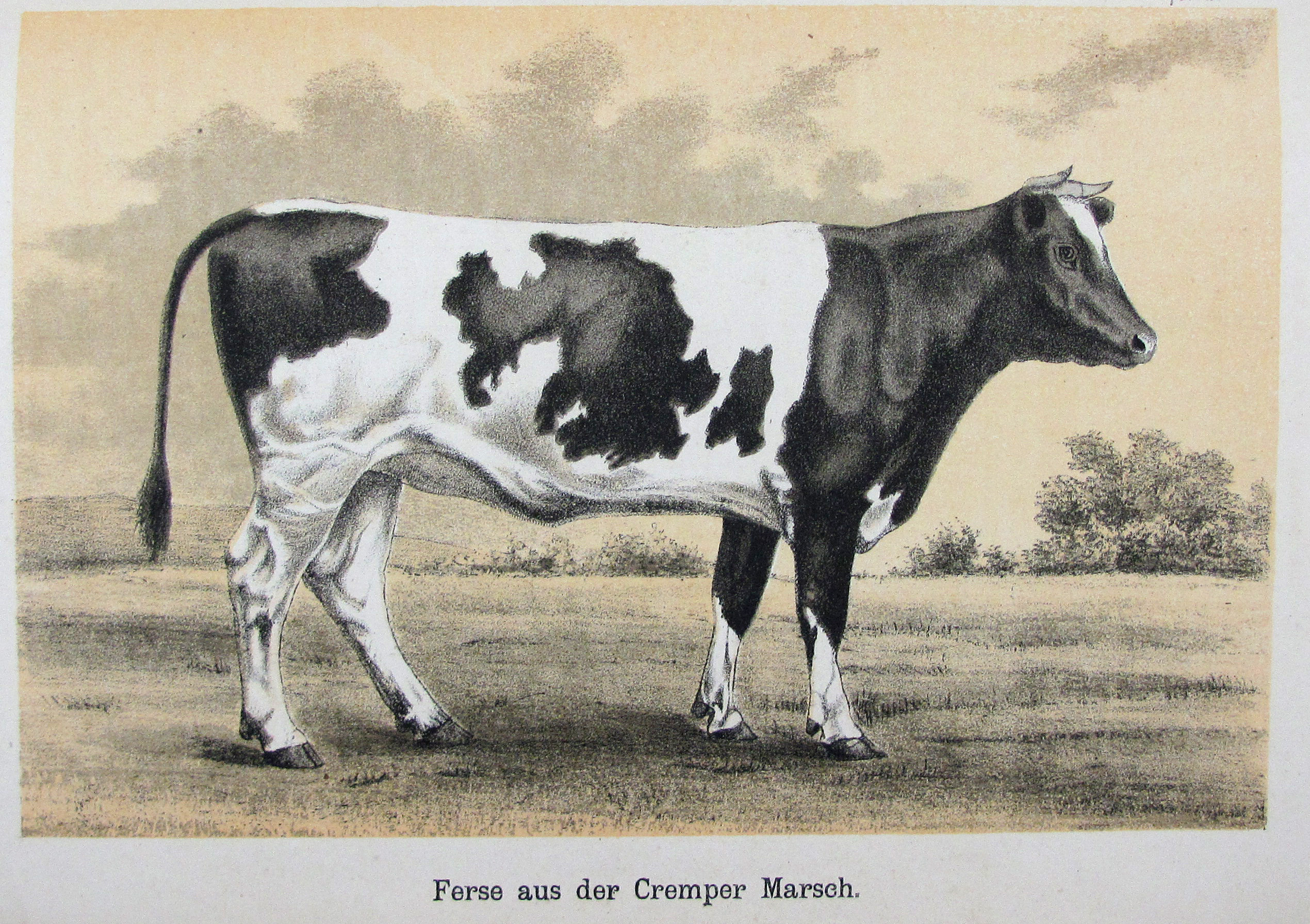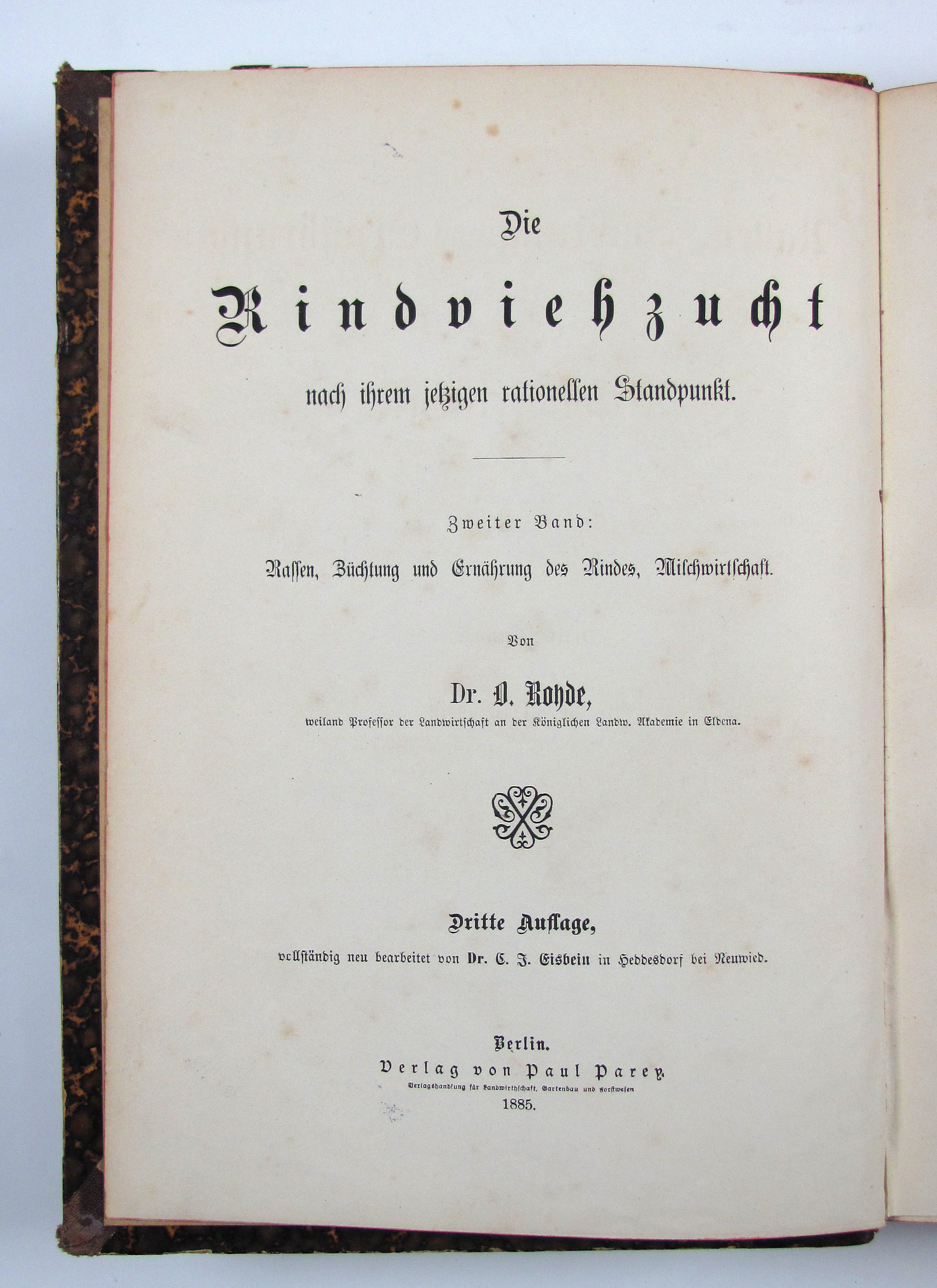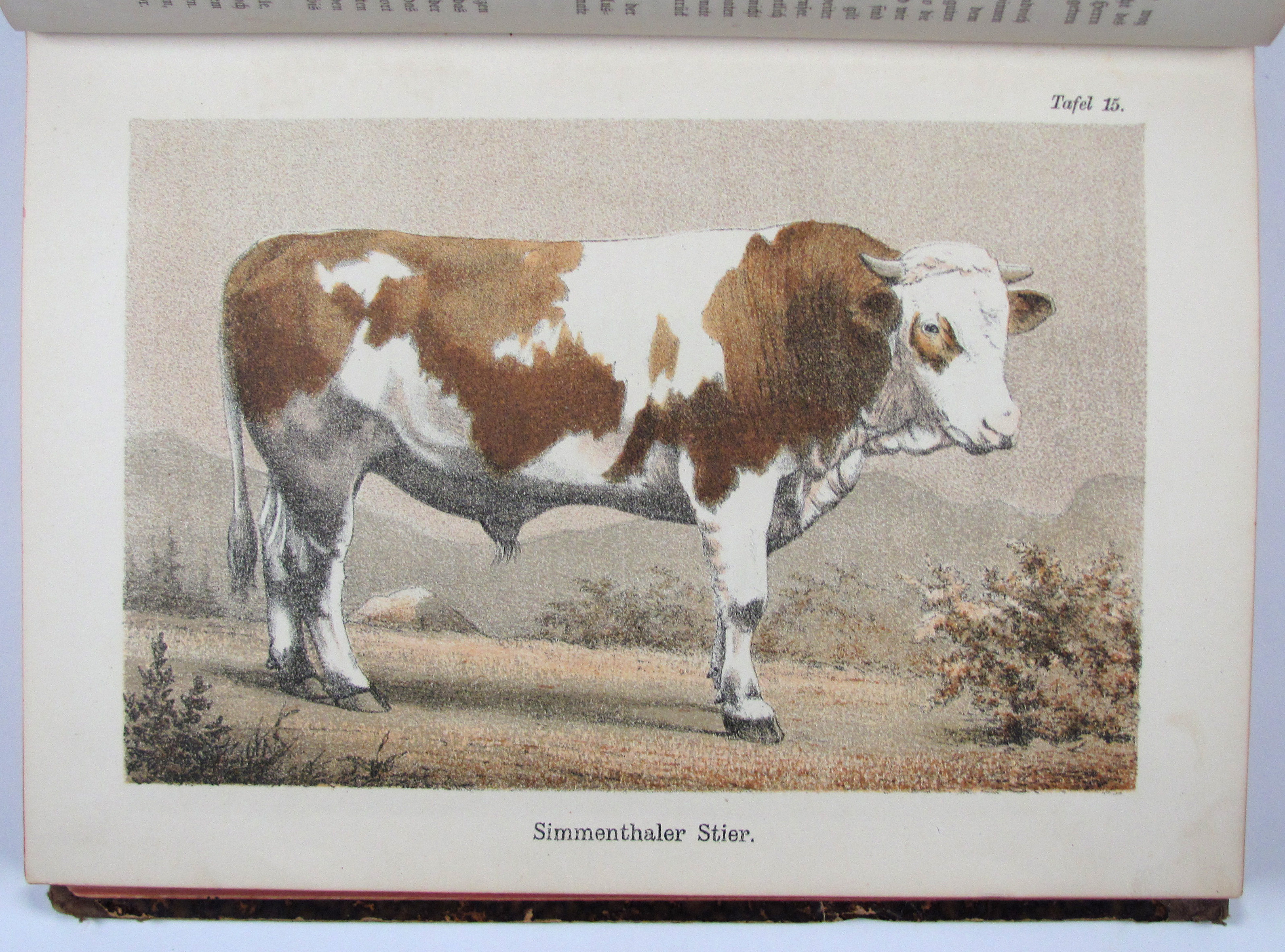 Separatausgabe von „Die Rindviehzucht nach ihrem jetzigen rationellen Standpunkt“, Band 2.– Grundlegendes und seltenes Werk mit 40 schönen Rassetafeln. Die Falttafeln zeigen eine Übersicht des Viehbestand in Deutschland sowie eine detaillierte Einteilung der Nährwerte verschiedenen Futters.