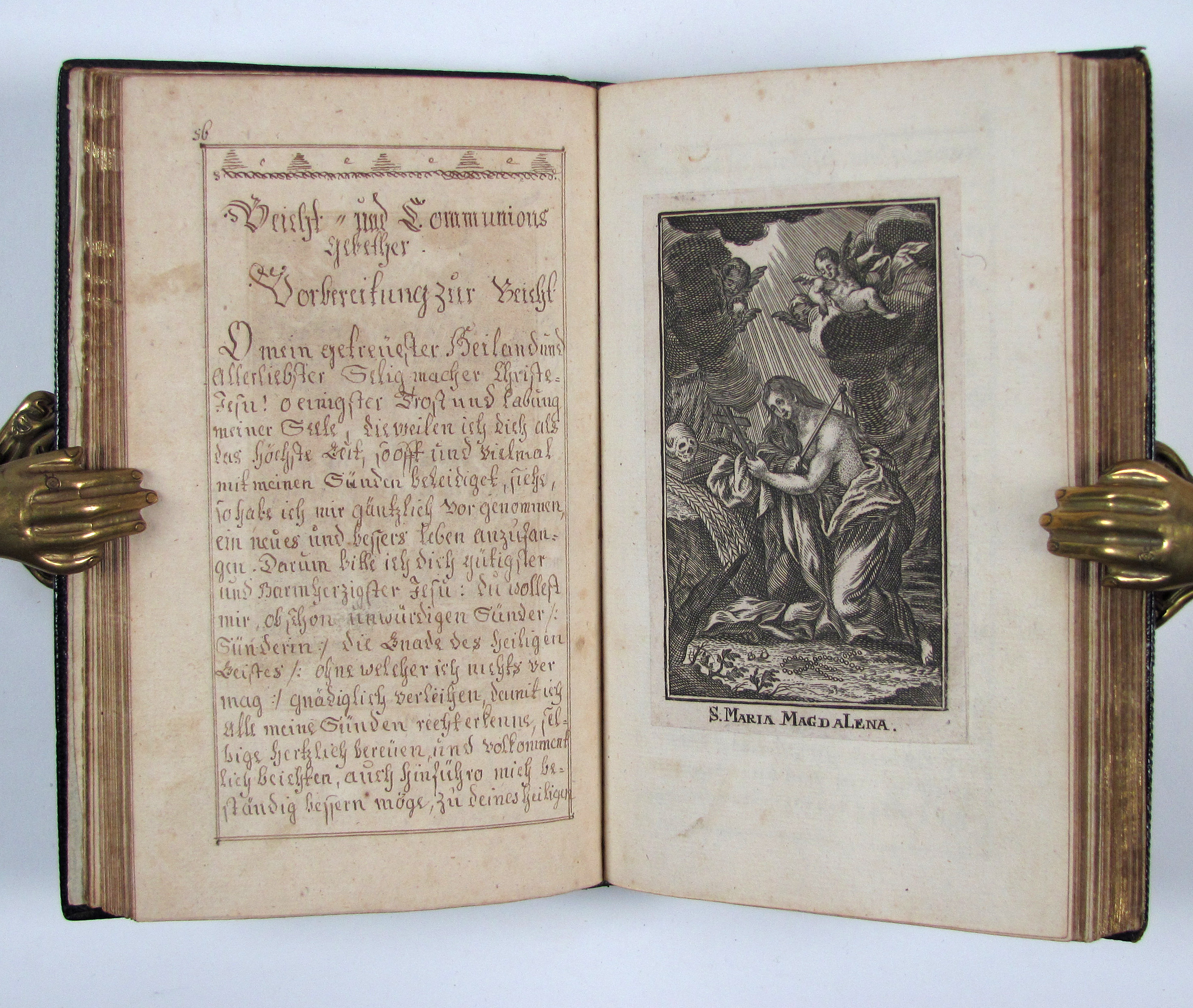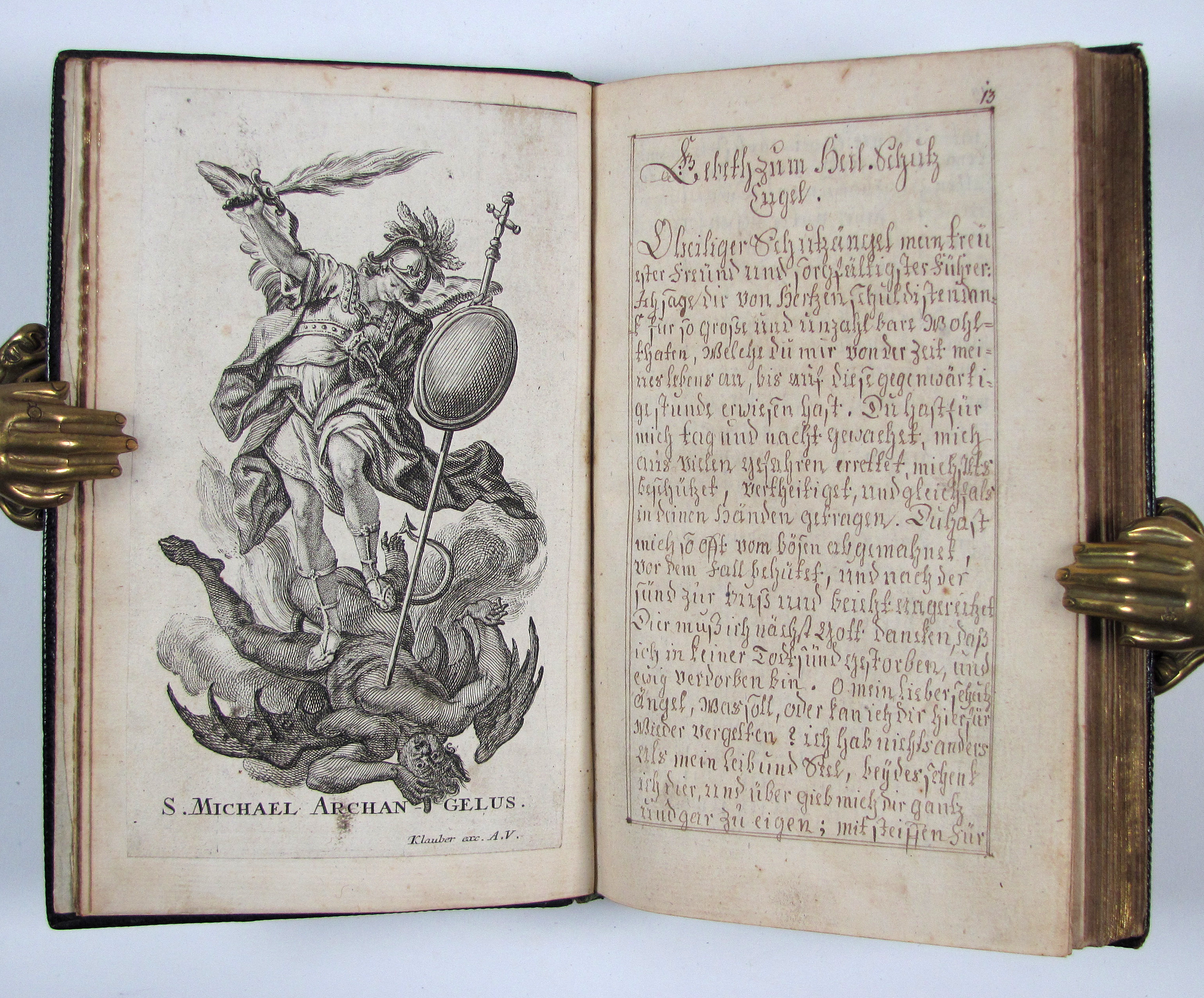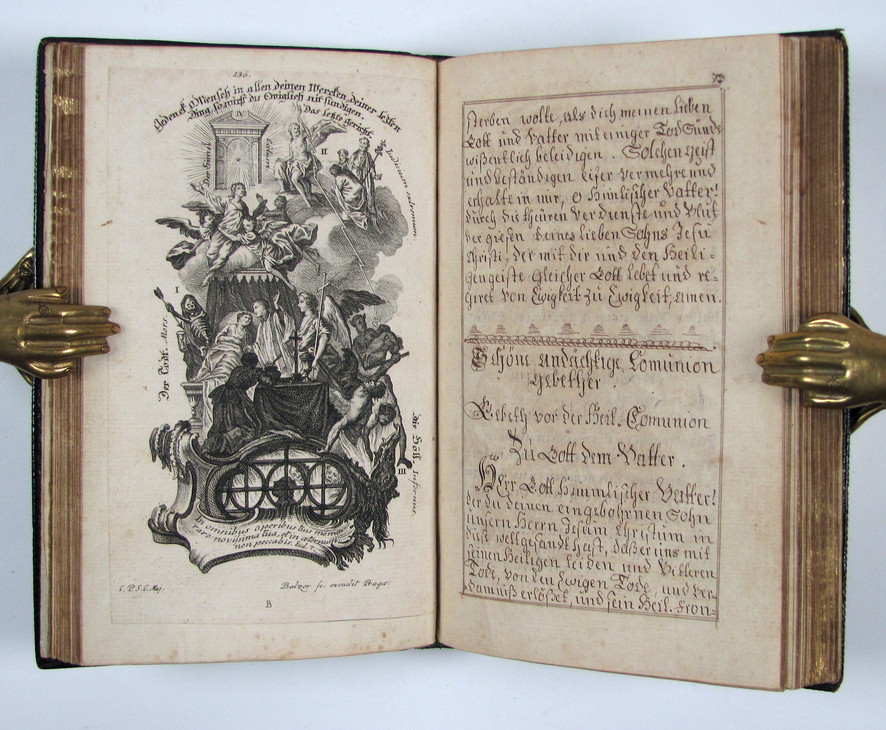 Hübsche Gebetbuchhandschrift, mit brauner Tinte in einer gut lesbaren Schrift (Ronde) ausgeführt. Regliert und mit einem Register der Gebete am Ende.– Die Kupfer von Balzer und Klauber aufgezogen, Papier gleichmässig ganz leicht gebräunt.