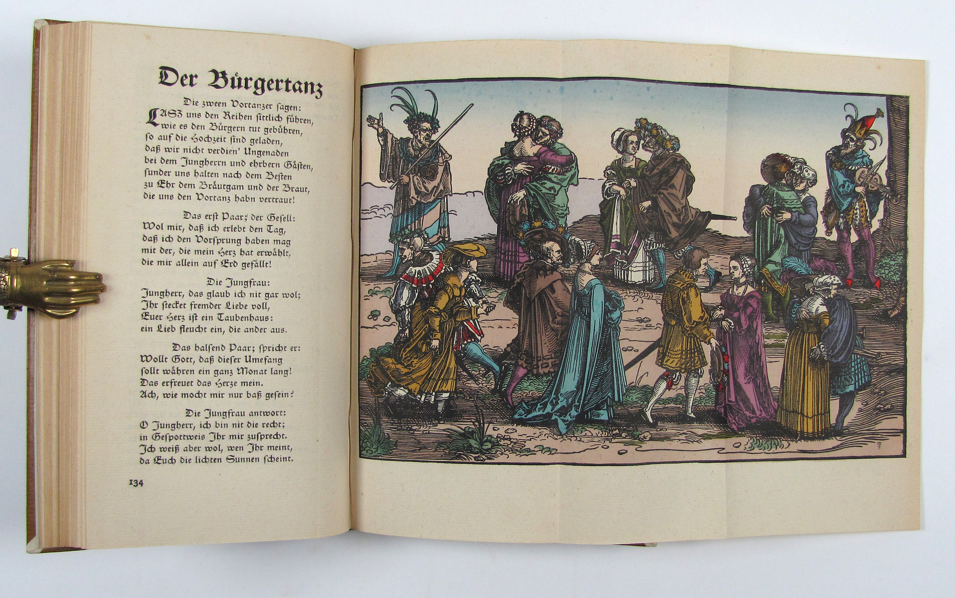 7.-10. Tausend.– Schöne Ausgabe, in Fraktura auf Bütten gedruckt und mit schönem Handkolorit der Schnitte. Sie reproduzieren die zeitgenössischen Illustrationen von Dürer, Beham, Amman u.a.– Band 1 mit Lyrik, Band 2 mit Dramen.– Neuwertiges Exemplar.– Sarkowski 1386 B.