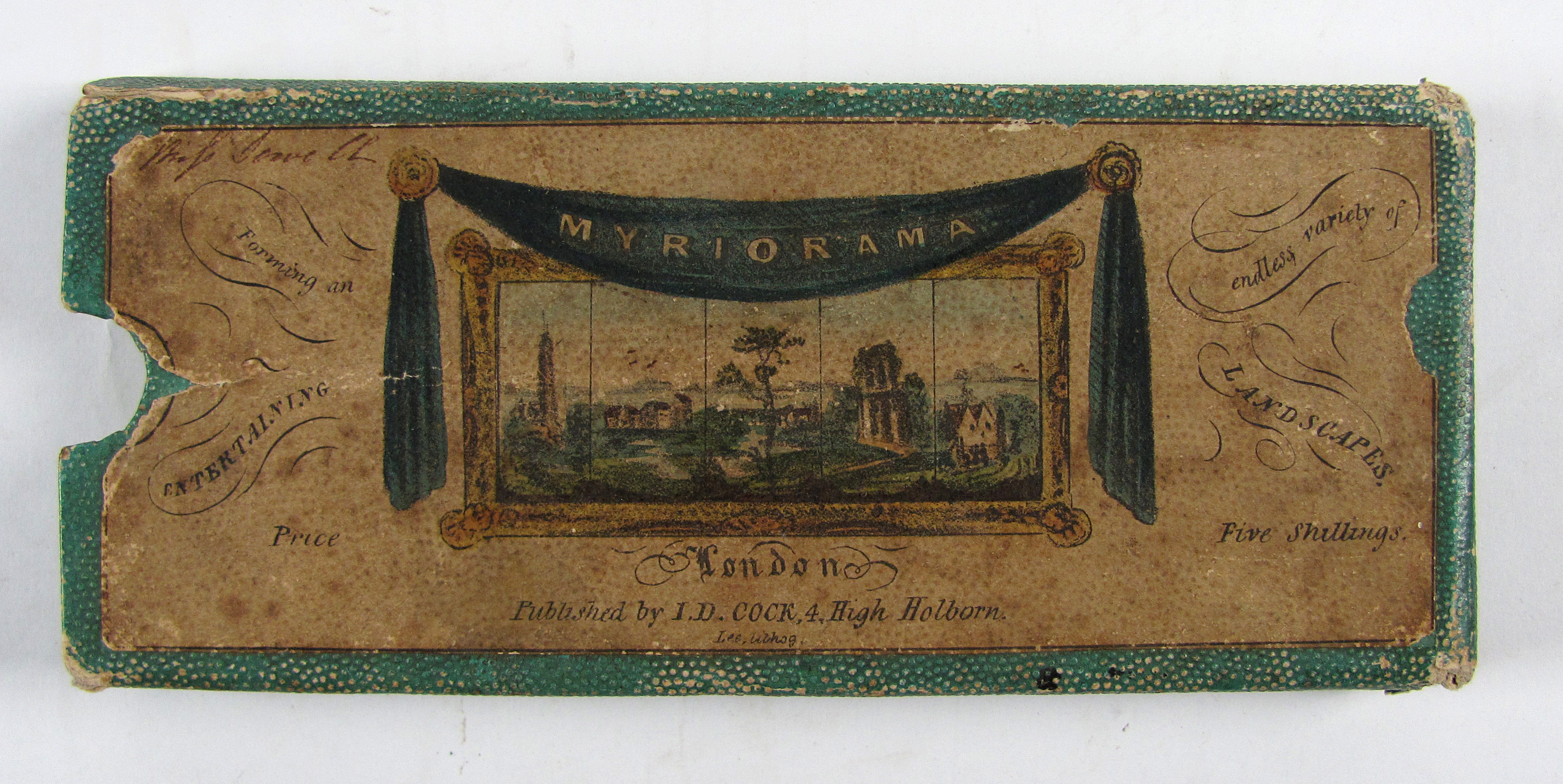 Eines der frühesten Exemplare dieser Gattung, selten.– Das Myriorama ist ein reizvolles optisches Spielzeug. Ein ideales Landschaftspanorama wird in vertikale Segmente geteilt. Dadurch, dass sich verschiedene Landschaftselemente im Vorder- und Hintergrund auf gleicher Höhe befinden (hier der dunkle Vordergrund, der Bildmitte Hügel und Wasser, im Hintergrund eine Bergekette), können die Teile beliebig miteinander kombiniert werden. Es ergibt sich so eine nahezu unendliche Anzahl an möglichen Kombinationen. Erfunden wurde diese Art der Landschaftsmontage durch Brès bereits im Jahre 1802. Er nannte seine Erfindung „Tableau polyoptique“. Der Engländer John Clark war der erste, der die Idee kommerziell aufgriff und 1823 eine englische und später eine italienische Ideallandschaft gestaltete und vetreiben ließ. Der Begriff Myriorama entstammt dem Griechischen „Myrias“ für 10.000.– Die Schachtel restauriert, die Segmente leicht gebräunt, minimal fleckig und an den Ecken minimal berieben, insgesamt gut erhalten.– Vgl. Slg. Nekes, S. 441.