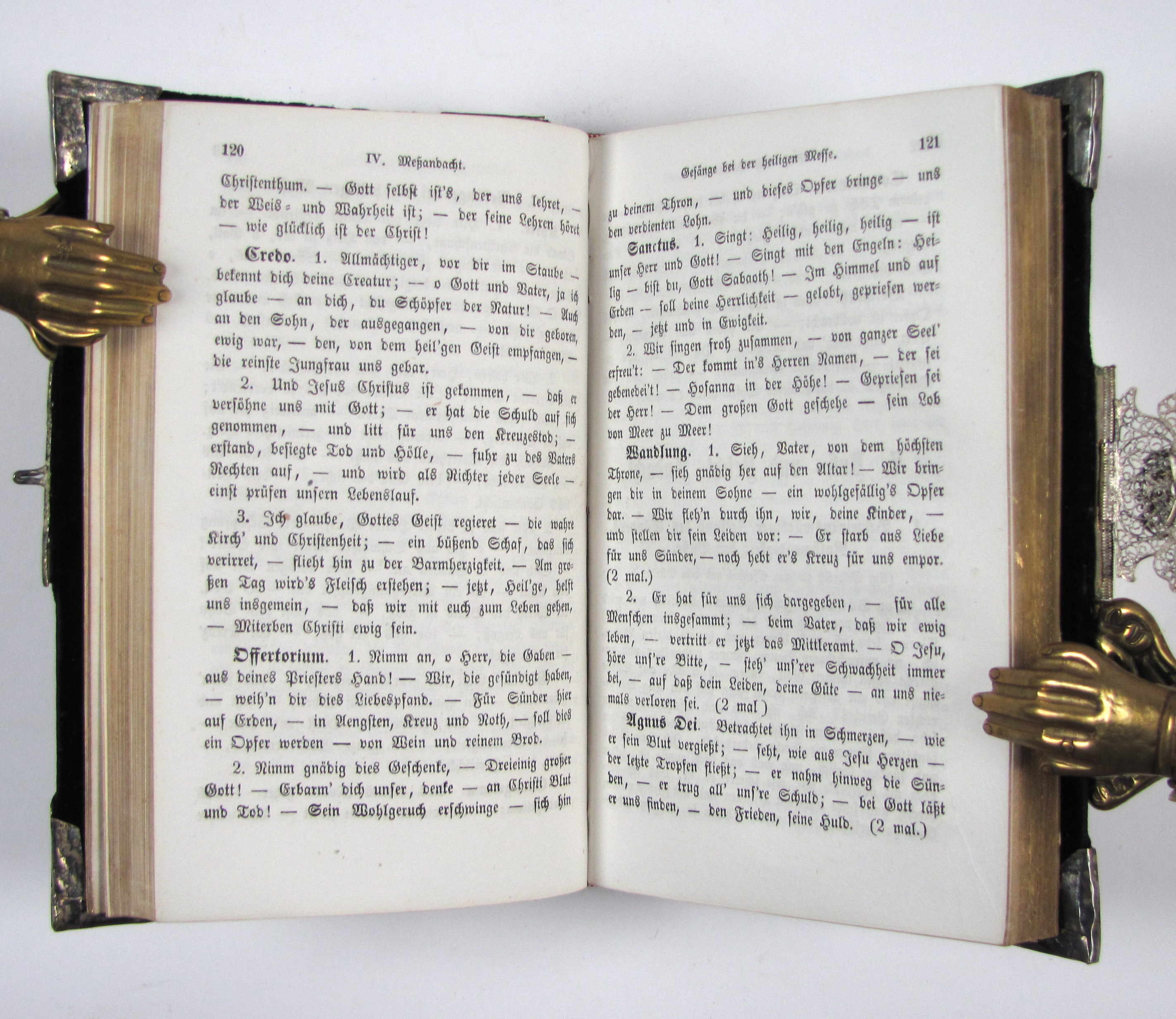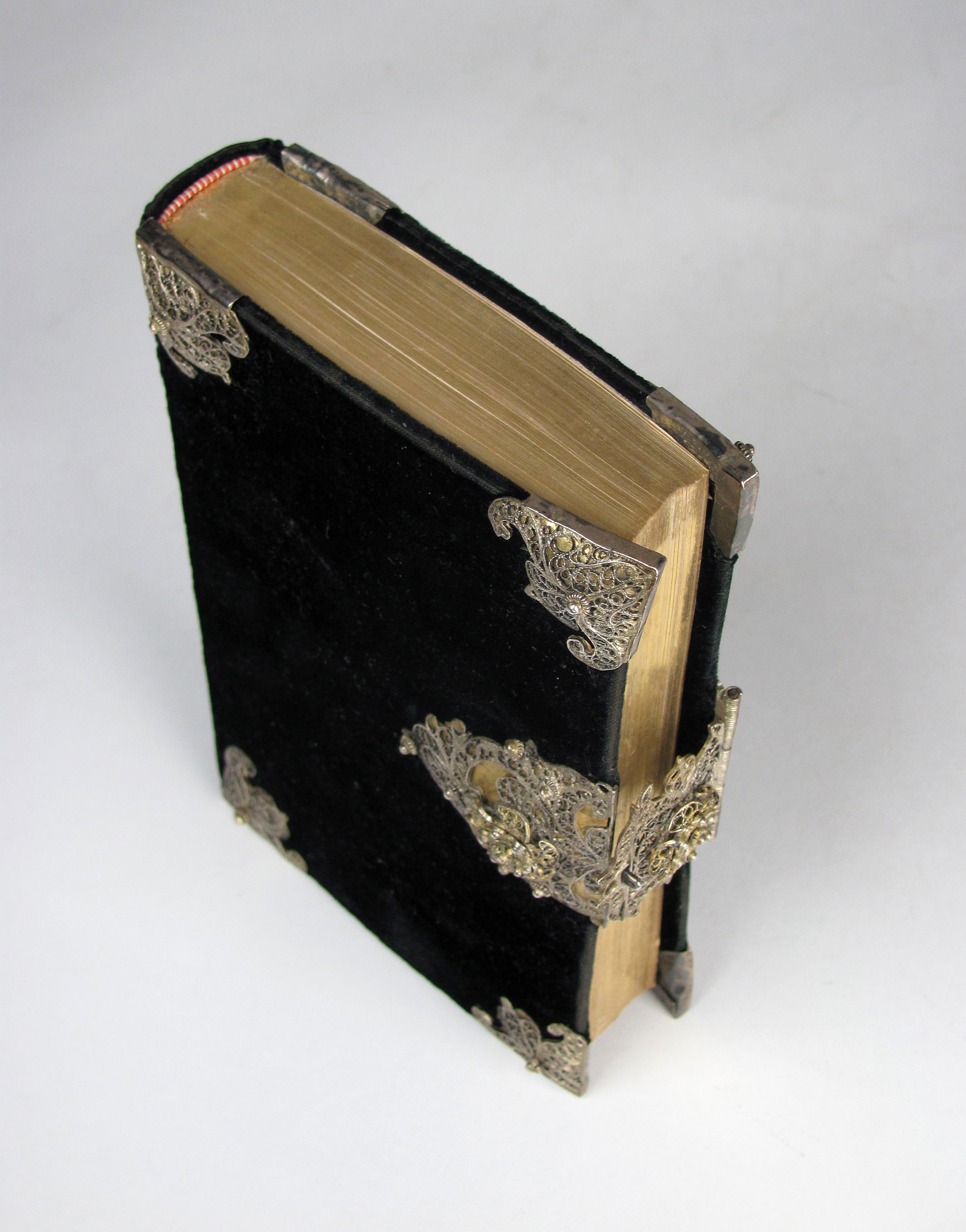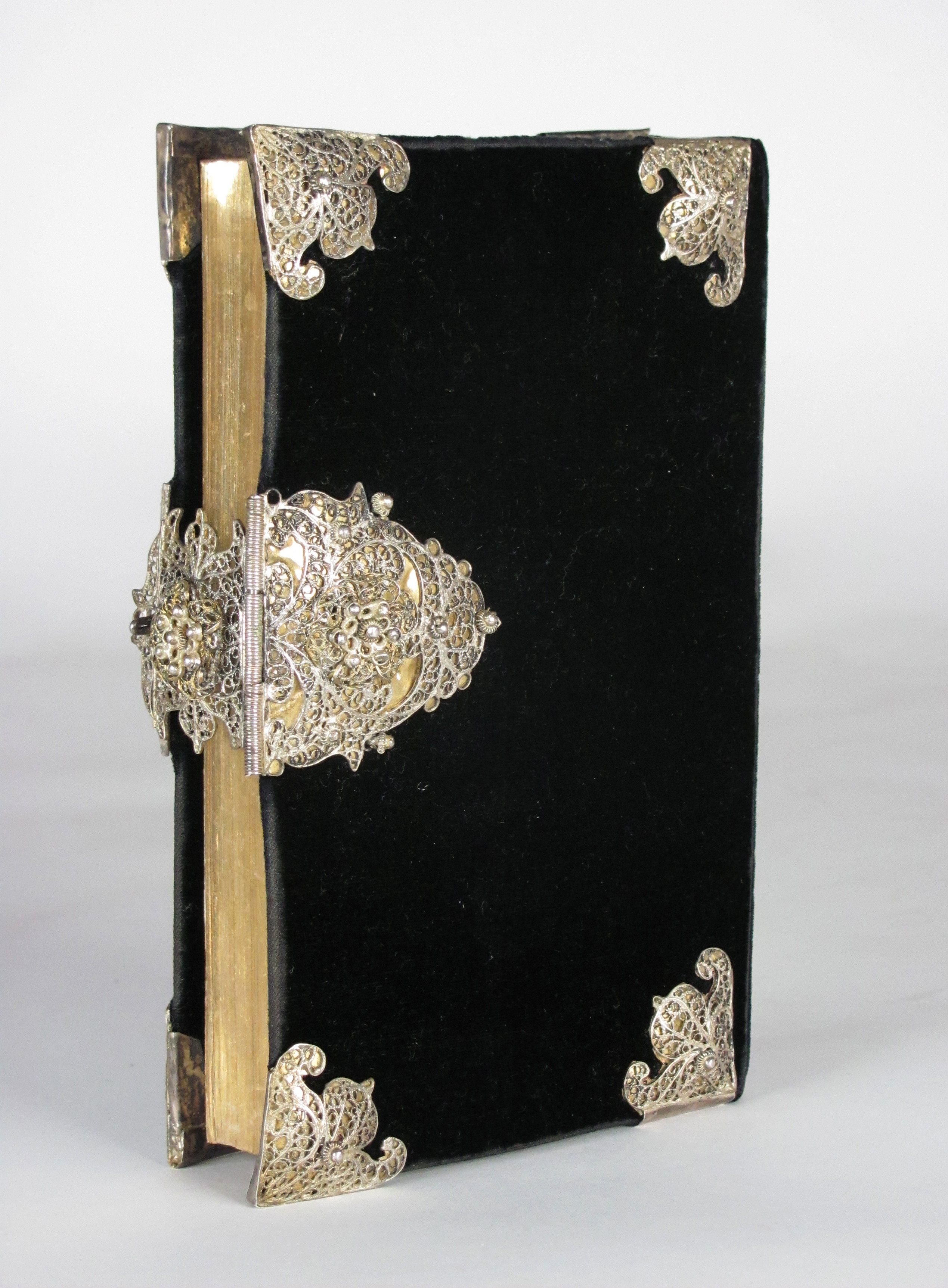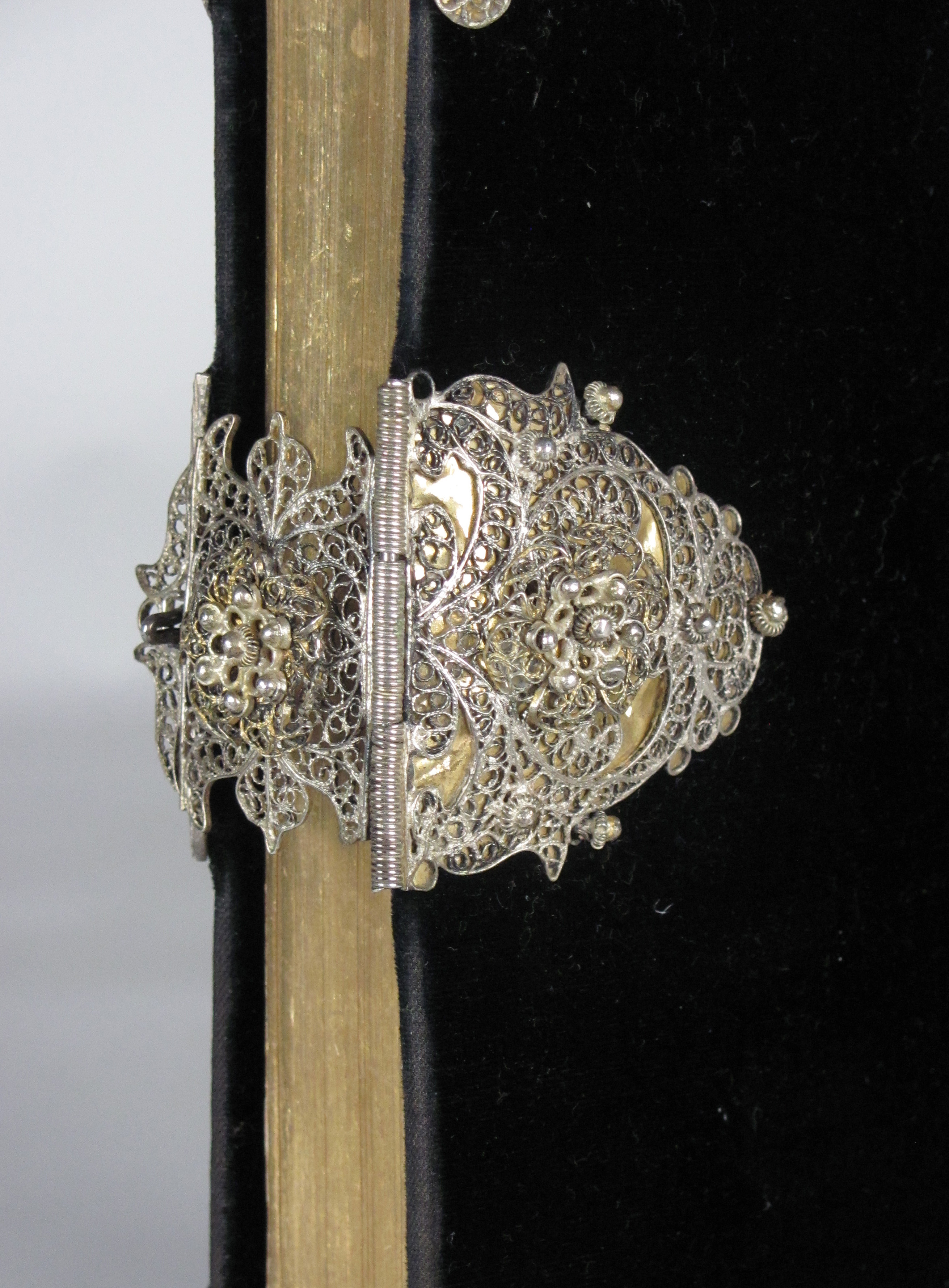 Sehr empfindlicher und nahezu neuwertig erhaltener Samteinband mit aussergewöhnlich reich gearbeitetem Silberfiligranwerk. Bei den Schließhaften und der Schieße sind die Applikationen in zwei bzw. drei Ebenen gefertigt und erstaunlicherweise vollkommen intakt.