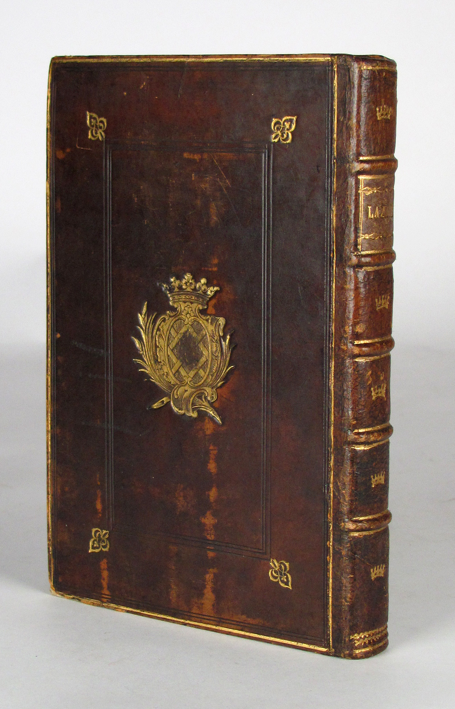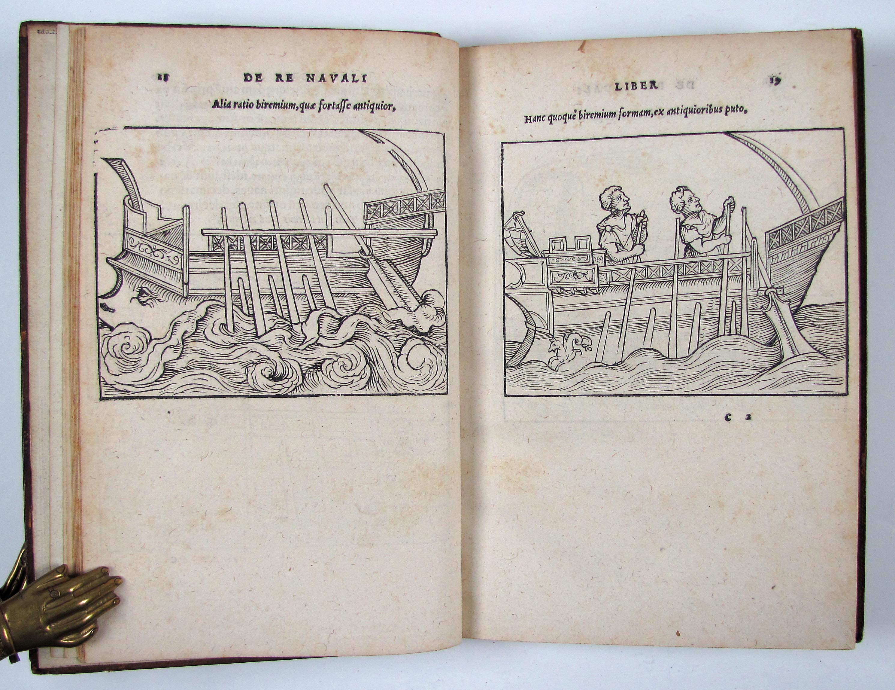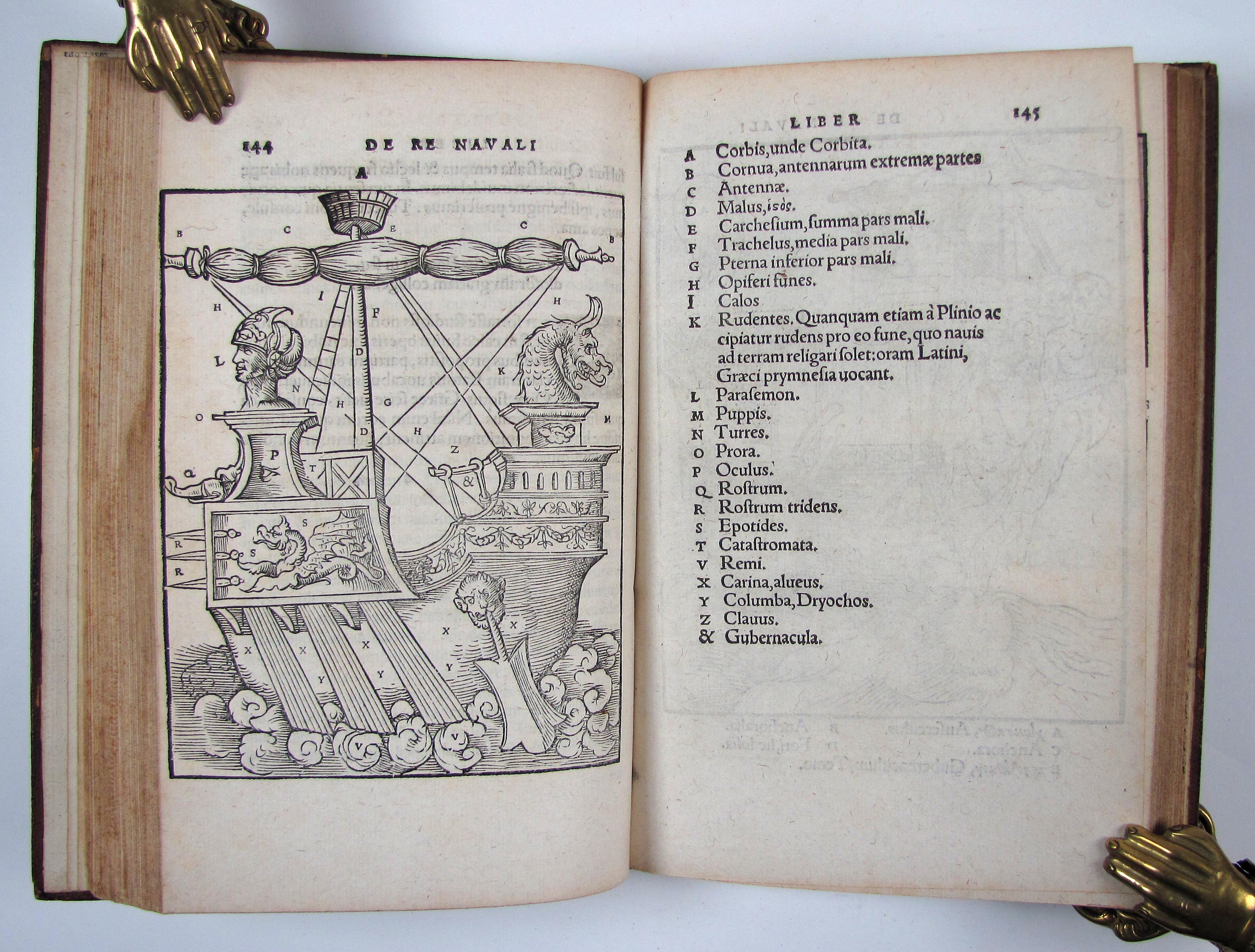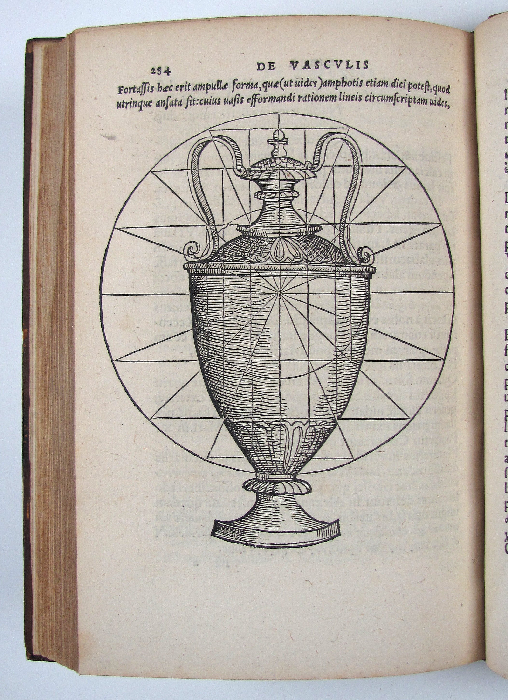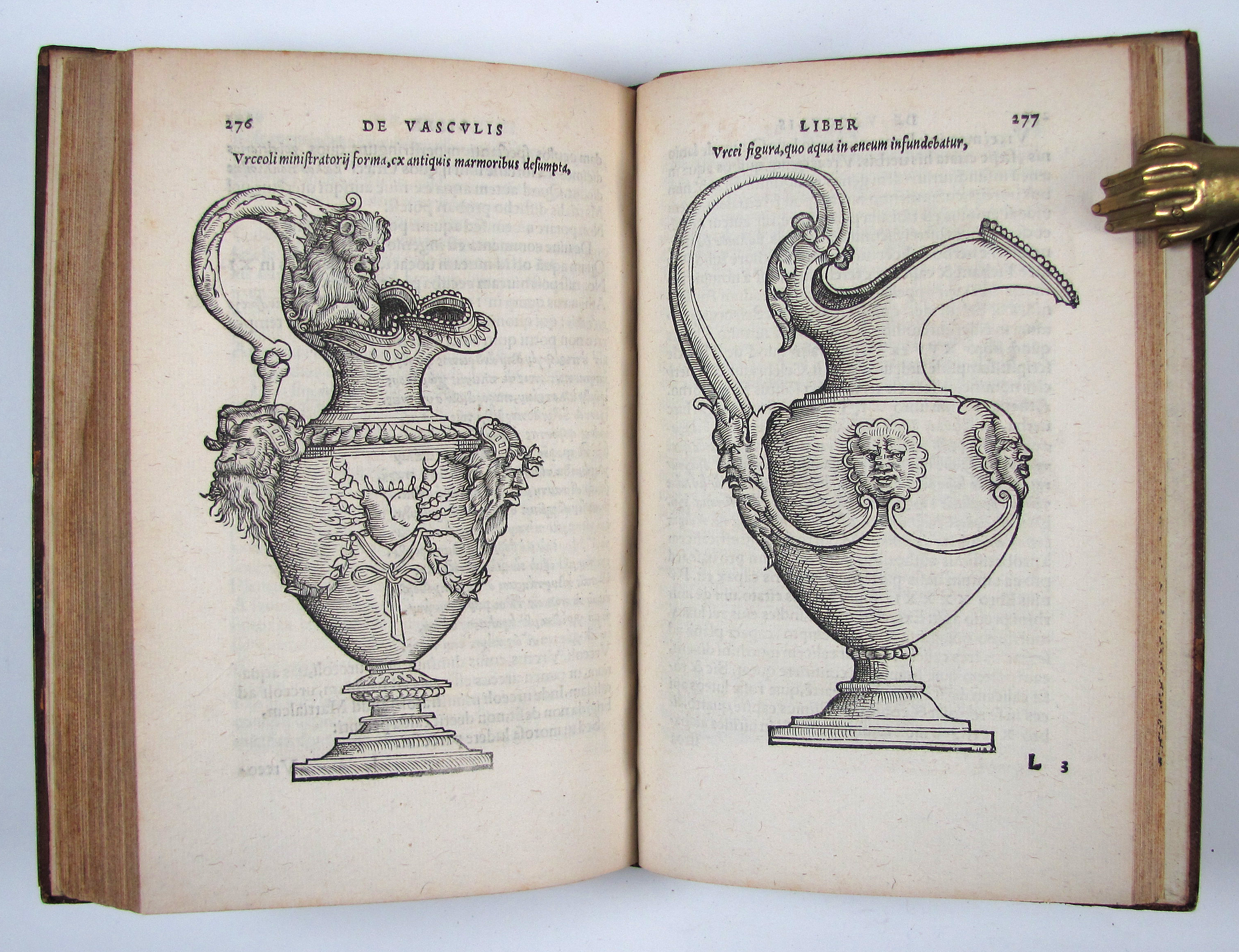 Zweite Auflage des seinerzeit sehr beliebten Werkes, welches sich mit Marine, Bekleidung und Vasen der Antike befasst. Die Erstausgabe mit den schönen Holzschnitten Torys erschien 1536. Der Verfasser war französischer Botschafter in Venedig. Am Ende eine frühe Schrift über Farben von Telesio, die Goethe in seiner Farbenlehre abdruckte.– Schönes Exemplar, lediglich das Register etw. knapp beschnitten.– Adams B 36. Lipperheide Ba 1. Ornamentstichslg. Berlin 884.