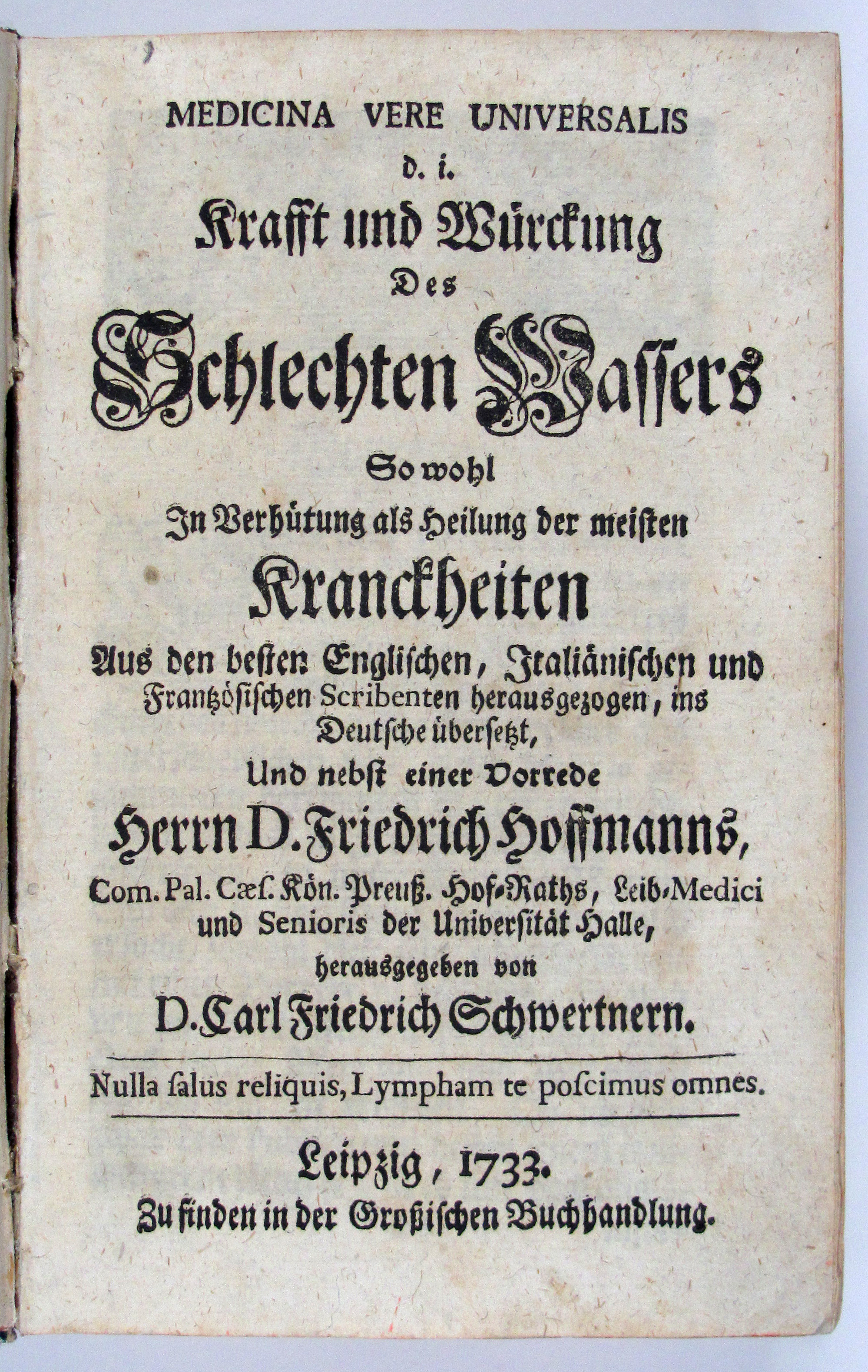 Medicina vere universalis d.i. Krafft und Würckung des schlechten Wassers so wohl in Verhütung als Heilung der meisten Krankheiten. Nebst einer Vorrede F. Hoffmanns.