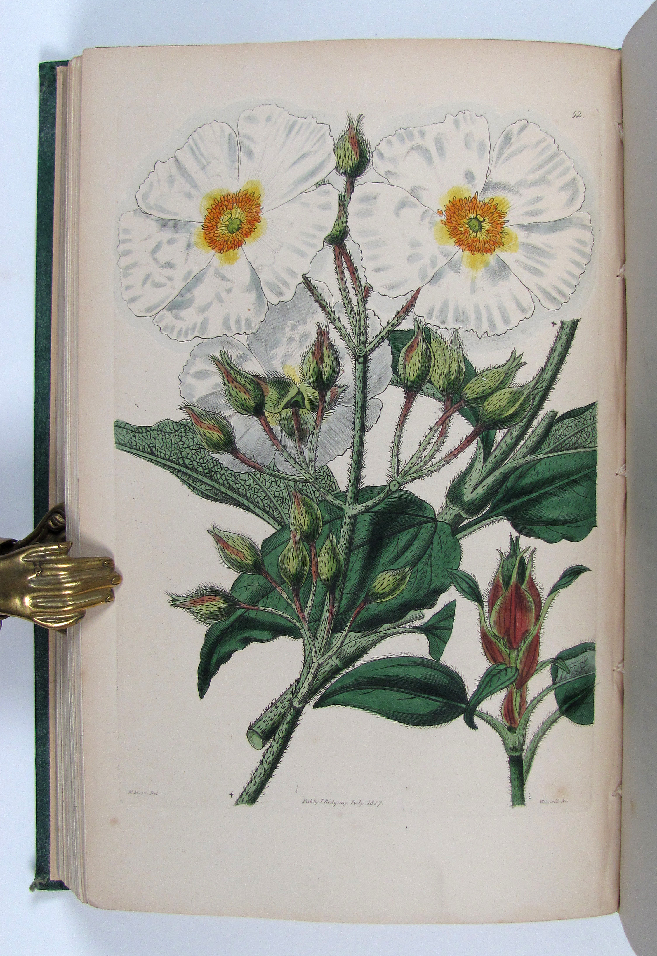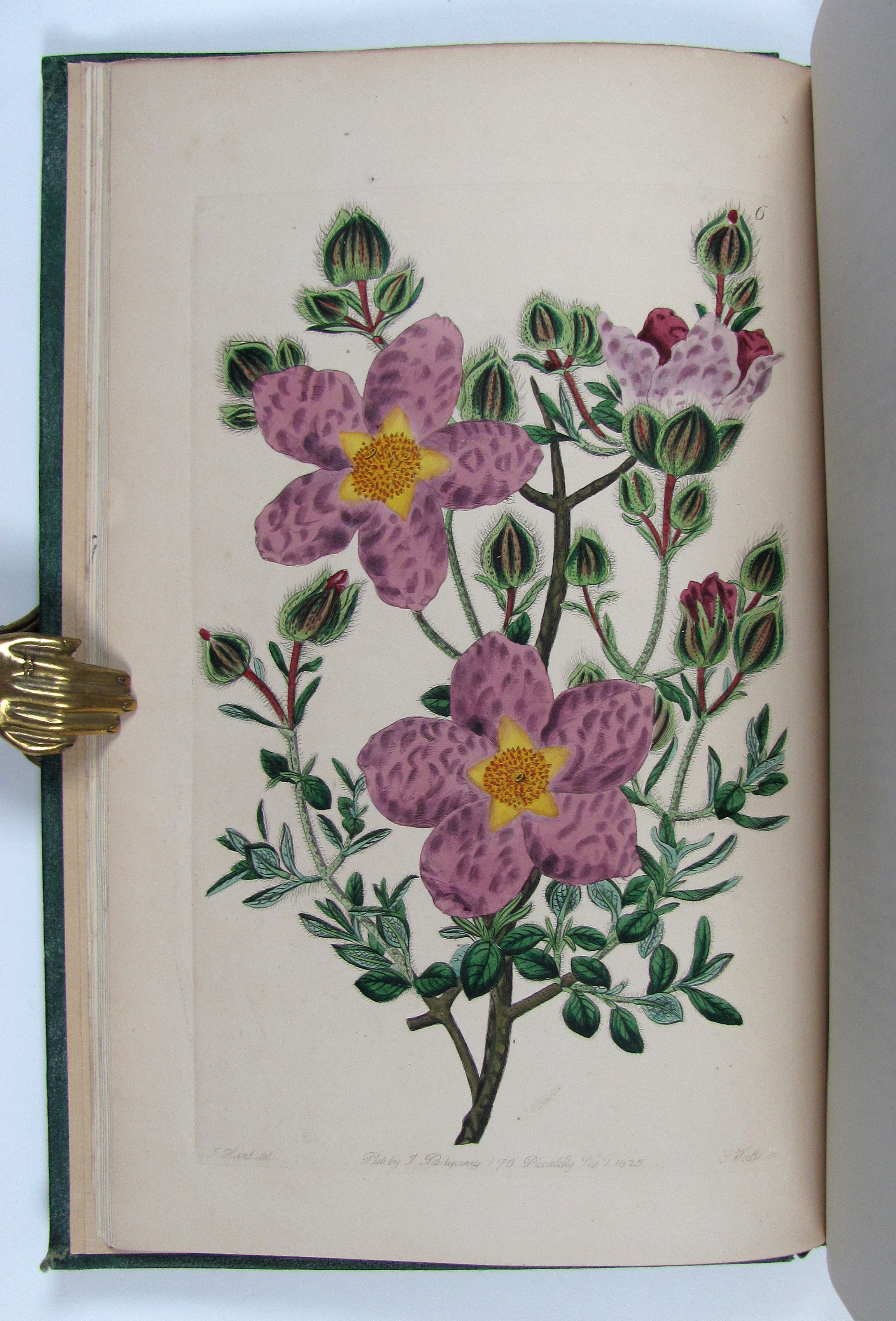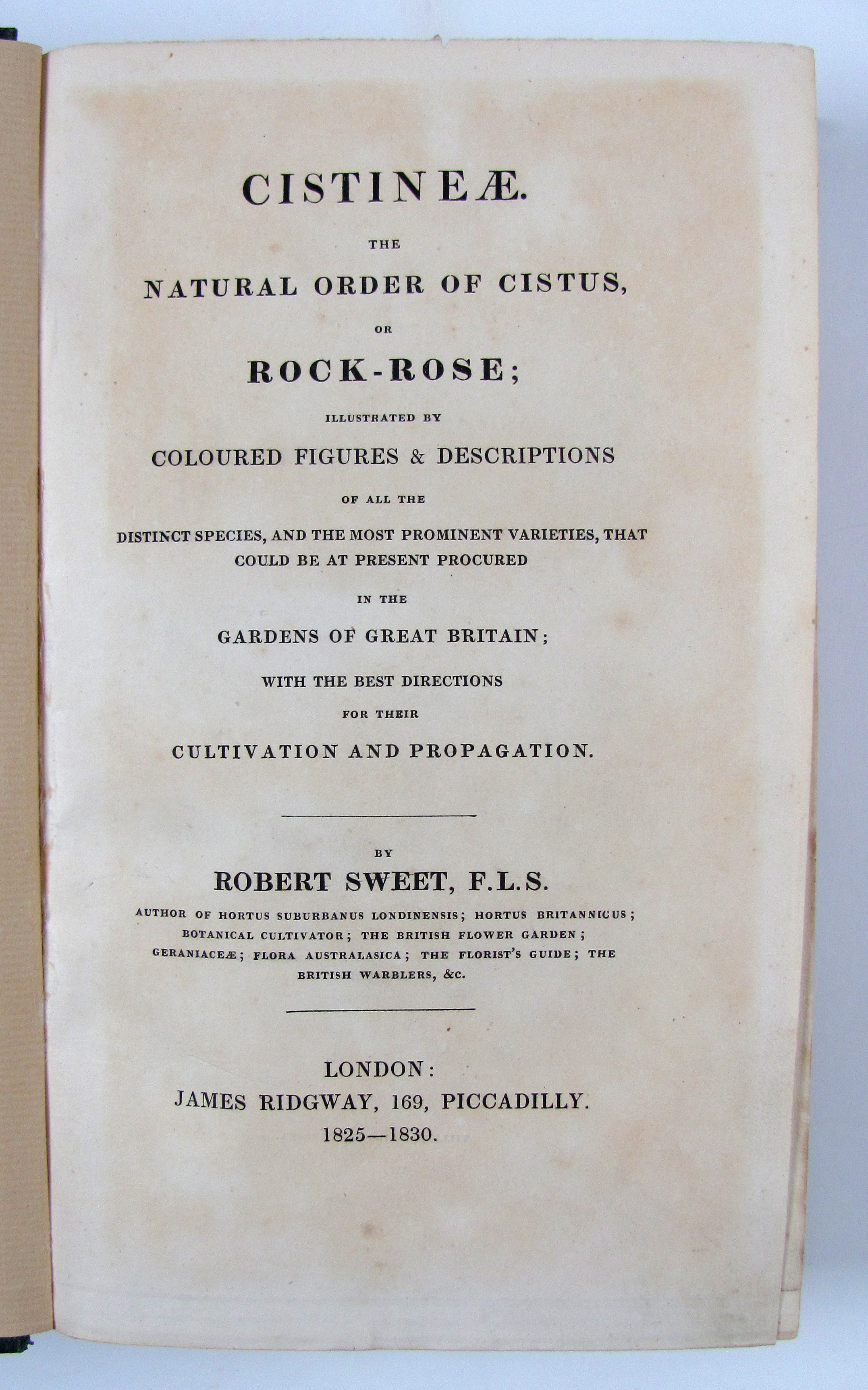 Maßgebliche der Monographie zur Pflanzenfamilie der Zistrosengewächse mit sehr schönen Tafeln in feinem Kolorit. Diese Pflanzen sind meist immergrüne, kleine Sträucher, deren Blütenformen Rosen ähnlich sind. Als Ziergewächse sind sie deshalb sehr beliebt. Sweet (1783-1835) war ein bekannter Gartenbauer, Mitglied der Linnean Society und veröffentlichte einige Werke zu einheimischen Kulturpflanzen. Die hübschen Tafeln wurden von Watts und Wedell nach J. und M. Hart sowie Miss Brown geschaffen.– Schönes Exemplar im Originaleinband, Vorsätze erneuert, an den Rändern min. gebräunt.– Great Flower Books, S. 77. Nissen BBI 1922. Stafleu-C. 13.546.