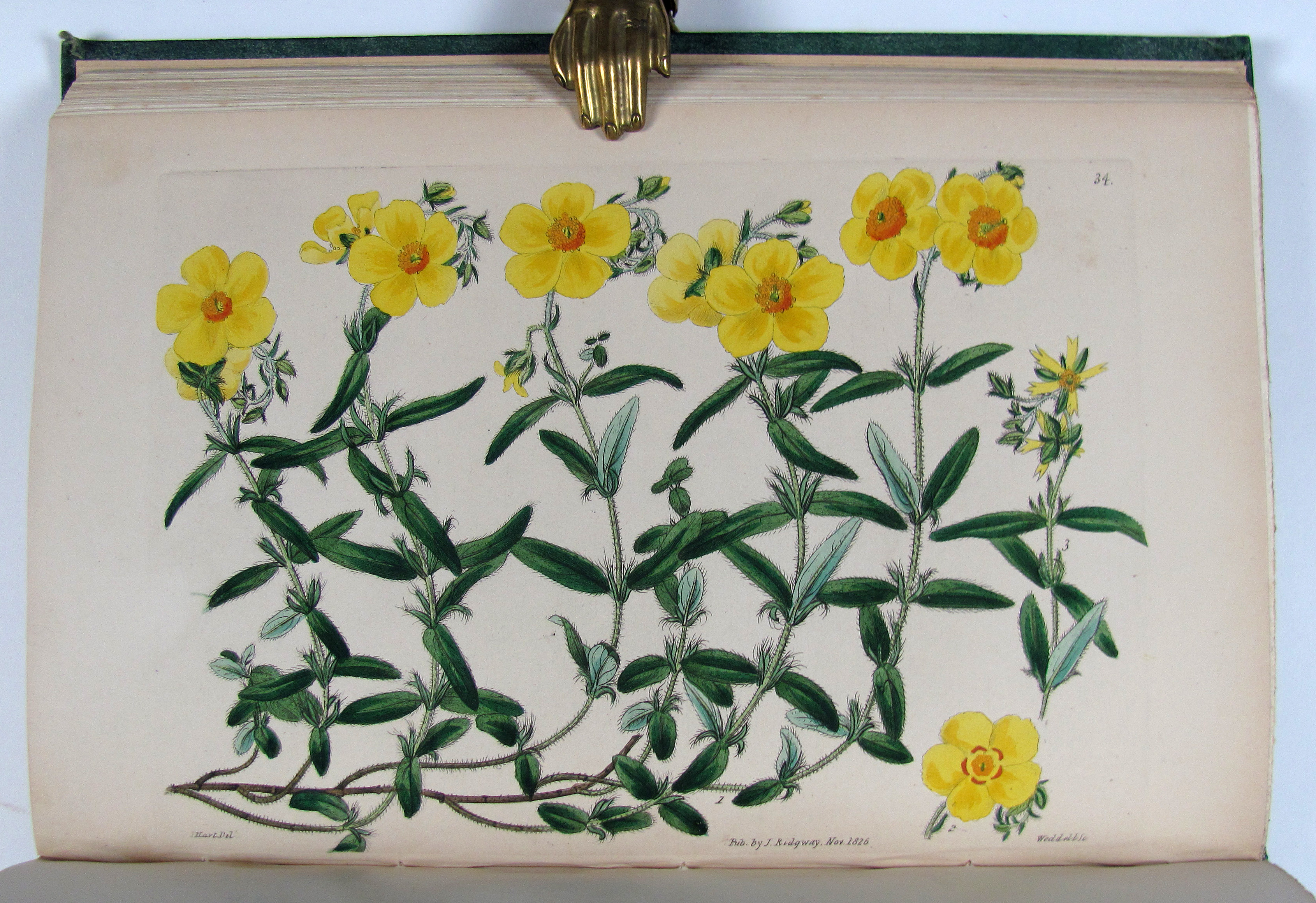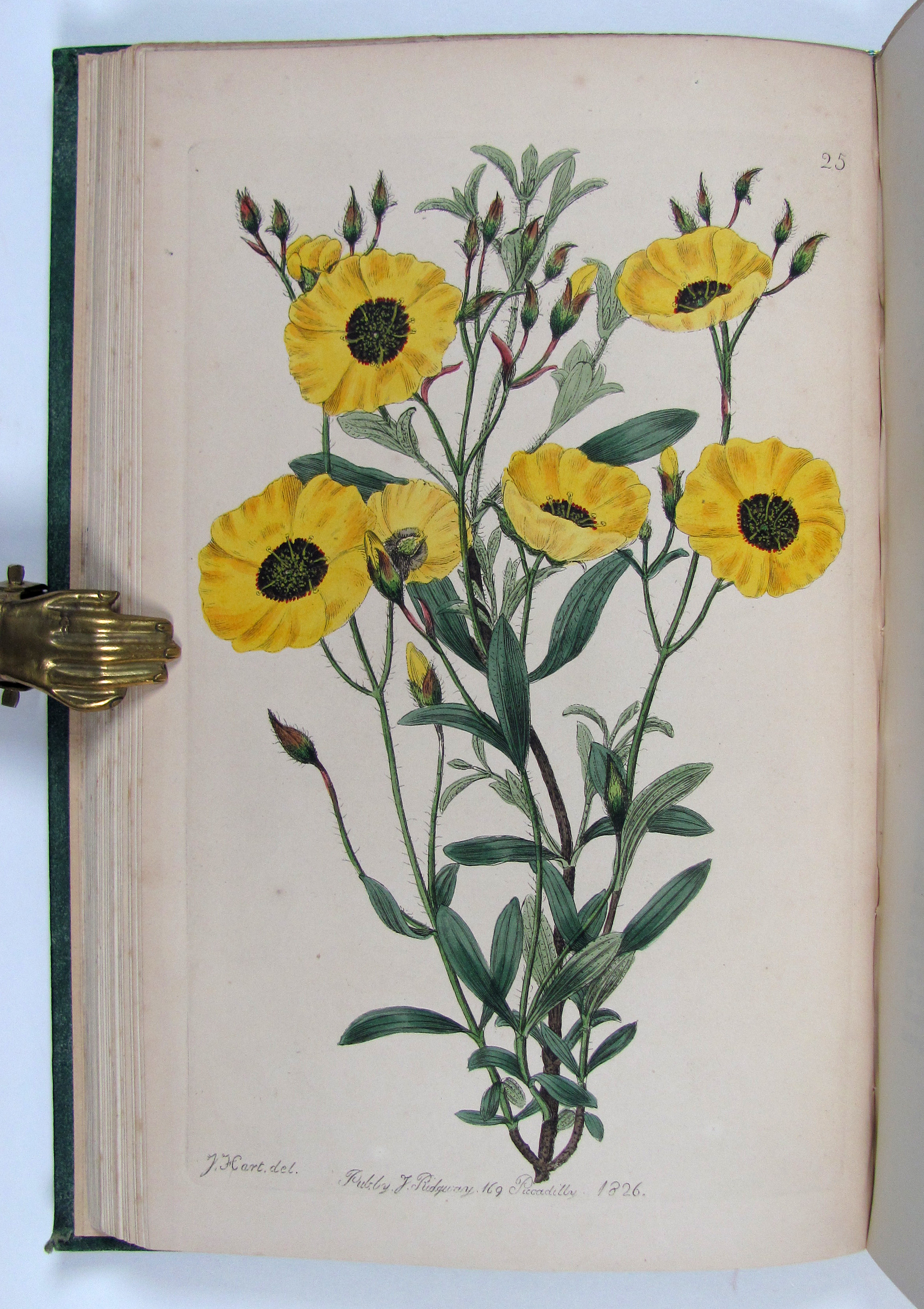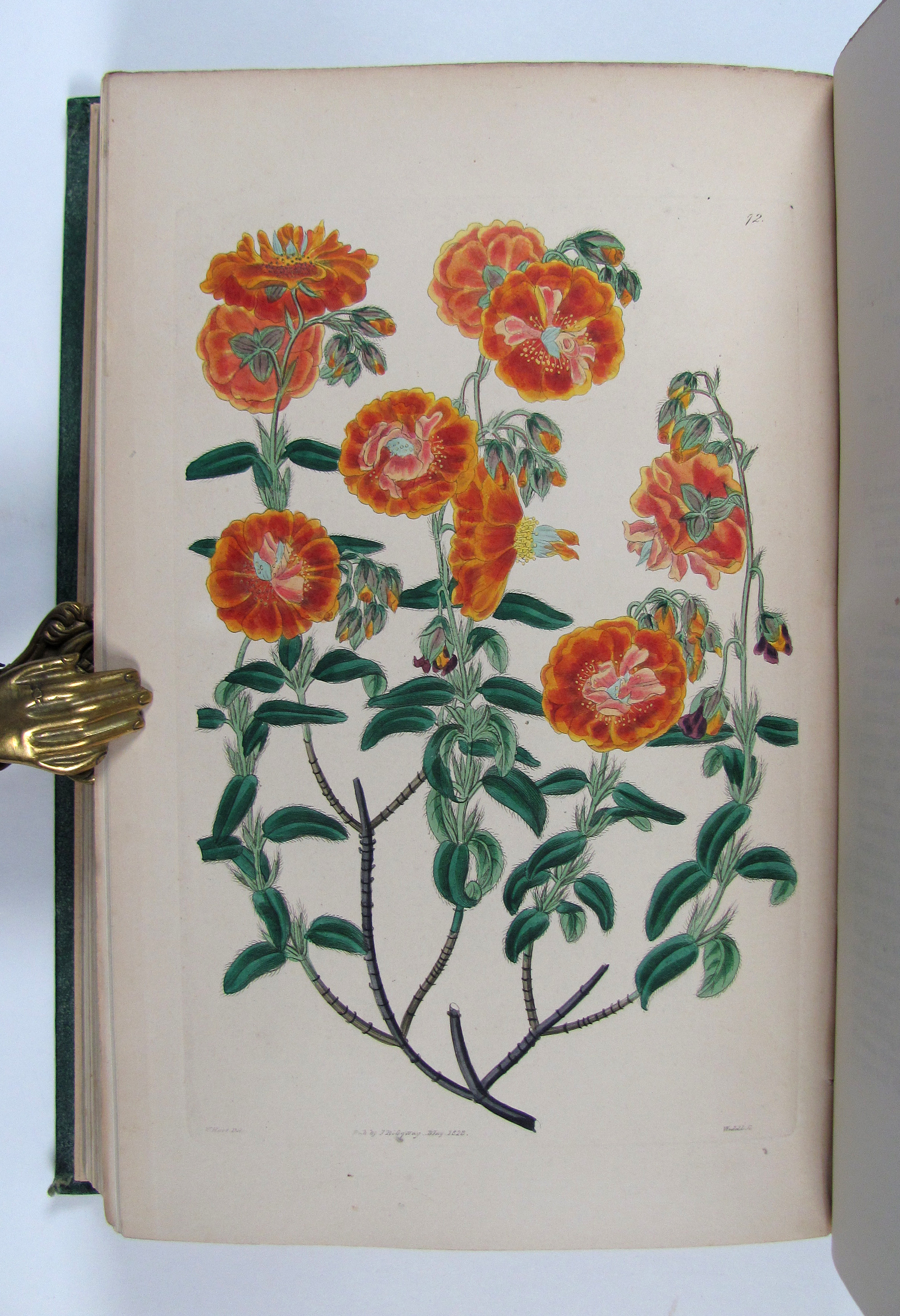 Maßgebliche der Monographie zur Pflanzenfamilie der Zistrosengewächse mit sehr schönen Tafeln in feinem Kolorit. Diese Pflanzen sind meist immergrüne, kleine Sträucher, deren Blütenformen Rosen ähnlich sind. Als Ziergewächse sind sie deshalb sehr beliebt. Sweet (1783-1835) war ein bekannter Gartenbauer, Mitglied der Linnean Society und veröffentlichte einige Werke zu einheimischen Kulturpflanzen. Die hübschen Tafeln wurden von Watts und Wedell nach J. und M. Hart sowie Miss Brown geschaffen.– Schönes Exemplar im Originaleinband, Vorsätze erneuert, an den Rändern min. gebräunt.– Great Flower Books, S. 77. Nissen BBI 1922. Stafleu-C. 13.546.