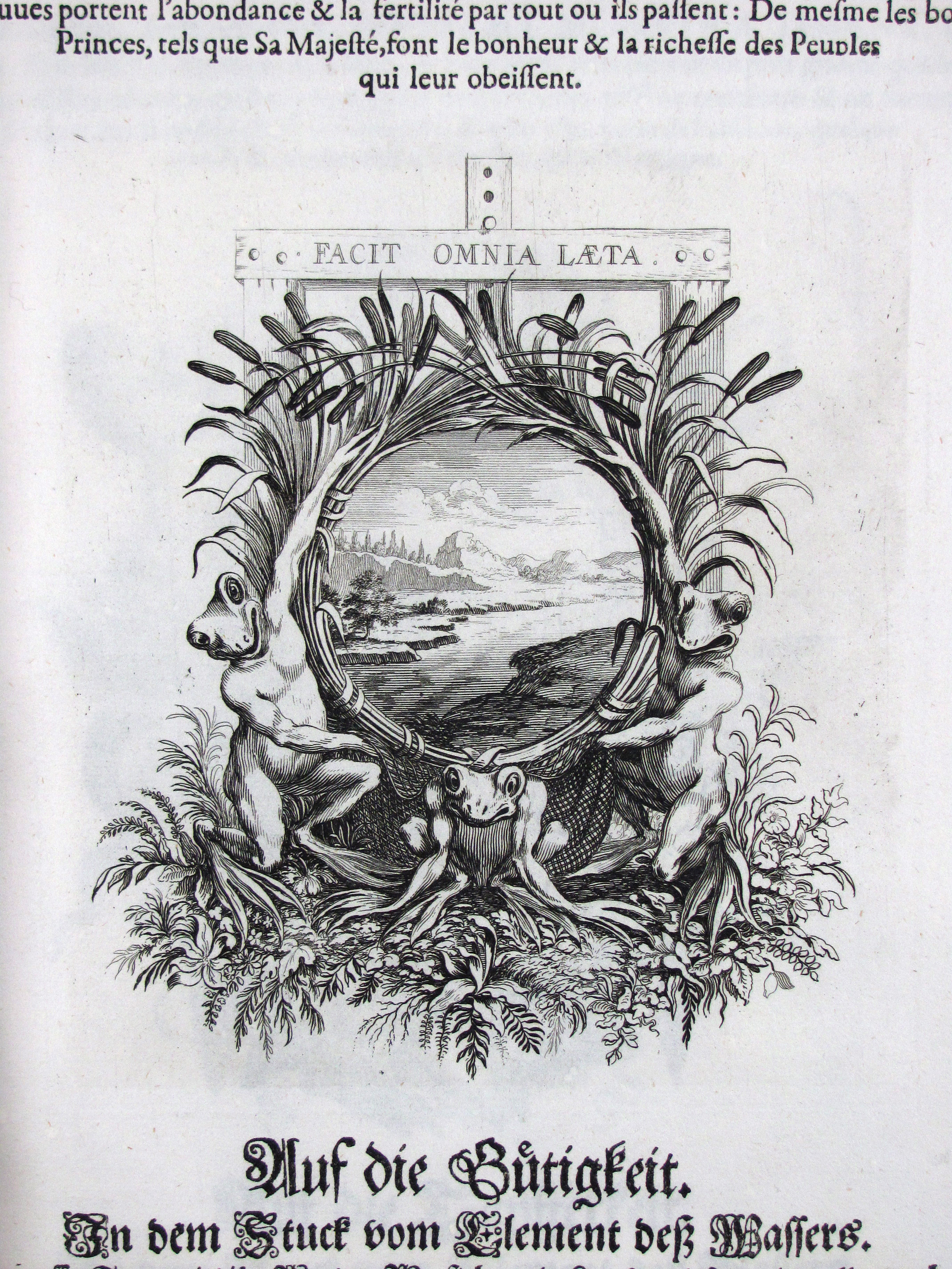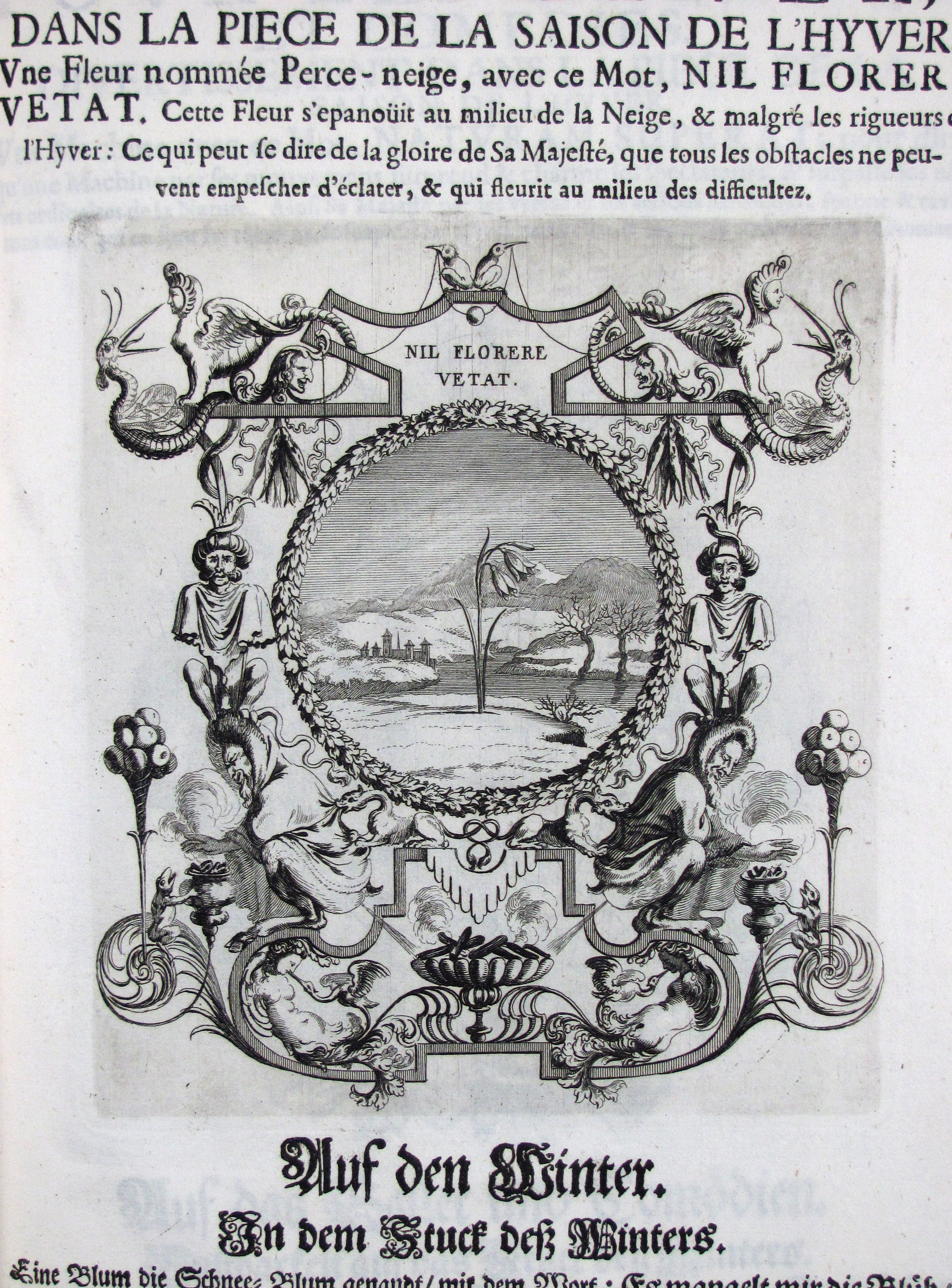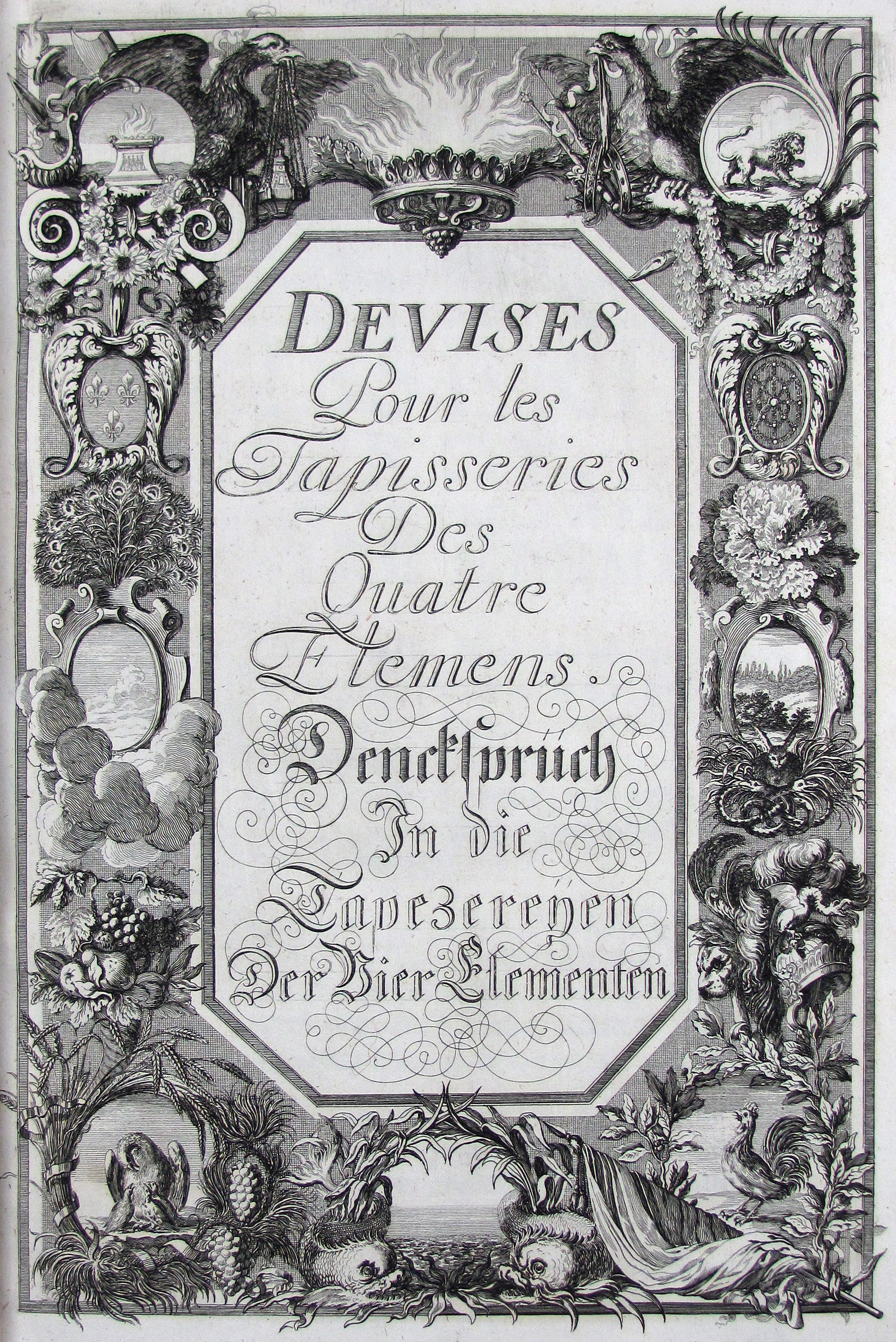 Tapisseries du Roy, ou sont representez les quatre elemens et les quatre saisons. Königliche Französische Tapezereyen oder überaus schöne Sinn-Bilder in welchen die vier Elemente samt den vier Jahr-Zeiten… vorgestellet werden.