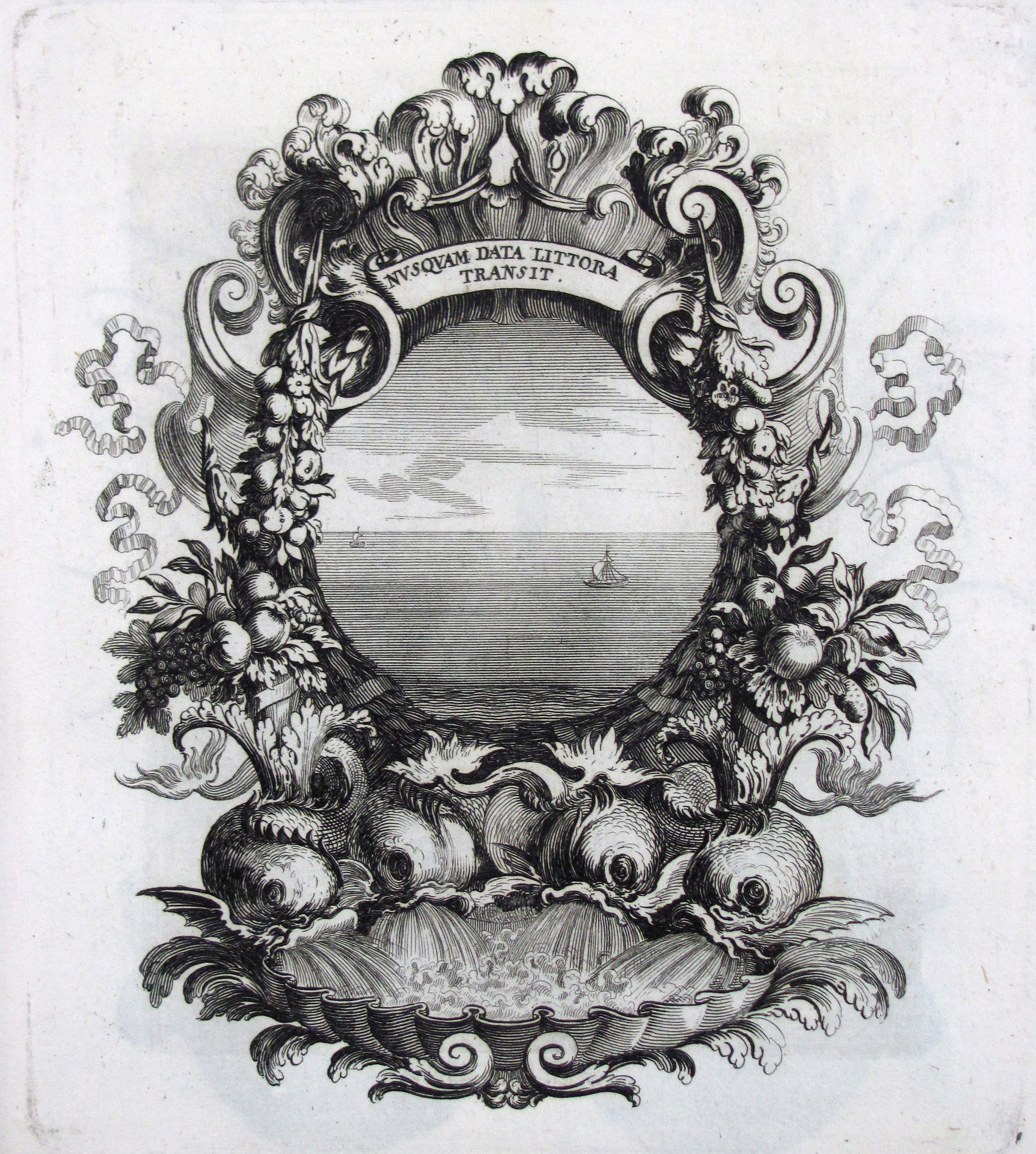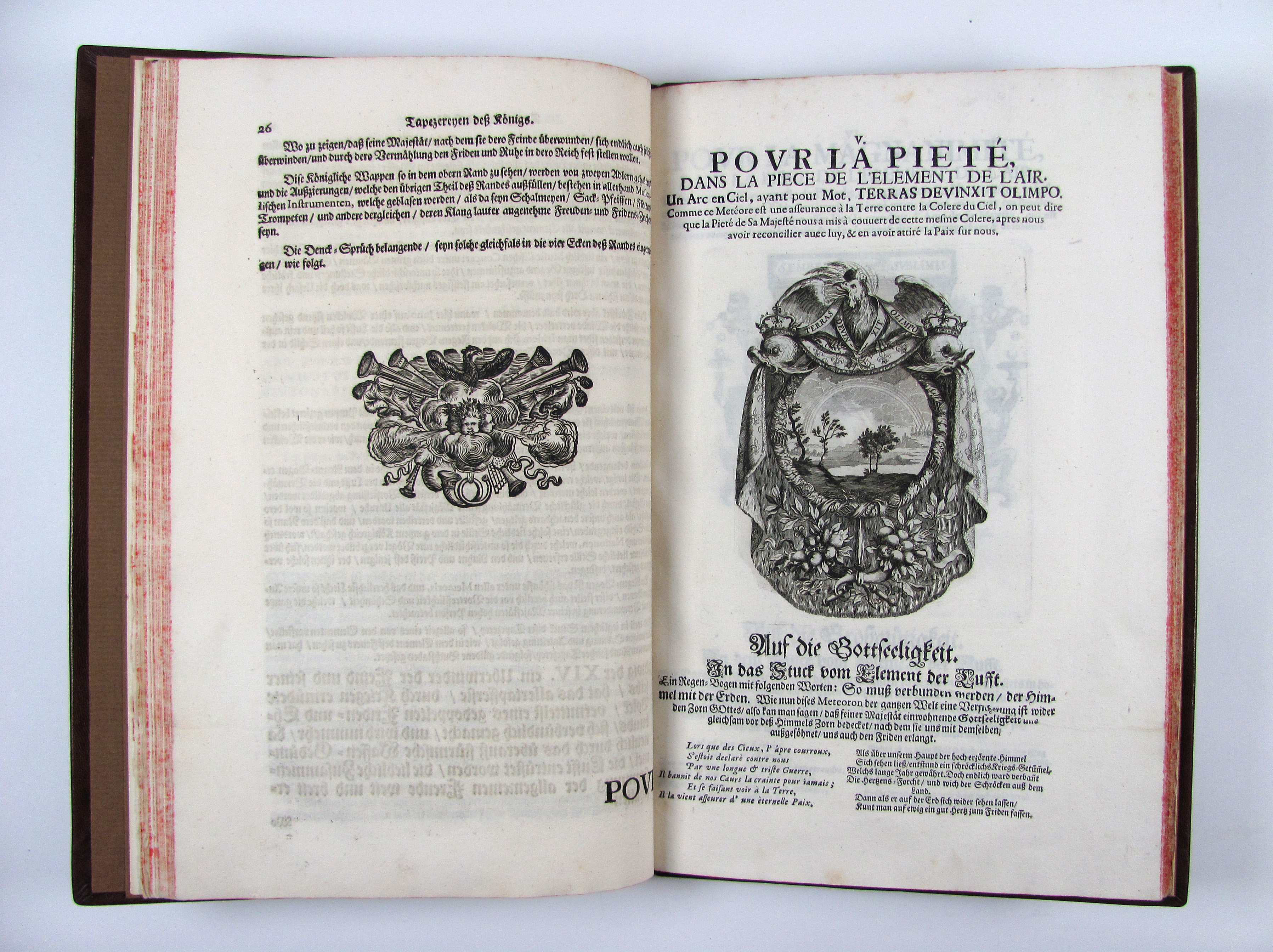 Erste Ausgabe, weitere Ausgaben erschienen 1690 und 1709.– Prächtiges barockes Kupferstichwerk des bekannten Augsburger Kupferstechers Krauss und seiner Frau, Tocher von Melchior Küsel. Es handelt sich um das erste Illustrationswerk von Krauss (1655-1719), der später mit der Bilderbibel und weiteren religiösen Kupferstichfolgen Berühmtheit erlangte. Seine Werke zeichnen sich durch originelle Bildkomposition wie durch technisch herausragende Ausführung des Stichs aus. Der vorliegende Erstling zeigt in der Ausführung des Stiches durch ihn und seine Frau bereits grosse Reife. Die Kupfer sind Nachstiche der Folge von S. Le Clerc, der die berühmten Wandteppiche Louis XIV. erstmals 1655 in Kupfer abbildete. Die Teppiche, welche die vier Elemente und die vier Jahreszeiten darstellen, wurden nach Entwürfen von Charles Le Brun geschaffen. Es waren die ersten Erzeugnisse der neu gegründeten königlichen Textilmanufaktur. Le Clercs Stiche waren seitenverkehrt in der Abbildung, durch die Kopie erscheinen die Abbildungen der Teppiche hier wieder seitenrichtig. Die 8 doppelseitigen Tafeln zeigen den ganzen Gobelin, die 32 grossen Textkupfer die jeweils vier Embleme pro Teppich. Diese Stiche kann man als eigenständige Bildschöpfungen bezeichenen, da die Emblemabbildungen, die nach Originalen von Jacques Bailly gewebt wurden, hier in phantasievollen, neu geschaffenen Barockrahmen präsentiert werden. Begleitet werden die emblematischen Abbildungen Charles Perraults Madrigalversen und deren neue Übersetzung.– Mit hervorragen Abzügen der Kupfer. Zwei Blätter mit kleinen unauffällig hinterlegten Randeinrissen, zwei weitere mit winziger Wurmspur im unteren Rand, ein Faltkupfer mit sehr kleinem Wasserfleck, der obere Rand etwas knapp, insgesamt aber ein frisches, sauberes und überdurchschnittlich gut erhaltenes Exemplar.– Kat. d. Ornamenstichslg. Berlin 1672. Praz 334. Faber du Faur 1846.