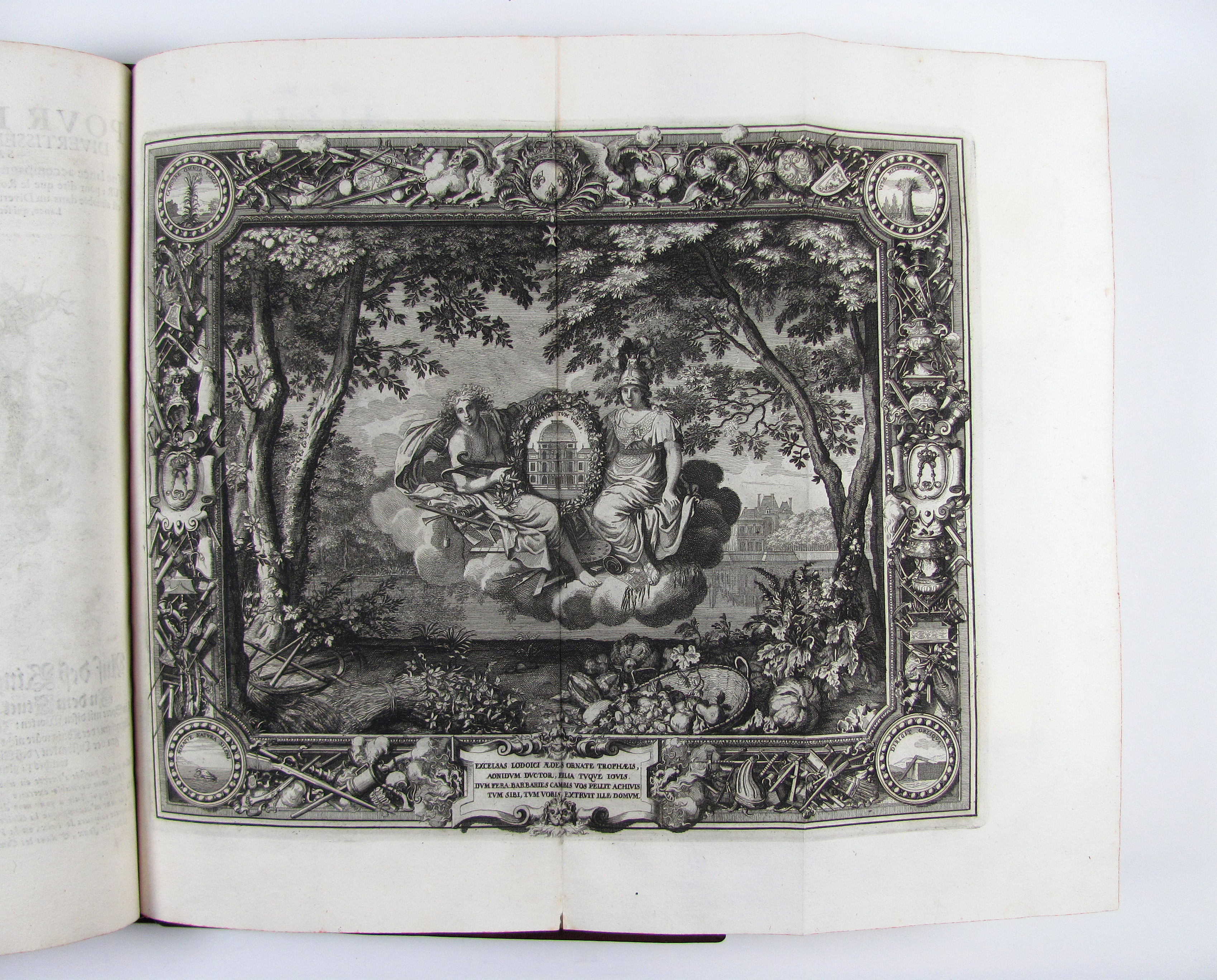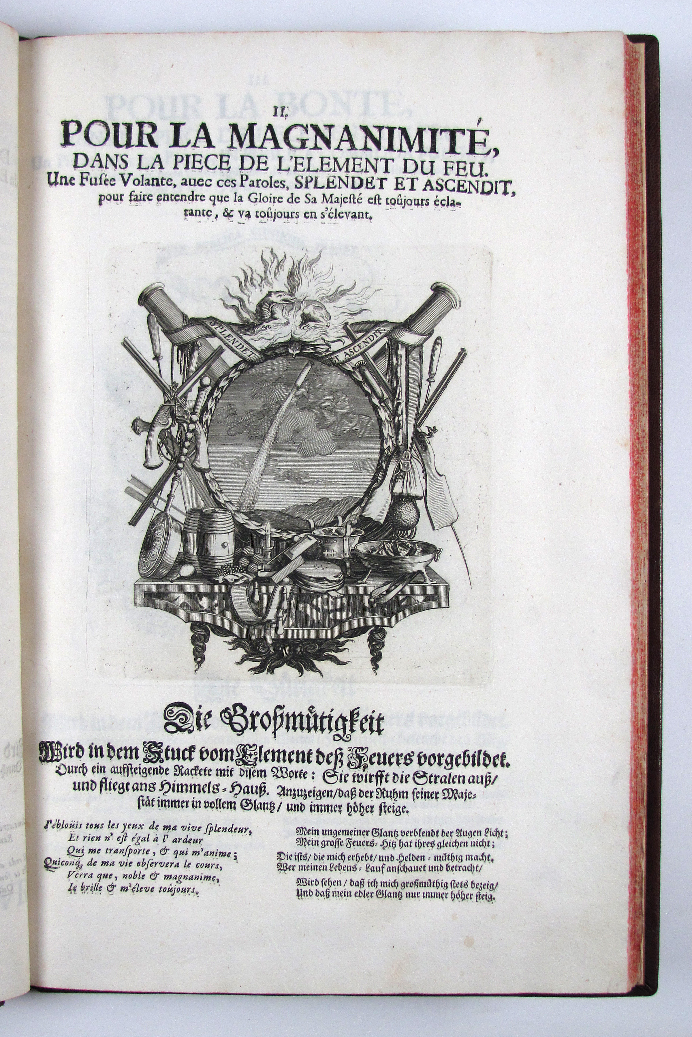 Folio. 4 Bl., 129 S. Mit 3 gestoch. Frontispizen, 8 Kupfertafeln, davon 7 gefalt., 1 doppelblattgr., 32 emblematischen Textkupfern, 2 gestoch. Kopfvignetten, 2 gestoch. Initiale sowie einigen Holzschnittvignetten. Neuerer, brauner Kalbslederbd. mit 2 goldgepr. Rückenschildchen.