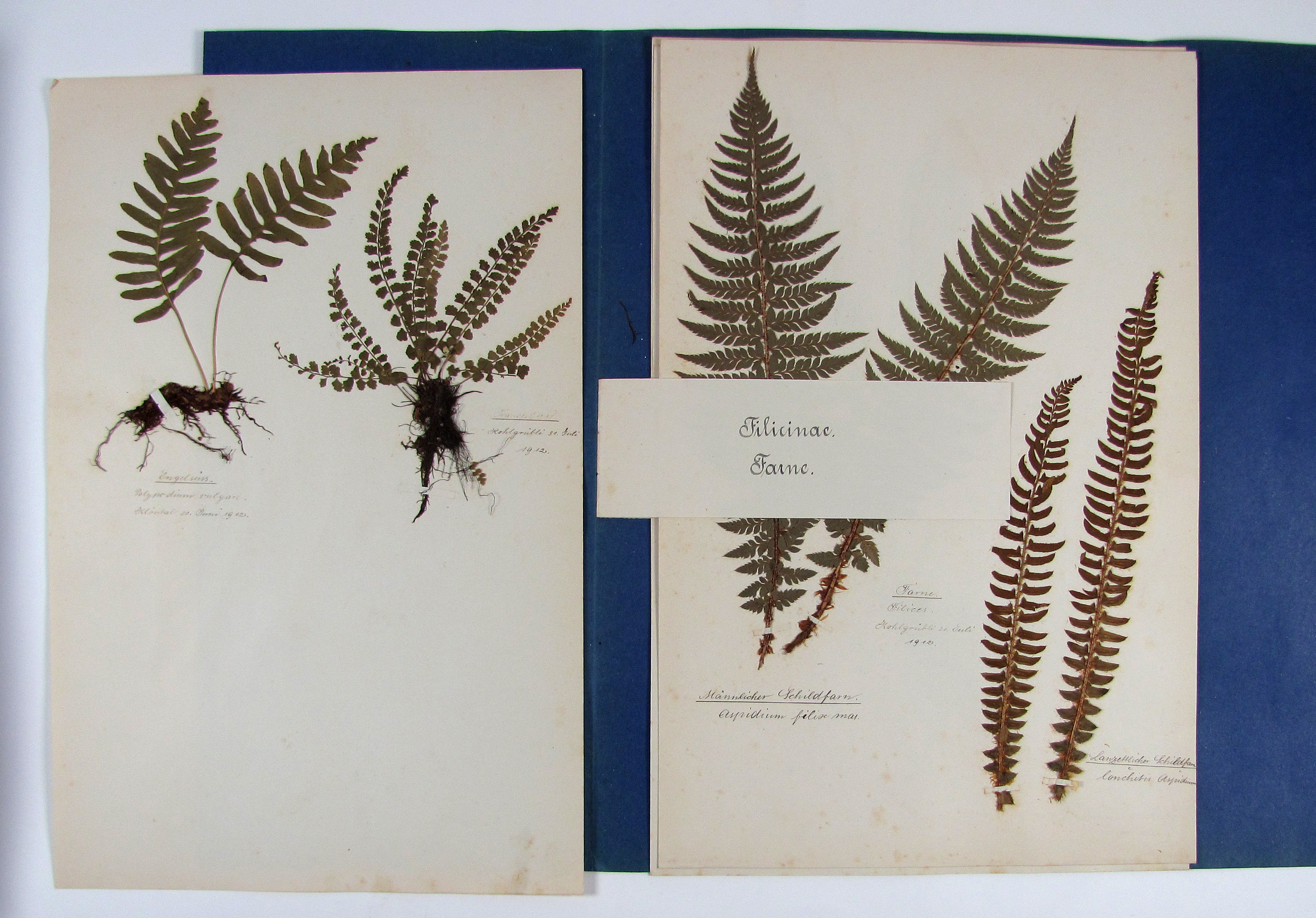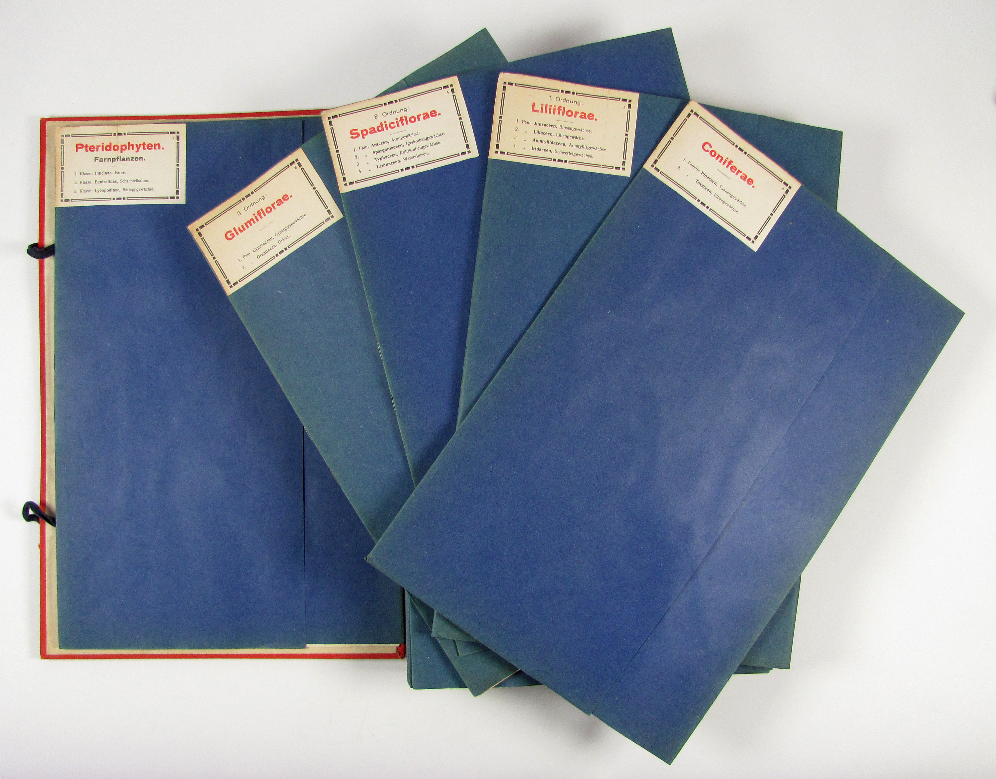 Das sorgfältig erstellte und umfangreiche Herbarium dürfte zu pädagogischen Zwecken, z.B. als Teil einer Ausbildung zum Botaniker, Apotheker etc., angelegt worden sein. Dafür sprechen die gedruckten Etiketten der Mappen, die auch eine systematische Ordnung vorgeben. Nicht in jn jedem Fall stimmen die Etiketten auch mit dem Inhalt überein. Die Fundorte waren Sack (?), Guppen, Rüti (ob. Glarus) Gilly, Klöntal u.a.– Mappen Nr. 4 „Spadiciflorae“ und Nr. 6 „Helobiae“ ohne Inhalt. Ungewöhnlich schönes, reichhaltiges Herbarium mit sehr gut erhaltenen Pflanzen.