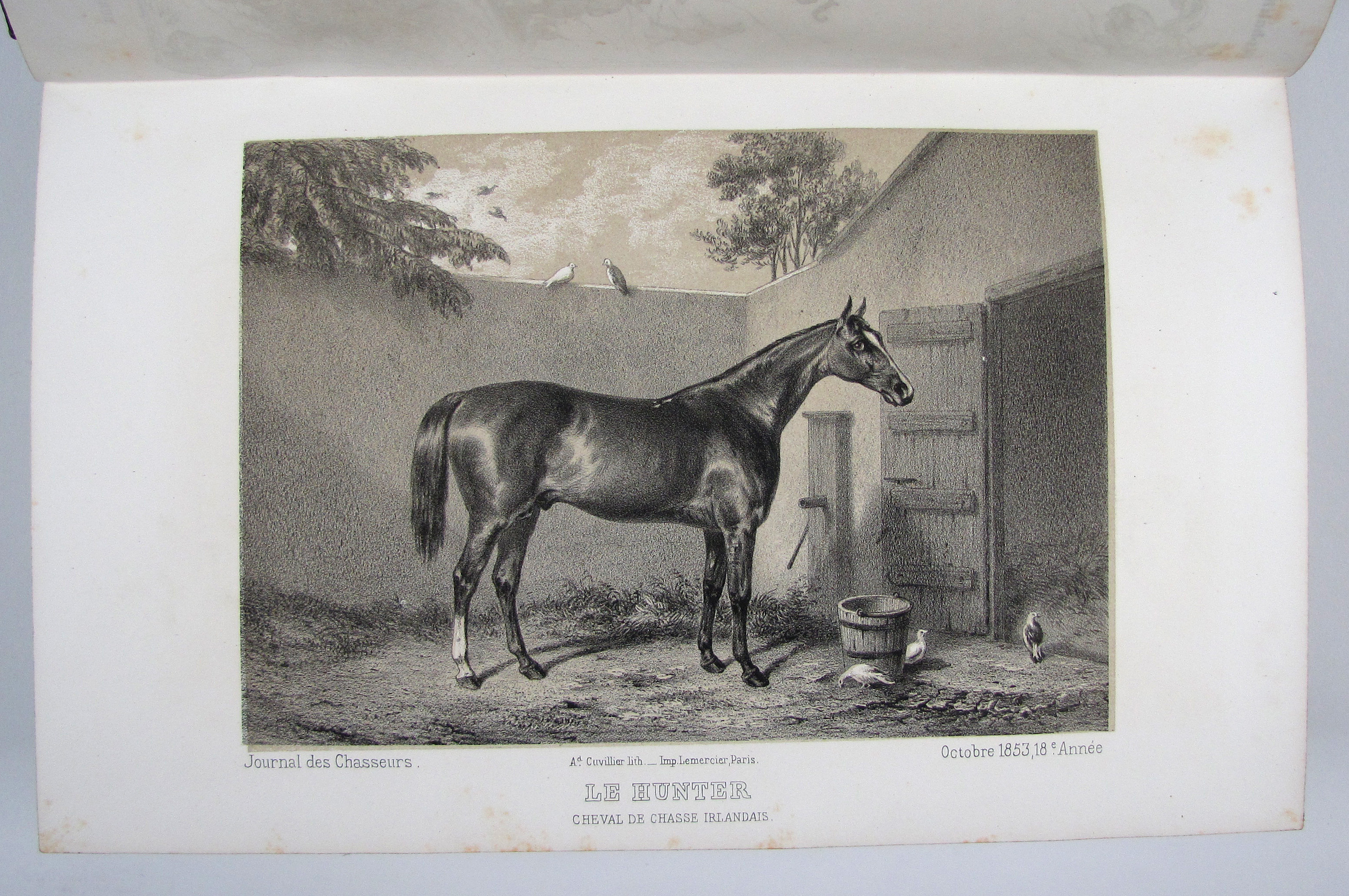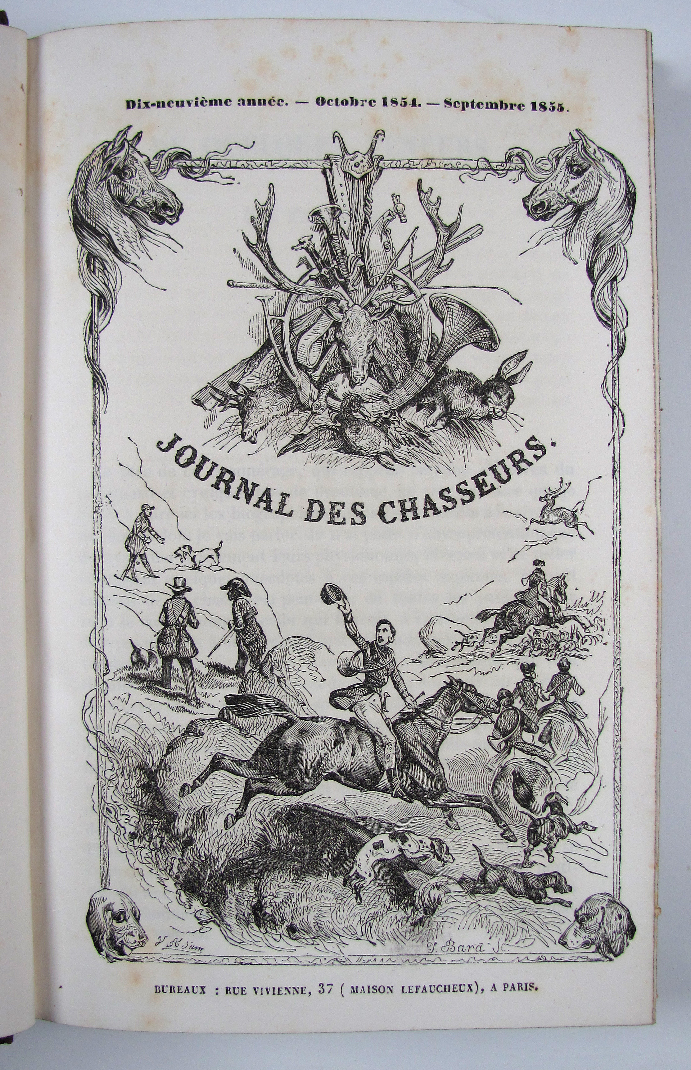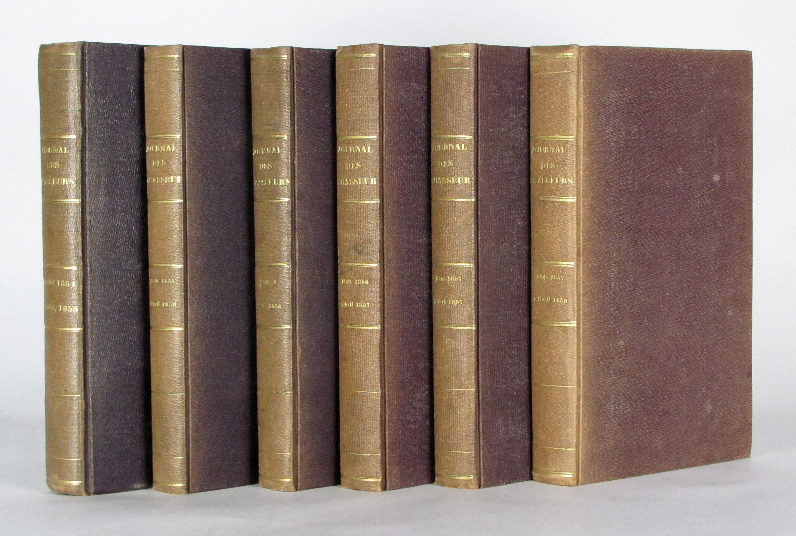 Selten umfangreiche Reihe der bekannten französischen Jagdzeitschrift, insgesamt in 34 Jahrgängen zwischen 1836 und 1870 erschienen. Die Tafeln zeigen Jagdszenen, jagdbare Tiere, Jagdhunde, Pferde und vereinzelt auch Humoristisches. Diesem textlich kompletten Exemplar fehlen lediglich 3 Tafeln (Jg. 20/II: „Un facheux“; Jg. 26/II: „Le lièvre“; Jg. 27/I: „Philosophe“). Ein Tafel in Jg. 24/I doppelt vorhanden. 14 Bänden sind die Orig.-Lieferungsumschläge beigebunden.– Einbände tls. leicht fleckig, 3 Bände mit Wasserflecken auf Einbänden und im Buchblock, Rücken verblaßt. Stellenw. leicht gebräunt bzw. stockfleckig.– Schwerdt I, 276 f. Thiébaud 523 f.