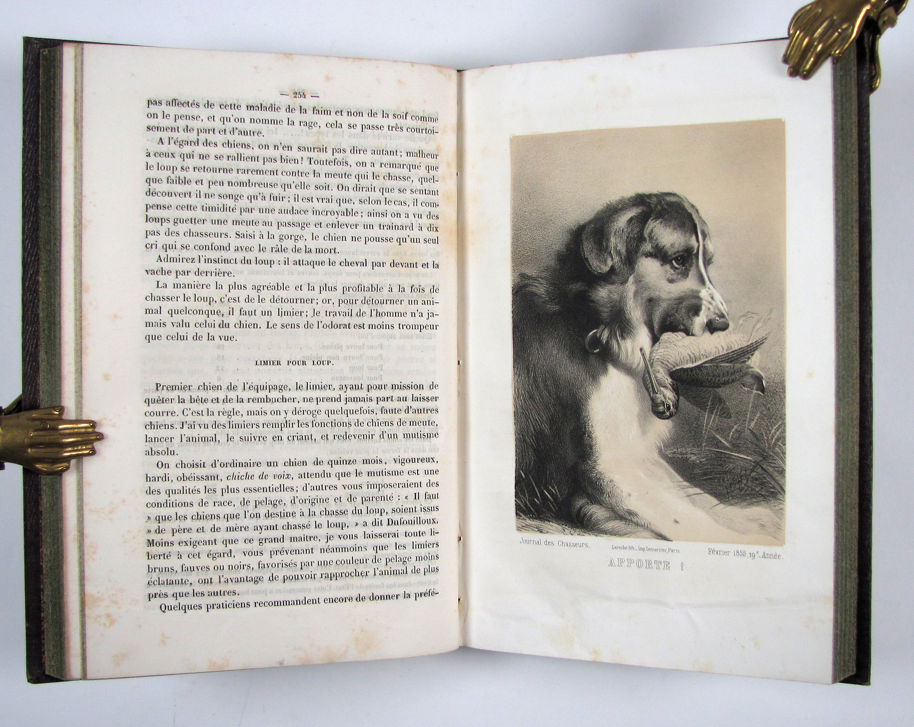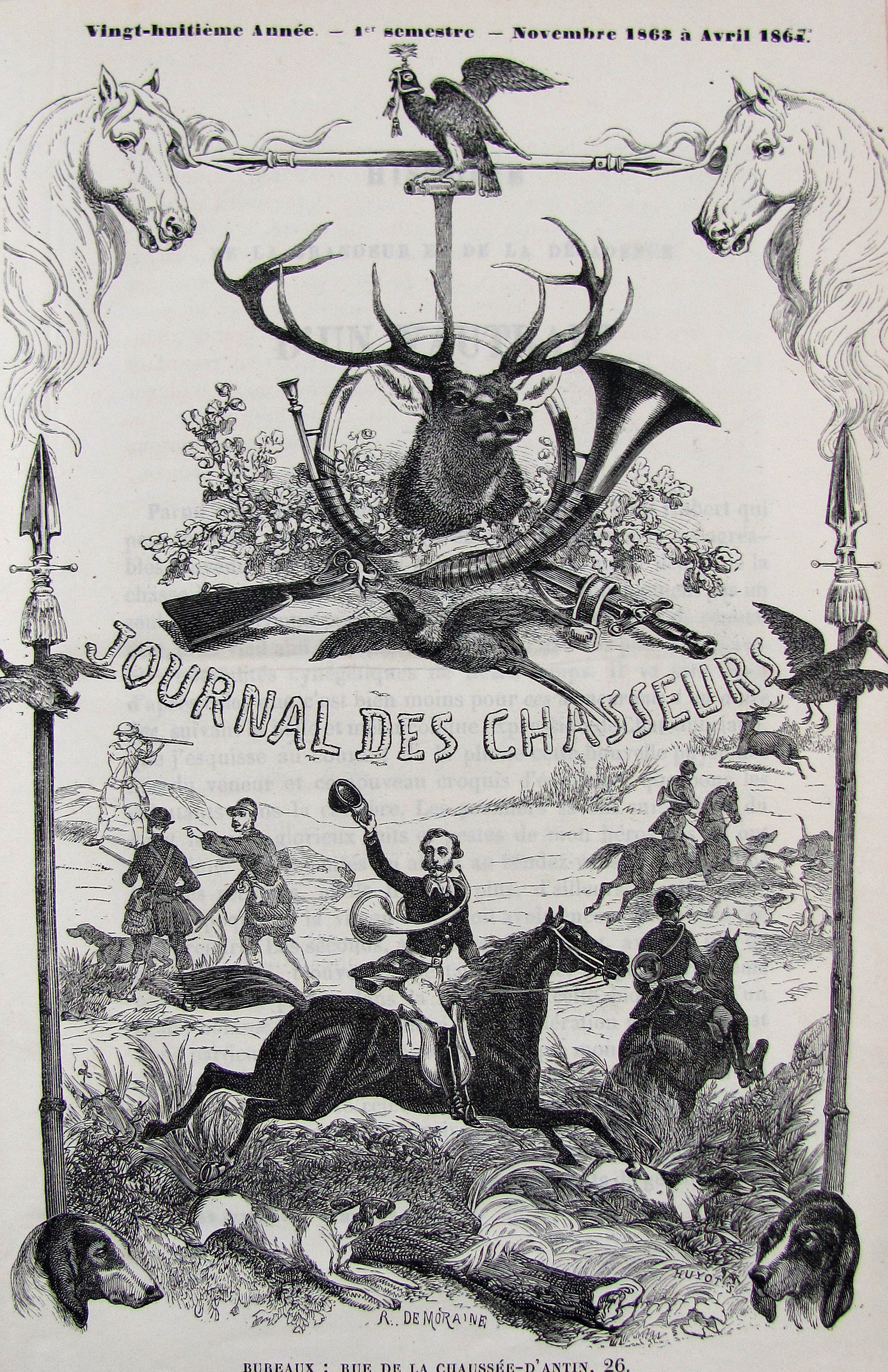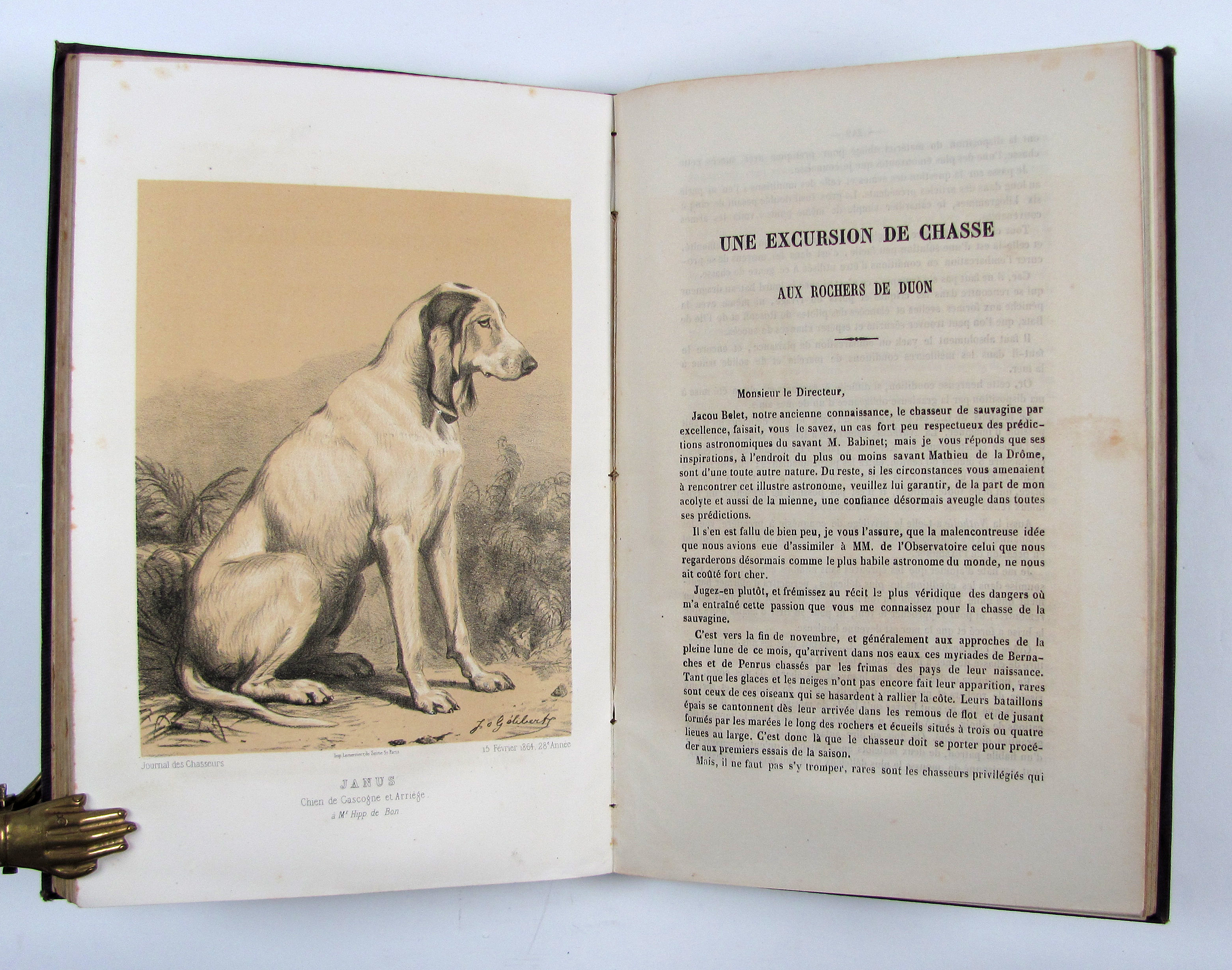 Selten umfangreiche Reihe der bekannten französischen Jagdzeitschrift, insgesamt in 34 Jahrgängen zwischen 1836 und 1870 erschienen. Die Tafeln zeigen Jagdszenen, jagdbare Tiere, Jagdhunde, Pferde und vereinzelt auch Humoristisches. Diesem textlich kompletten Exemplar fehlen lediglich 3 Tafeln (Jg. 20/II: „Un facheux“; Jg. 26/II: „Le lièvre“; Jg. 27/I: „Philosophe“). Ein Tafel in Jg. 24/I doppelt vorhanden. 14 Bänden sind die Orig.-Lieferungsumschläge beigebunden.– Einbände tls. leicht fleckig, 3 Bände mit Wasserflecken auf Einbänden und im Buchblock, Rücken verblaßt. Stellenw. leicht gebräunt bzw. stockfleckig.– Schwerdt I, 276 f. Thiébaud 523 f.