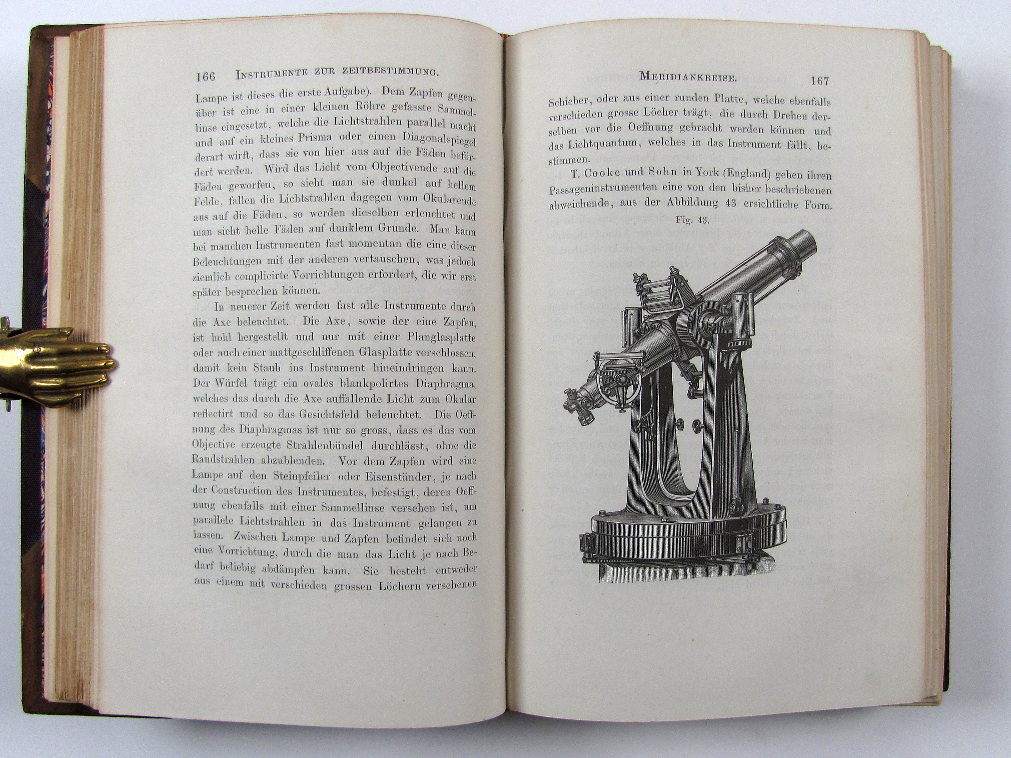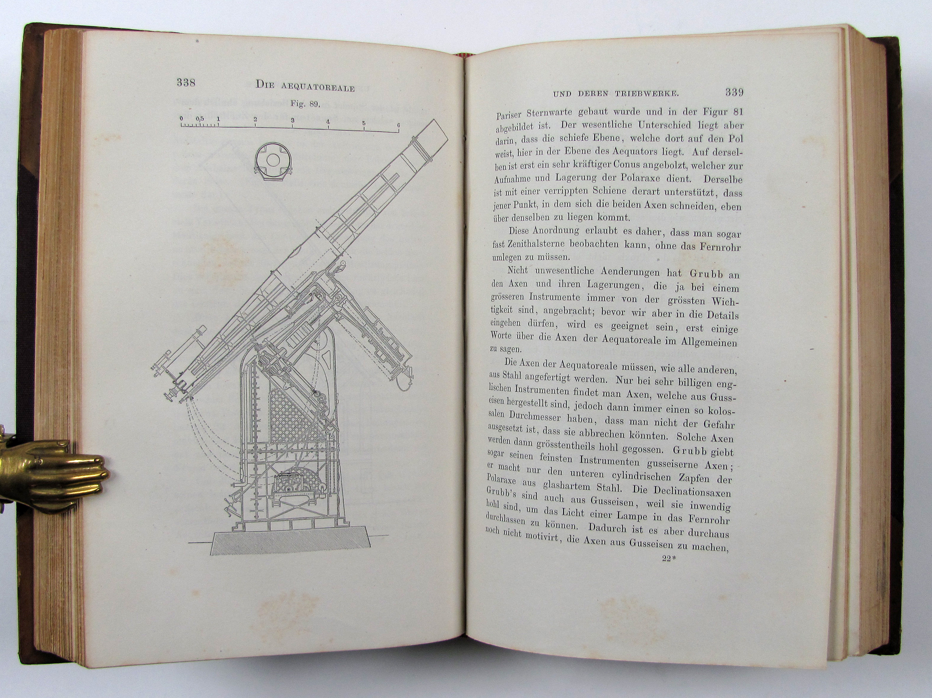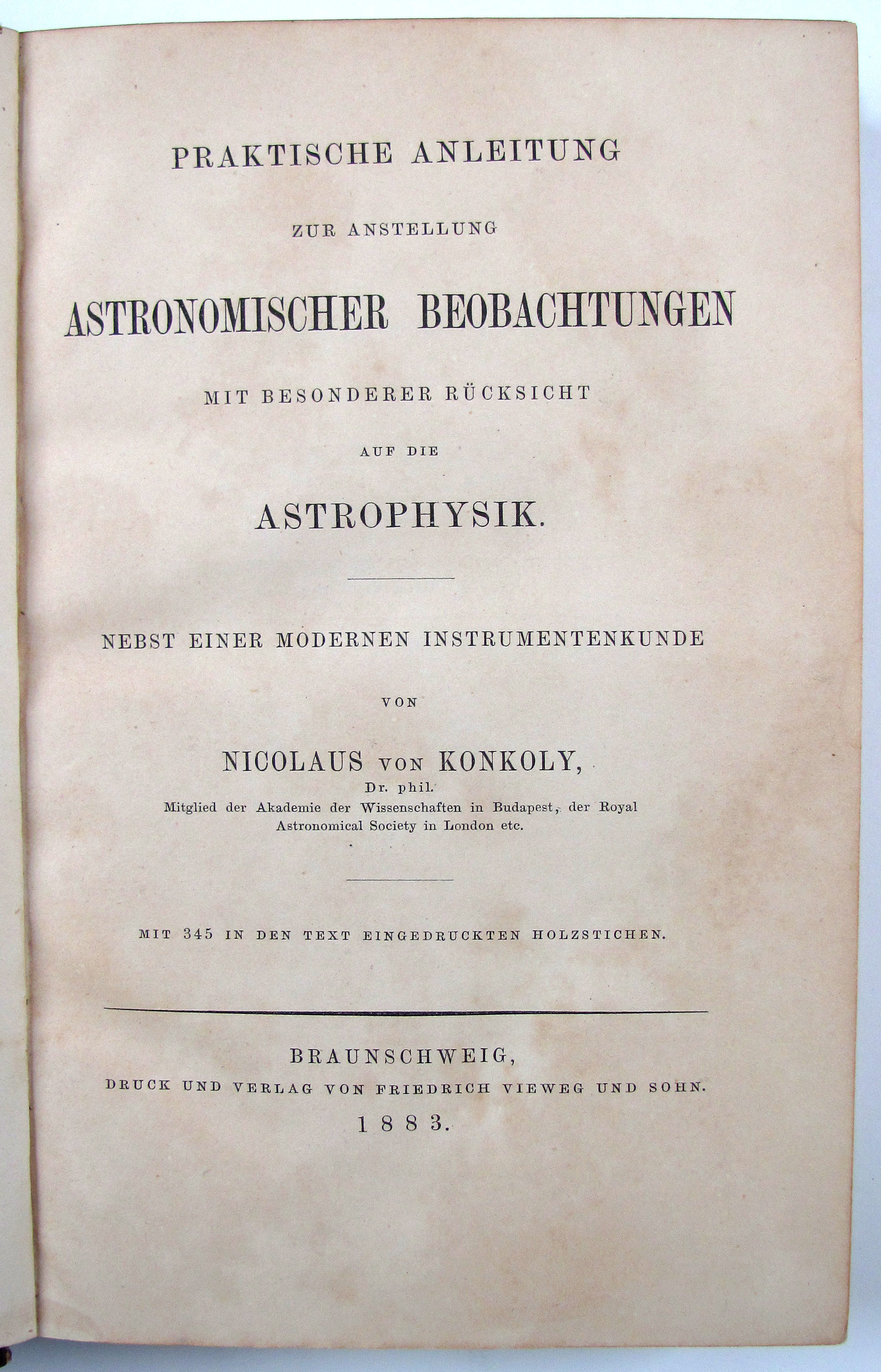 Der Verfasser gründete eine Sternwarte auf seinem Gute O’Gyalla bei Komorn (Ungarn) und wurde 1890 Direktor der Ungar. meteorologischen Reichsanstalt in Budapest.– Die Textholzstiche mit vielen präzisen Abbildungen von Instrumenten.– Vgl. Poggendorff IV/II, 1488 (unter Thege Edler von Konkoly).