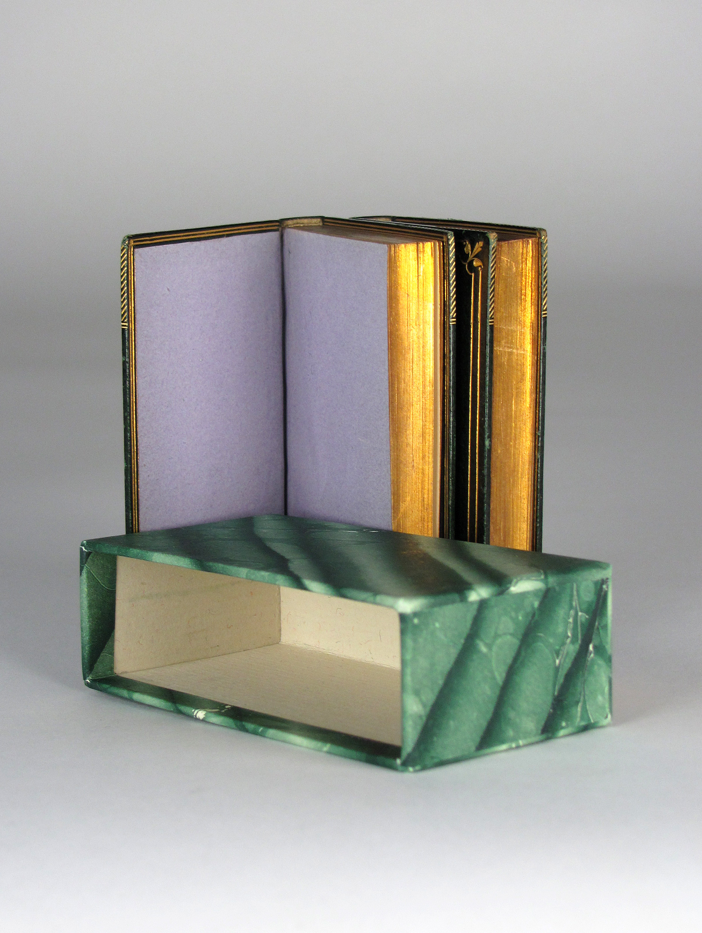 Für die Reihe der Diamond Classics wurde eine eigene Schrift erschaffen, die Diamond-Type, welche vom Drucker C. Corall verwendet wurde. Obwohl die Büchlein das Normmaß für Miniaturbücher (76 mm. Höhe) minimal übersteigen, sind sie doch von Sammlern und Bibliographen als hervorragende Beispiele für qualitätvolle Miniturbücher anerkannt. Ein Grund dafür ist die herausragende 4 1/2-Punkt große Diamond-Type, die gestochen scharf auf dem Papier steht, die Sorgfalt der Binderei und nicht zuletzt die Textauswahl.– Das vorliegende Exemplar in zwei hervorragenden Einbänden der Zeit und sehr gut erhalten.– Welsh 6608. Bondy S. 85.