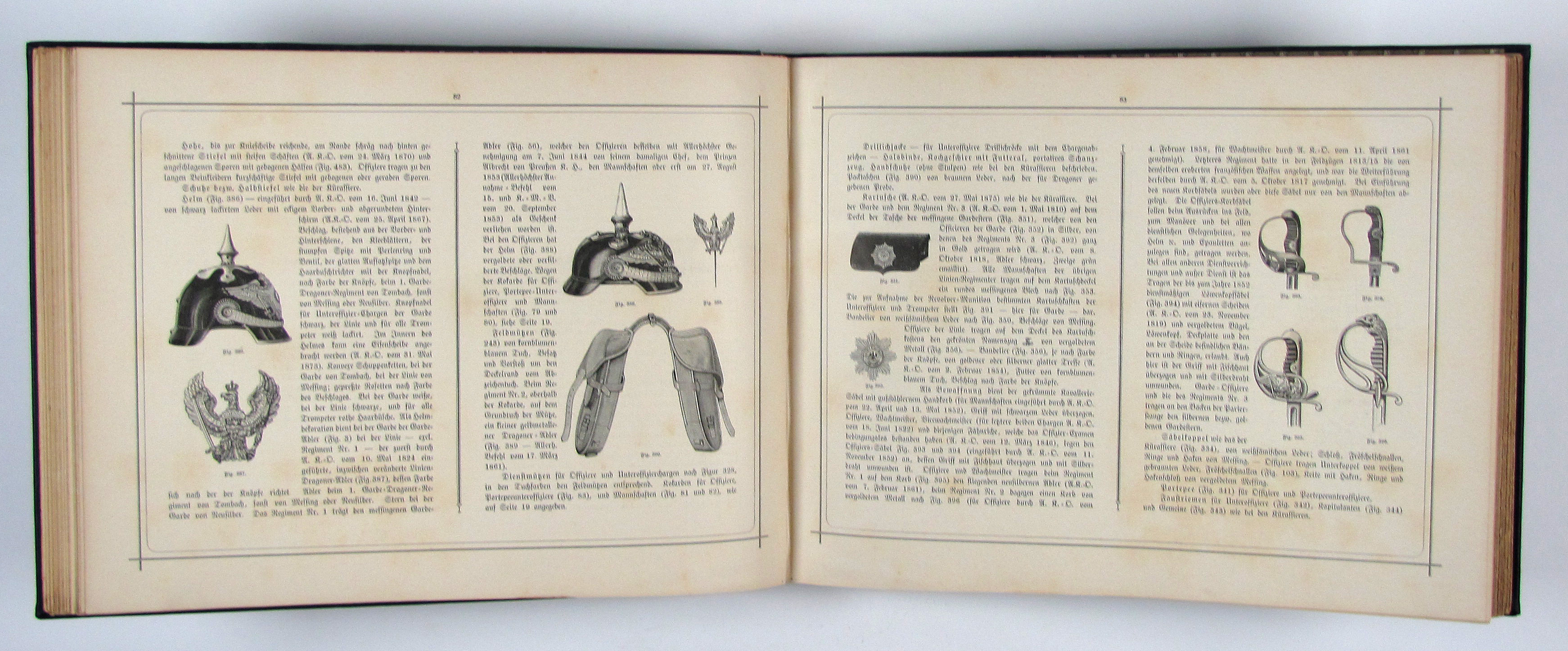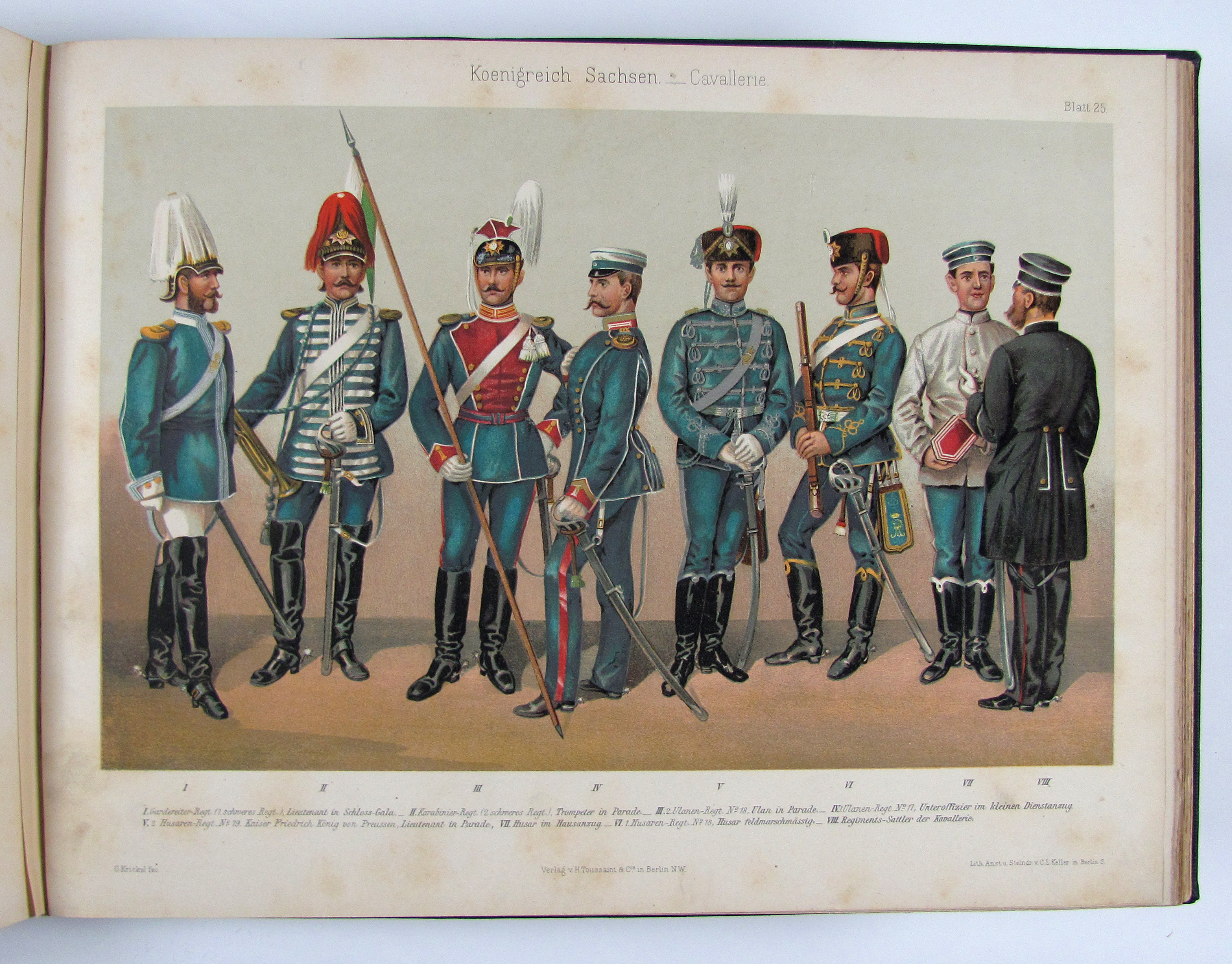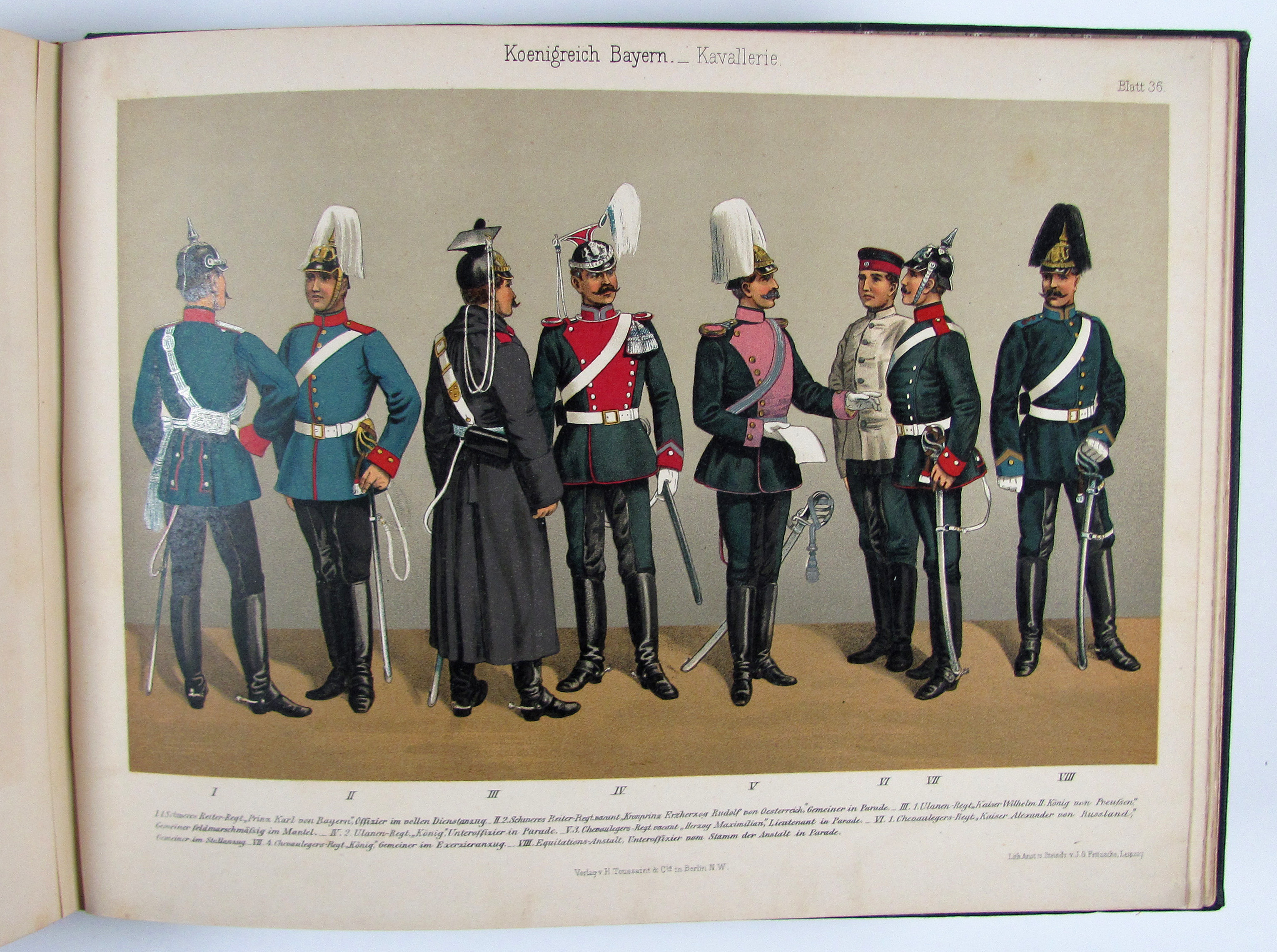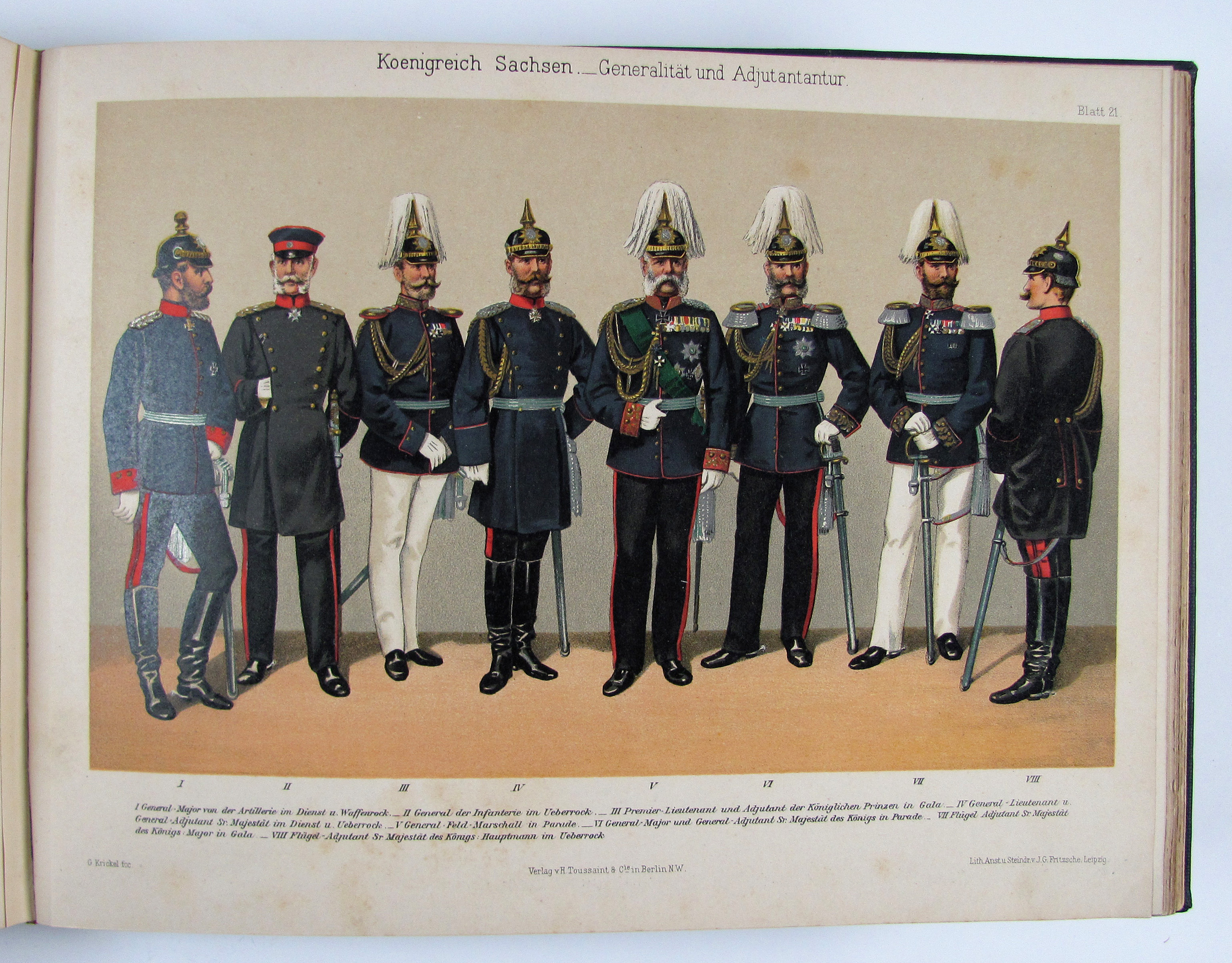 40 der Tafeln mit je 8 Uniformdarstellungen aus Preußen, Sachsen, Württemberg und Bayern, die restl. 5 Tafeln zeigen Pferde, Sättel und Zaumzeug. Dekorative und detaillierte Tafeln und umfangreicher, reich illustrierter Textteil.– Tadellos erhaltenes Exemplar aus der Sammlung C.F. Koch, Rotterdam.– Lipperheide 2138. Colas 1872.