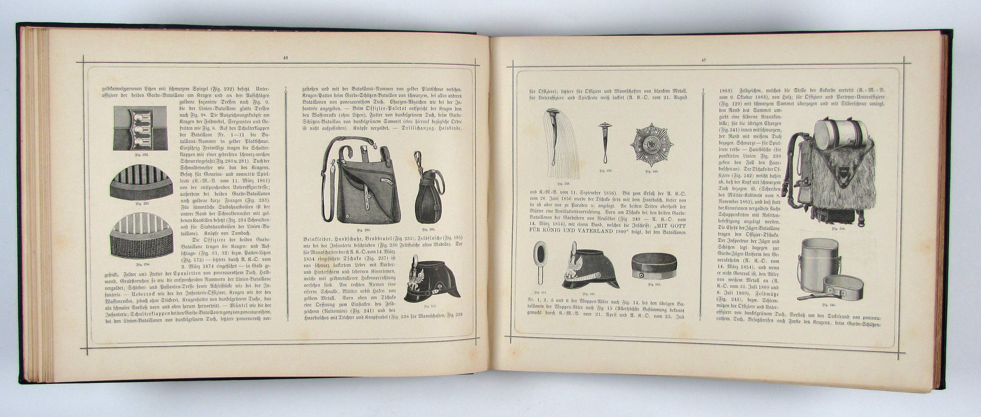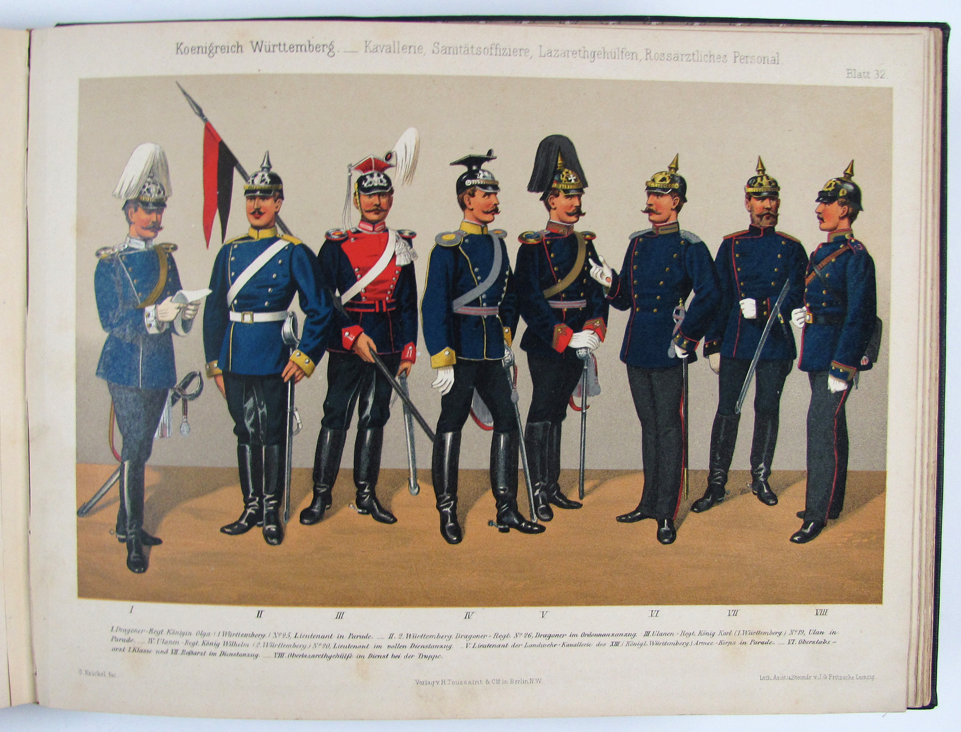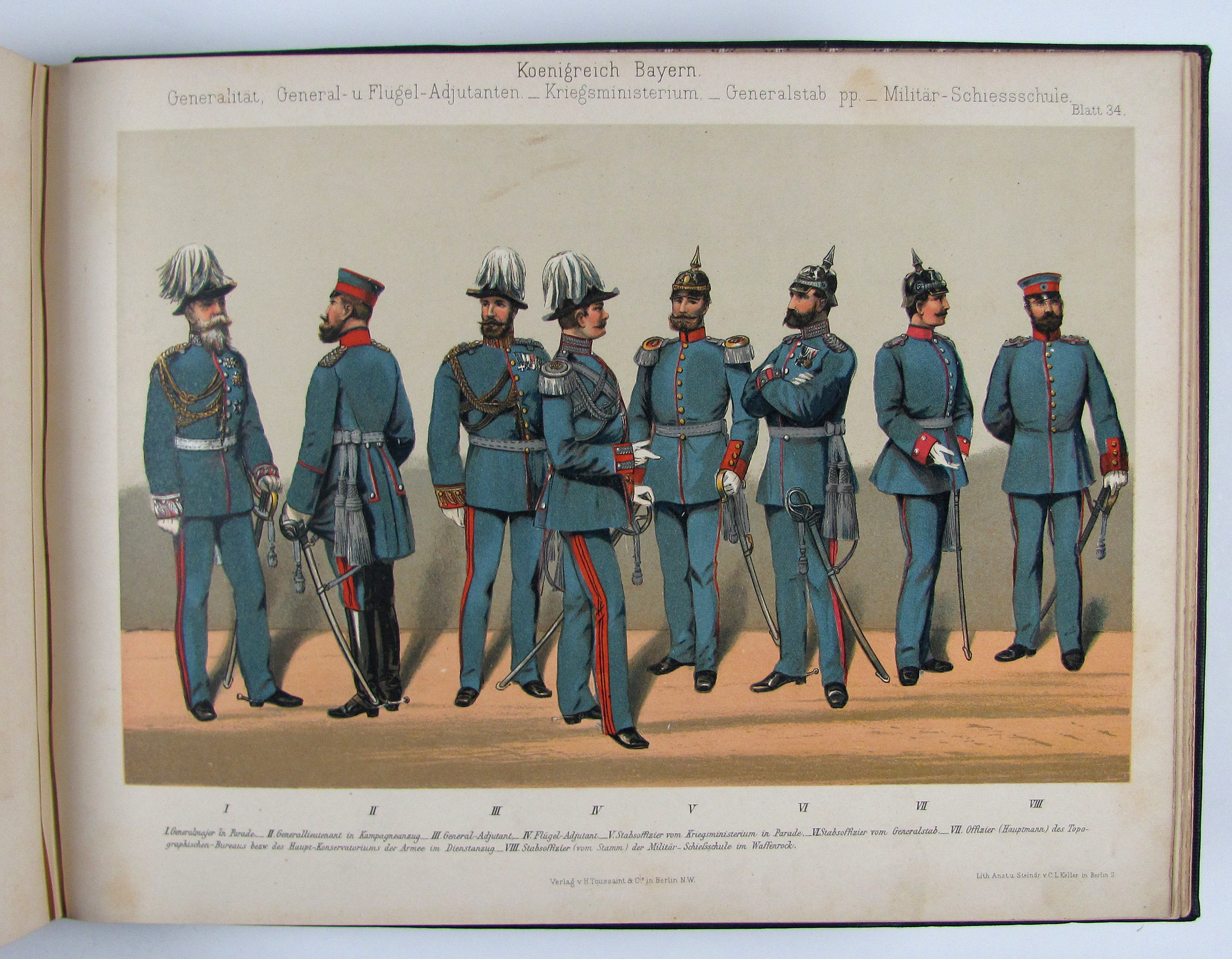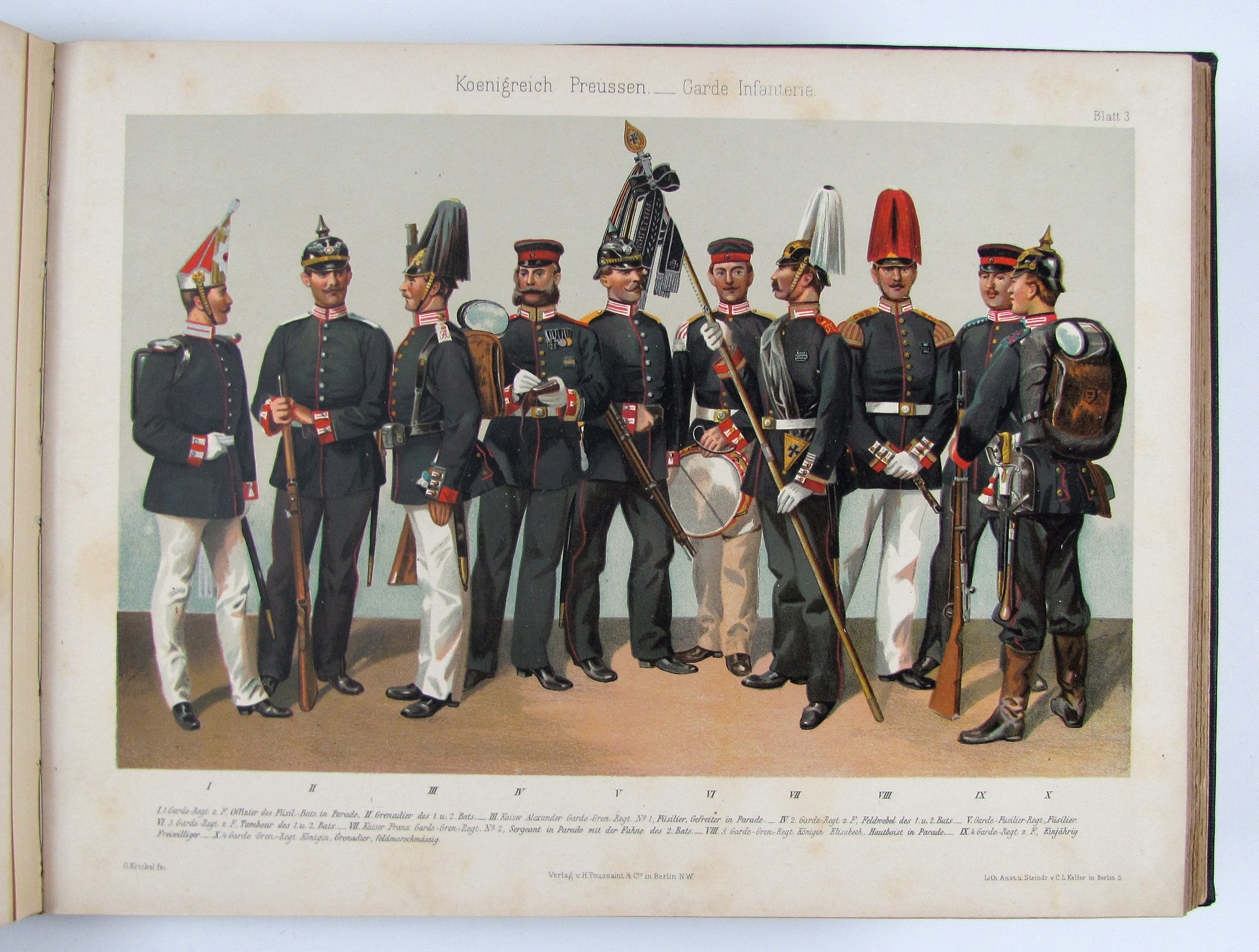 40 der Tafeln mit je 8 Uniformdarstellungen aus Preußen, Sachsen, Württemberg und Bayern, die restl. 5 Tafeln zeigen Pferde, Sättel und Zaumzeug. Dekorative und detaillierte Tafeln und umfangreicher, reich illustrierter Textteil.– Tadellos erhaltenes Exemplar aus der Sammlung C.F. Koch, Rotterdam.– Lipperheide 2138. Colas 1872.