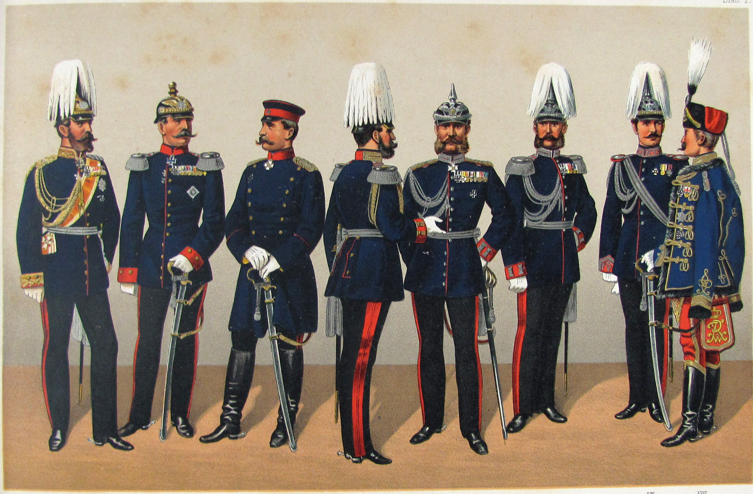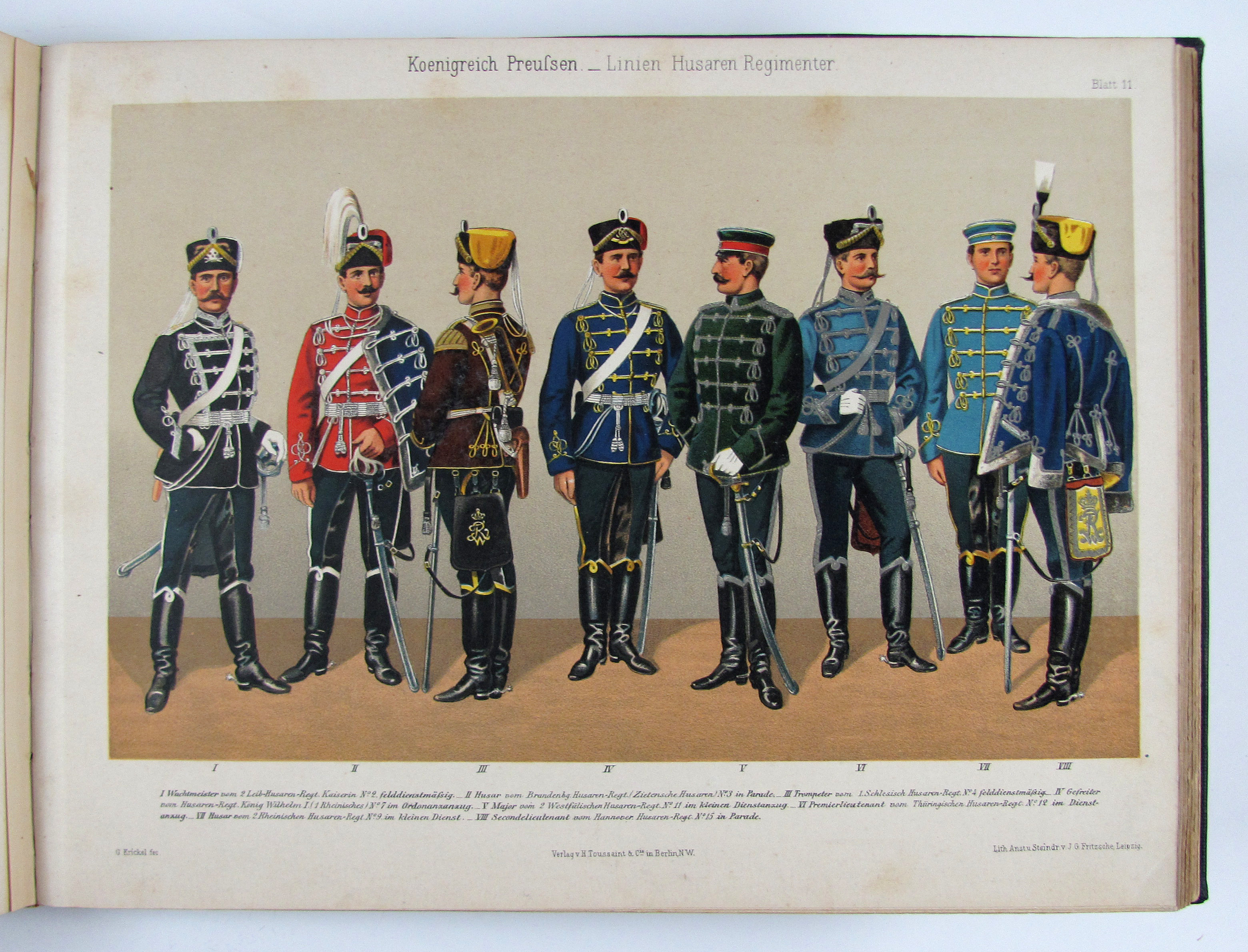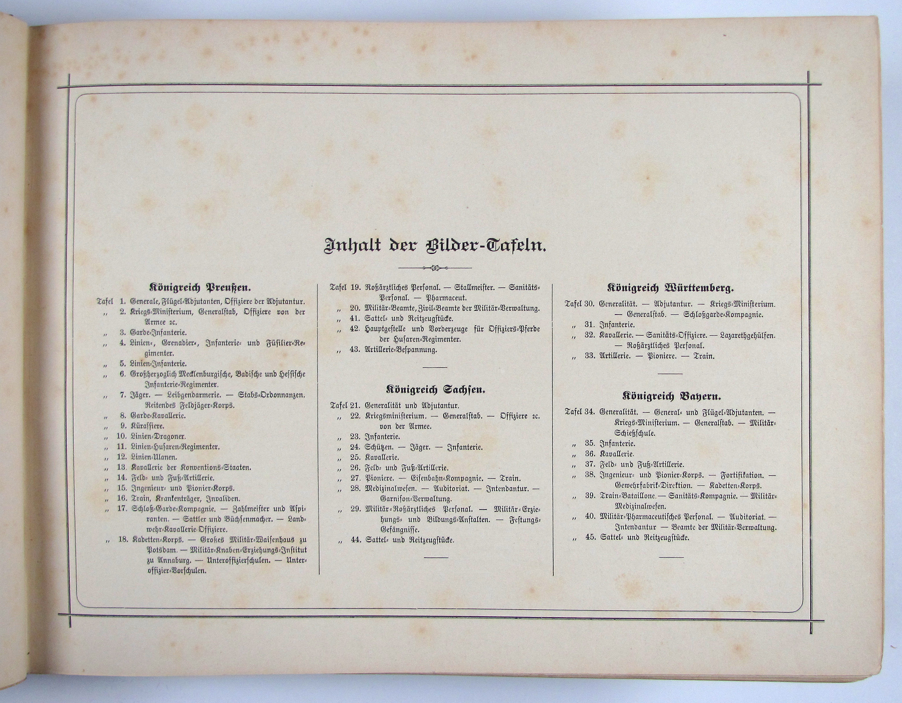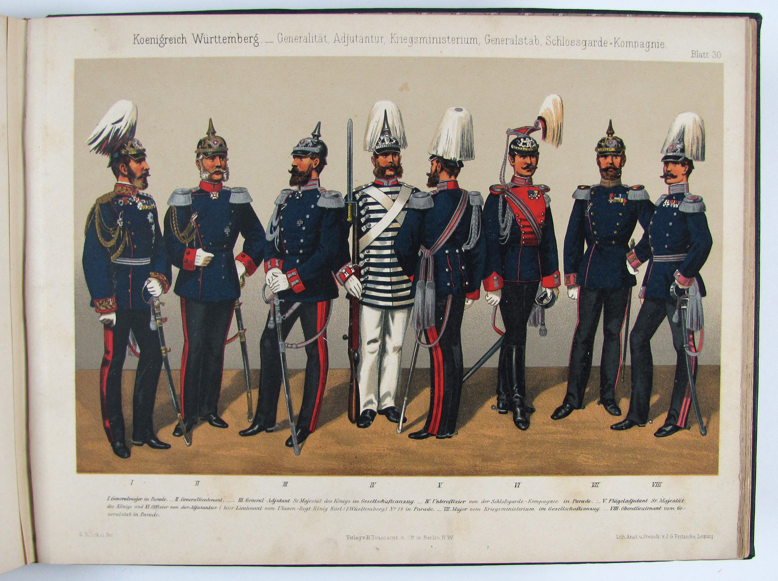 40 der Tafeln mit je 8 Uniformdarstellungen aus Preußen, Sachsen, Württemberg und Bayern, die restl. 5 Tafeln zeigen Pferde, Sättel und Zaumzeug. Dekorative und detaillierte Tafeln und umfangreicher, reich illustrierter Textteil.– Tadellos erhaltenes Exemplar aus der Sammlung C.F. Koch, Rotterdam.– Lipperheide 2138. Colas 1872.