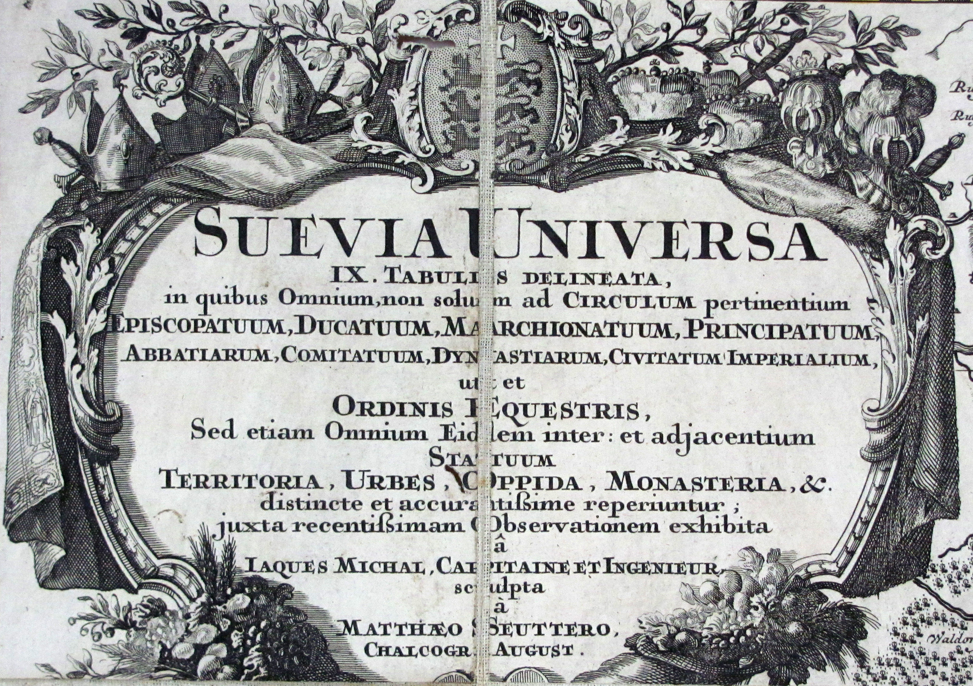 Cartographia Bavariae S. 113 und 4.13: „Als wichtigstes und bestes Werk mit dem Thema Schwäbischer Reichskreis gilt die Karte von Jaques de Michal… Stellt das Hauptwerk im schwäbischen Raum mit einer bis zum Ende des 18. Jahrhunderts ausgreifenden Wirkung dar.“ Michal war Ingenieuroffizier bei der Truppe des Schwäbischen Kreises. Die Karte umfasst den süddeutschen Raum vom Rhein bis zum Lech mit nördl. Begrenzung Crailsheim und Jagst und südl. Begrenzung Züricher See und Vaduz. Schönes, kräftiges Flächen- und Grenzkolorit, die Kartuschen unkoloriert. Die Karte erschien in 9 Teilen, das vorliegende Exemplar wurde hier sorgfältig von alter Hand in kleinen Segmenten als Falt- oder Wandkarte präpariert. Zwei Segmente mit winziger Wurmspur, ansonsten sehr gut erhalten.– Oehme 118 und Abb. 33: „Beste Kreiskarte des 18. Jahrhunderts.“
