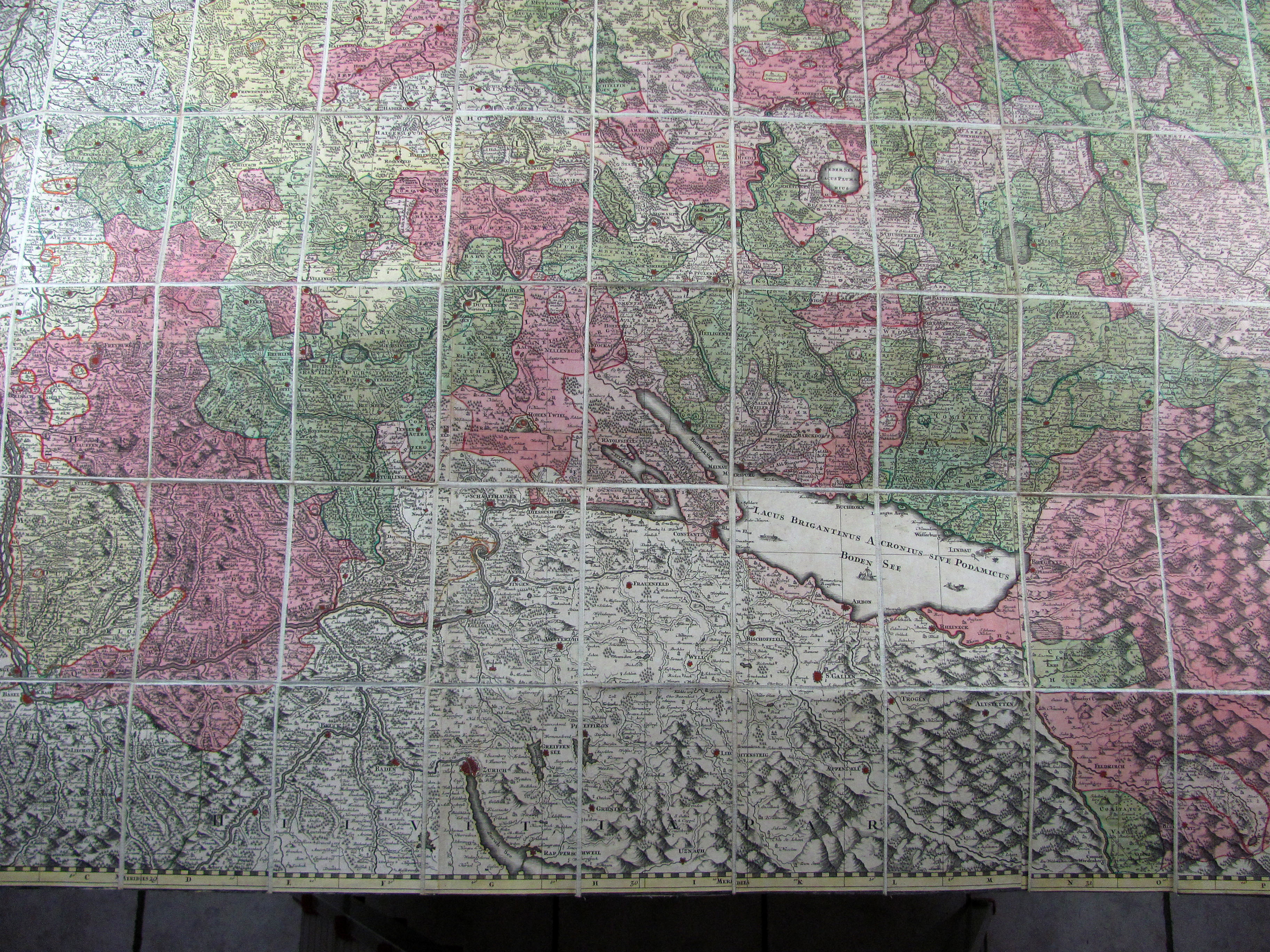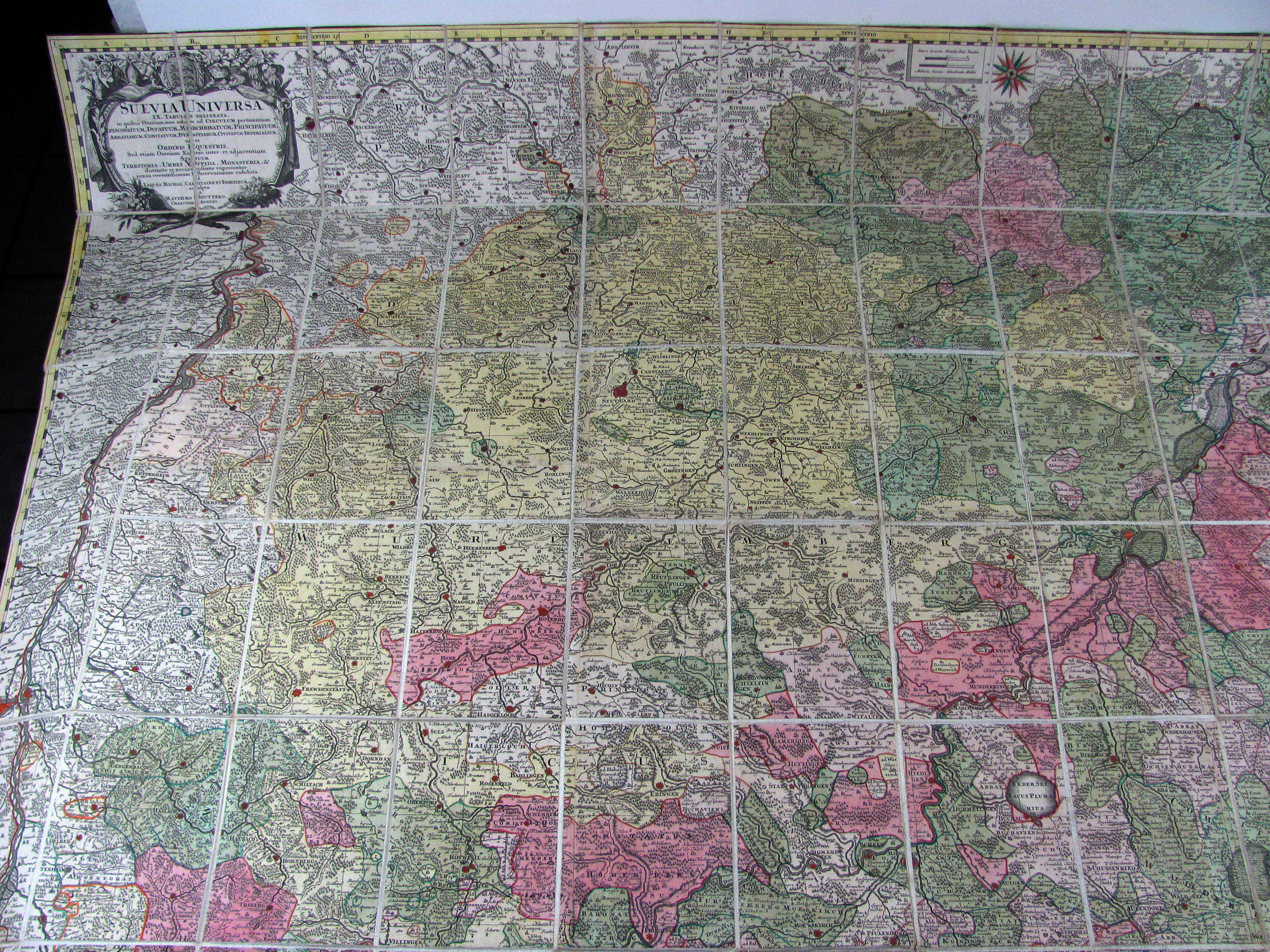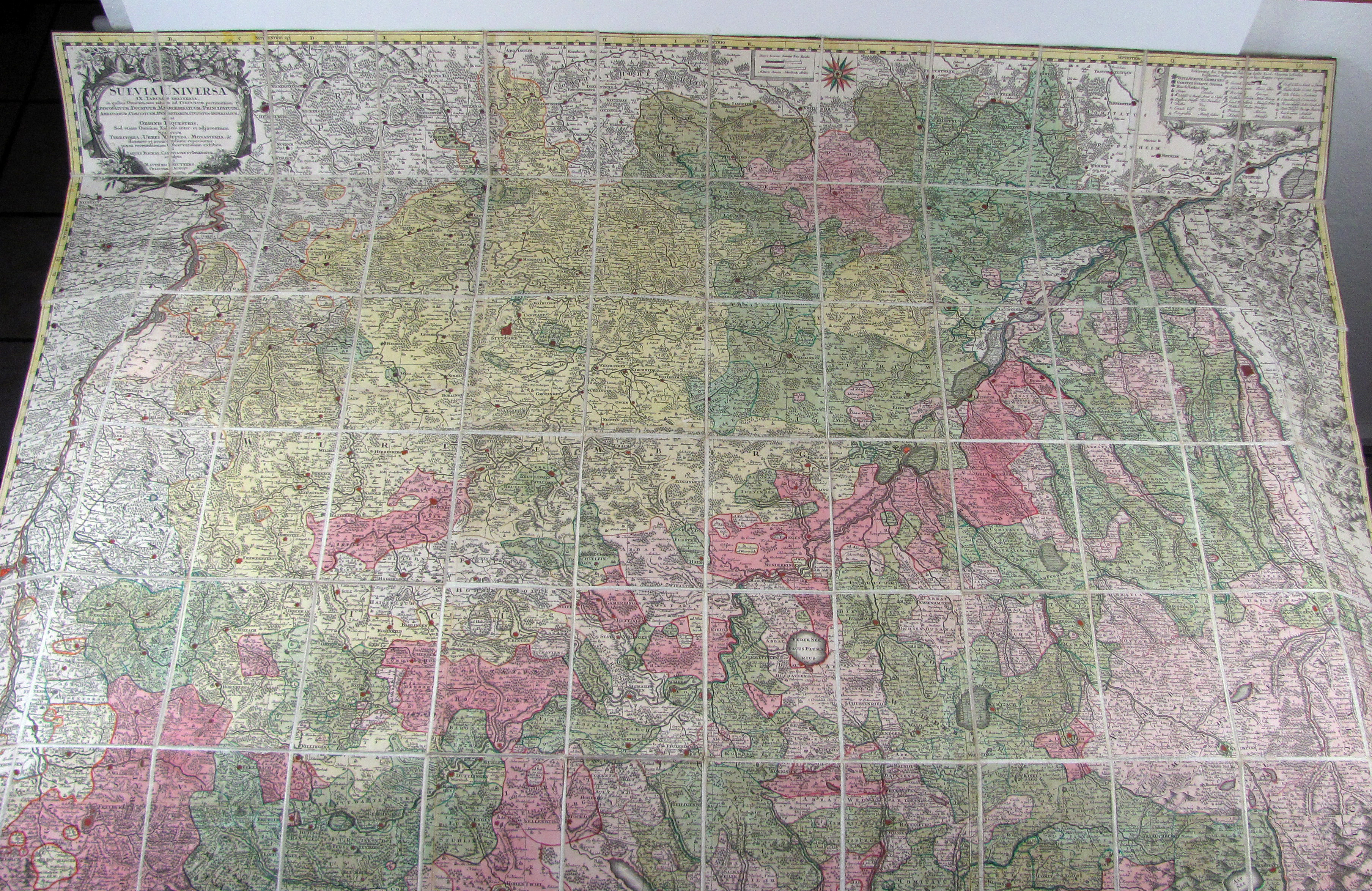 Suevia universa IX. tabulis delineata… (Gesamtschwaben). Altkolorierte Kupferstichkarte in 96 Segmenten, alt auf Leinen montiert und gefaltet, ausgelegt ergibt sich ein Format von 147 x 158 cm. Mit gestoch. Legende und 2 Kartuschen.