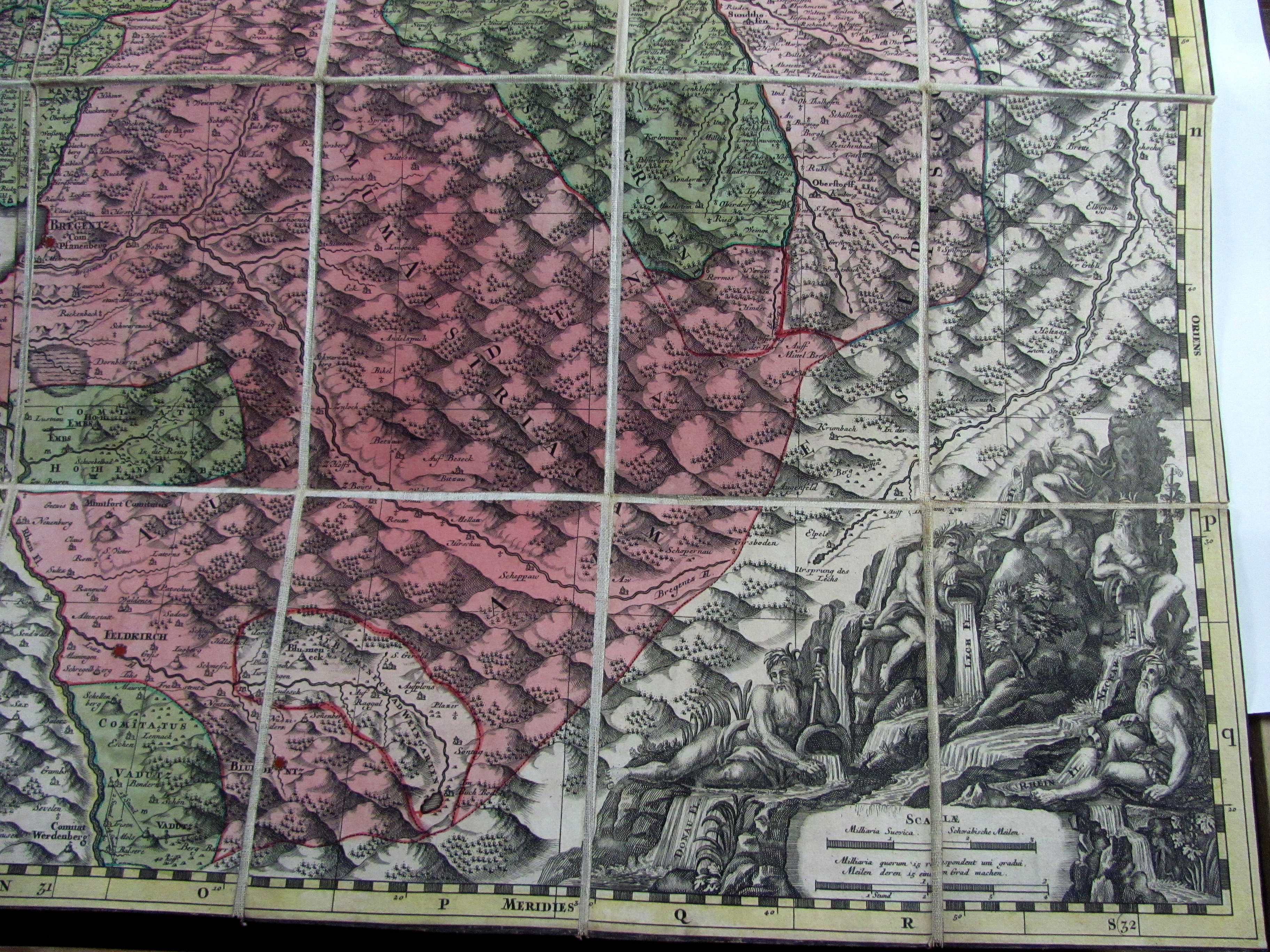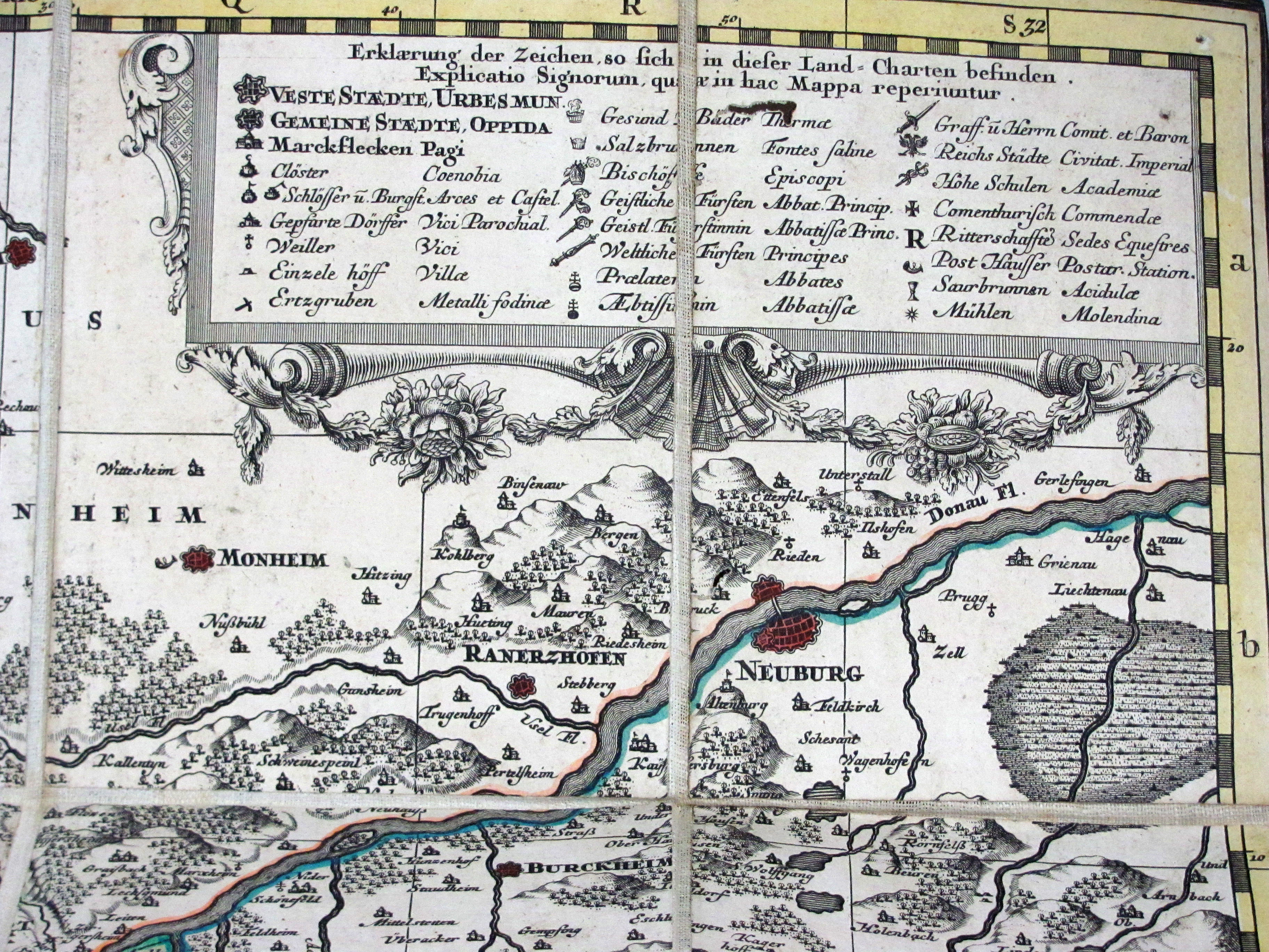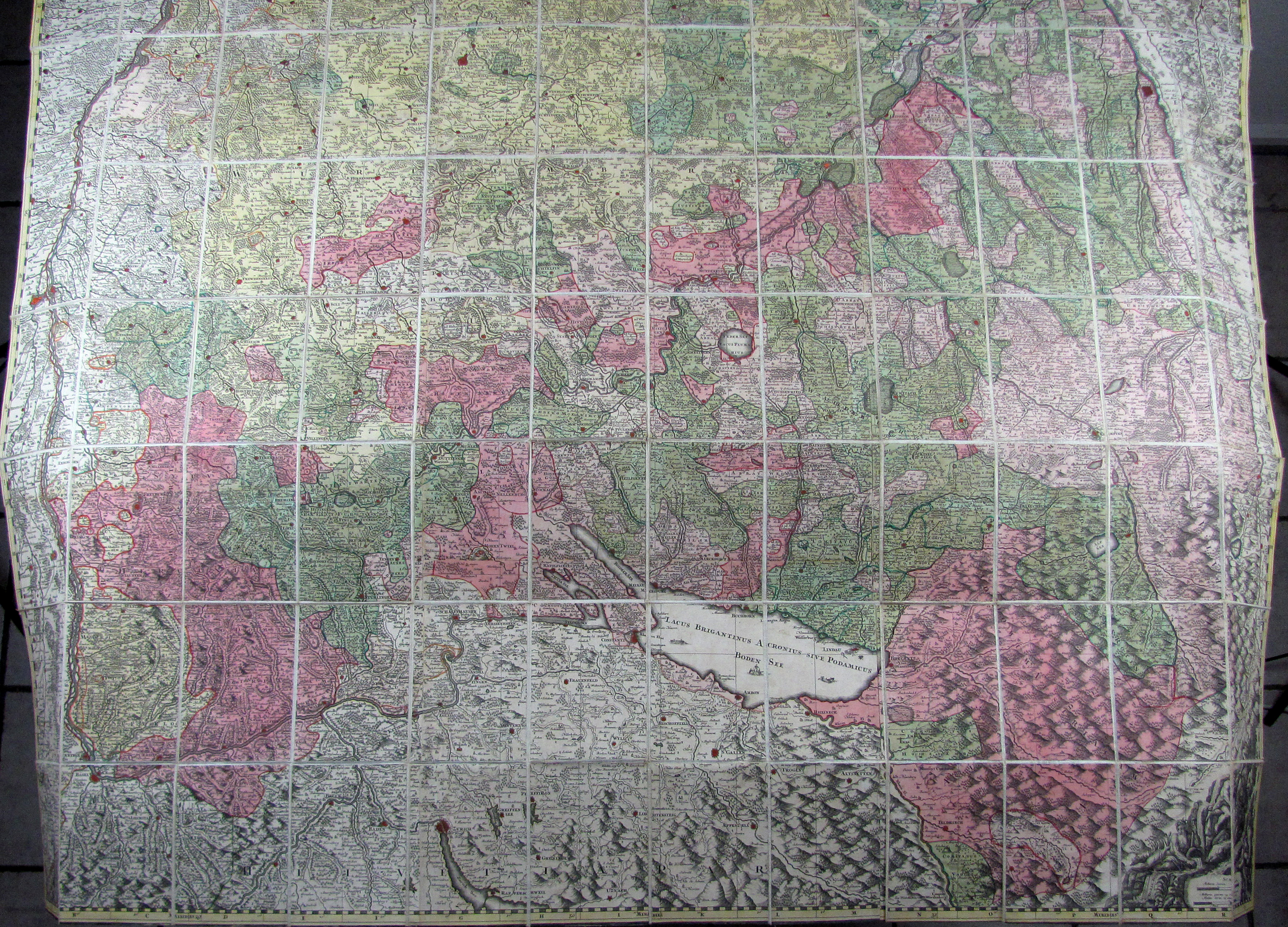 Suevia universa IX. tabulis delineata… (Gesamtschwaben). Altkolorierte Kupferstichkarte in 96 Segmenten, alt auf Leinen montiert und gefaltet, ausgelegt ergibt sich ein Format von 147 x 158 cm. Mit gestoch. Legende und 2 Kartuschen.