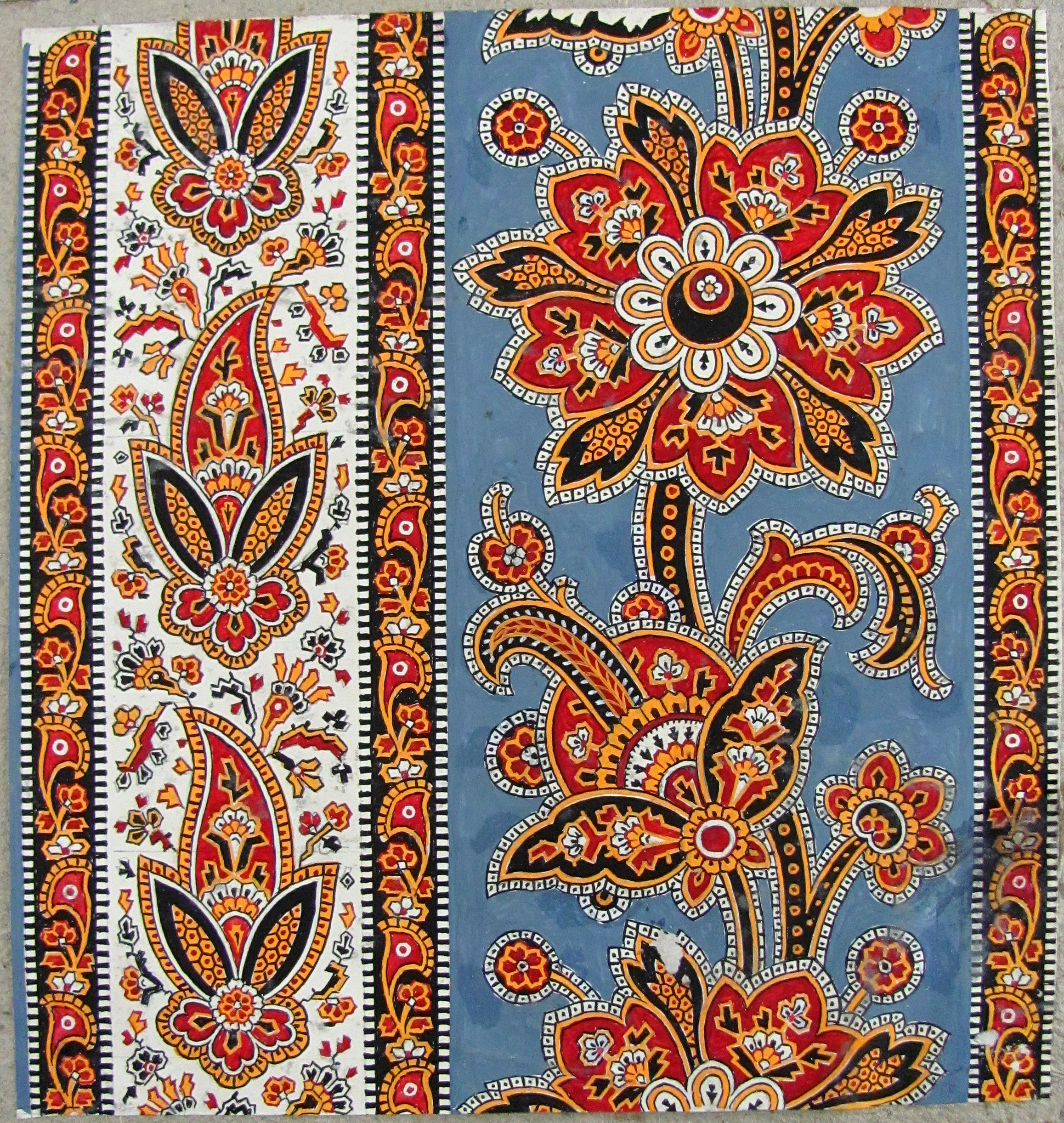 Ein großartiges, sehr umfangreiches und farbenfrohes Stoffmusterbuch mit einer unglaublichen Anzahl und Vielfalt an äußerst sorgfältig gestalteten Originalentwürfen. Flüchtig betrachtet entsteht durch die minutiös ausgeführten Entwürfe zunächst der Eindruck von gedruckten oder zumindest mit Schablonen erstellten Mustern, tatsächlich sind die Entwürfe durchgehend freihand gezeichnet. Sie zeigen eine große Bandbreite verschiedener ornamentaler, geometrischer und floraler Muster in leuchtenden Farben und wurden für Stoffe aller denkbaren Verwendungszwecke erstellt.– Das Elsaß war in der ersten Hälfte des 19. Jahrhunderts ein Zentrum der Textilindustrie, einige Blätter in etwas kleinerem Format tragen die handschriftliche Bezeichnung einer für mich nicht weiter zu eruierenden Firma „Jodon & Cie. bzw Richemond et J(odon)“ und sind mit 1842 bzw. 1844 datiert. Drei Blätter (5, 12 und 80) mit je einem kleinem Muster eines gewebten Stoffes. – Das Album mit den üblichen Gebrauchsspuren, dem Band sind immer wieder Musterentnommen worden, teils durch Ablösung, tls. durch Ausschnitte der Trägerblätter, vereinzelt kleine Wasserränder im Trägerpapier, nur einige weniger Muster mit Feuchtigkeitsspuren.