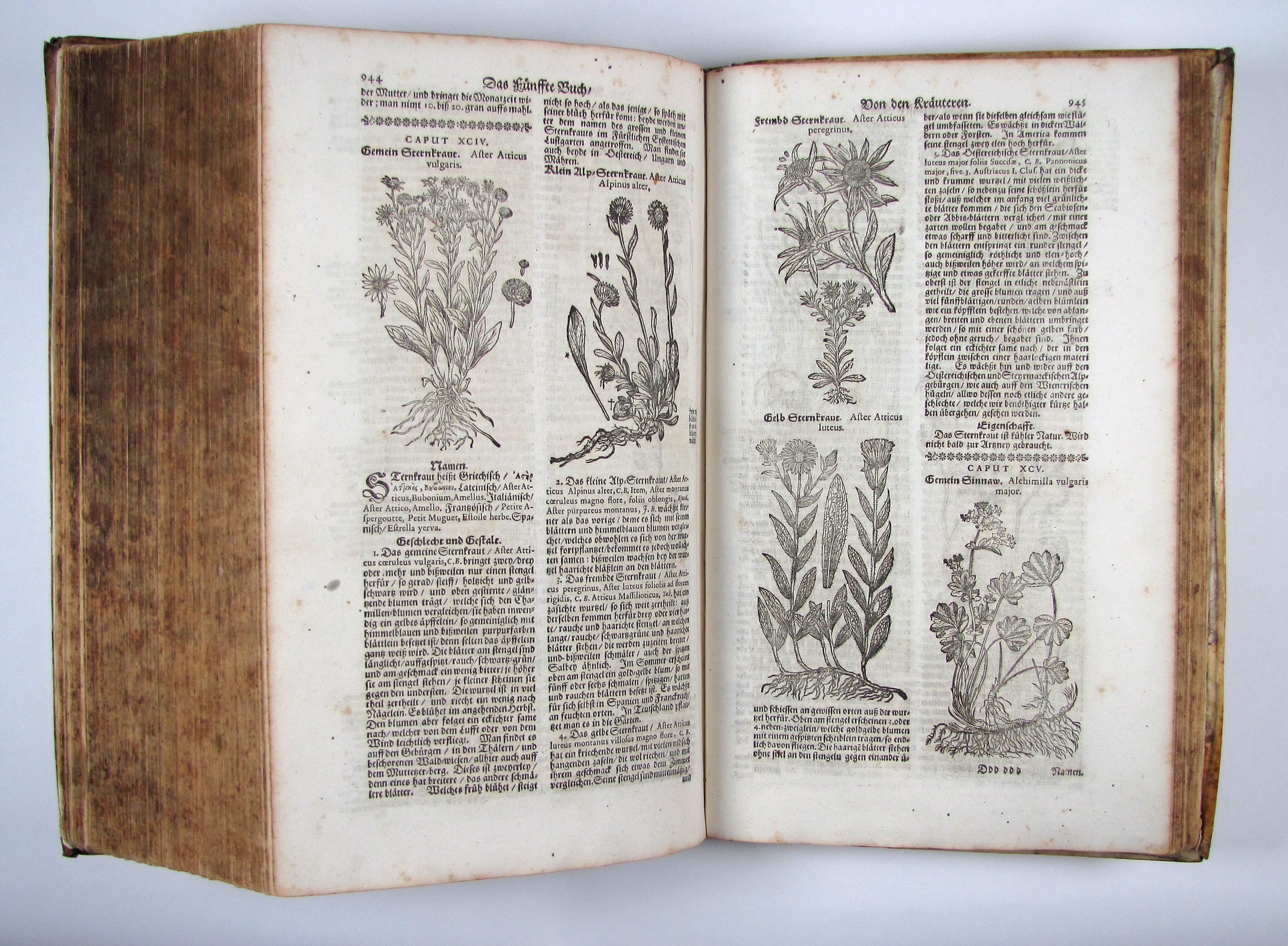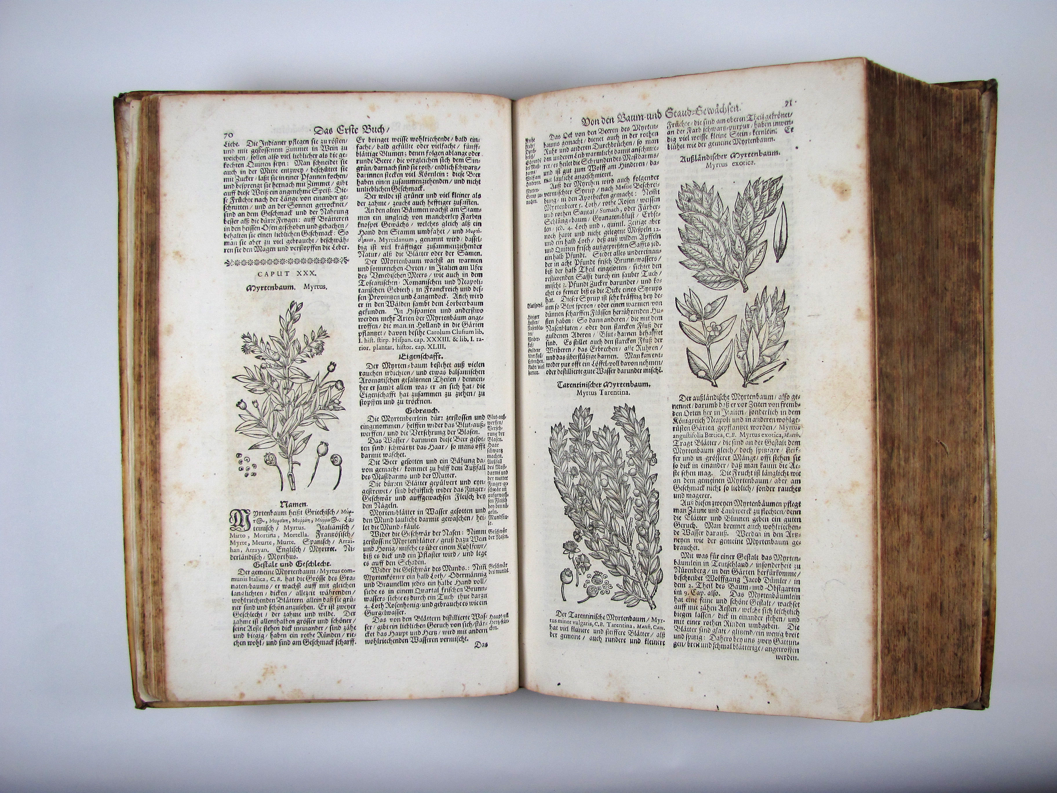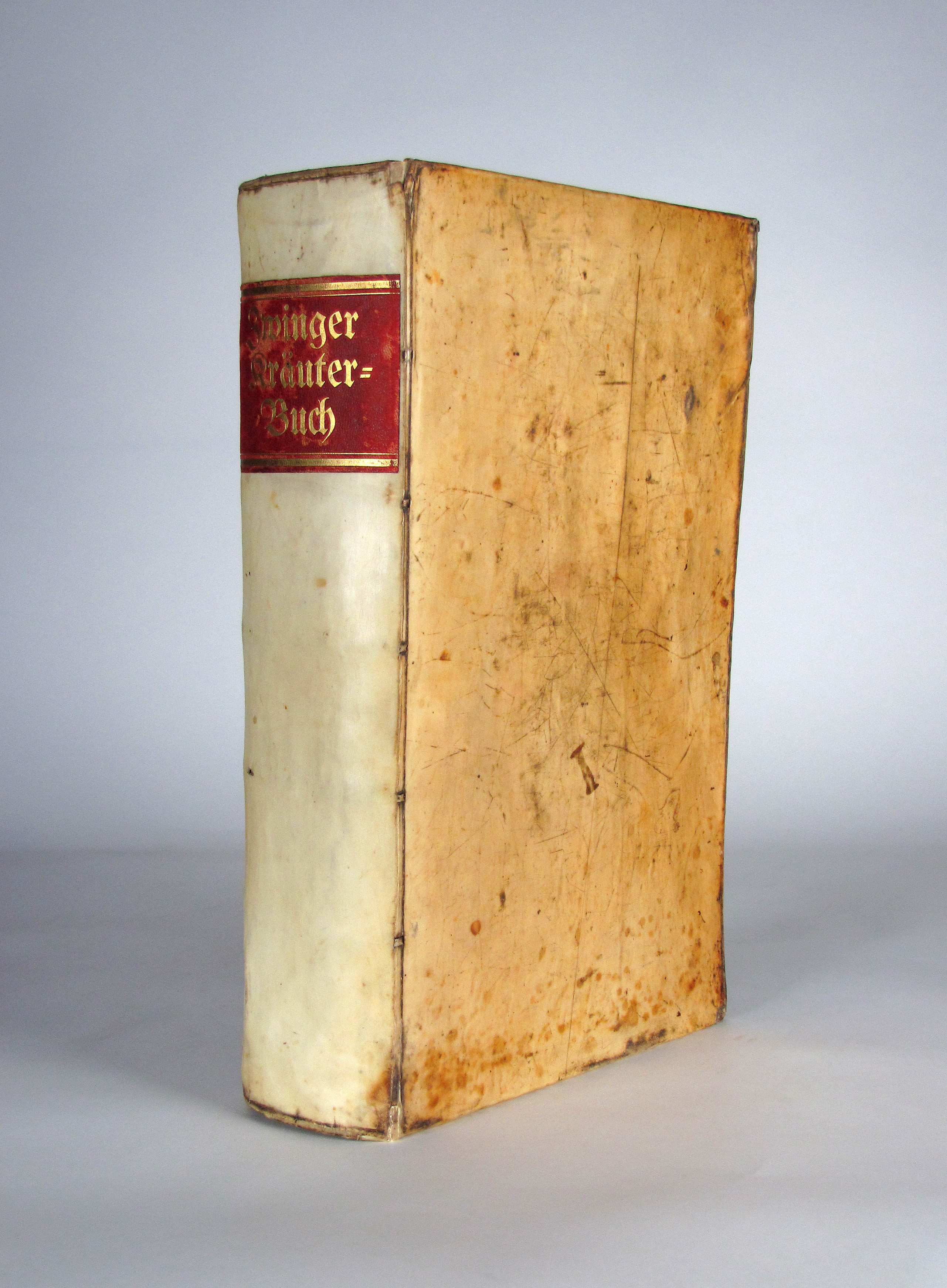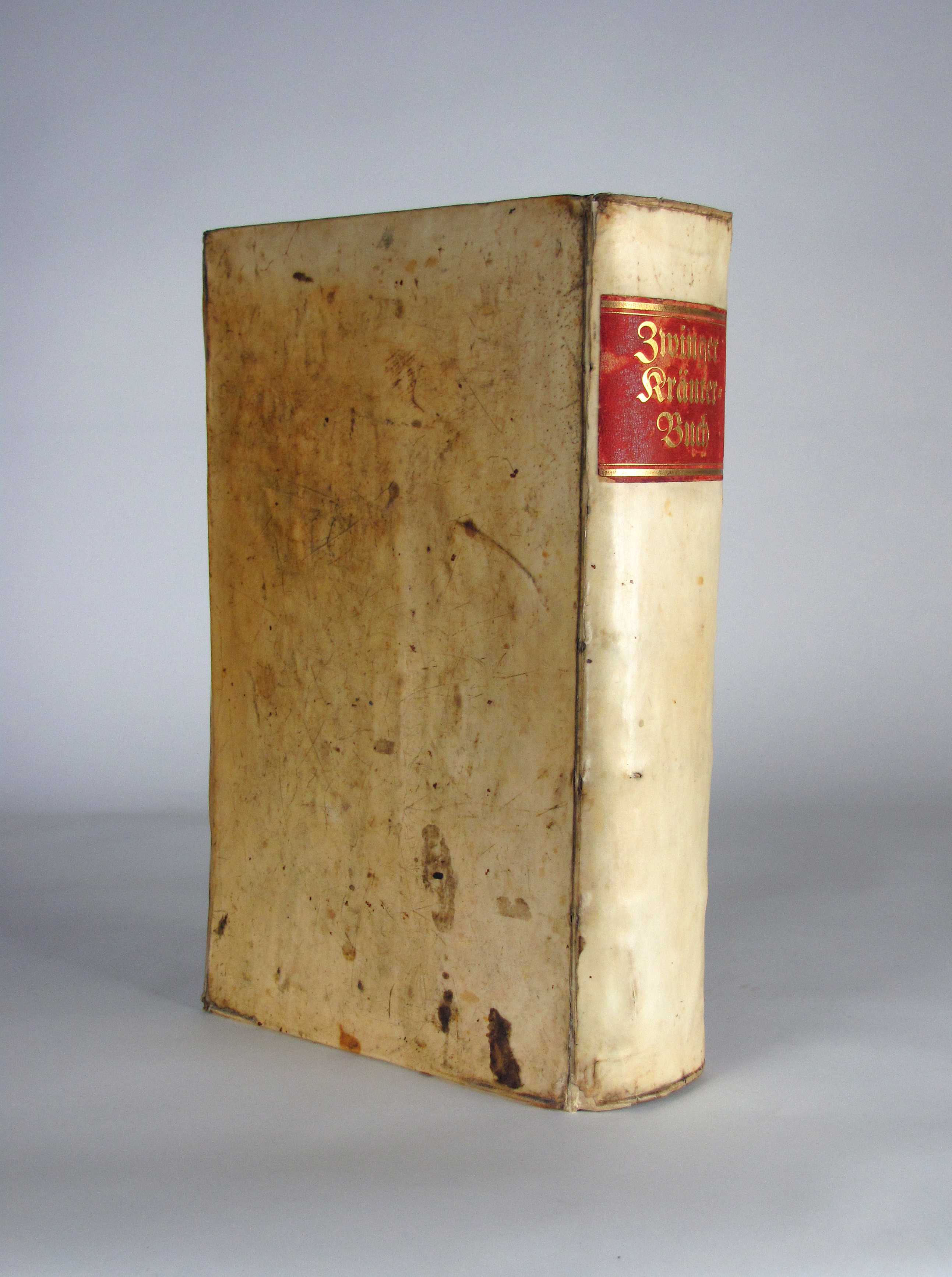 Erste Ausgabe des Kräuterbuches von Theodor Zwinger, deutlich seltener als die von seinem Sohn herausgegebene zweite Auflage von 1744. Zwinger (1658-1724) war Professor der Anatomie, Botanik, Medizin und Physik in Basel. Seinem Werk liegt die von B. Verzascha verfasste Bearbeitung des Kräuterbuches von Matthiolus zugrunde, welche 1678 erschien und die Zwinger laut Titel nochmals um mehr als die Hälfte erweitert hat. Enthalten sind ca. 1200 Pflanzenholzschnitte mit ausführlicher Beschreibung der Anwendung und Wirkungsweise der Kräuter, ferner auch kulturgeschichtlich Interessantes wie Abschnitte über Kaffee, Tee, Chocolade, Tabak etc. Zur Darstellung der Pflanzen wurden die Gesner-Camerarius Holzschnitte verwendet, die hier immer noch meist in guten Abzügen vorliegen. Erwähnenswert ist das Polyglott-Register der Pflanzen in 9 Sprachen sowie Index der Krankheiten und weiterer Arzneien in Deutsch.– Das häufig fehlende Porträt wurde hier zusammen mit dem Schmutztitel später ergänzt, wobei beide nicht aus der ursprünglichen Ausgabe stammen. Ansonsten komplettes und gutes Exemplar mit vergleichsweise geringen Altersspuren.– Heilmann 253. Ferchl S. 599. Nissen BBI 1311 (unter Matthiolus).