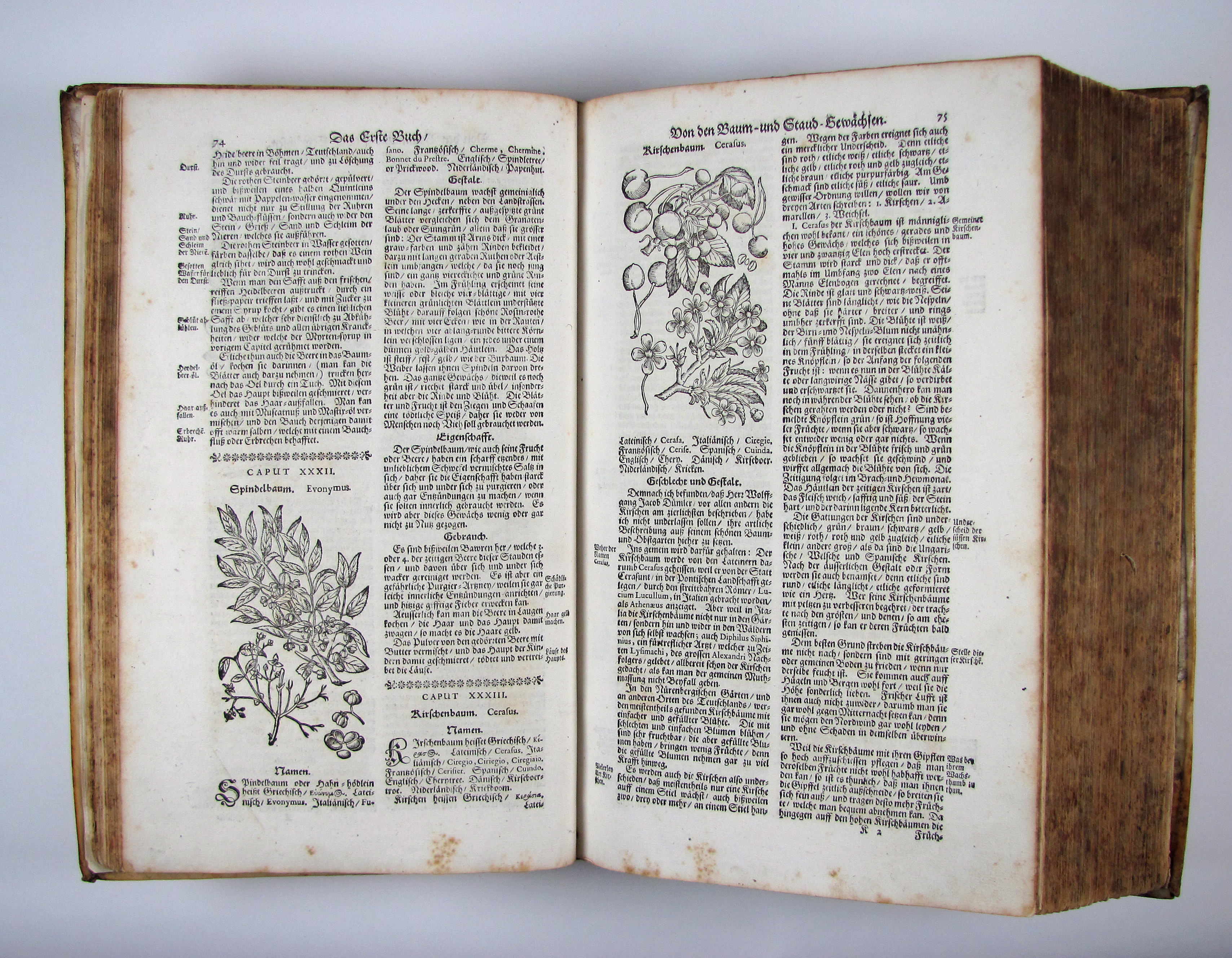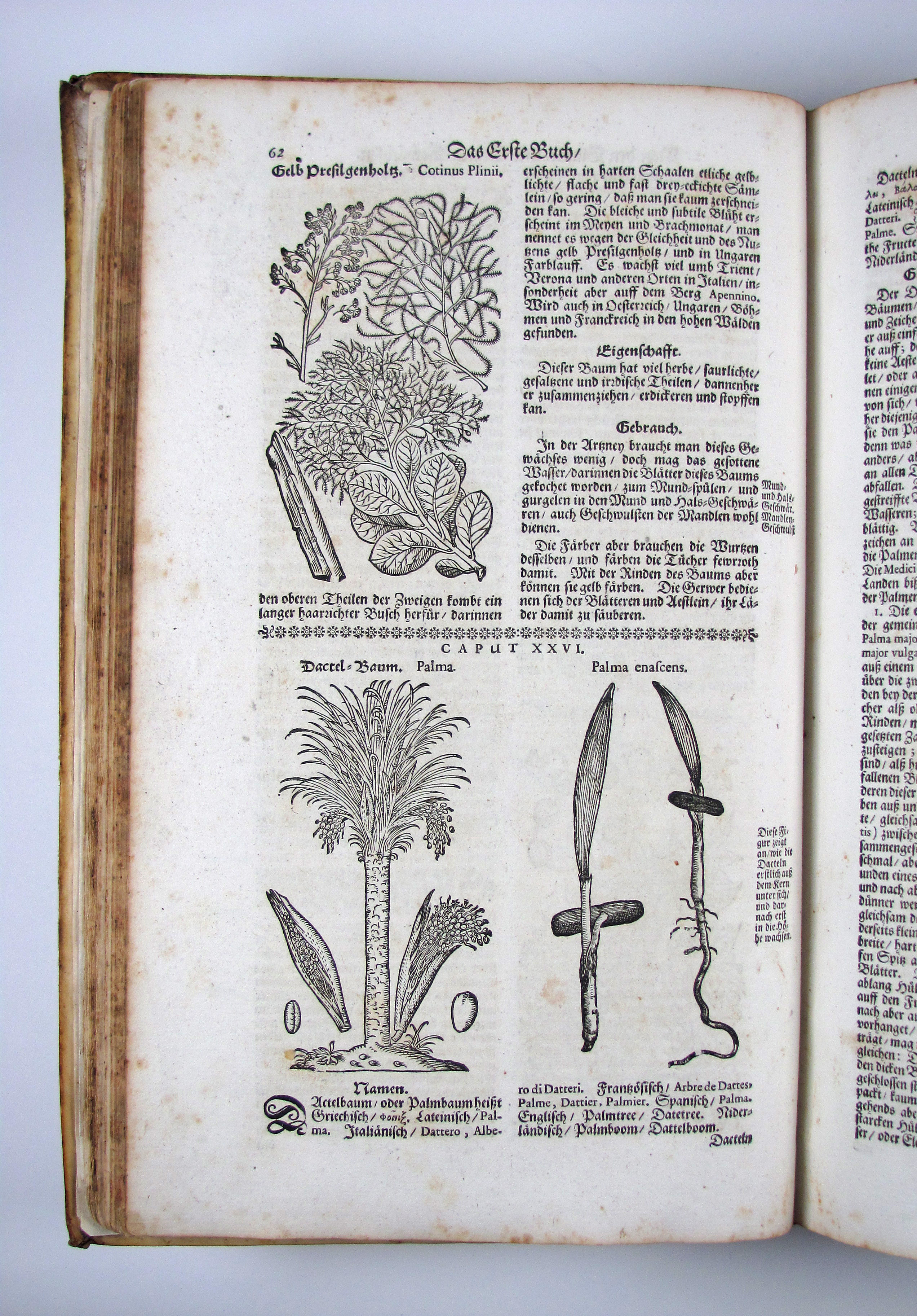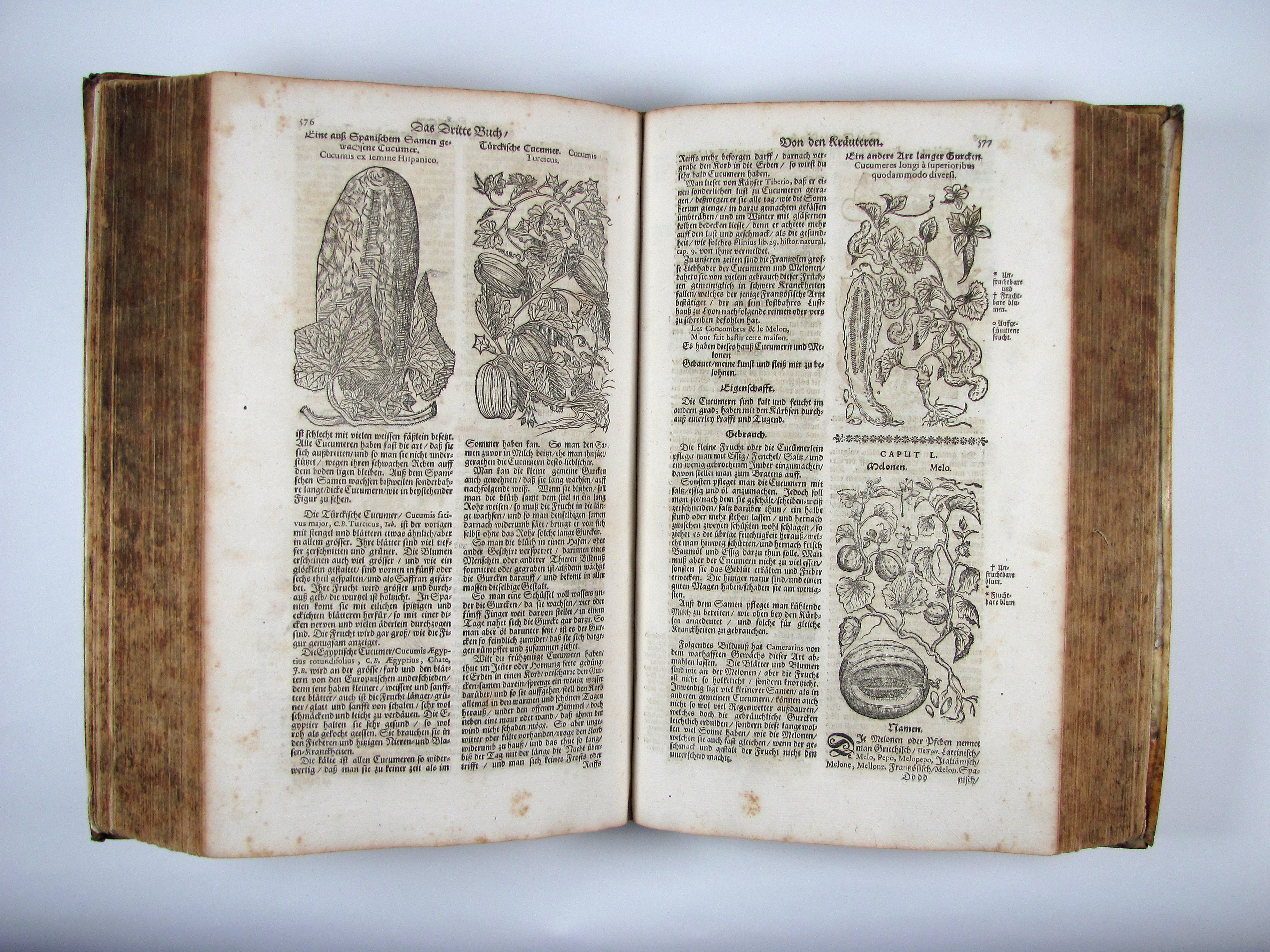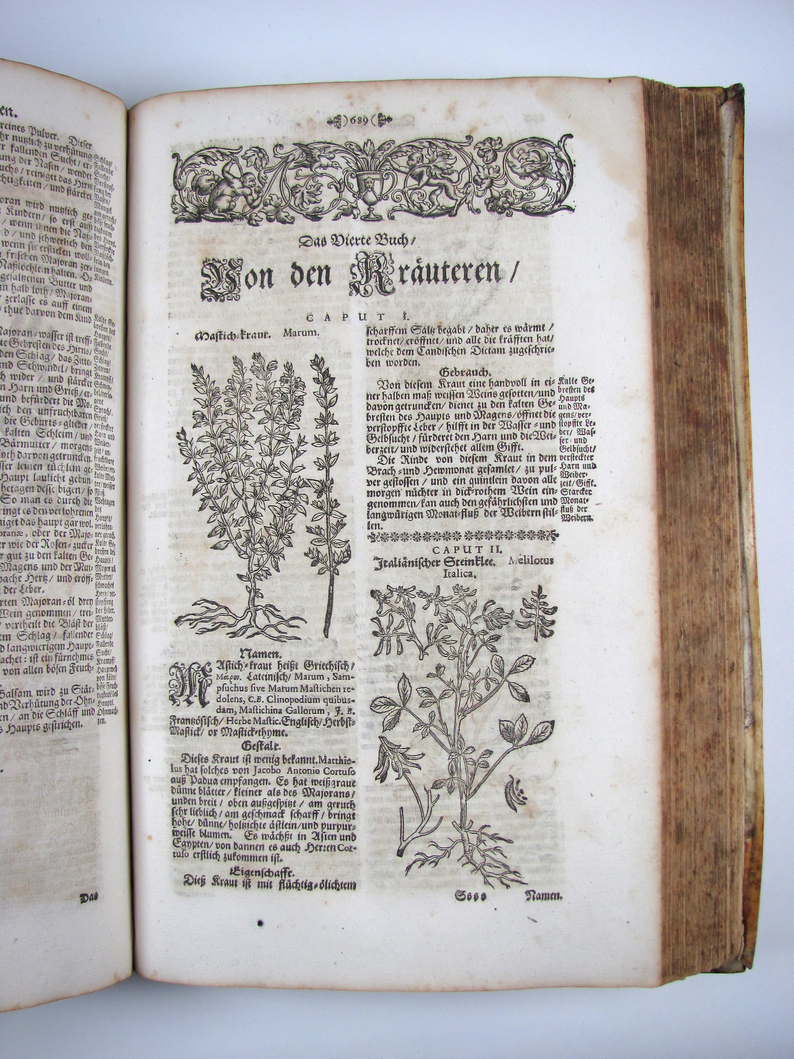 Erste Ausgabe des Kräuterbuches von Theodor Zwinger, deutlich seltener als die von seinem Sohn herausgegebene zweite Auflage von 1744. Zwinger (1658-1724) war Professor der Anatomie, Botanik, Medizin und Physik in Basel. Seinem Werk liegt die von B. Verzascha verfasste Bearbeitung des Kräuterbuches von Matthiolus zugrunde, welche 1678 erschien und die Zwinger laut Titel nochmals um mehr als die Hälfte erweitert hat. Enthalten sind ca. 1200 Pflanzenholzschnitte mit ausführlicher Beschreibung der Anwendung und Wirkungsweise der Kräuter, ferner auch kulturgeschichtlich Interessantes wie Abschnitte über Kaffee, Tee, Chocolade, Tabak etc. Zur Darstellung der Pflanzen wurden die Gesner-Camerarius Holzschnitte verwendet, die hier immer noch meist in guten Abzügen vorliegen. Erwähnenswert ist das Polyglott-Register der Pflanzen in 9 Sprachen sowie Index der Krankheiten und weiterer Arzneien in Deutsch.– Das häufig fehlende Porträt wurde hier zusammen mit dem Schmutztitel später ergänzt, wobei beide nicht aus der ursprünglichen Ausgabe stammen. Ansonsten komplettes und gutes Exemplar mit vergleichsweise geringen Altersspuren.– Heilmann 253. Ferchl S. 599. Nissen BBI 1311 (unter Matthiolus).