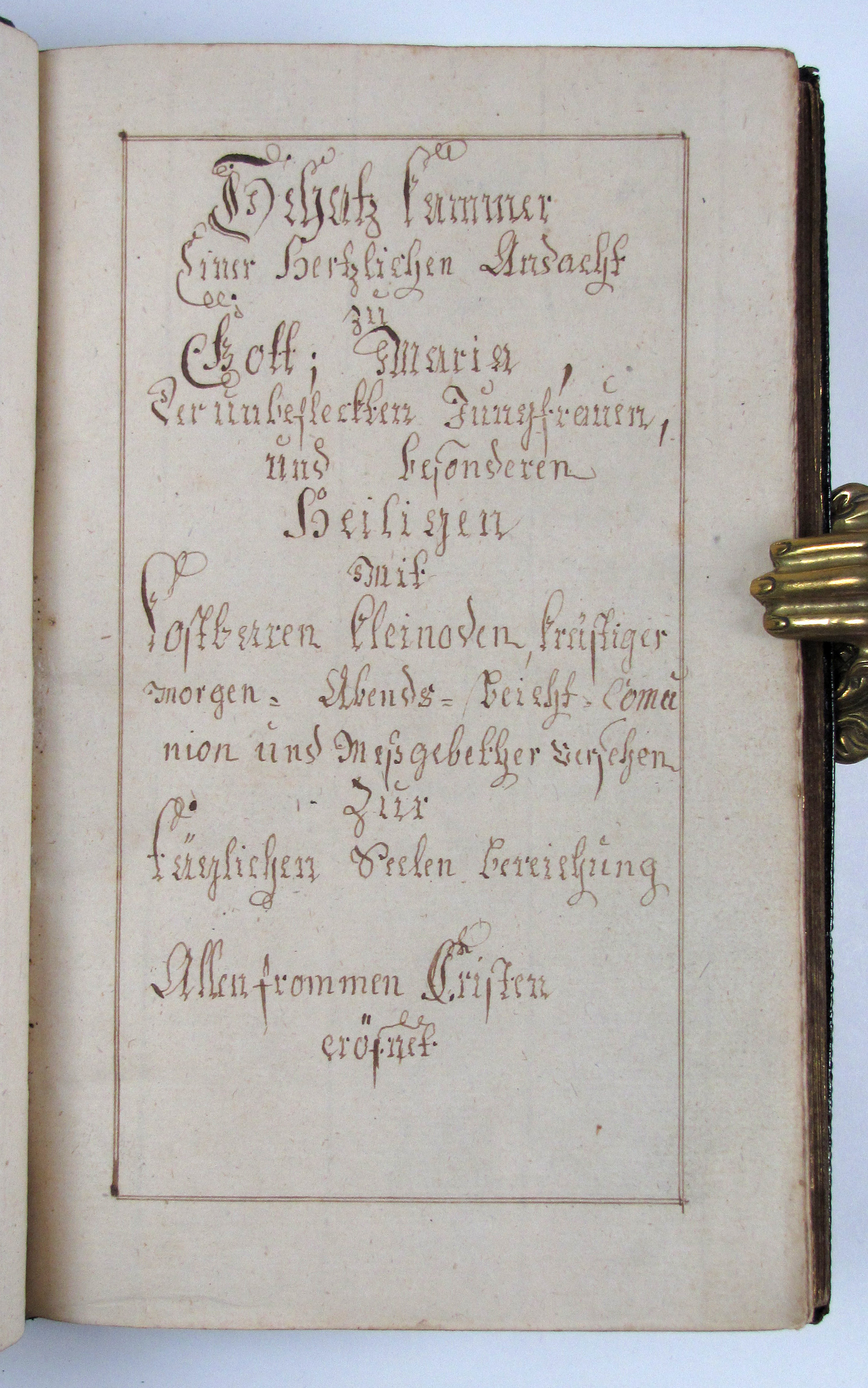 Schatzkammer einer hertzlichen Andacht zu Gott, Maria, der unbefleckten Jungfrauen, und besonderen Heiligen… zur täglichen Seelen Bereichung allen frommen Christen eröfnet. Deutsche Handschrift auf Papier.