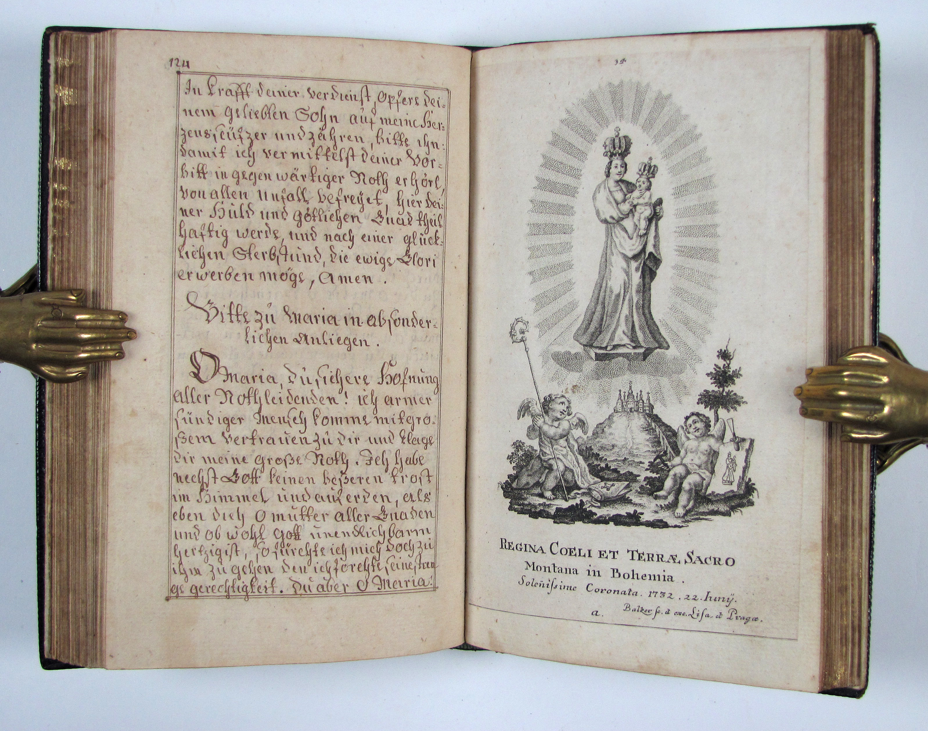 Hübsche Gebetbuchhandschrift, mit brauner Tinte in einer gut lesbaren Schrift (Ronde) ausgeführt. Regliert und mit einem Register der Gebete am Ende.– Die Kupfer von Balzer und Klauber aufgezogen, Papier gleichmässig ganz leicht gebräunt.