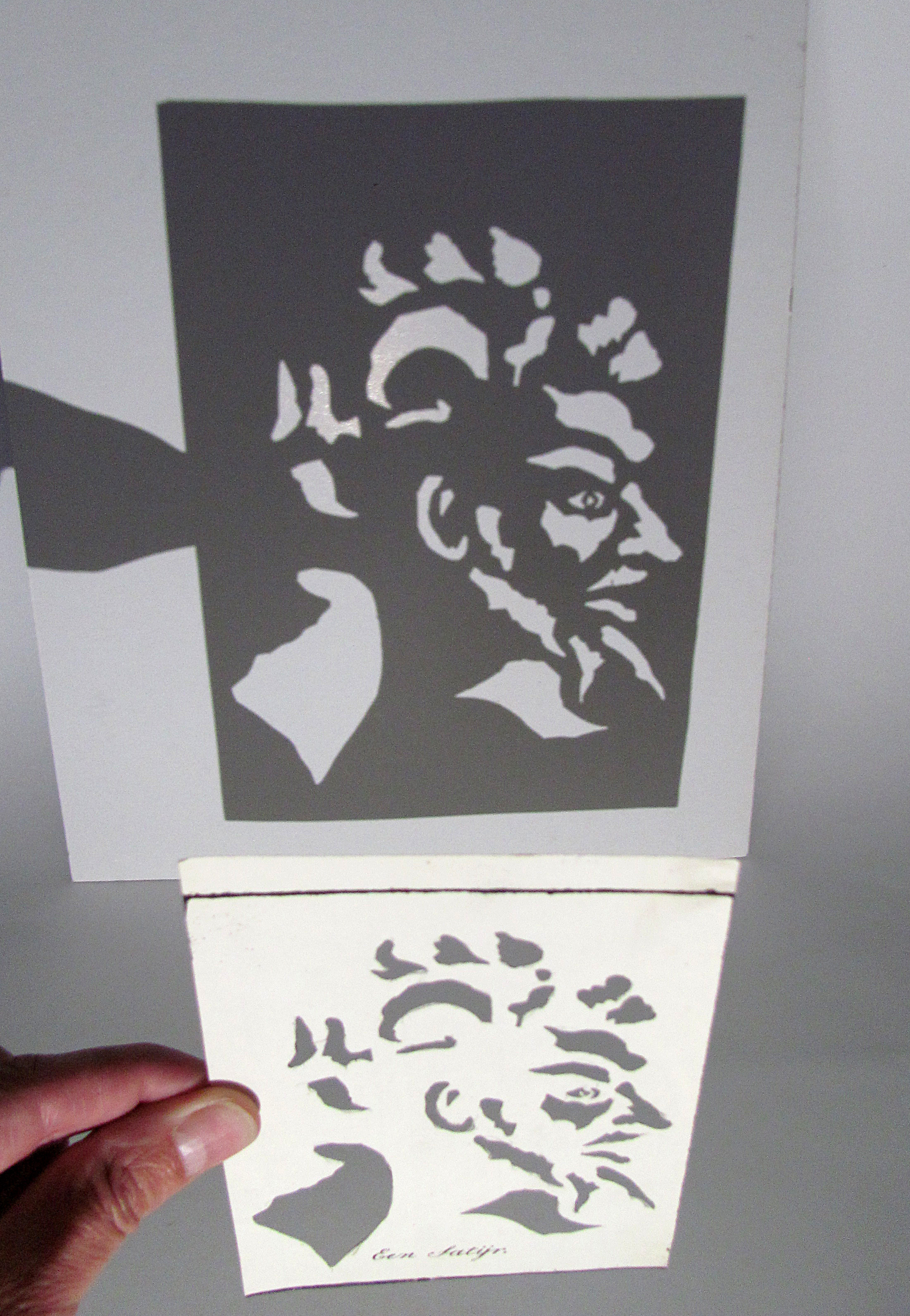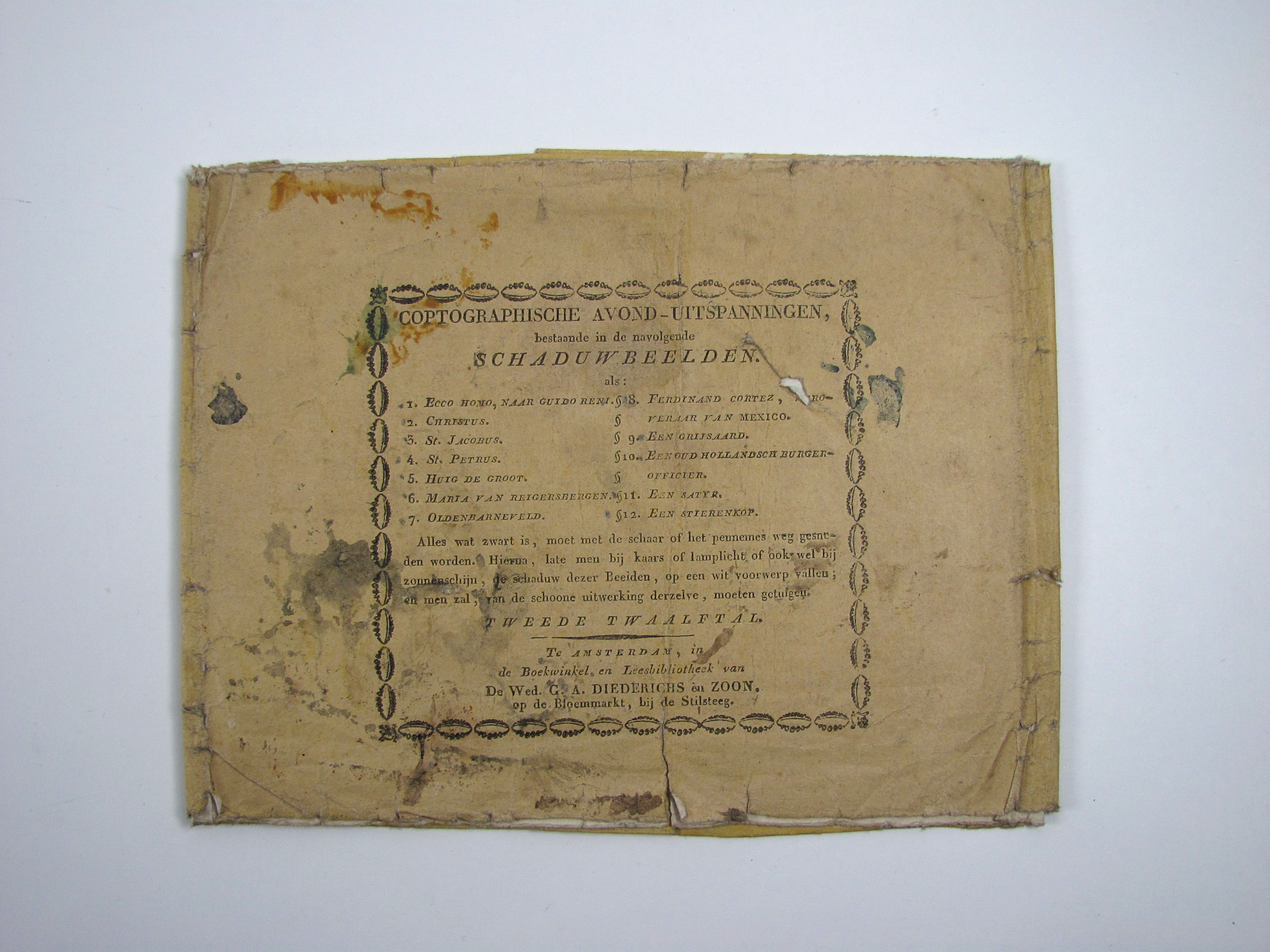Reizvolles Papierspielzeug. Ab dem ersten Drittel des 19. Jahrhunderts wurden vornehmlich in Holland, später auch in Frankreich und Deutschland Coptographien hergestellt, auch Megalografien, Dicoupures oder White Shadows bzw. Ombres Blanches gennant. Kerzenlicht fällt durch negativ ausgeschnittene Papiersegmente und formt im Durchlicht, in vergrößerter Projektion, ein Positivbild. Verblüffend ist dabei oft die Differenz zwischen dem Anschein der Schablone und dem Abbild des Lichts. Durch die Fragilität der Objekte sind nur wenige erhalten geblieben und sehr selten zu finden. Die frühen Serien von Diederichs gehören zu den ersten Erzeignissen dieser Gattung.– Komplettes und gut erhaltenes Exemplar mit dem Original-Umschlag, dieser mit Gebrauchsspuren.– Vgl. W. Nekes, Ich sehe was, was Du nicht siehst, S. 12 und 28.