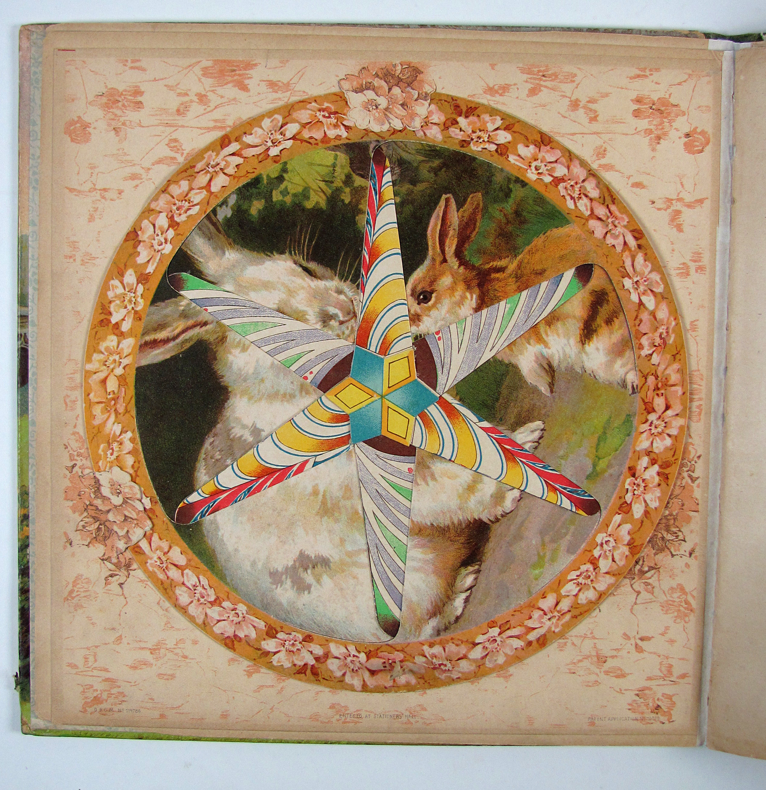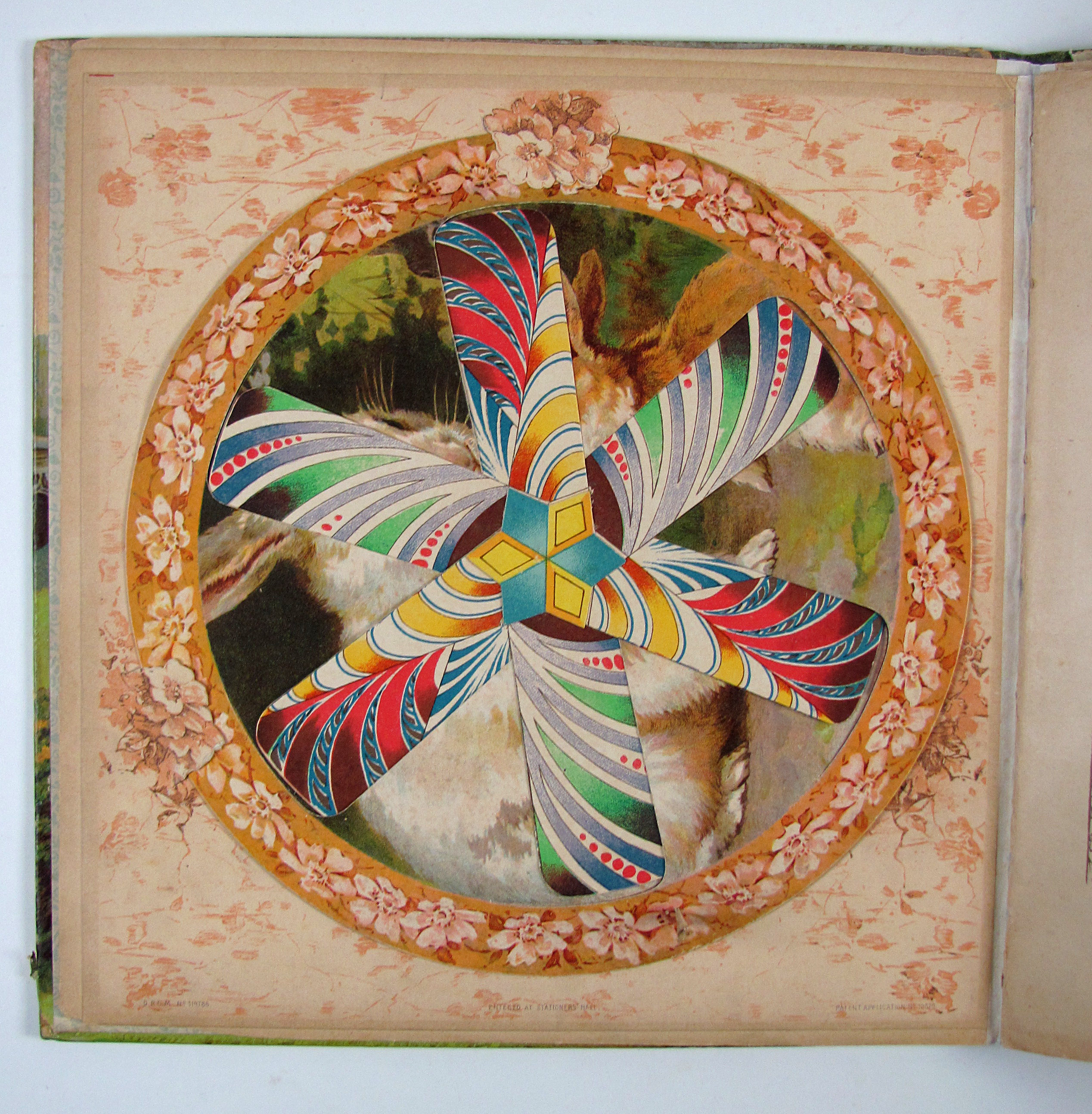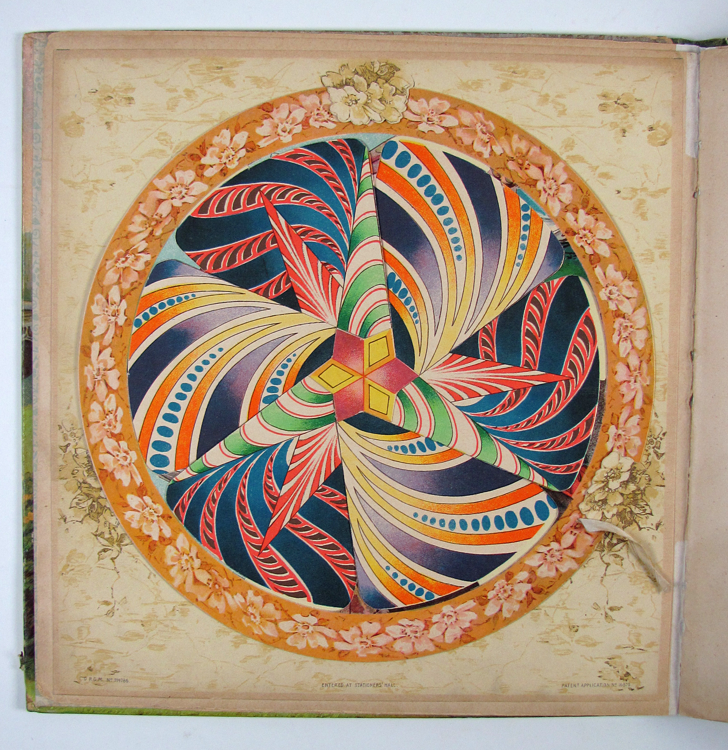 Erste Ausgabe. Die runden Verwandlungstafeln verbergen unter ihrer sichtbaren Oberfläche ein zweites Motiv, das durch drehen der Scheibe sichtbar wird und sich langsam über die erste Abbildung schiebt. Der Effekt ähnelt den Jalousienbildern, ist aber in seiner Wirkung noch reizvoller. Die vorliegenden Verwandlungstafeln bestechen vor allem dadurch, dass sie jeweils ein kaleidoskopartiges, farbkräftiges, abstraktes Motiv mit einer figürlichen Abbildung verbninden, die sich auf den Text bezieht. Das abstrakte Muster ist bei jeder Tafel dasselbe, die Fareban aber immer verschieden gestaltet.– Papierbedingt gebräunt, Vorsätze und Bindung restauriert, die empfindlichen Drehtafeln hervorragend erhalten.