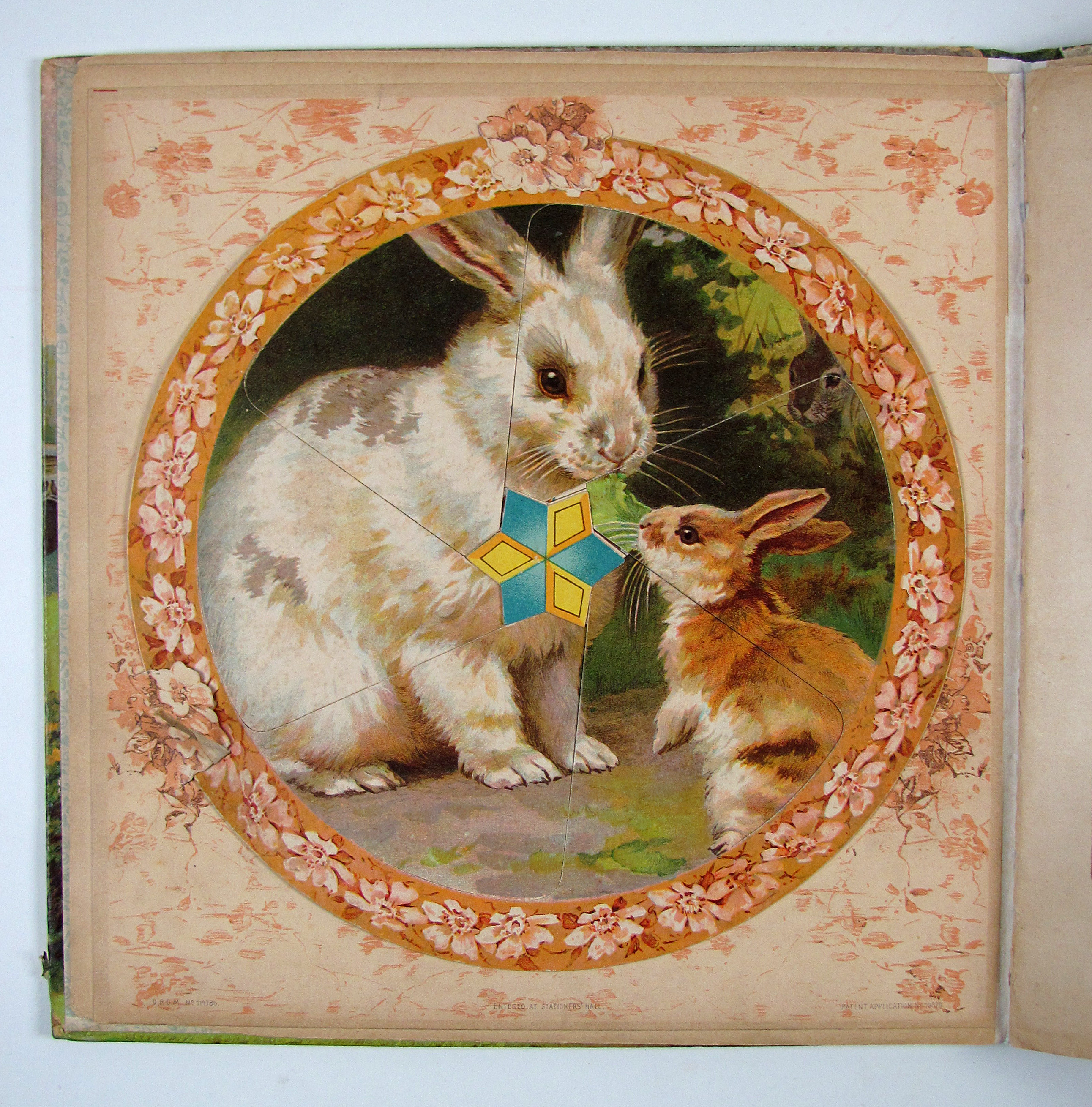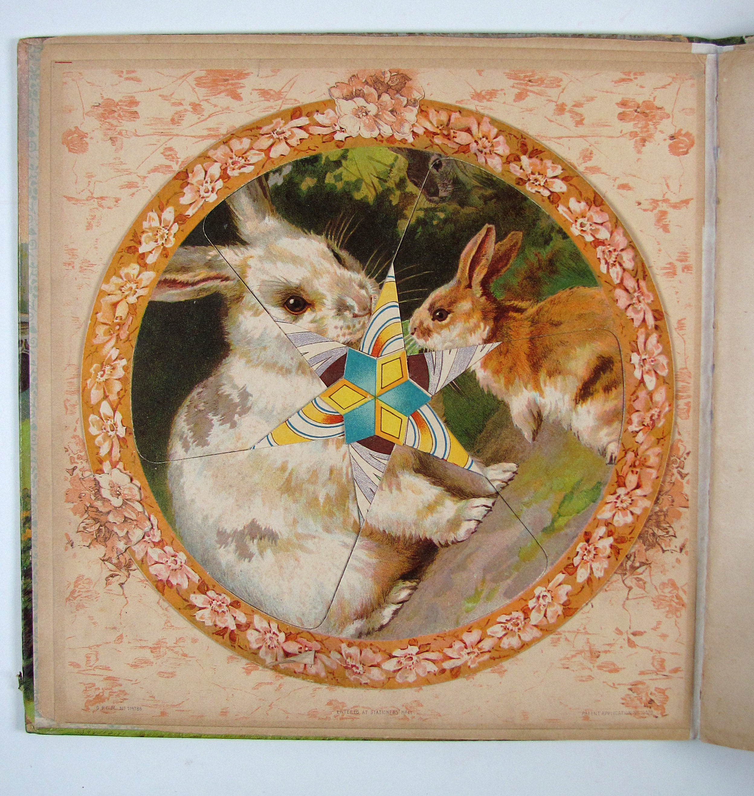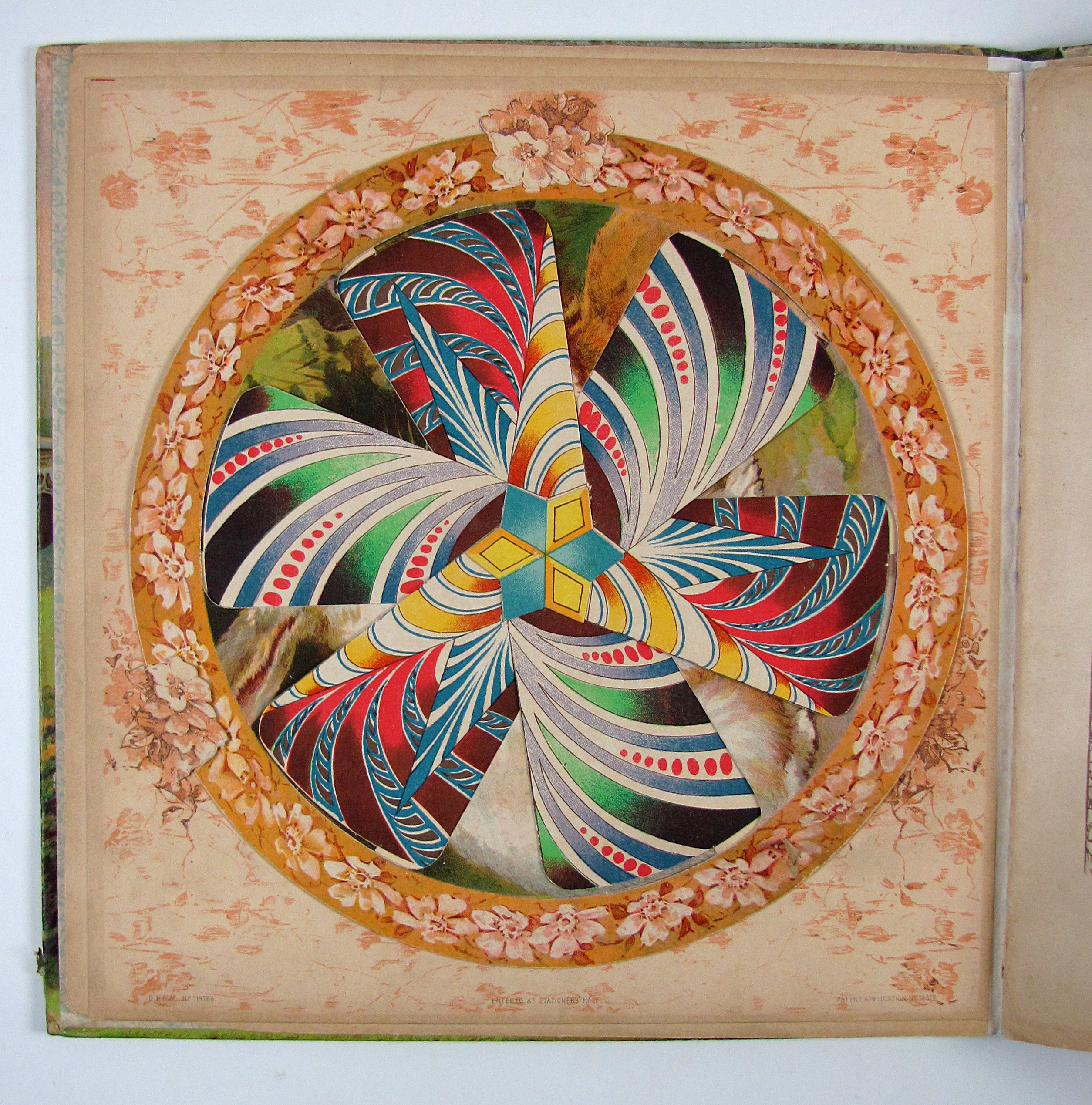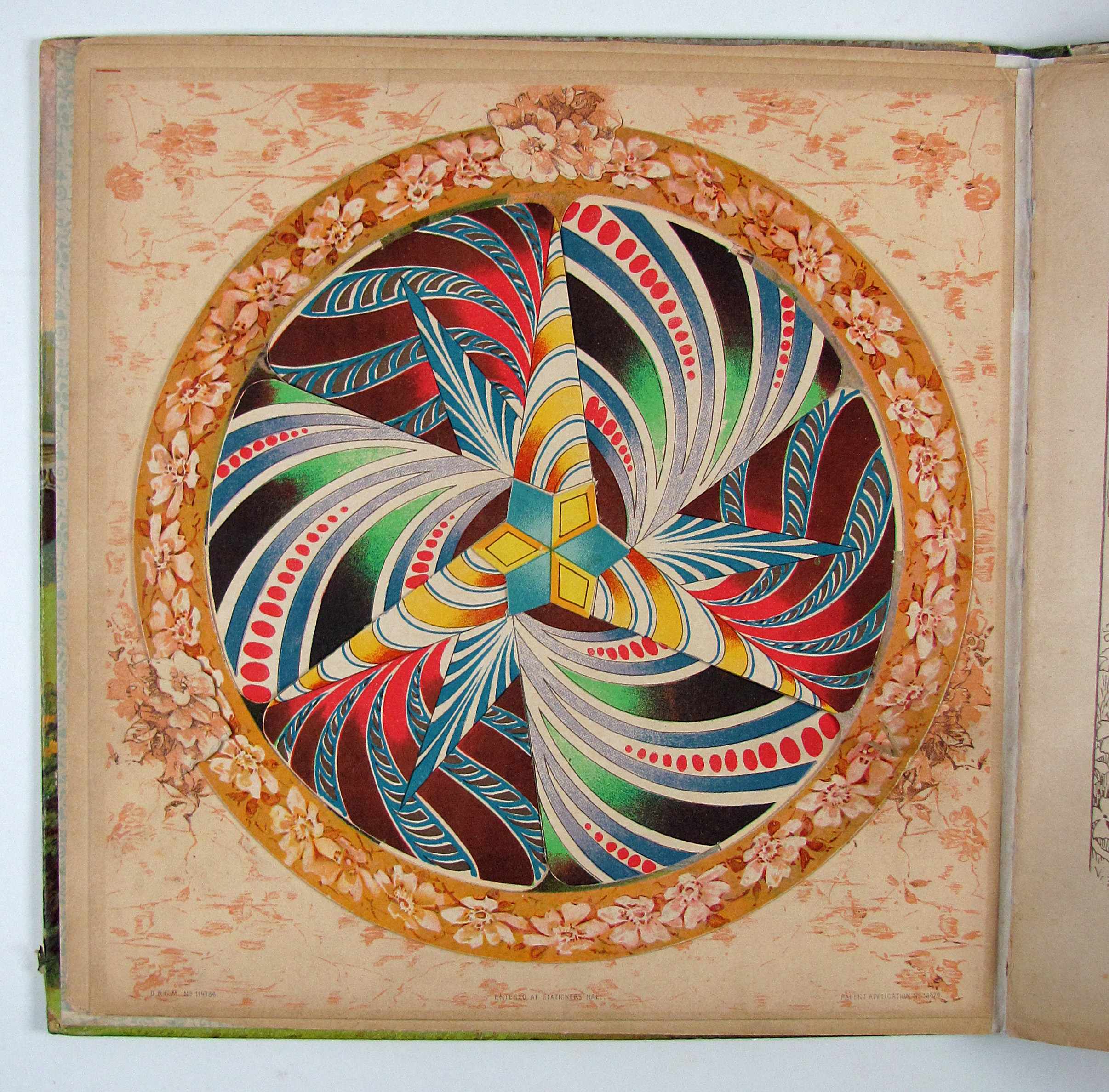Erste Ausgabe. Die runden Verwandlungstafeln verbergen unter ihrer sichtbaren Oberfläche ein zweites Motiv, das durch drehen der Scheibe sichtbar wird und sich langsam über die erste Abbildung schiebt. Der Effekt ähnelt den Jalousienbildern, ist aber in seiner Wirkung noch reizvoller. Die vorliegenden Verwandlungstafeln bestechen vor allem dadurch, dass sie jeweils ein kaleidoskopartiges, farbkräftiges, abstraktes Motiv mit einer figürlichen Abbildung verbninden, die sich auf den Text bezieht. Das abstrakte Muster ist bei jeder Tafel dasselbe, die Fareban aber immer verschieden gestaltet.– Papierbedingt gebräunt, Vorsätze und Bindung restauriert, die empfindlichen Drehtafeln hervorragend erhalten.