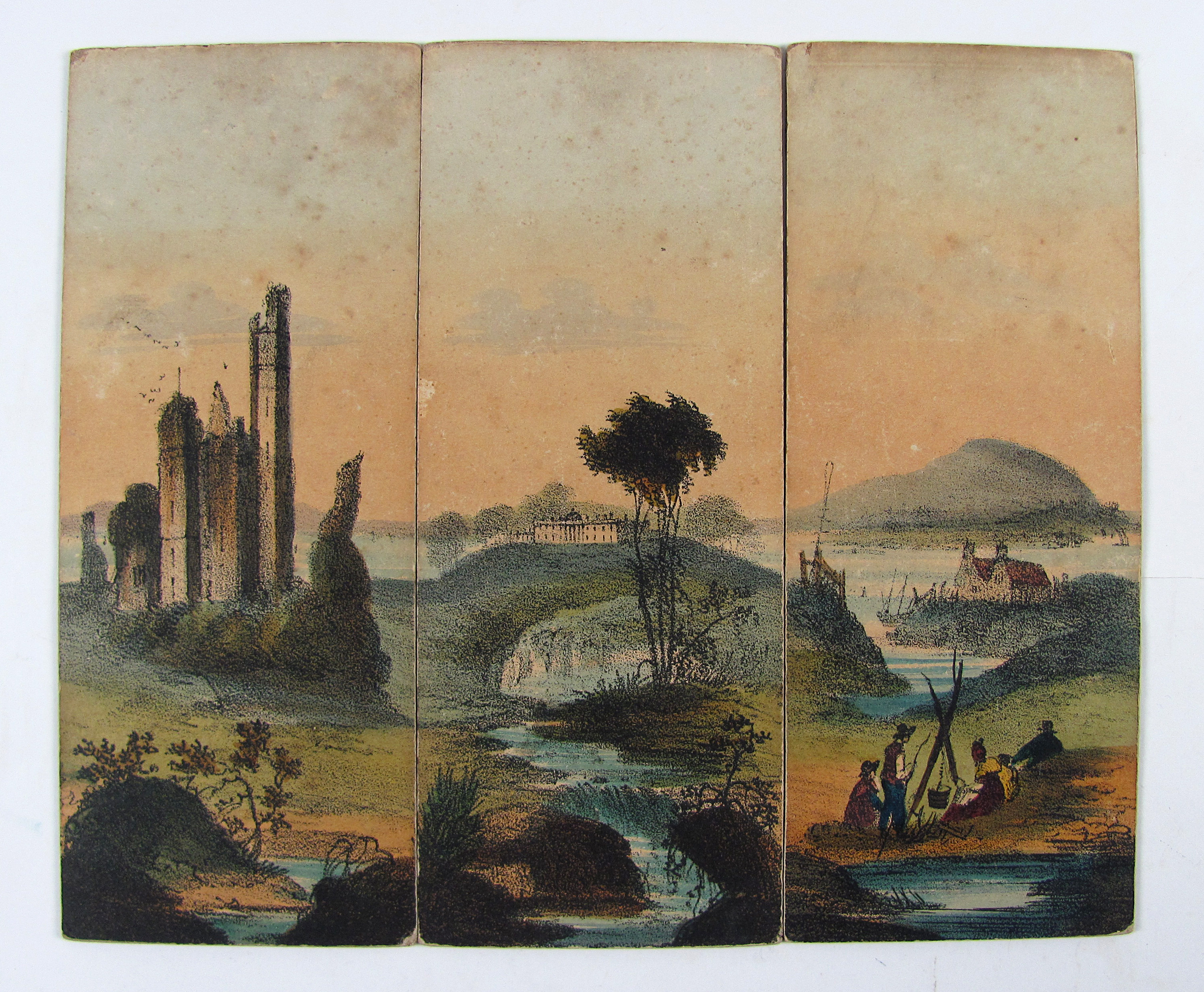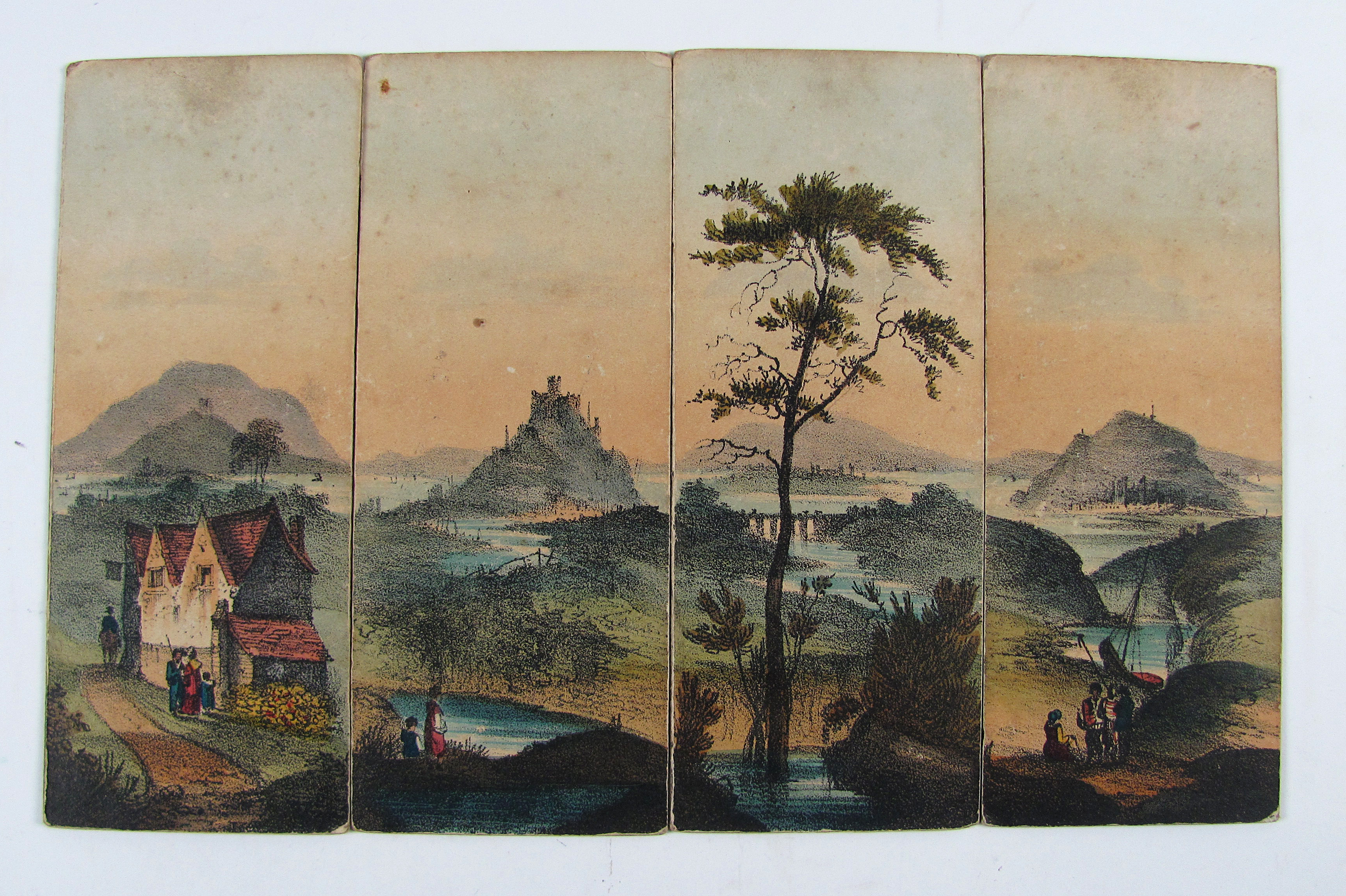 Eines der frühesten Exemplare dieser Gattung, selten.– Das Myriorama ist ein reizvolles optisches Spielzeug. Ein ideales Landschaftspanorama wird in vertikale Segmente geteilt. Dadurch, dass sich verschiedene Landschaftselemente im Vorder- und Hintergrund auf gleicher Höhe befinden (hier der dunkle Vordergrund, der Bildmitte Hügel und Wasser, im Hintergrund eine Bergekette), können die Teile beliebig miteinander kombiniert werden. Es ergibt sich so eine nahezu unendliche Anzahl an möglichen Kombinationen. Erfunden wurde diese Art der Landschaftsmontage durch Brès bereits im Jahre 1802. Er nannte seine Erfindung „Tableau polyoptique“. Der Engländer John Clark war der erste, der die Idee kommerziell aufgriff und 1823 eine englische und später eine italienische Ideallandschaft gestaltete und vetreiben ließ. Der Begriff Myriorama entstammt dem Griechischen „Myrias“ für 10.000.– Die Schachtel restauriert, die Segmente leicht gebräunt, minimal fleckig und an den Ecken minimal berieben, insgesamt gut erhalten.– Vgl. Slg. Nekes, S. 441.