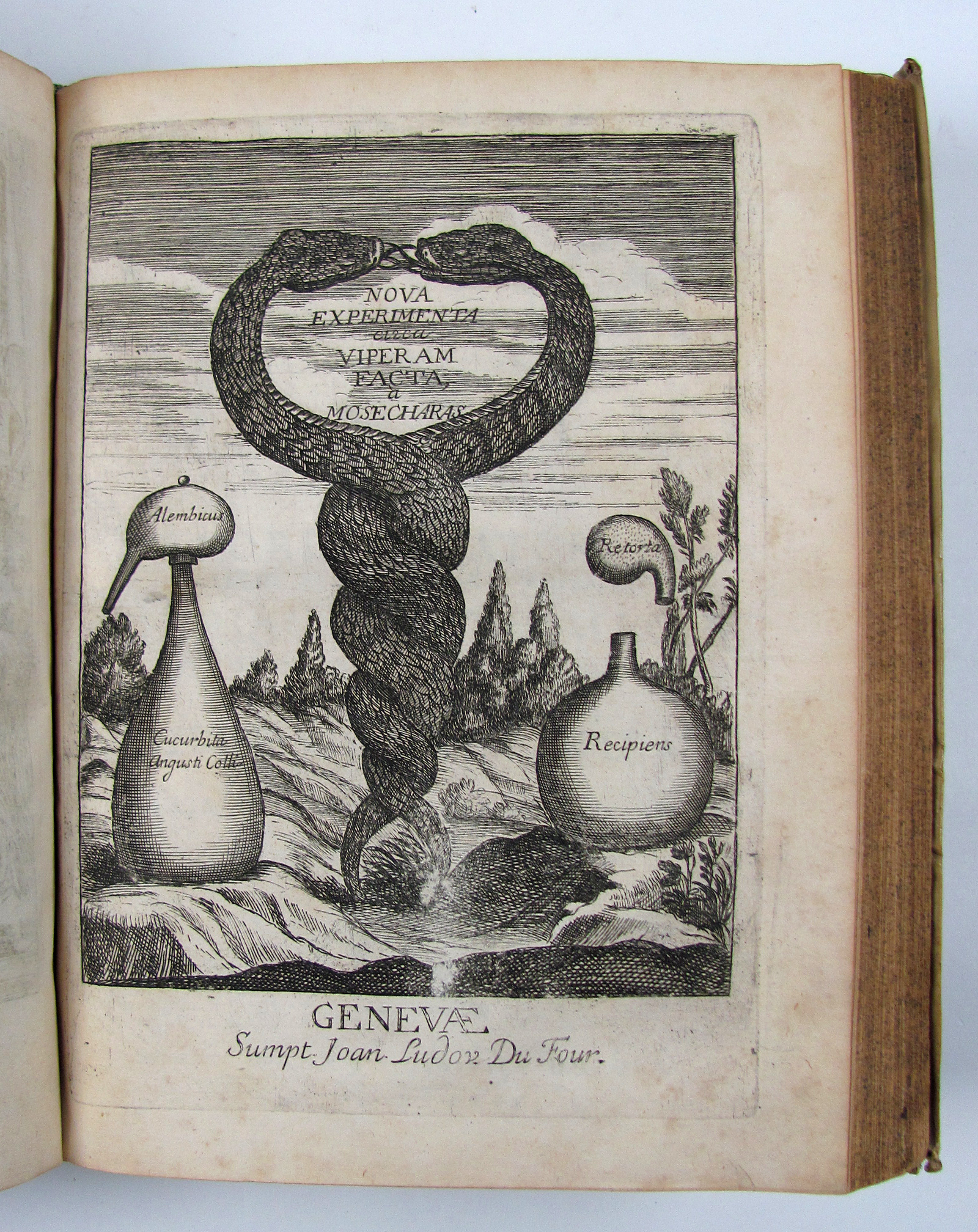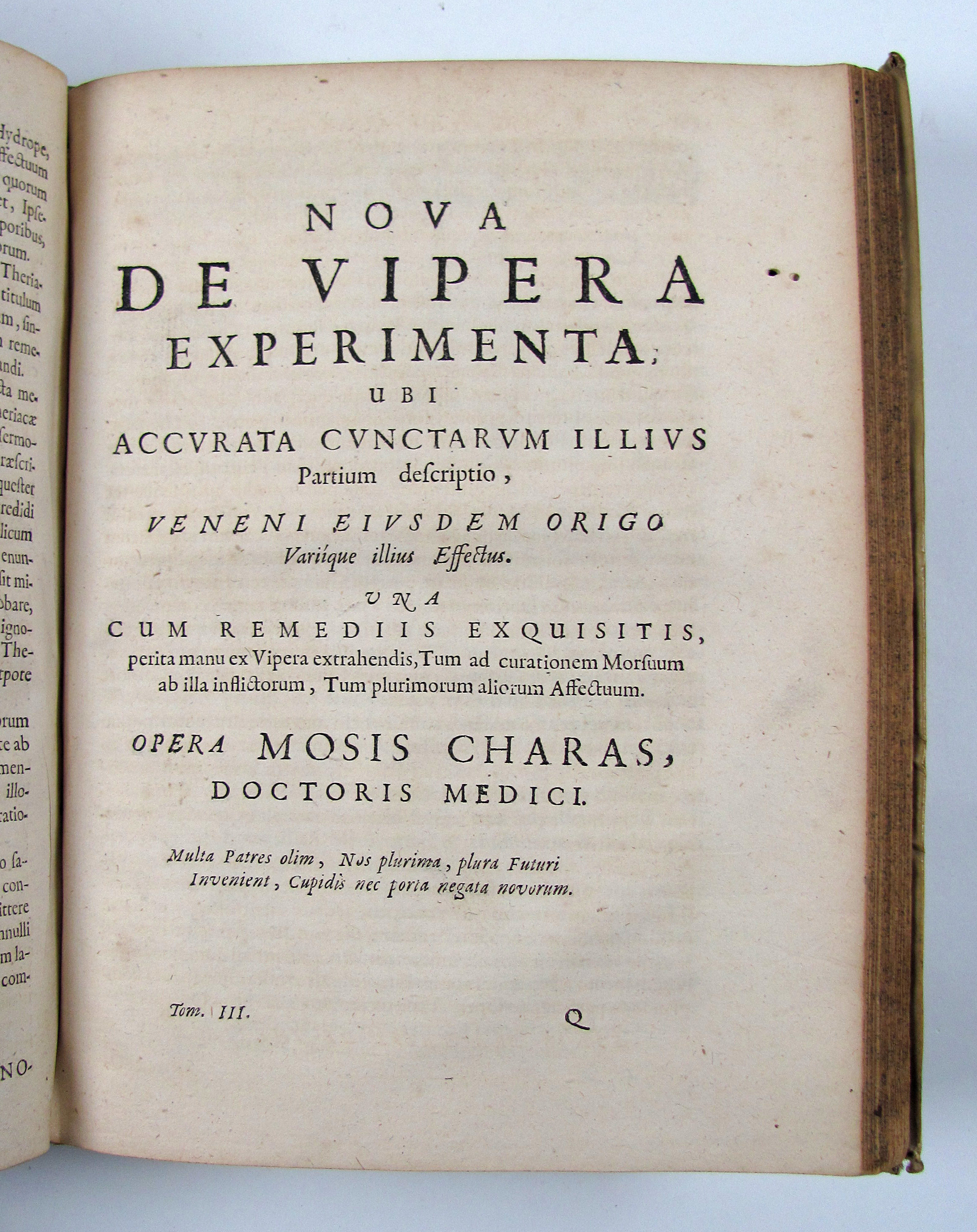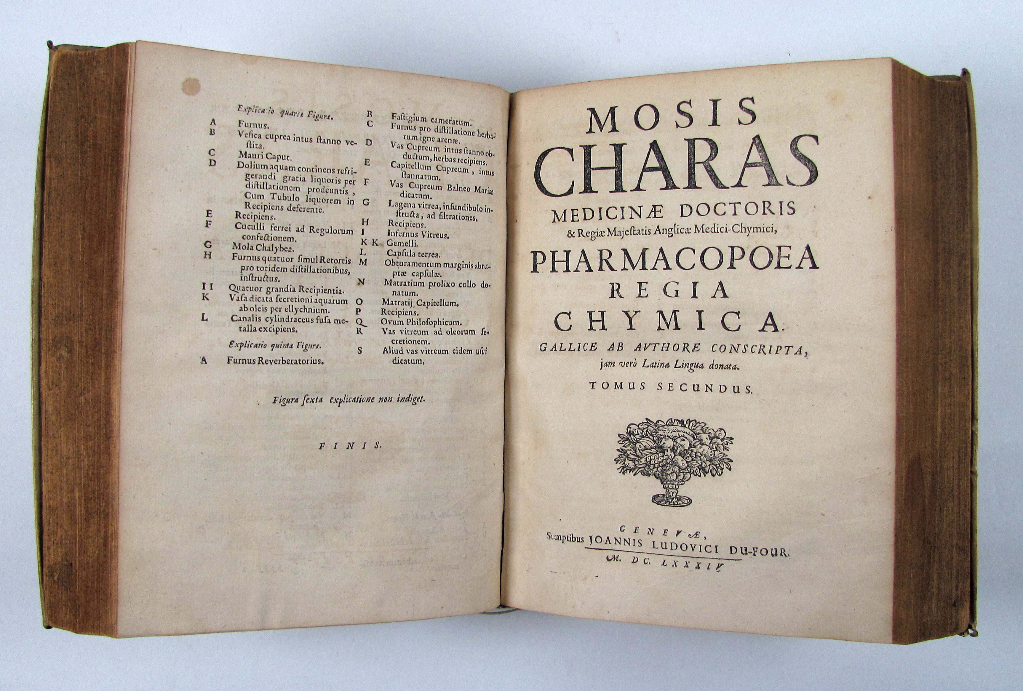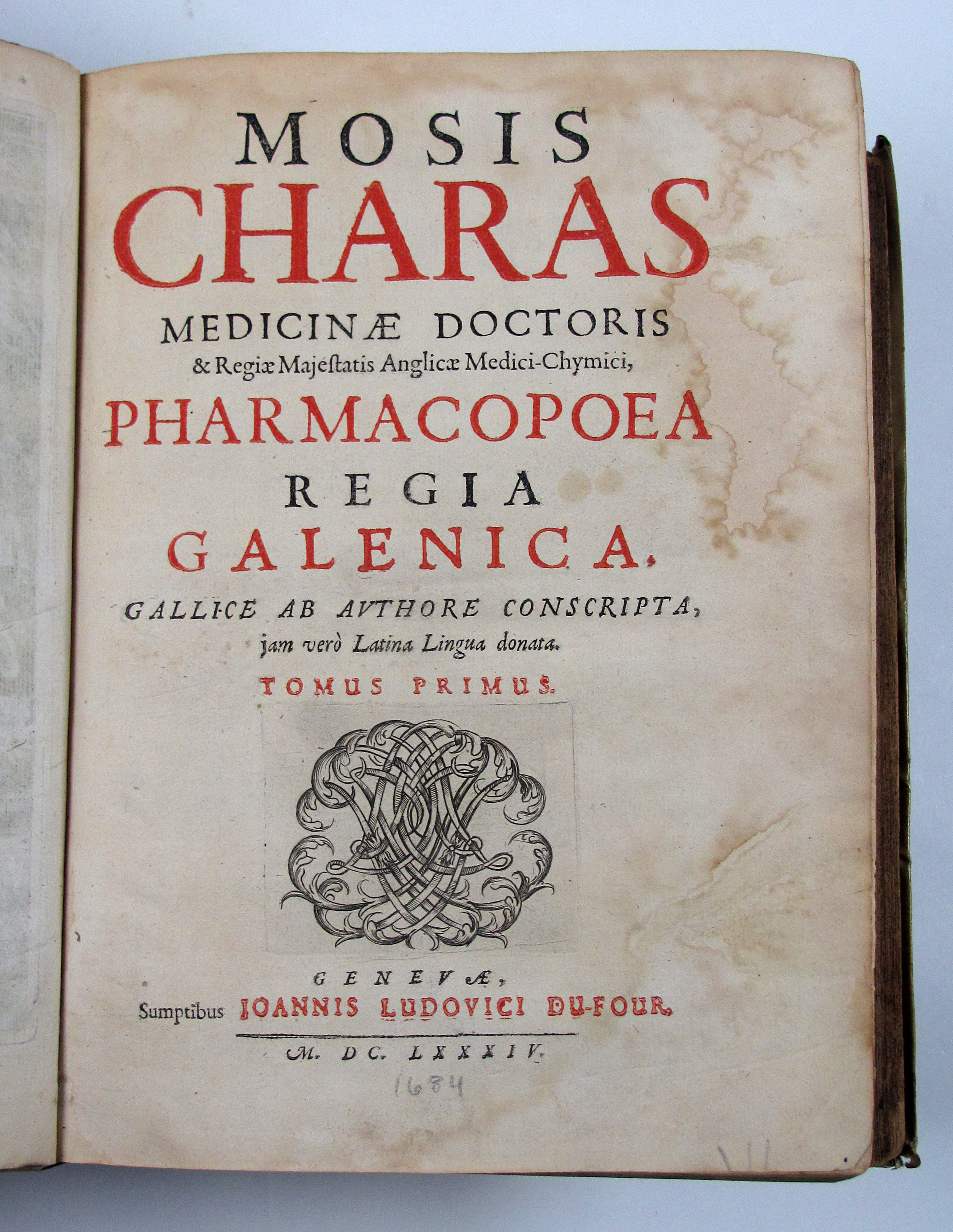 Seltene erste und einzige lateinische Gesamtausgabe, aus dem Französischen übersetzt.– Moses Charas (1618-1698), war Lehrer am Jardin des Plantes. Auf Grund der Aufhebung des Edikts von Nantes floh er nach England, wo er Hofapotheker unter Charles II. war. Über Amsterdam, wo er als Arzt praktizierte, kam er nach Spanien und wurde dort durch die Inquisition für 4 Monate in Haft genommen. Zur römischen Kirche gewaltsam bekehrt, ging er nach Frankreich zurück und wurde letztlich noch Mitglied der Académie des sciences.– Seine beiden Pharmakopöen Galenica und Chymica gehören zu den besten der Zeit und bekunden sein umfassendes Wissen. Sie erschienen zuerst 1672 und wurden laut Ferguson für den Gebrauch des Kaisers sogar in’s Chinesische übersetzt. Behandelt werden u.a. Destillationen aller Art, Extrakte und Salze, Herstellung von Schwefelsäure, Chinarinde etc. Das Frontispiz mit Darstellung allegorischer Figuren der Hygieia und der 4 Erdteile, die Kupfertafeln zeigen Destillieröfen und -geräte sowie eine Tabelle der chemischen Symbole.– Der „Theriacus“ besteht aus 74 Ingredienzen die jeweils beschrieben werden. Er erschien zuerst 1668.– Der ebenfalls viel übersetzte Traktat über die Vipern erschien zuerst 1669. 3 Kupfertafeln mit anatomischen Abbildungen der Schlangen.– Ohne das nie mitgebunden gewesene Porträt des Verfassers. Titel etwas wasserrandig. Die letzten 90 Seiten mit 3 kleinen Wurmgängen den weißen Rand und die 3 Schlangenkupfer betreffend. Kapital restauriert, neues Rückenschild, insgesamt gut erhalten.– Vgl. Ferguson I, 151 f. Ferchl 92. Hirsch-H. I, 885. Duveen 130. Schelenz 498 f.