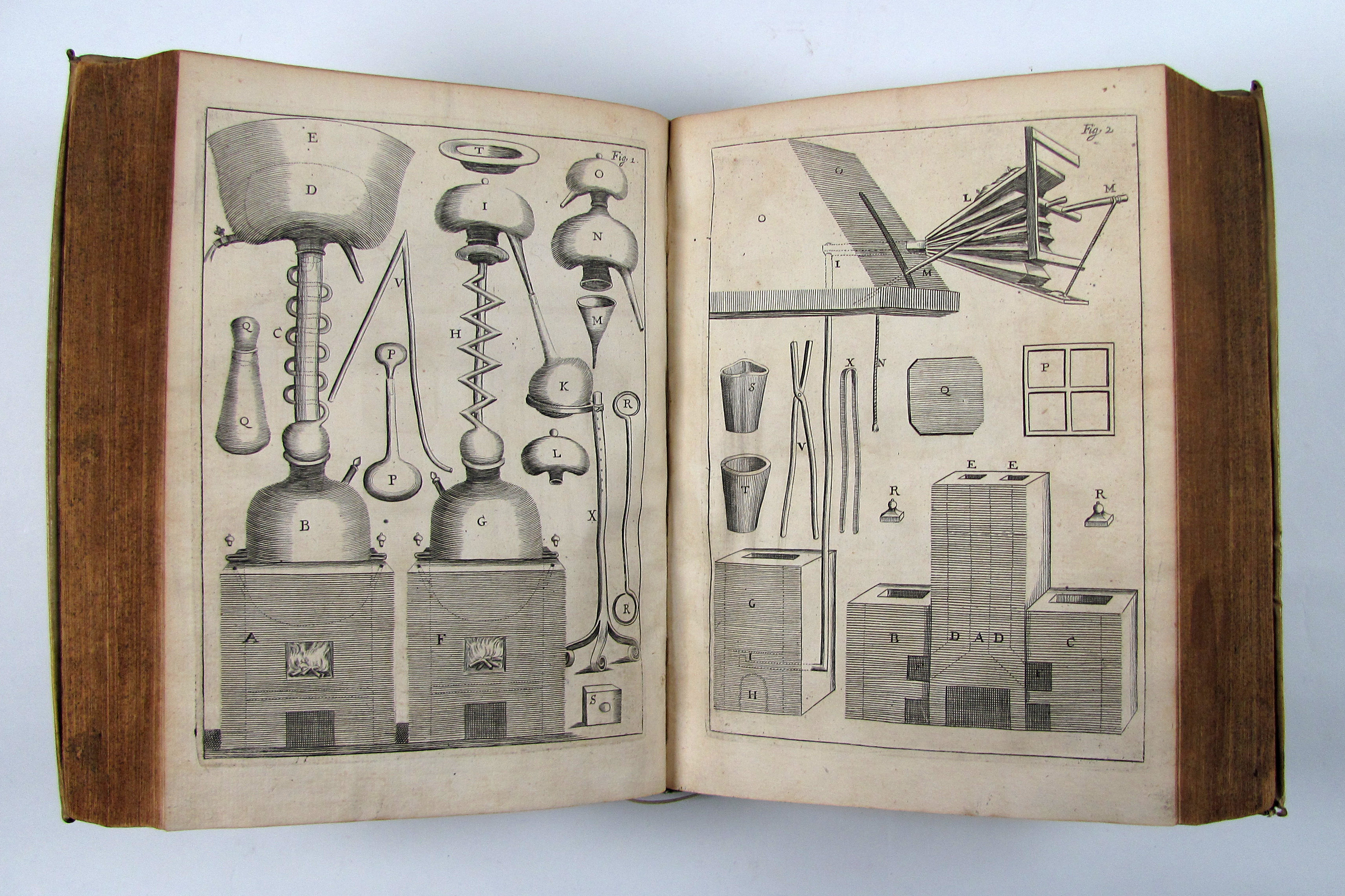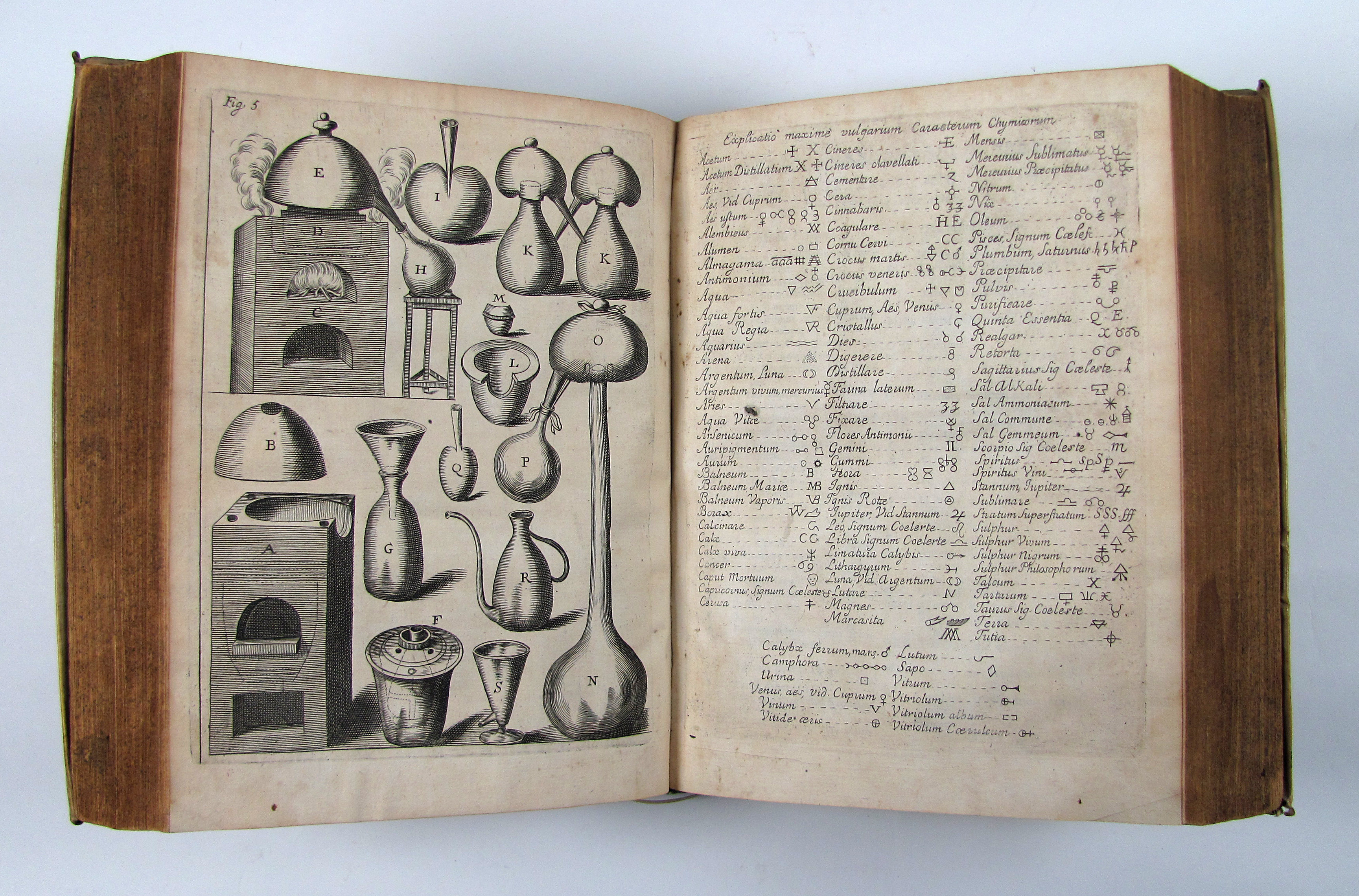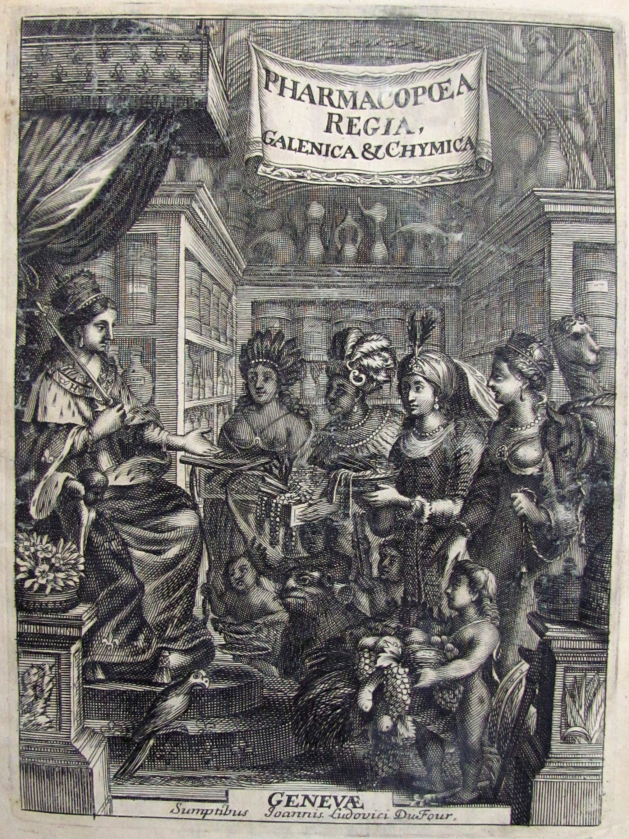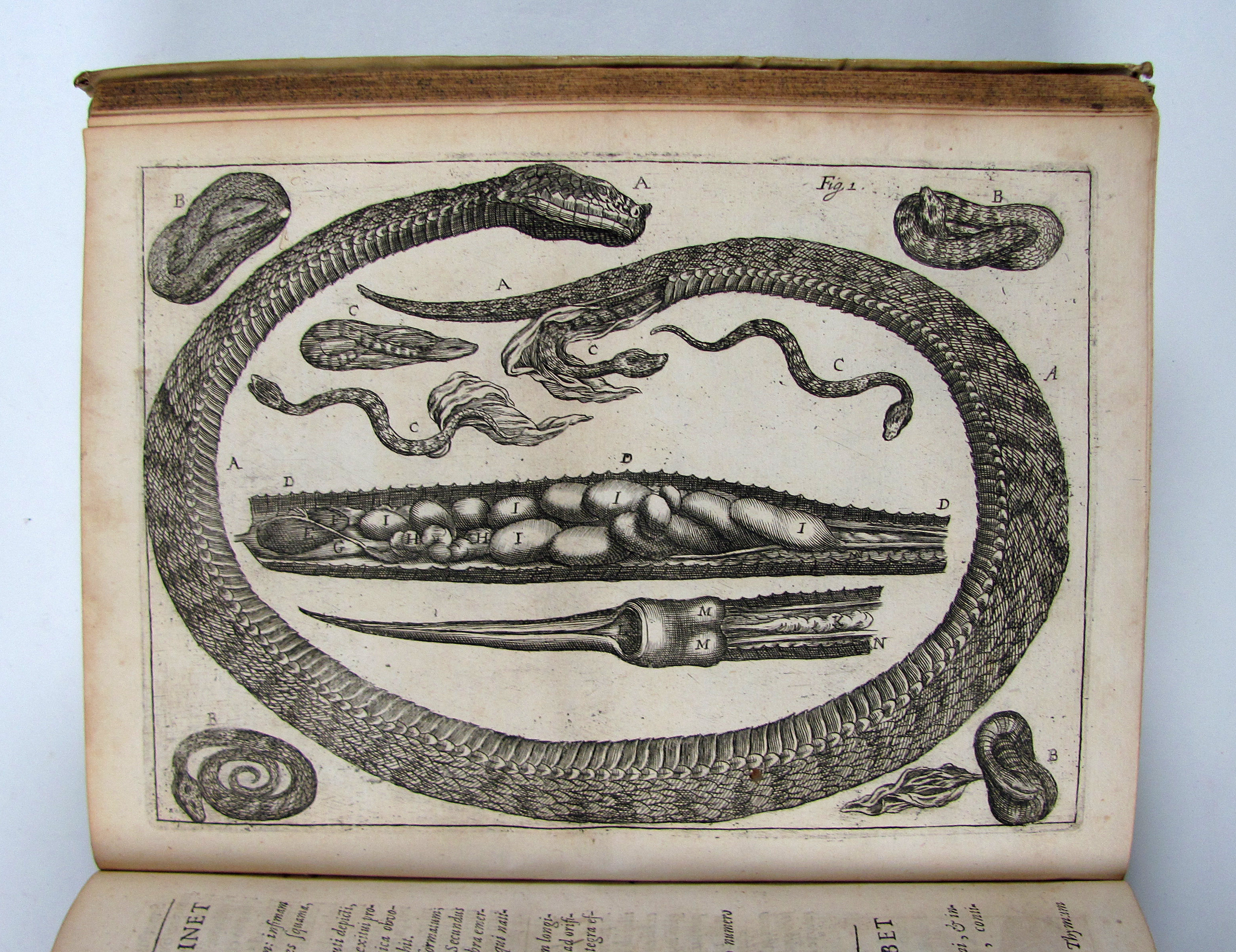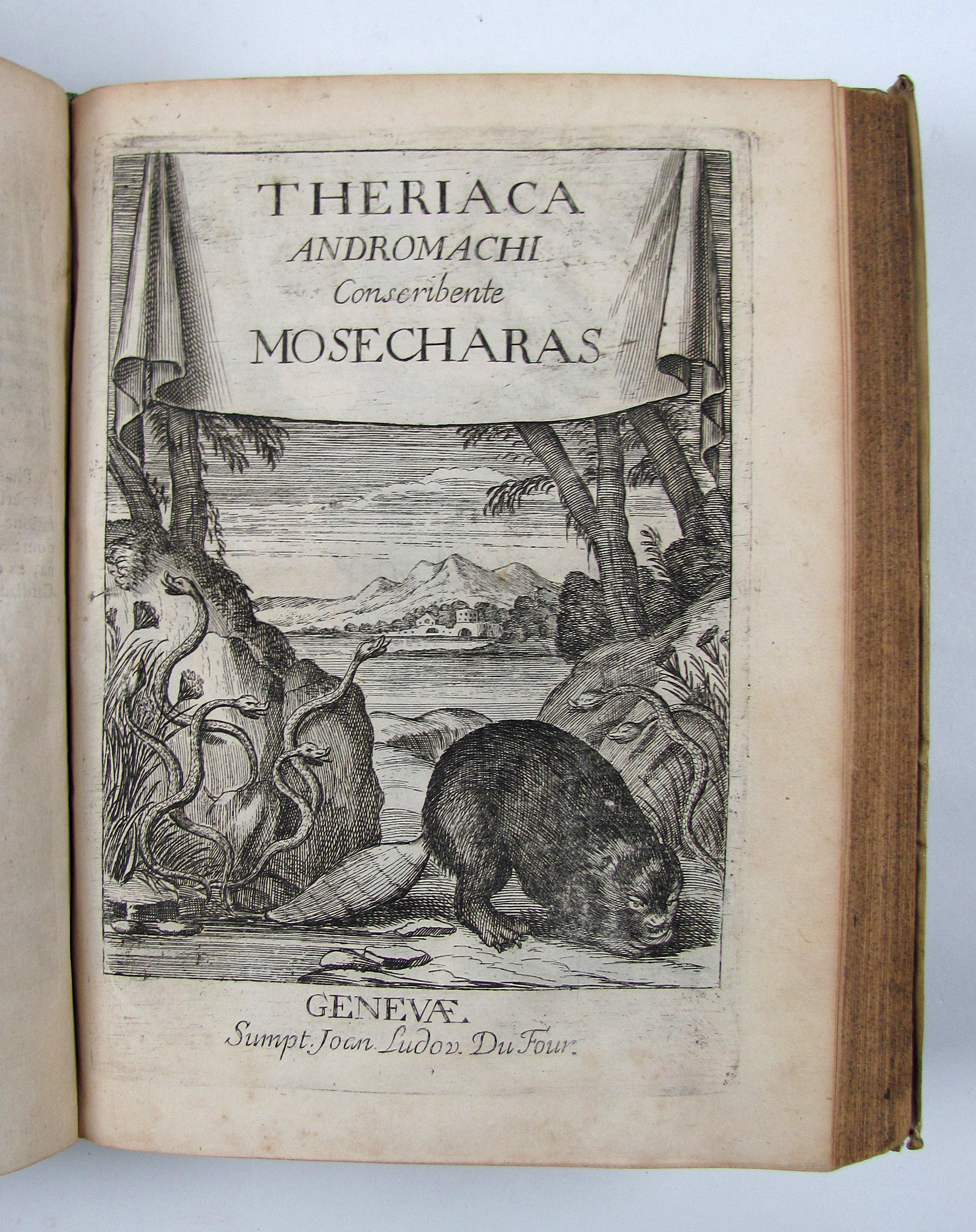 Seltene erste und einzige lateinische Gesamtausgabe, aus dem Französischen übersetzt.– Moses Charas (1618-1698), war Lehrer am Jardin des Plantes. Auf Grund der Aufhebung des Edikts von Nantes floh er nach England, wo er Hofapotheker unter Charles II. war. Über Amsterdam, wo er als Arzt praktizierte, kam er nach Spanien und wurde dort durch die Inquisition für 4 Monate in Haft genommen. Zur römischen Kirche gewaltsam bekehrt, ging er nach Frankreich zurück und wurde letztlich noch Mitglied der Académie des sciences.– Seine beiden Pharmakopöen Galenica und Chymica gehören zu den besten der Zeit und bekunden sein umfassendes Wissen. Sie erschienen zuerst 1672 und wurden laut Ferguson für den Gebrauch des Kaisers sogar in’s Chinesische übersetzt. Behandelt werden u.a. Destillationen aller Art, Extrakte und Salze, Herstellung von Schwefelsäure, Chinarinde etc. Das Frontispiz mit Darstellung allegorischer Figuren der Hygieia und der 4 Erdteile, die Kupfertafeln zeigen Destillieröfen und -geräte sowie eine Tabelle der chemischen Symbole.– Der „Theriacus“ besteht aus 74 Ingredienzen die jeweils beschrieben werden. Er erschien zuerst 1668.– Der ebenfalls viel übersetzte Traktat über die Vipern erschien zuerst 1669. 3 Kupfertafeln mit anatomischen Abbildungen der Schlangen.– Ohne das nie mitgebunden gewesene Porträt des Verfassers. Titel etwas wasserrandig. Die letzten 90 Seiten mit 3 kleinen Wurmgängen den weißen Rand und die 3 Schlangenkupfer betreffend. Kapital restauriert, neues Rückenschild, insgesamt gut erhalten.– Vgl. Ferguson I, 151 f. Ferchl 92. Hirsch-H. I, 885. Duveen 130. Schelenz 498 f.