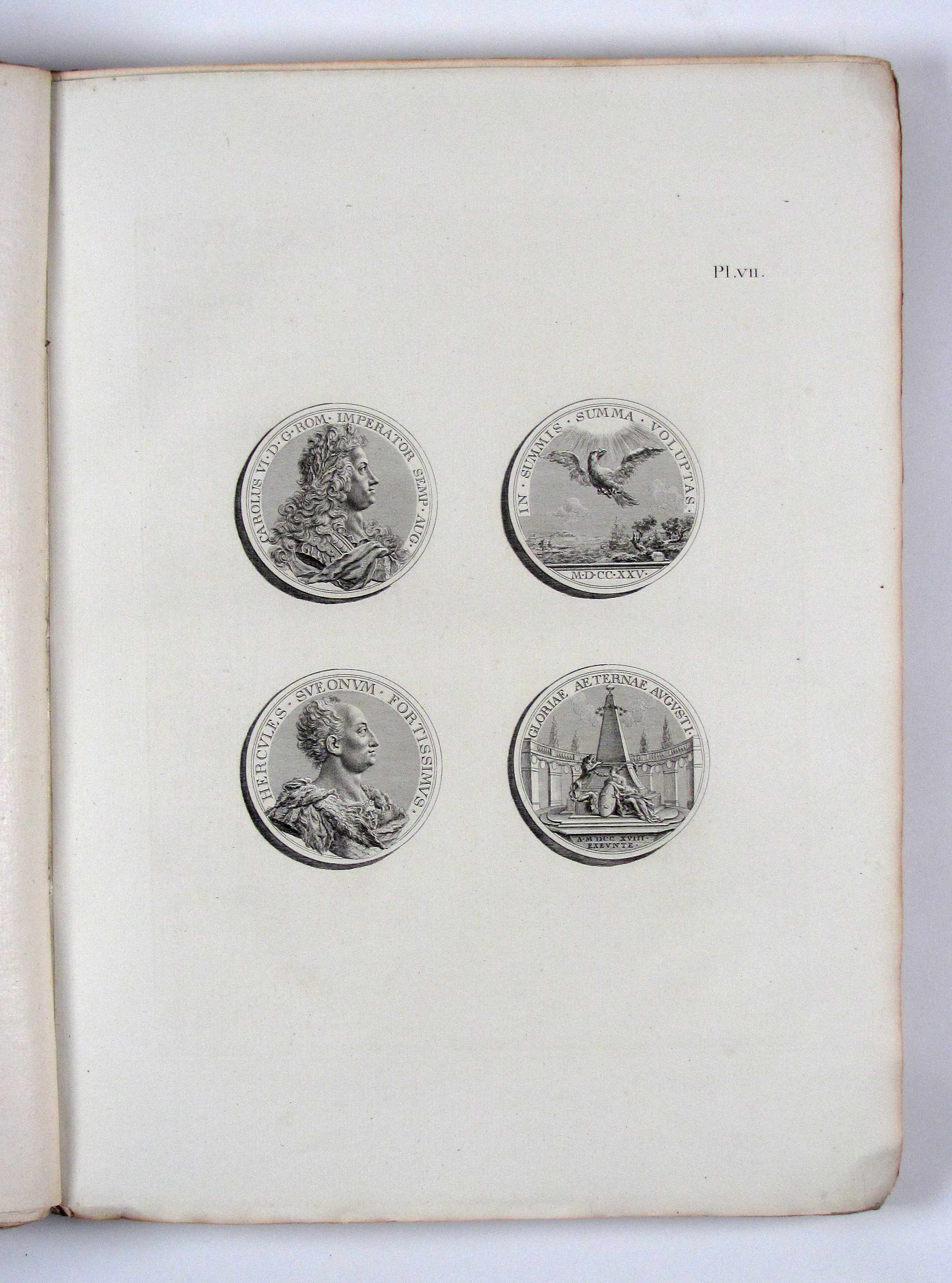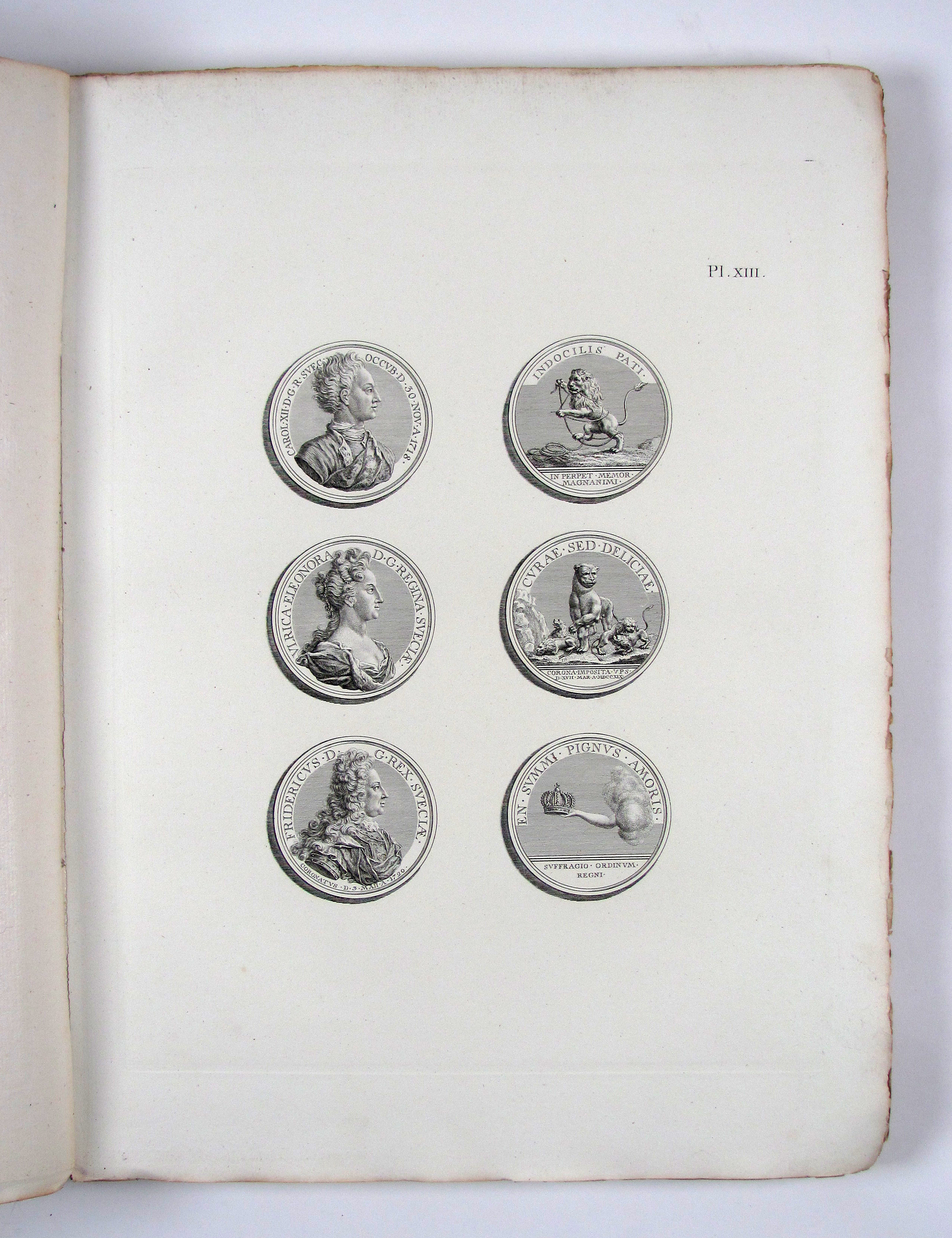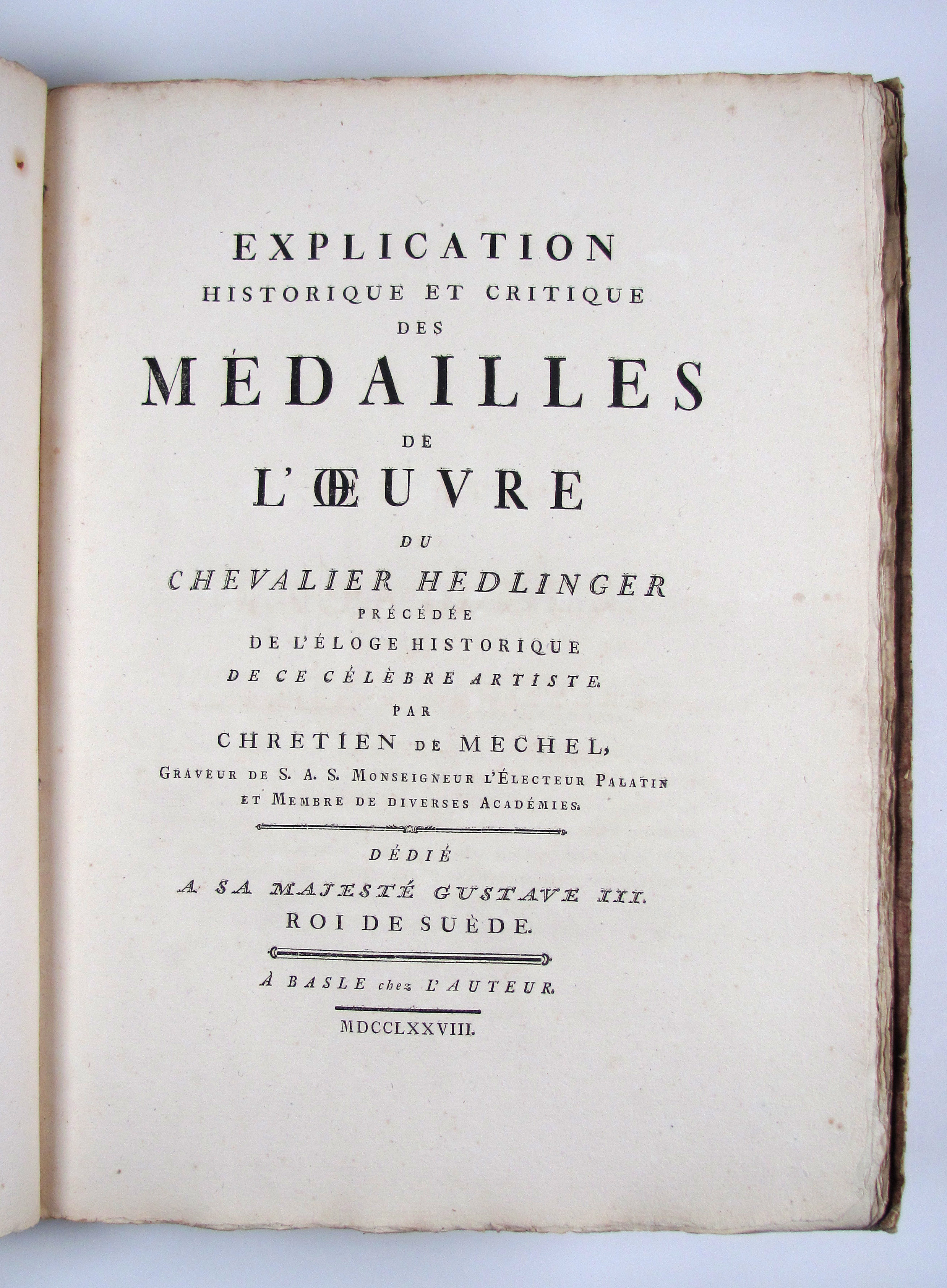 Unbeschnittenes und sauberes Exemplar der einzigen Ausgabe.– Johann Karl Hedlinger (1691-1771) war Medailleur der königlichen Münzen in Stockholm. Er wurde auch von seinen Berufsgenossen als der größte lebende Medailleur anerkannt. Die unvergleichliche Meisterschaft im Schnitt sowie die damals beste Qualität des in Schweden geförderten Silbers verleihen diesen Medaillen auch heute noch einen allerersten Platz in den Münz- und Raritätenkabinetten Europas.– Vorsatz mit hs. Besitzvermerk, Spiegel mit kleinem Stempel. Ein innen hervorragend erhaltenes, originäres Exemplar.– Cohen-R. 477 rühmt die feine Ausführung der Stiche durch Chretien de Mechel, der das Werk auch verlegte.– Barbier, III, 654.