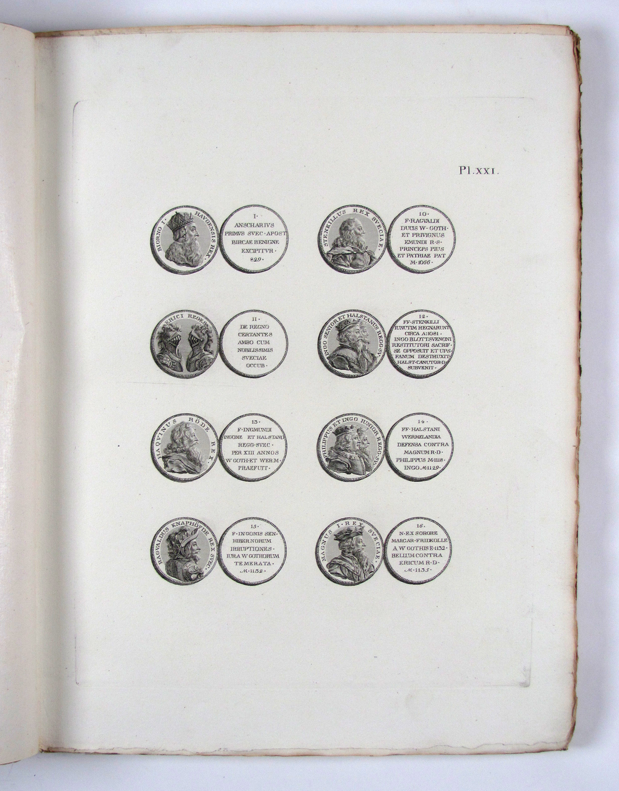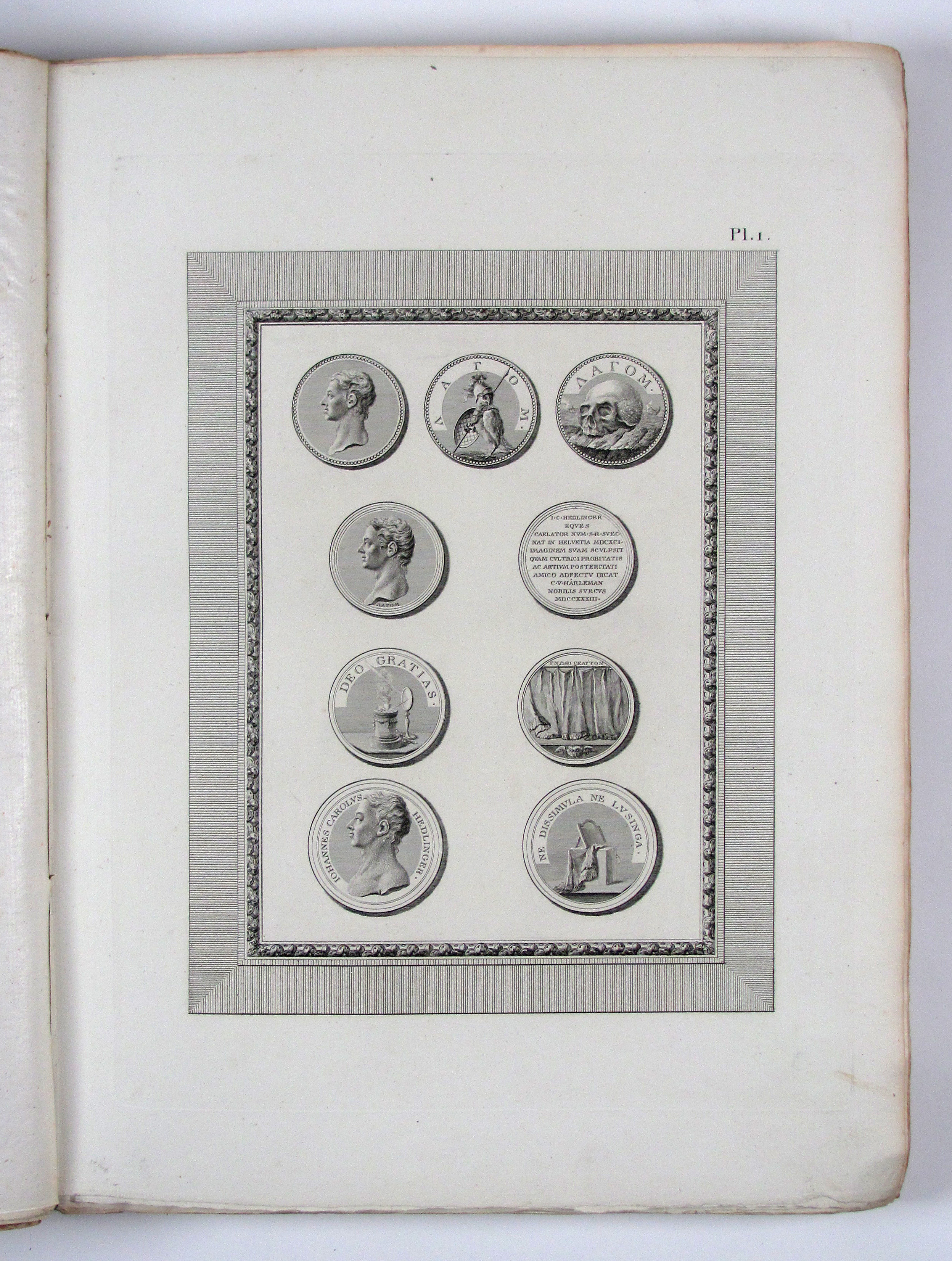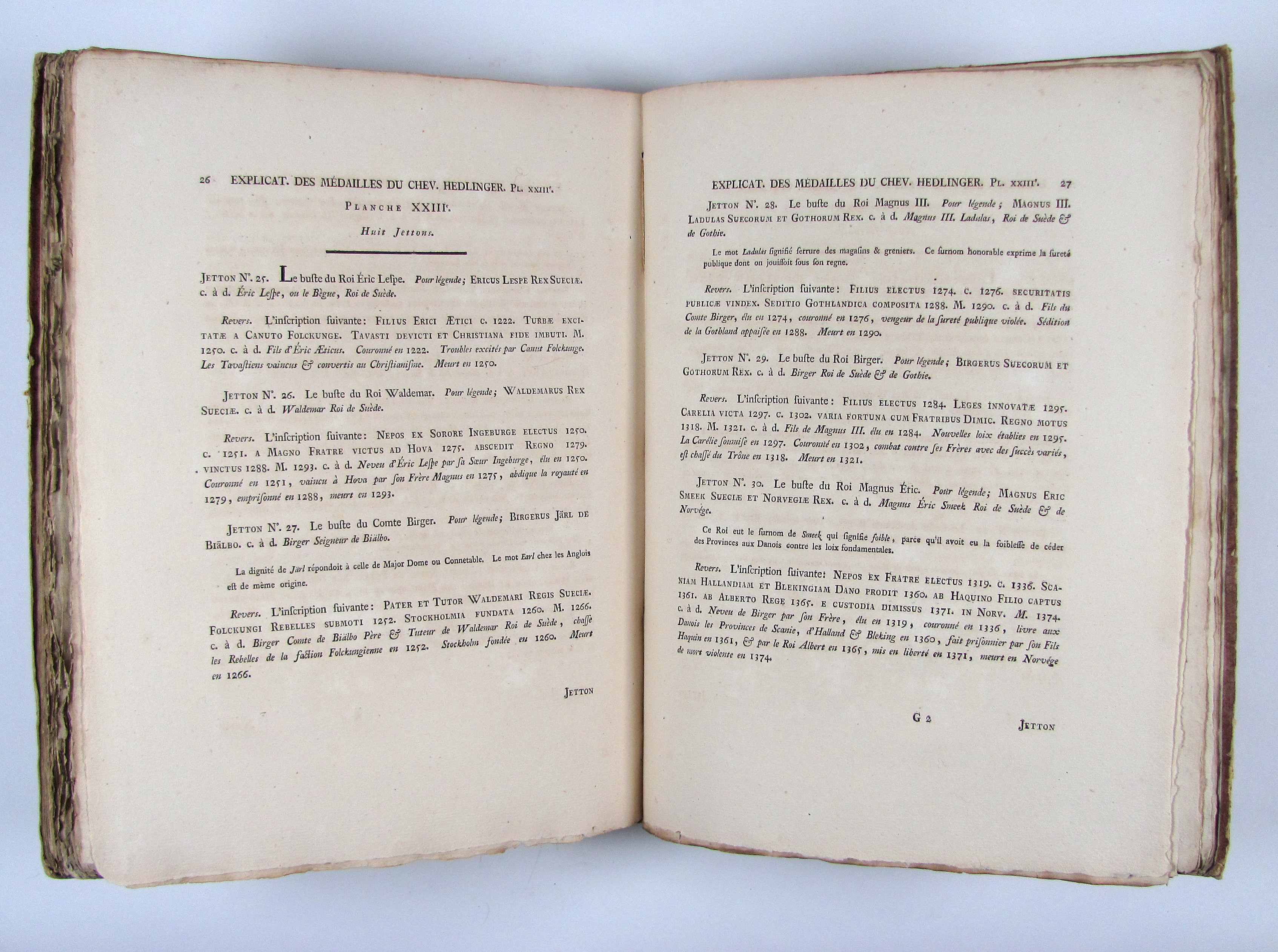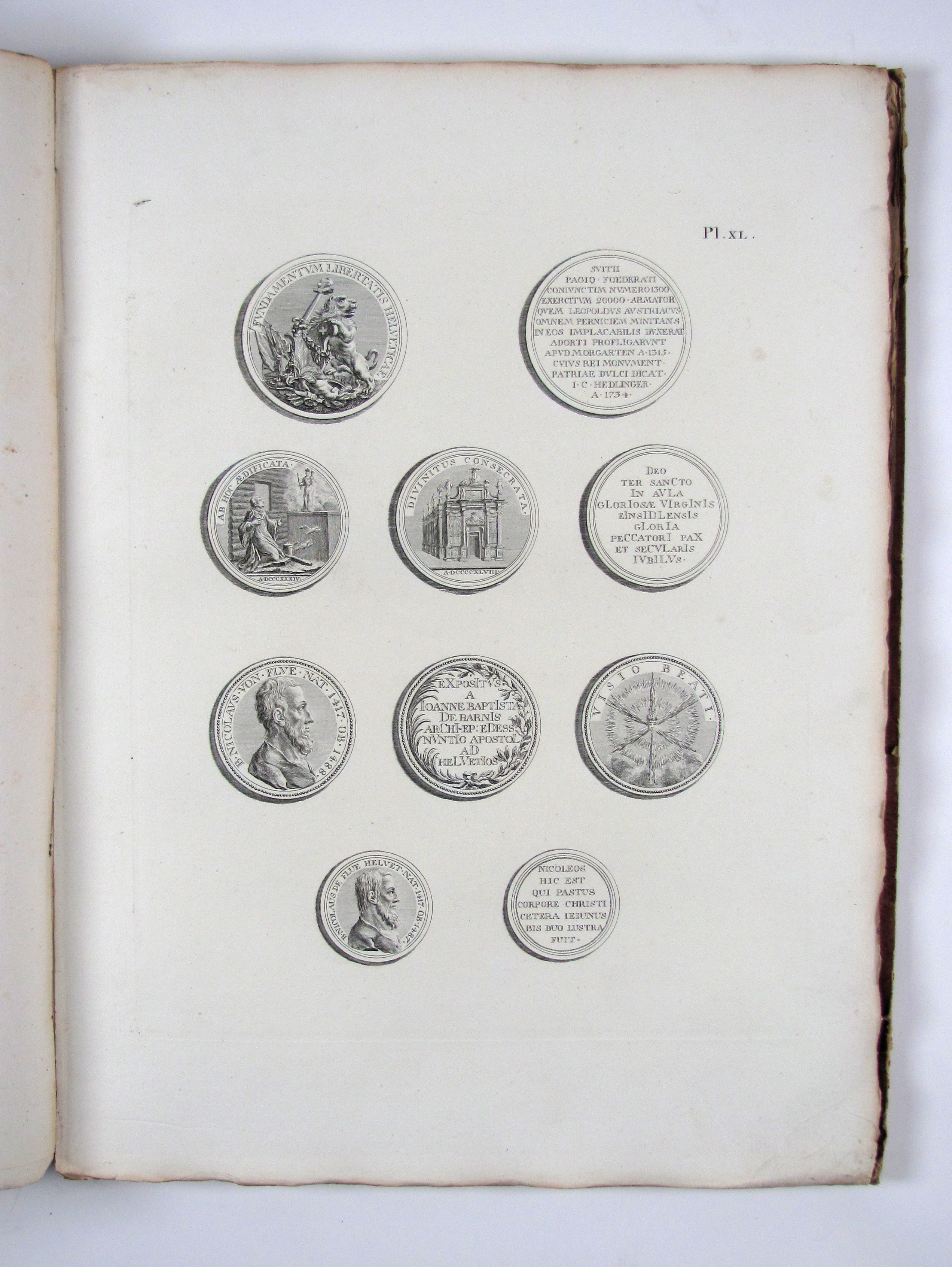 Unbeschnittenes und sauberes Exemplar der einzigen Ausgabe.– Johann Karl Hedlinger (1691-1771) war Medailleur der königlichen Münzen in Stockholm. Er wurde auch von seinen Berufsgenossen als der größte lebende Medailleur anerkannt. Die unvergleichliche Meisterschaft im Schnitt sowie die damals beste Qualität des in Schweden geförderten Silbers verleihen diesen Medaillen auch heute noch einen allerersten Platz in den Münz- und Raritätenkabinetten Europas.– Vorsatz mit hs. Besitzvermerk, Spiegel mit kleinem Stempel. Ein innen hervorragend erhaltenes, originäres Exemplar.– Cohen-R. 477 rühmt die feine Ausführung der Stiche durch Chretien de Mechel, der das Werk auch verlegte.– Barbier, III, 654.