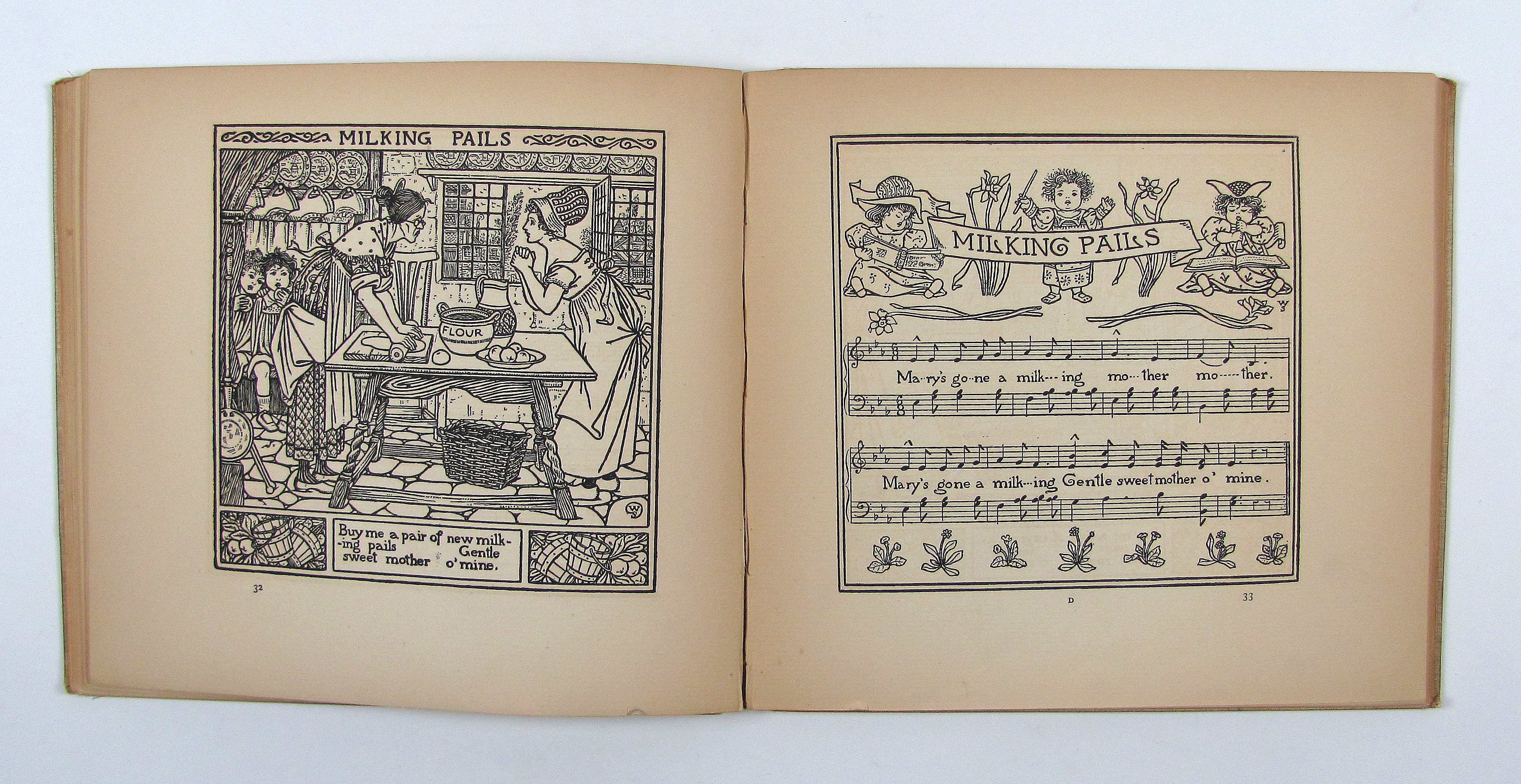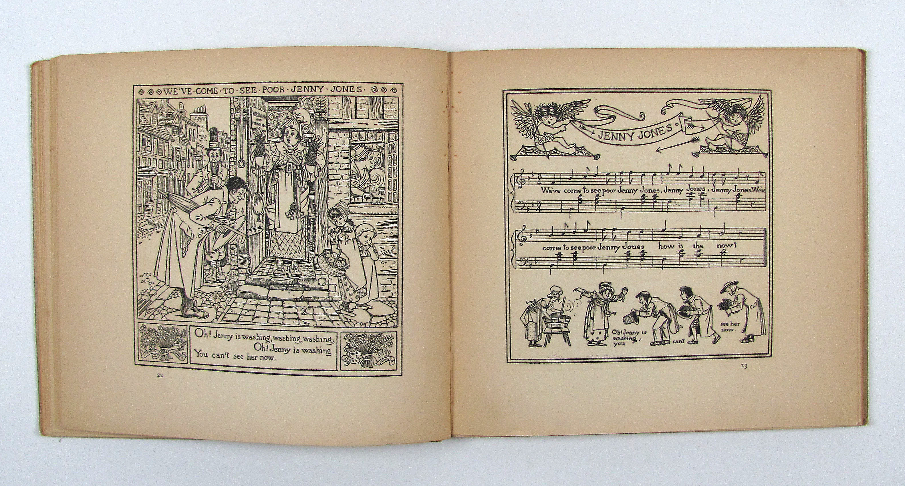 Hübsch illustriertes und interessantes Kinderbuch, gut gedruckt in der Ballantyne Press. Es werden die Anleitungen der Spiele, die Musik und der Liedtext zu einer harmonischen Einheit gebracht. Mit Anmerkungen über Herkunft und Alter der Spiele. „Winifred Smith, die nach ihrer Heirat unter dem Namen Winifred Green Kinderbücher illustriert hat, war eine Vertreterin der einflußreichen Birminghamer Illustratorenschule. Ihre Arbeiten leiten sich aber eher von Kate Greenaway als von der ‚Arts and crafts‘-Bewegung her“ (Bilderwelt im Kinderbuch 2274).– Im selben Jahr erschien noch ein zweiter Band (Second series) als Fortsetzung.– Gutes Exemplar. Gelenke etw. gelockert, papierbedingt gebräunt, Exlibris auf Spiegel.– Hobrecker 2595. Seebaß I, 747.