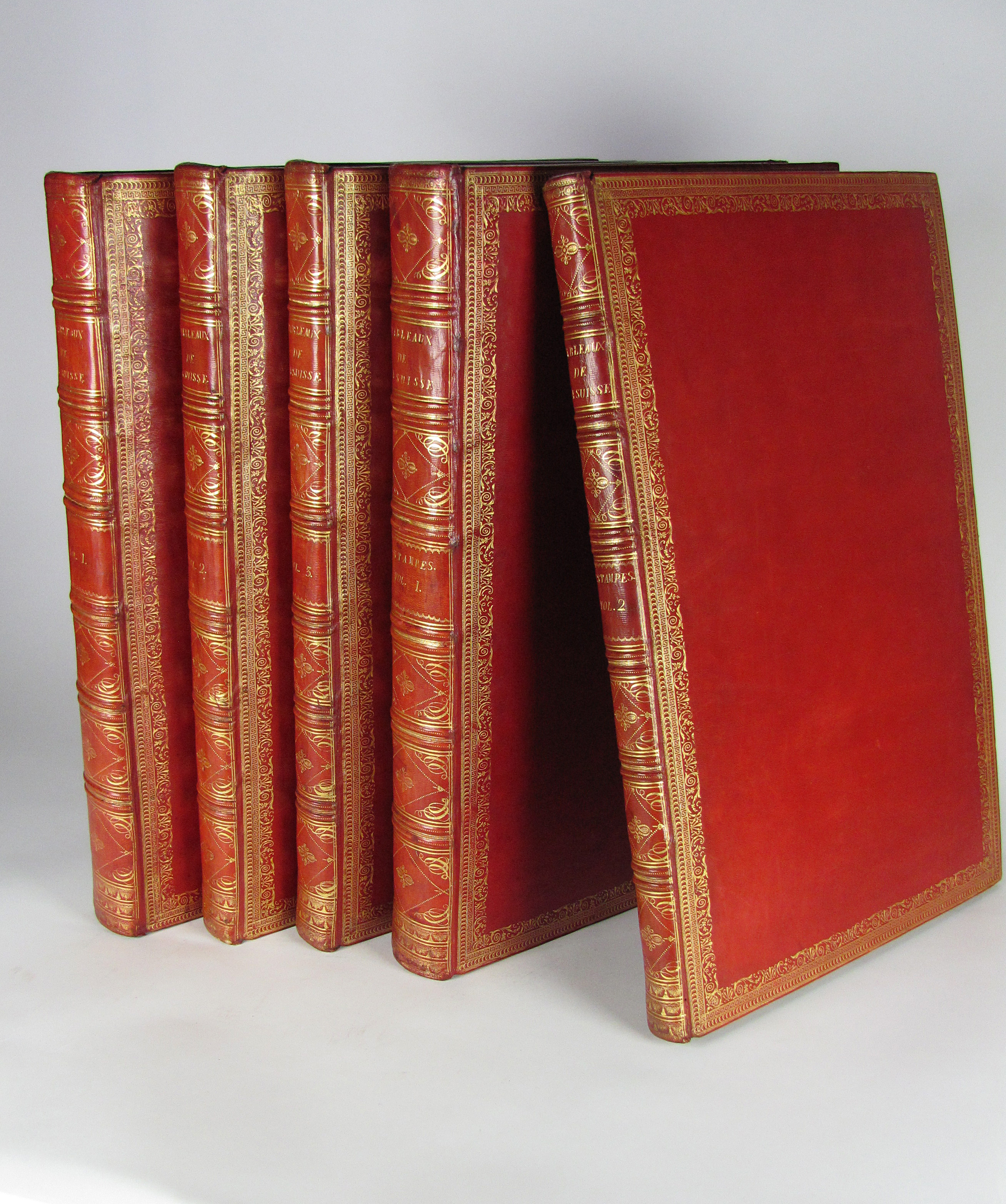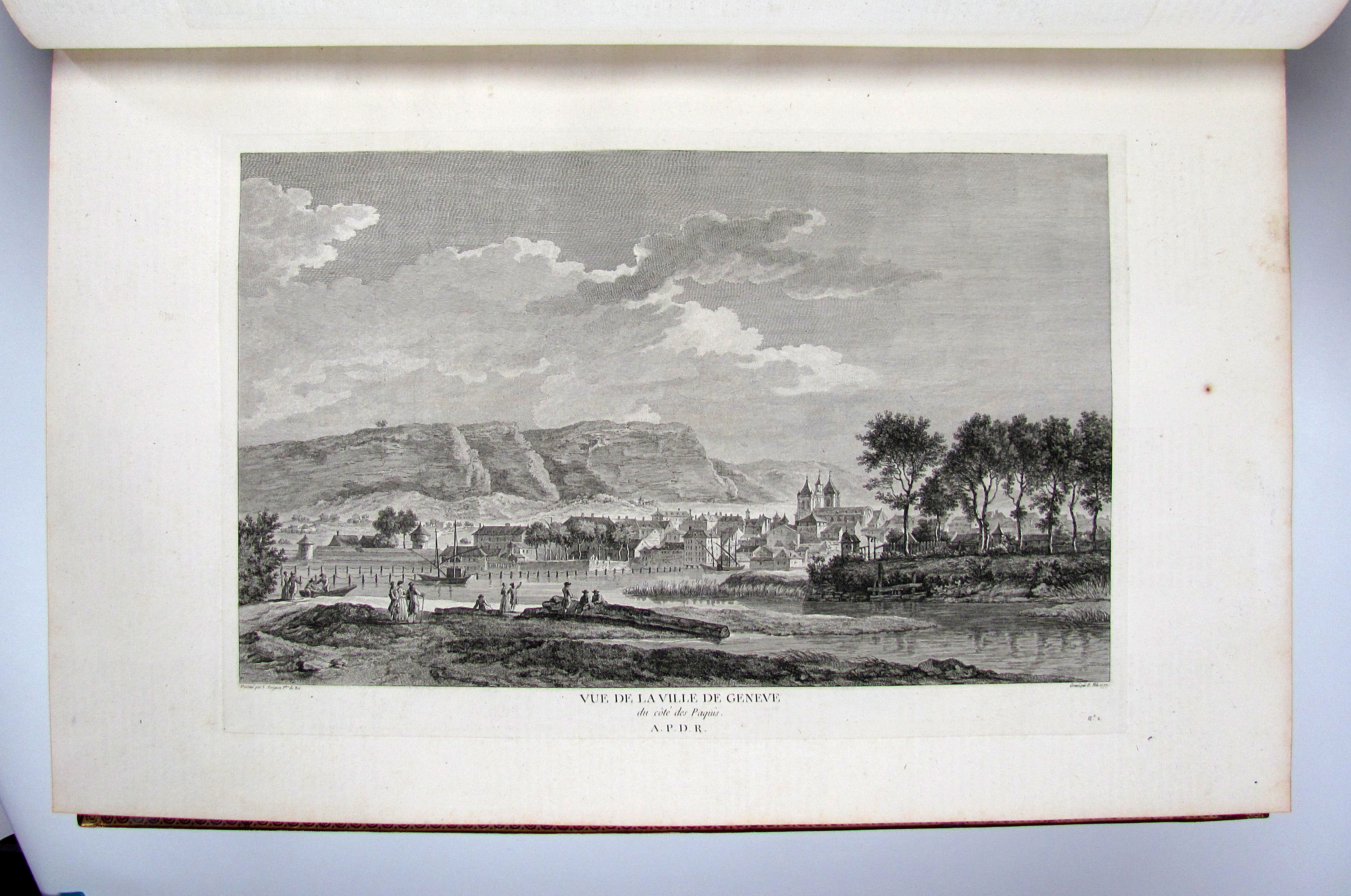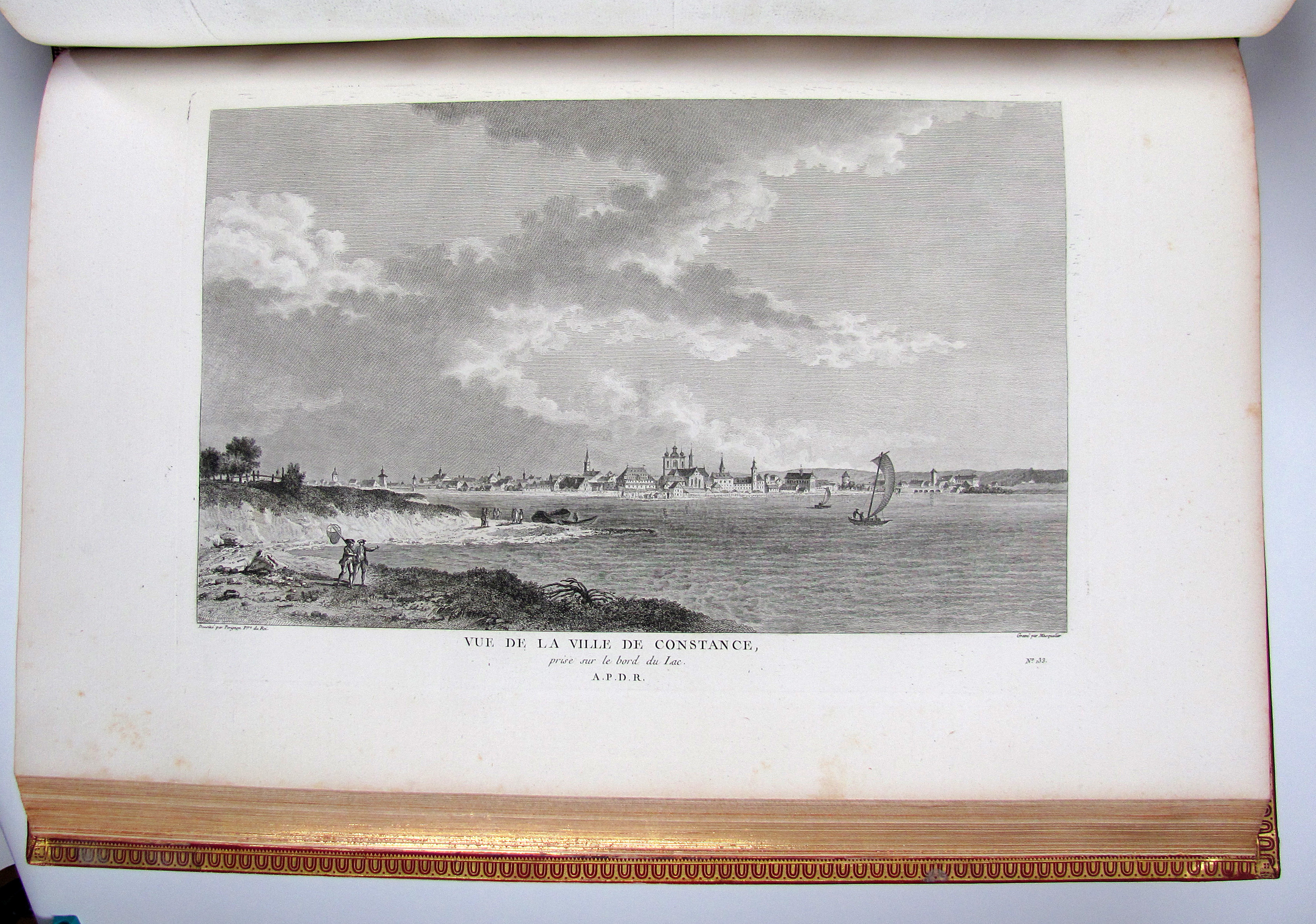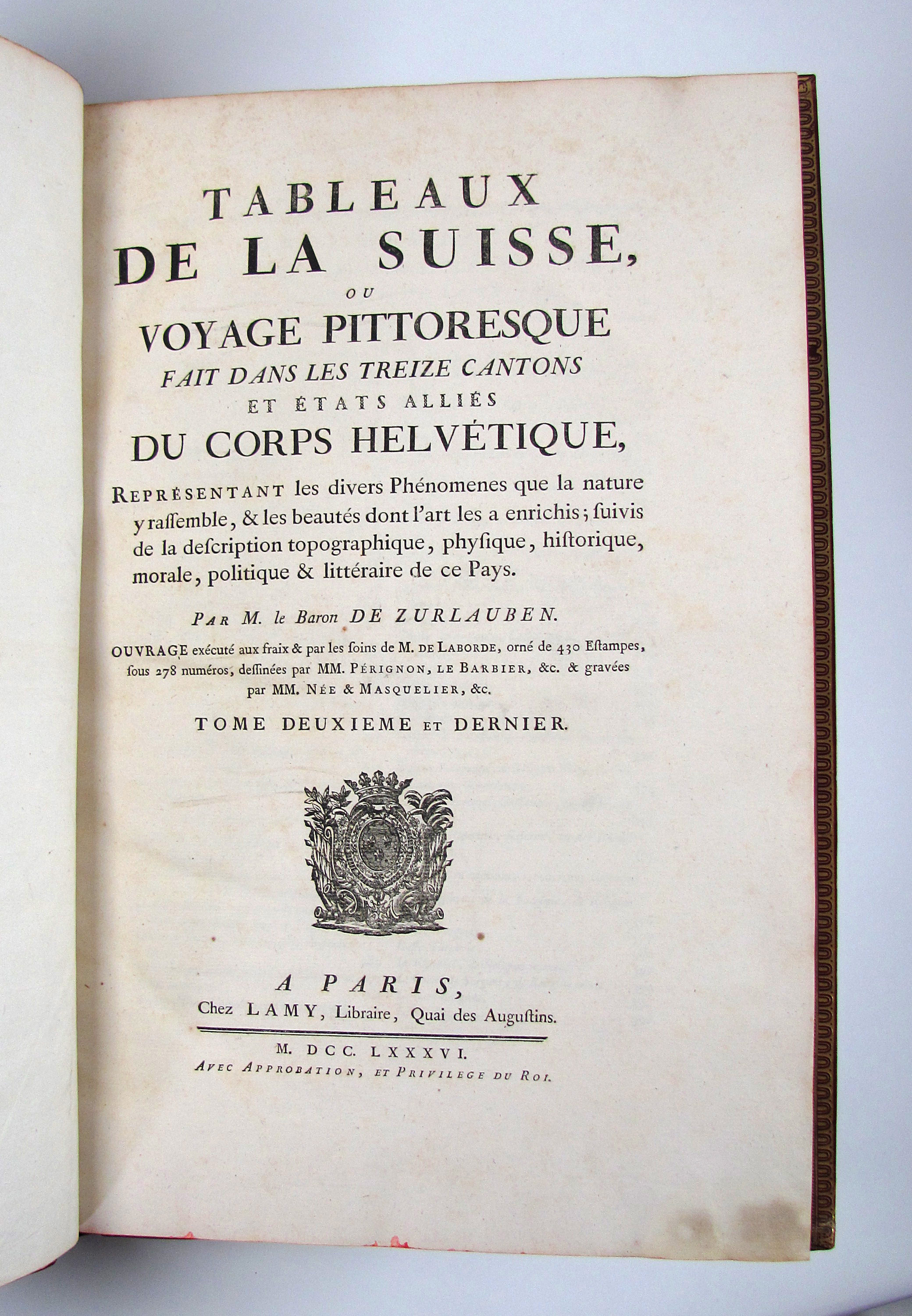 Komplettes Exemplar der ersten Ausgabe des schönsten, prächtigsten und umfangreichsten Schweizer Ansichtenwerks. Die sehr fein gestochenen Kupfer von de Longueil, Masquelier, Née u.a. nach Châtelet, Le Barbier, Moreau le Jeune u.a. zeigen zumeist Ansichten, ferner einige Karten, 2 Panoramen, Kostümdarstellungen, Porträts und Münzen. Zurlauben (1720-1799) published the first volume anonymously making it seem is if it was Laborde’s work. The second volume with a slightly different title bears Zurlauben’s name. His monumental work offers a wealth of facts about Switzerland, and is a testimony to his vast erudition. He cites sources and writes with ease, but with a serious approach which earned him the esteem of fellow scholars at home and abroad. The work is dedicated to the count of Artois, Colonel-General of Switzerland.– Das vorliegende Ausnahmeexemplar in besonders dekorativen Einbänden ist vollständig und wie folgt gegliedert: Textband I: 5 Bl. (Titelei mit gestoch. Wappenvignette), 10 S. (Subskribentenliste), LXXXIV (recte LXXIV) S., 368 S., LXVI S., 3 Bl. (Errata und Druckprivileg).– Textband II: 2 Bl., 7 S. (Tafelverzeichnis), 328 S.– Textband III: 1 Bl., S. 329-578, 8 S. (Tafelverzeichnis).– Tafelband I: Kupferfrontispiz, Drucktitel, 7 S., doblgr. Karte, num. Kupfer 1-217 (davon 5 doblgr. und 2 mehrf. gefalt.).– Tafelband II: 1 Bl. mit Porträt-Vignette, gestoch. Titel mit Vignette, num. Kupfer 218-278, „Table analytique“ (Generalregister) mit 2 Bl., 2 S. und 129 Seiten.– Die Kollation der Tafeln sorgt hin und wieder für Verwirrung. Dies kommt daher, dass im ersten Tafelband die Tafeln mit mehreren Kupfern auf einem Blatt nur eine Nummer tragen, während im zweiten Tafelband die einzelnen Kupfer nummeriert sind und nicht die Tafeln. Darüber hinaus nennt der Drucktitel auch noch eine Anzahl von 430 einzelnen Kupfern, es sind aber auf allen Tafeln nicht mehr als 391 Kupfer enthalten. Der erste Tafelband enthält, neben den oben einzeln erwähnten Illustrationen, 217 Tafeln mit 330 Kupfern und der zweite Band die nummerierten Kupfer 218-278 auf 31 Tafeln.– Vorsatz und Frontispiz von Tafelband I mit Knitterfalte, das Papier der Textbände gleichmässig leicht gebräunt oder minimal stockfleckig, einige ganz wenige Seiten Text etw. stärker gebräunt, die Seiten 75-78 in Textband II mit kleinem Wasserrand unten links, eine doppelblattgr. Tafel (Nr. 185) gebräunt. Die Einbände frisch und kaum berieben oder bestossen. Vorderdeckel von Tafelband I mit Schabstellen, oberes Kapital von Tafelband II mit winziger Fehlstelle. Insgesamt sehr gut erhaltenes und breitrandiges Prachtexemplar. Papier 50 x 32,5 cm., Einbände 51,5 x 35 cm.– Longchamp 3362, Cohen-R. 1075. Fürstenberg 46, 101, 110 und 151. Brunet V, 1546.