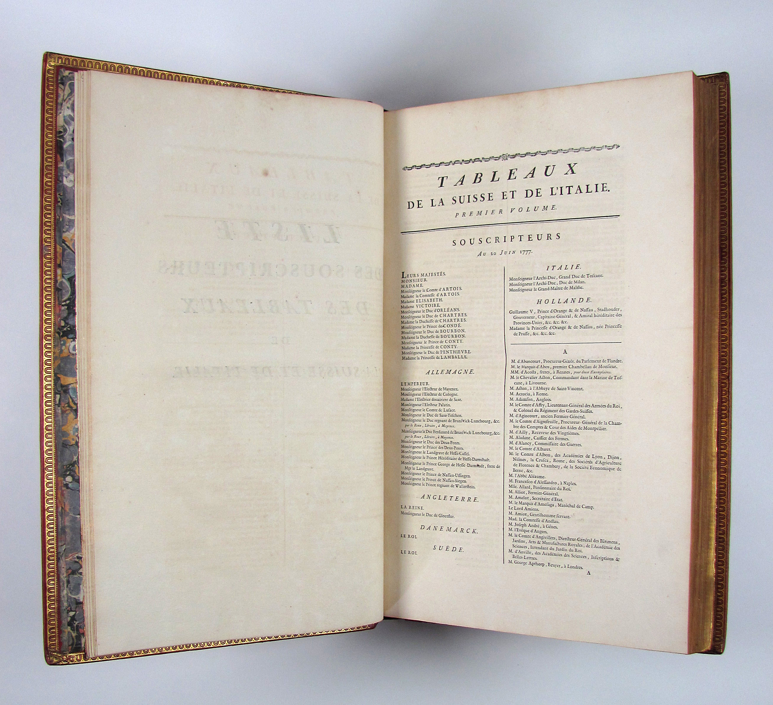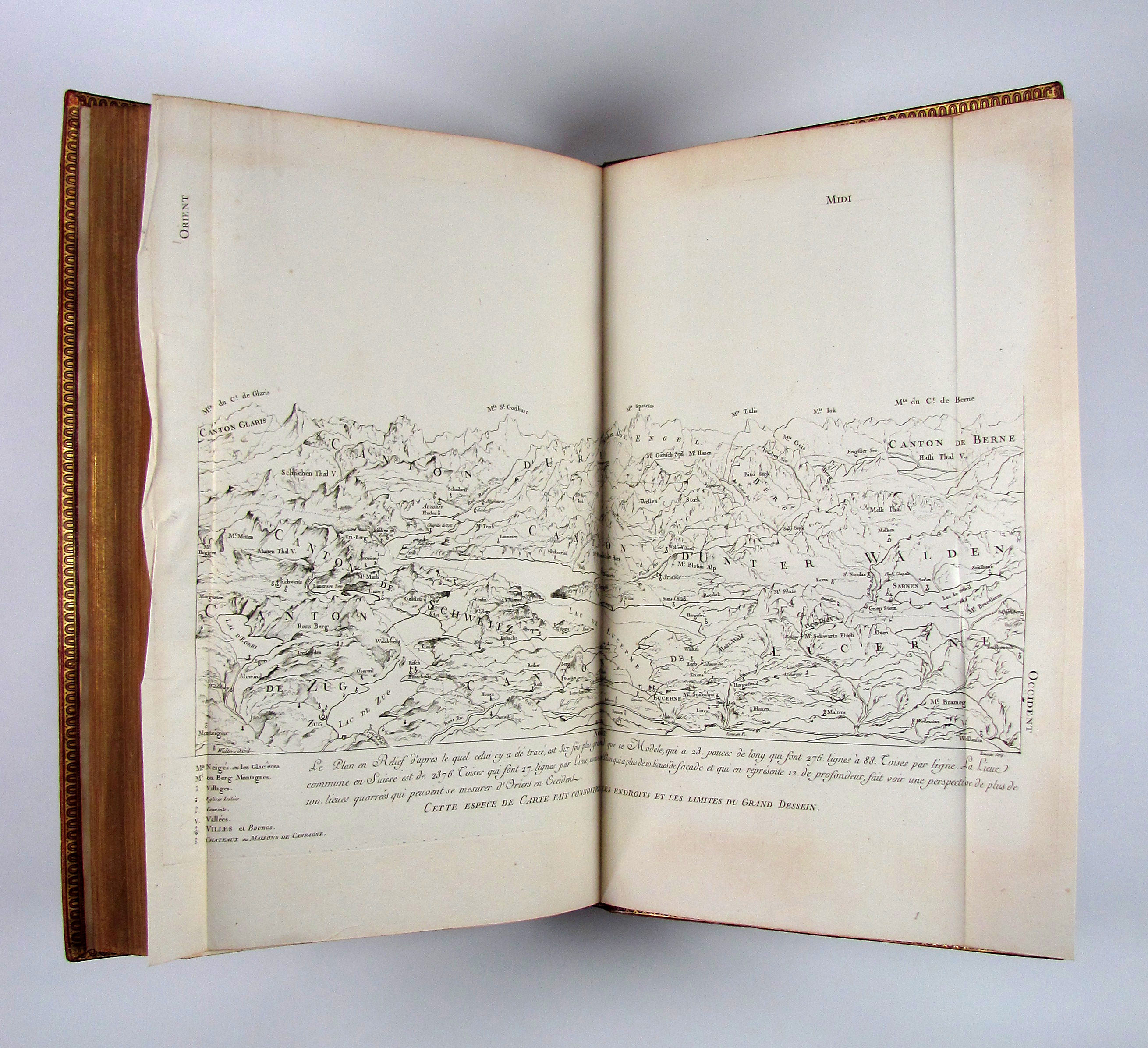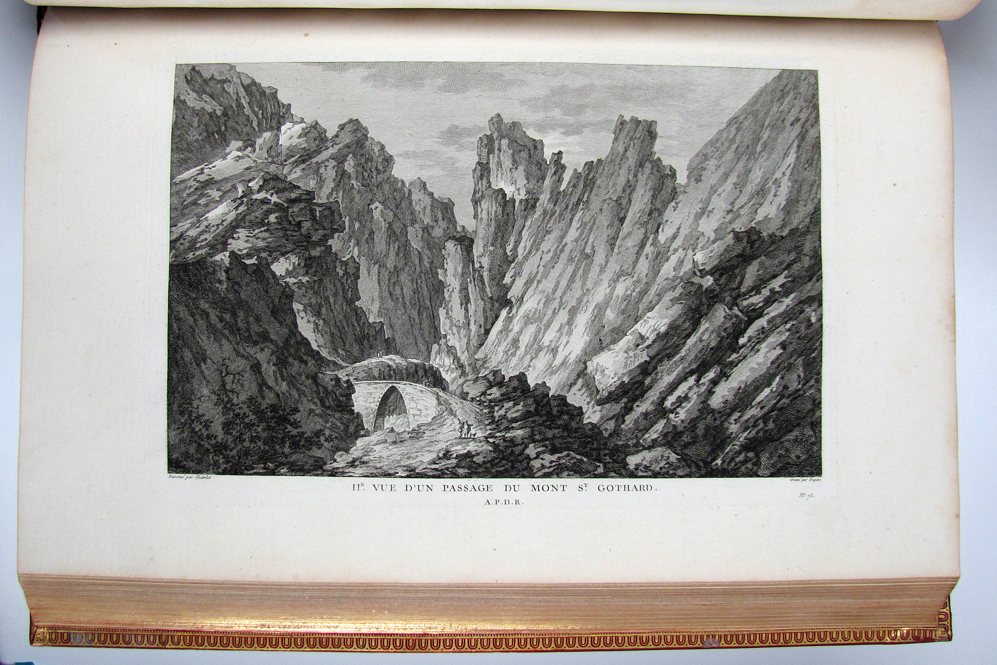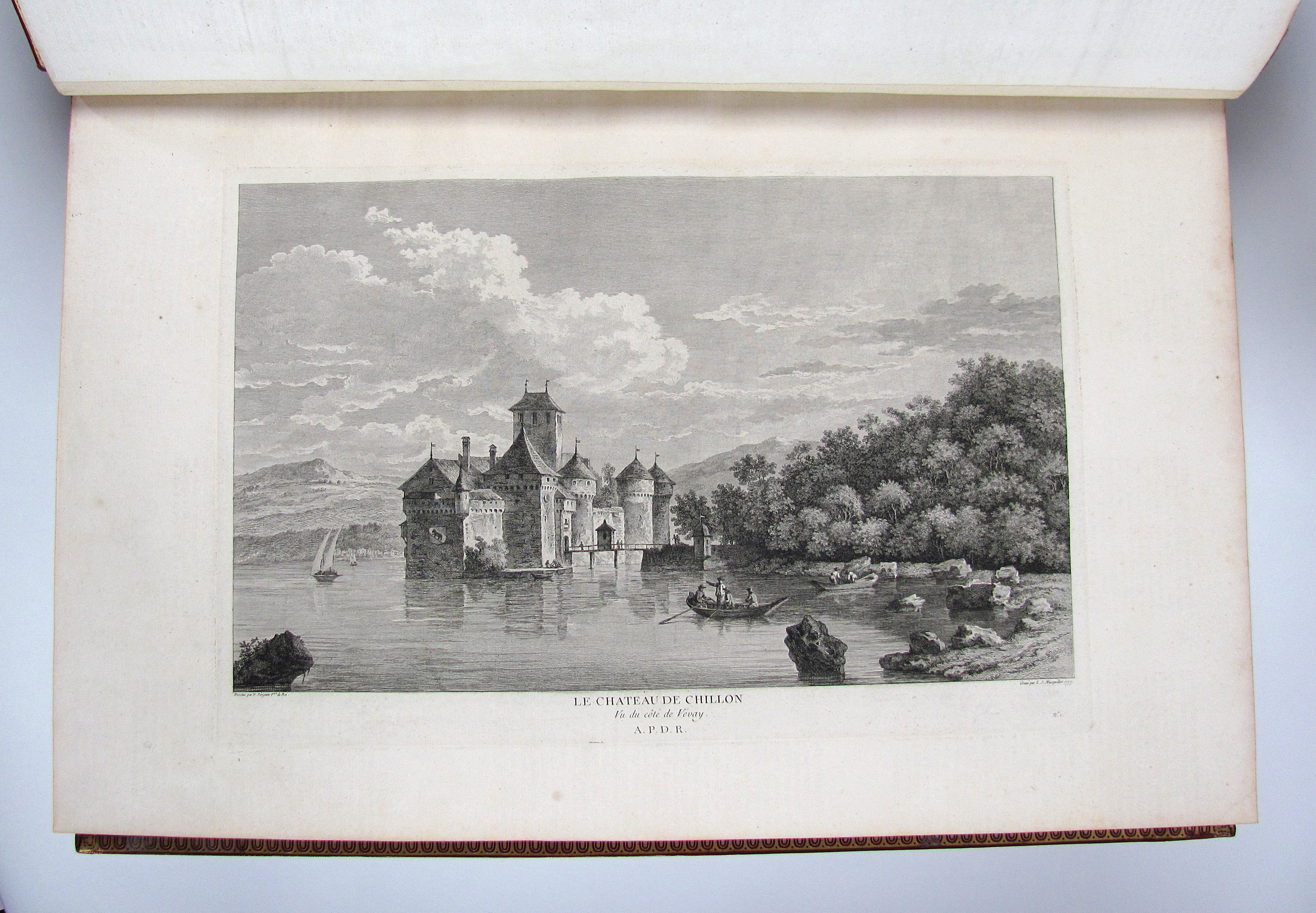 Komplettes Exemplar der ersten Ausgabe des schönsten, prächtigsten und umfangreichsten Schweizer Ansichtenwerks. Die sehr fein gestochenen Kupfer von de Longueil, Masquelier, Née u.a. nach Châtelet, Le Barbier, Moreau le Jeune u.a. zeigen zumeist Ansichten, ferner einige Karten, 2 Panoramen, Kostümdarstellungen, Porträts und Münzen. Zurlauben (1720-1799) published the first volume anonymously making it seem is if it was Laborde’s work. The second volume with a slightly different title bears Zurlauben’s name. His monumental work offers a wealth of facts about Switzerland, and is a testimony to his vast erudition. He cites sources and writes with ease, but with a serious approach which earned him the esteem of fellow scholars at home and abroad. The work is dedicated to the count of Artois, Colonel-General of Switzerland.– Das vorliegende Ausnahmeexemplar in besonders dekorativen Einbänden ist vollständig und wie folgt gegliedert: Textband I: 5 Bl. (Titelei mit gestoch. Wappenvignette), 10 S. (Subskribentenliste), LXXXIV (recte LXXIV) S., 368 S., LXVI S., 3 Bl. (Errata und Druckprivileg).– Textband II: 2 Bl., 7 S. (Tafelverzeichnis), 328 S.– Textband III: 1 Bl., S. 329-578, 8 S. (Tafelverzeichnis).– Tafelband I: Kupferfrontispiz, Drucktitel, 7 S., doblgr. Karte, num. Kupfer 1-217 (davon 5 doblgr. und 2 mehrf. gefalt.).– Tafelband II: 1 Bl. mit Porträt-Vignette, gestoch. Titel mit Vignette, num. Kupfer 218-278, „Table analytique“ (Generalregister) mit 2 Bl., 2 S. und 129 Seiten.– Die Kollation der Tafeln sorgt hin und wieder für Verwirrung. Dies kommt daher, dass im ersten Tafelband die Tafeln mit mehreren Kupfern auf einem Blatt nur eine Nummer tragen, während im zweiten Tafelband die einzelnen Kupfer nummeriert sind und nicht die Tafeln. Darüber hinaus nennt der Drucktitel auch noch eine Anzahl von 430 einzelnen Kupfern, es sind aber auf allen Tafeln nicht mehr als 391 Kupfer enthalten. Der erste Tafelband enthält, neben den oben einzeln erwähnten Illustrationen, 217 Tafeln mit 330 Kupfern und der zweite Band die nummerierten Kupfer 218-278 auf 31 Tafeln.– Vorsatz und Frontispiz von Tafelband I mit Knitterfalte, das Papier der Textbände gleichmässig leicht gebräunt oder minimal stockfleckig, einige ganz wenige Seiten Text etw. stärker gebräunt, die Seiten 75-78 in Textband II mit kleinem Wasserrand unten links, eine doppelblattgr. Tafel (Nr. 185) gebräunt. Die Einbände frisch und kaum berieben oder bestossen. Vorderdeckel von Tafelband I mit Schabstellen, oberes Kapital von Tafelband II mit winziger Fehlstelle. Insgesamt sehr gut erhaltenes und breitrandiges Prachtexemplar. Papier 50 x 32,5 cm., Einbände 51,5 x 35 cm.– Longchamp 3362, Cohen-R. 1075. Fürstenberg 46, 101, 110 und 151. Brunet V, 1546.