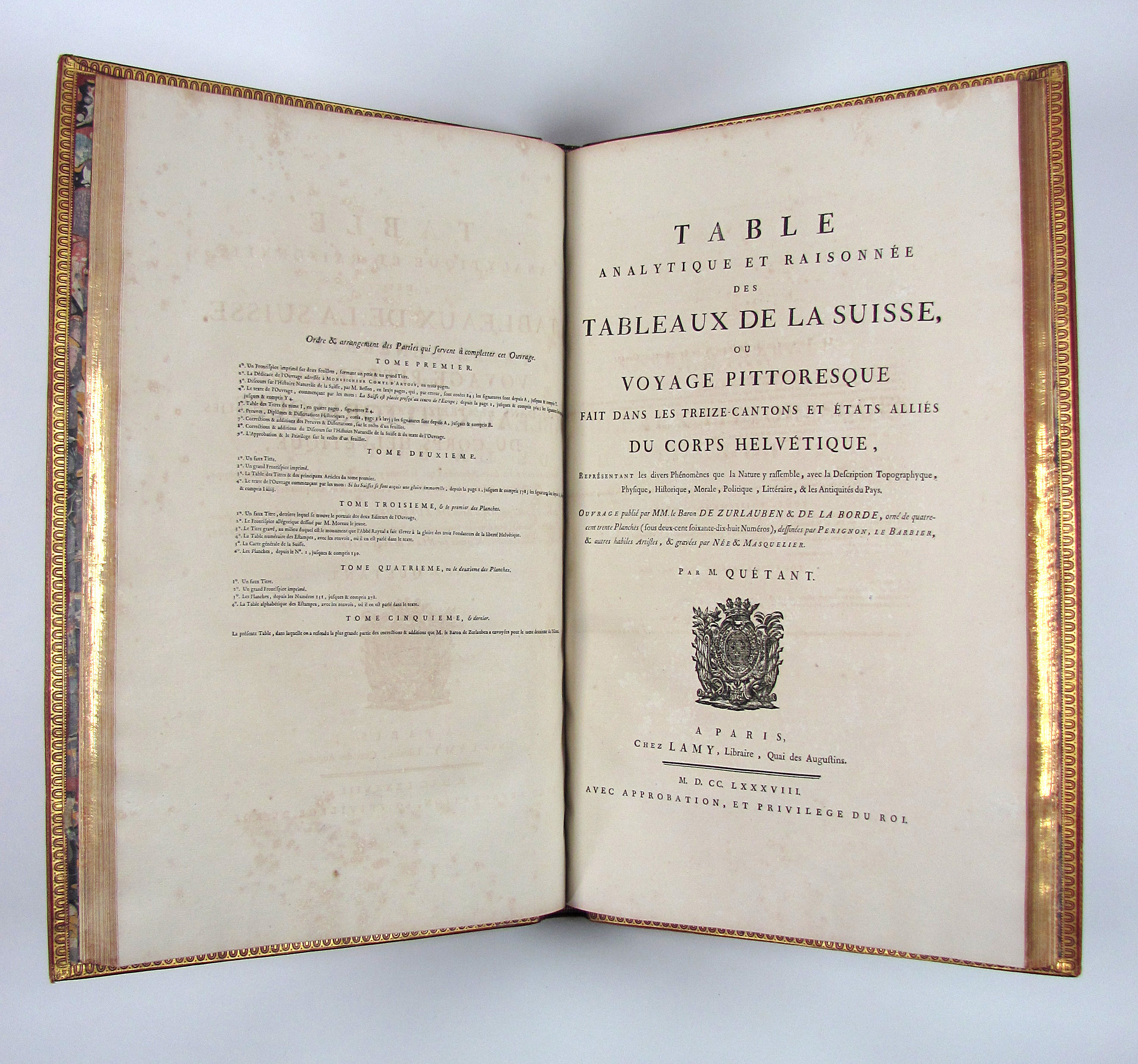 Tableaux topographiques, pittoresques, physiques, historiques, moraux, politiques, littéraires de la Suisse. Tableaux de la Suisse, ou voyage pittoresque fait dans les treize cantons et états alliés du corps Helvetique.– Hauptwerk, Supplement und „Table analytique et raisonnée“ von François Antoine Quétant in 5 Bänden.