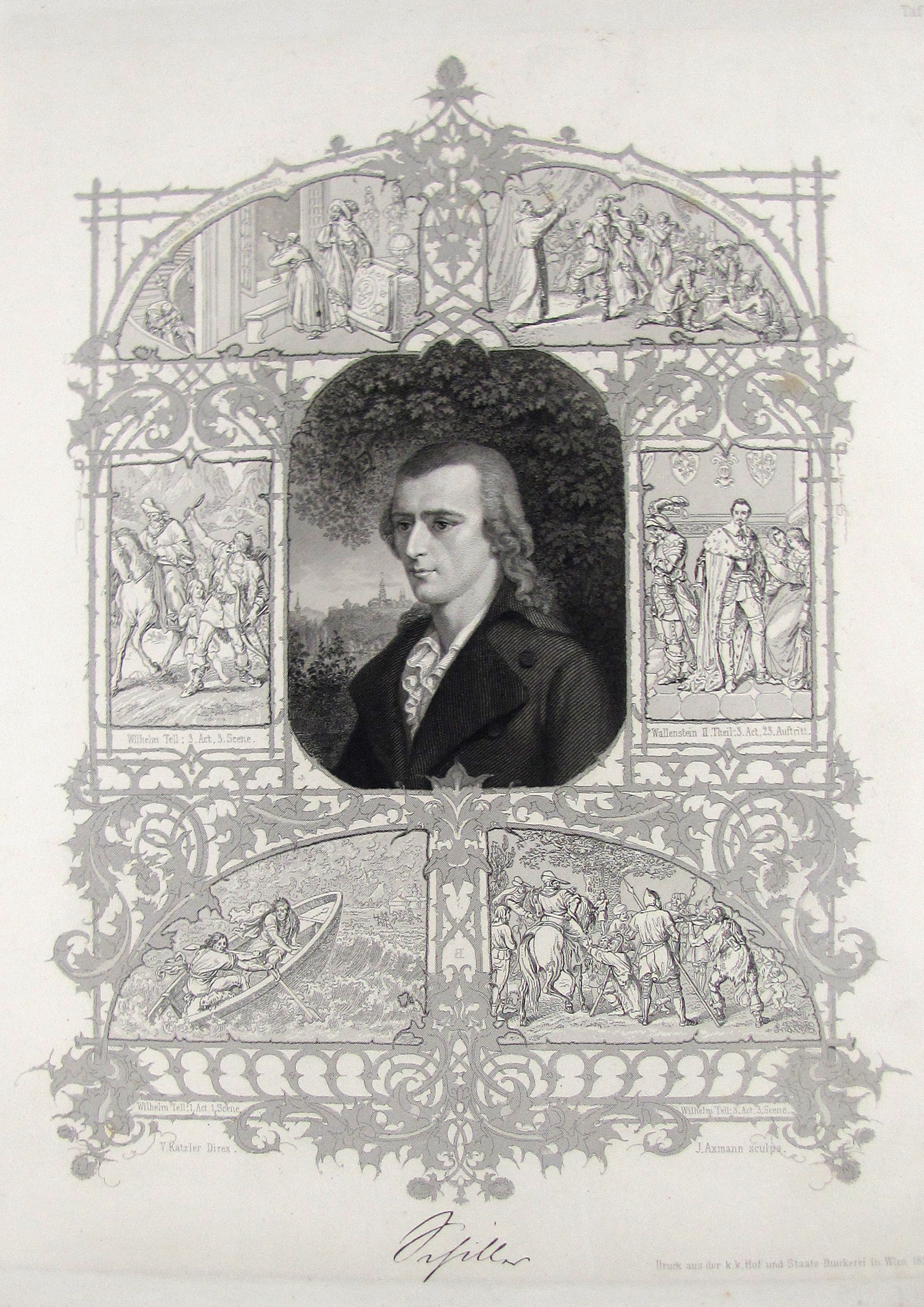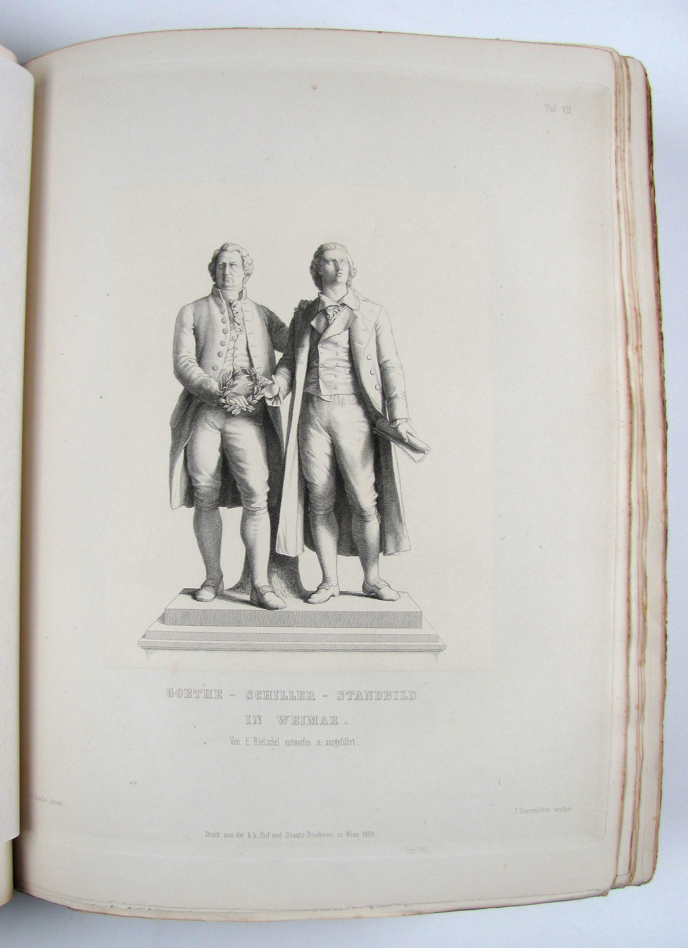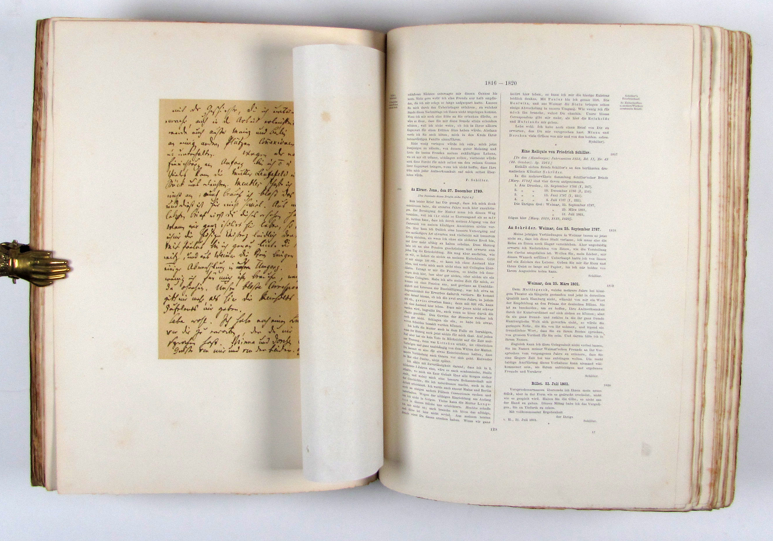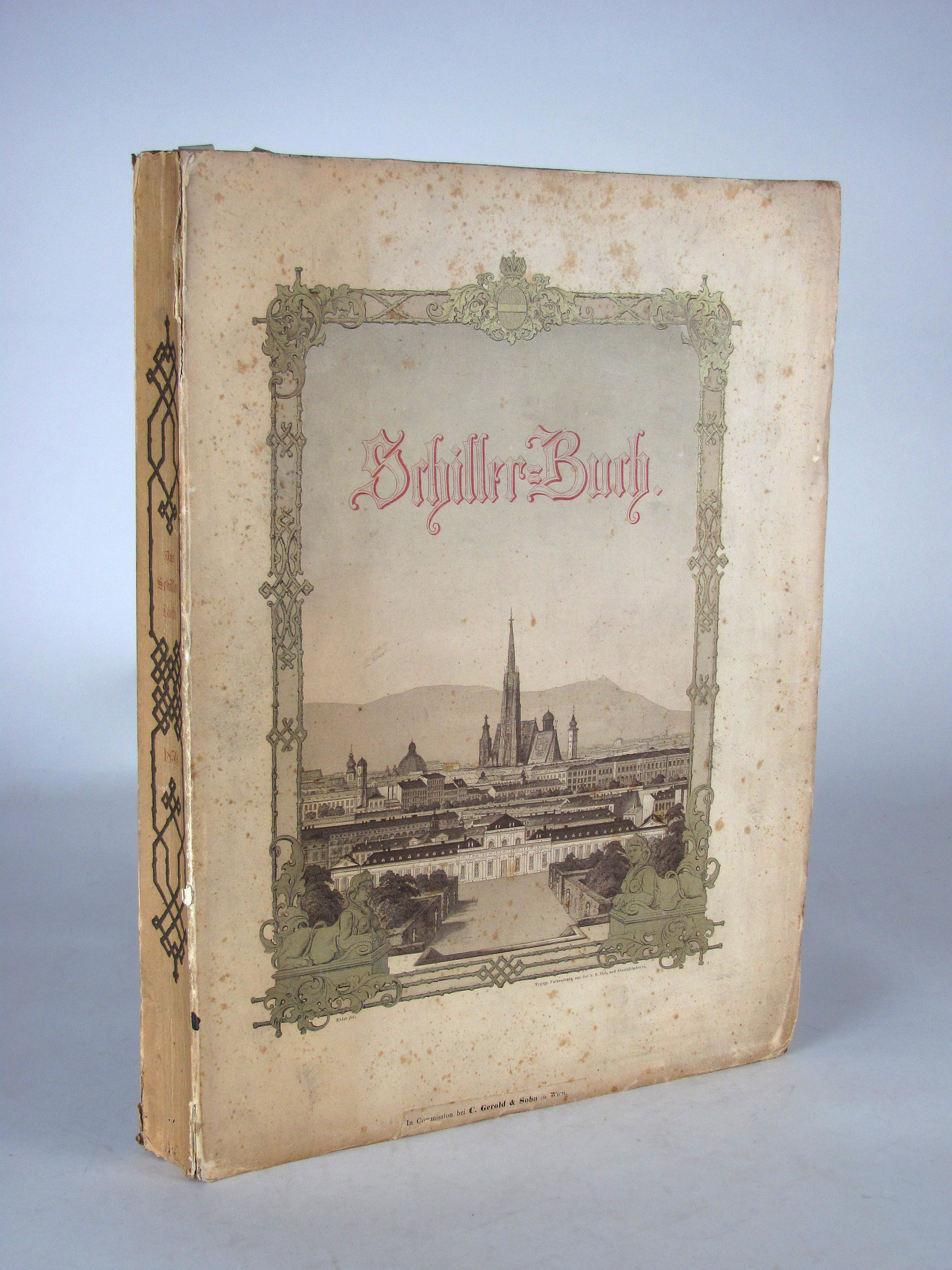 Unter den Tafeln zahlreiche Ansichten von Wohnorten und -häusern Schillers, darunter schöne lithogr. kolorierte Gesamtansicht von Marbach. Unbeschnittenes Exemplar, innen tadelloses Exemplar, die Broschur fleckig und oberen Vordergelenk leicht angeplatzt.