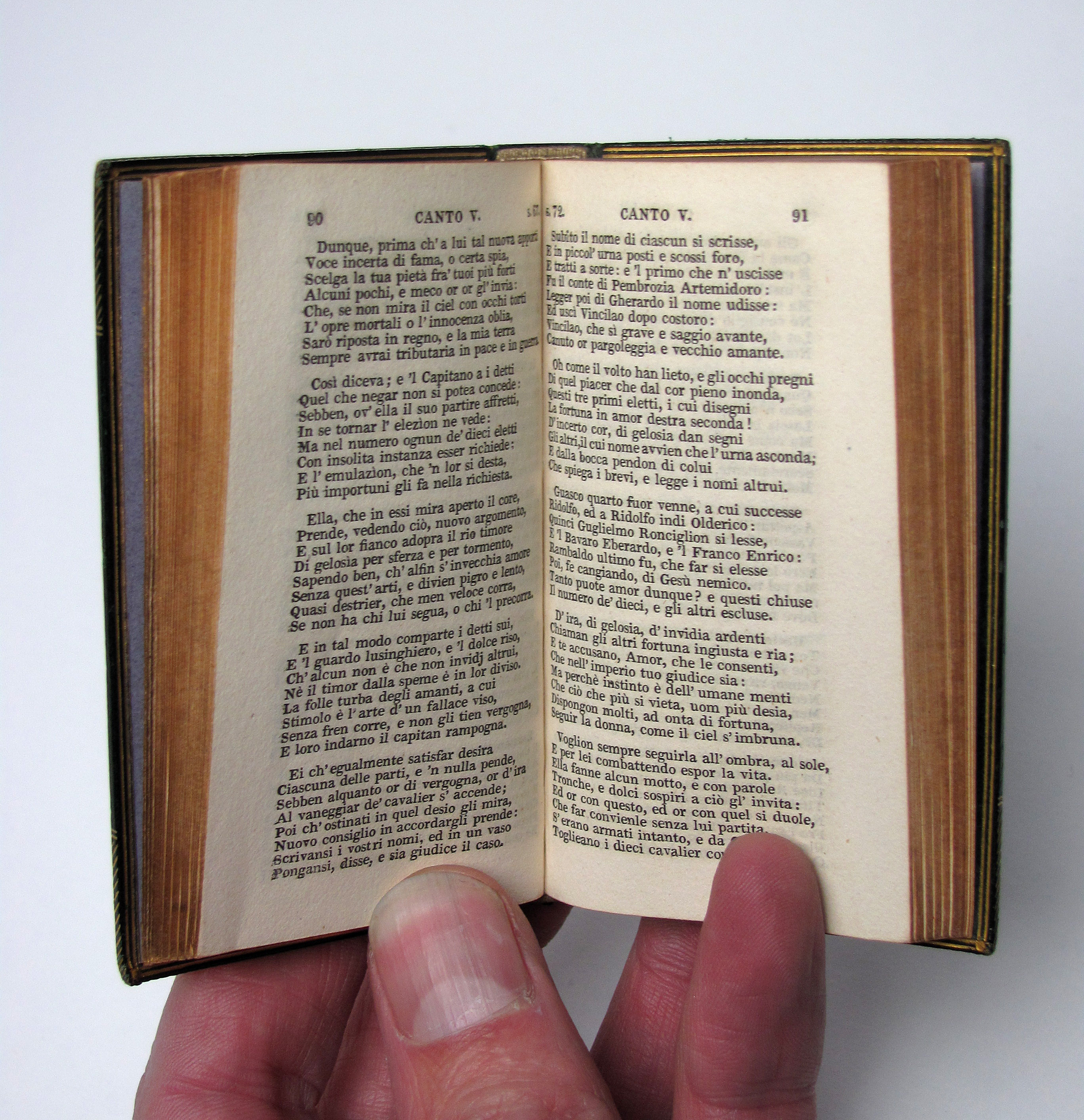 Für die Reihe der Diamond Classics wurde eine eigene Schrift erschaffen, die Diamond-Type, welche vom Drucker C. Corall verwendet wurde. Obwohl die Büchlein das Normmaß für Miniaturbücher (76 mm. Höhe) minimal übersteigen, sind sie doch von Sammlern und Bibliographen als hervorragende Beispiele für qualitätvolle Miniturbücher anerkannt. Ein Grund dafür ist die herausragende 4 1/2-Punkt große Diamond-Type, die gestochen scharf auf dem Papier steht, die Sorgfalt der Binderei und nicht zuletzt die Textauswahl.– Das vorliegende Exemplar in zwei hervorragenden Einbänden der Zeit und sehr gut erhalten.– Welsh 6608. Bondy S. 85.