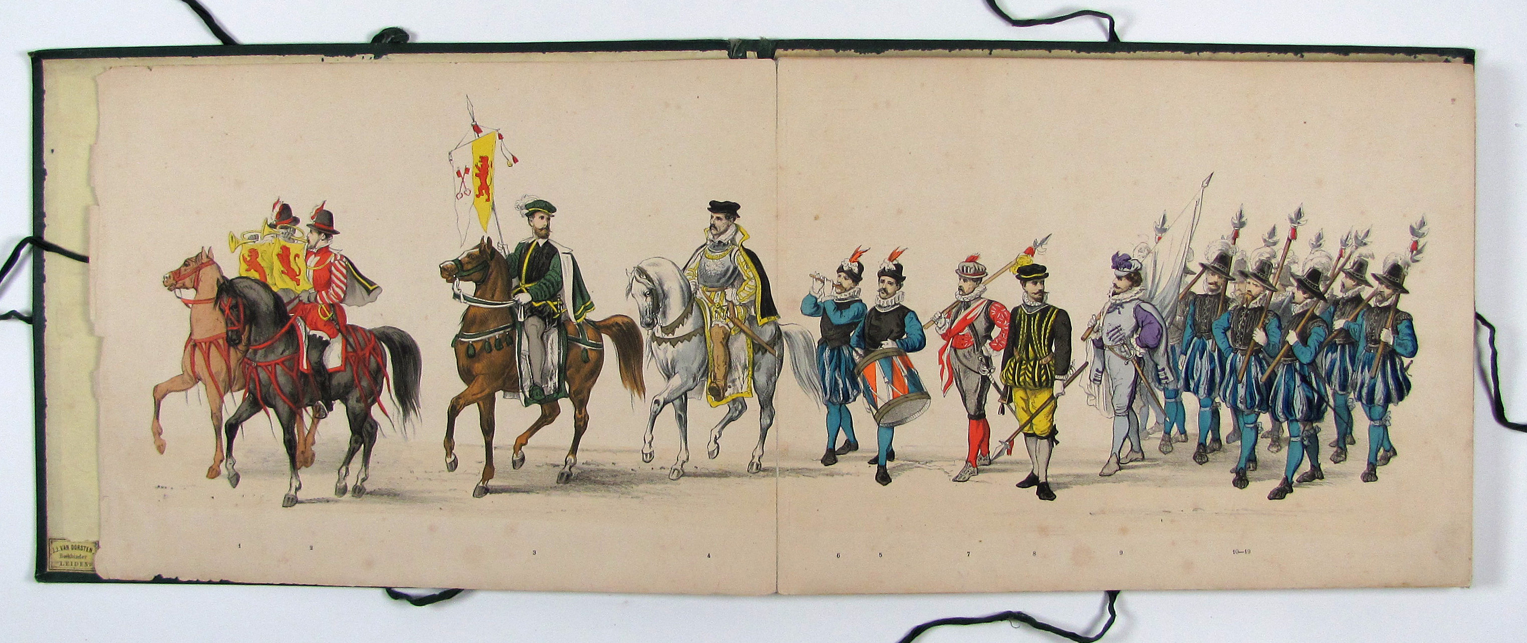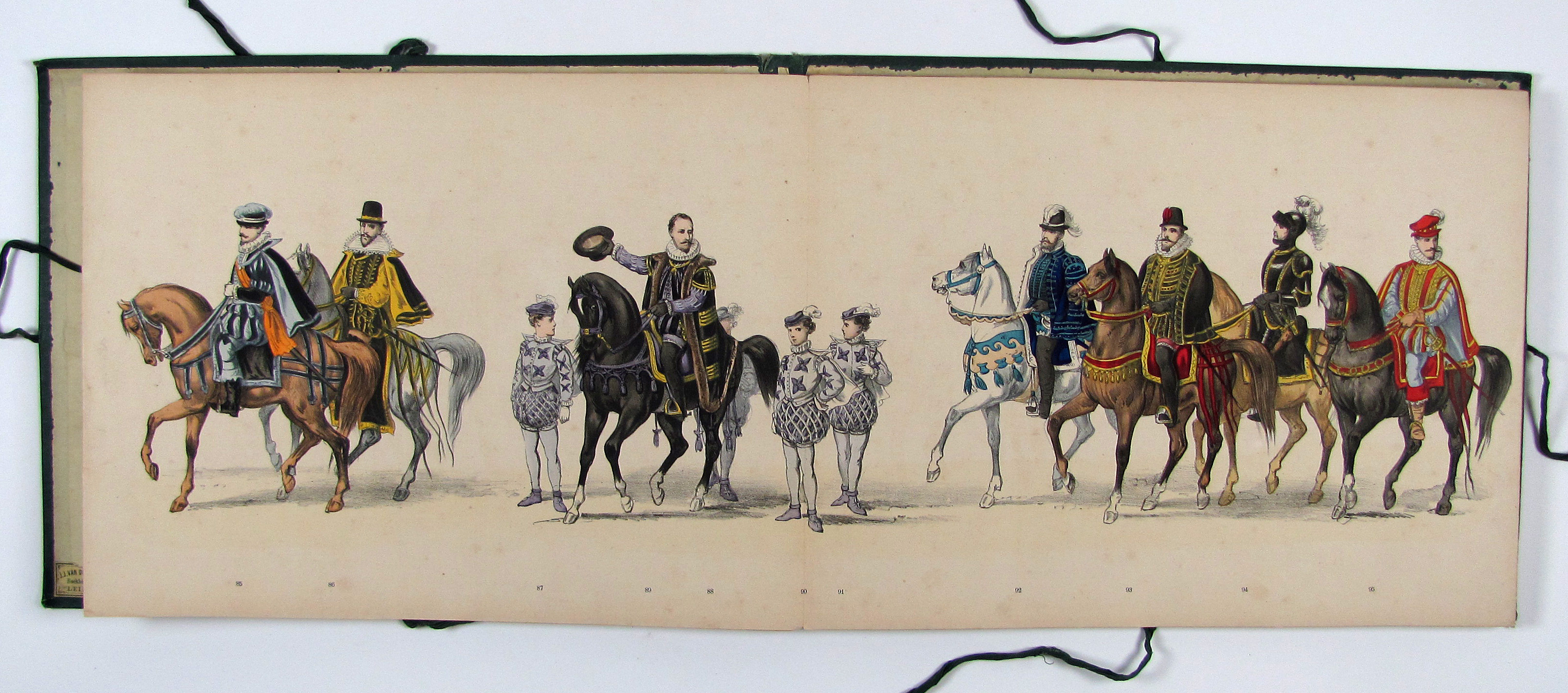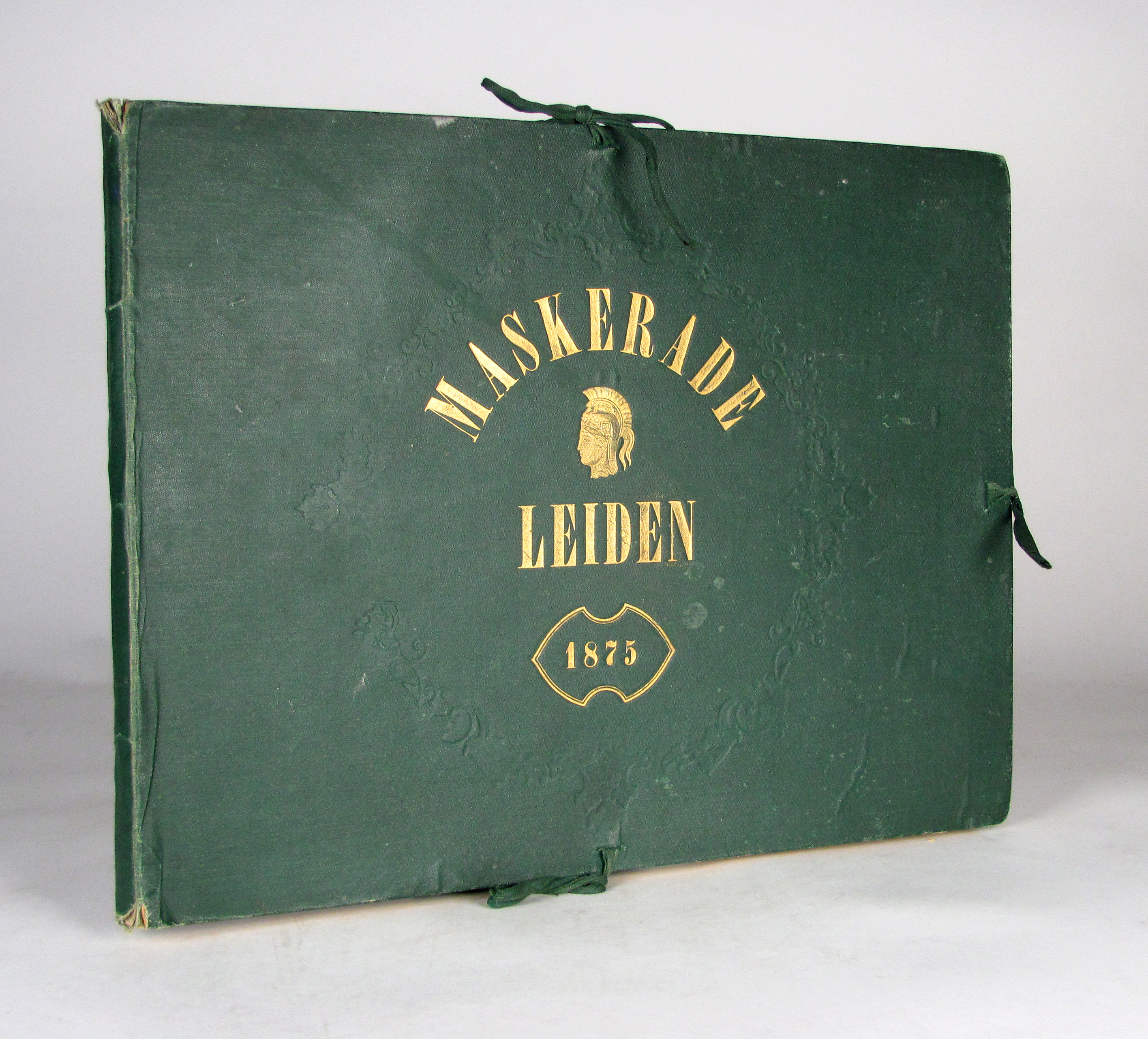 Hübsches, ungewöhnlich großformatiges Leporello zur Feier des 300-jährigen Bestehens der Universität. Die Mitglieder der Studentenverbindungen in historischen Kostümen und zu Fuß oder beritten unterwegs, stellen die nahmhaftesten Persönlichkeiten in der Geschichte der Hochschule dar. Das Ende des Zuges bildete en Prunkwagen mit Allegorien der unterrichteten Fächer.– Ein hier nicht vorhandenes Begleitheft mit 8 Seiten trägt den Titel: „Maskerade gehouden door de leden van het Leidsche Studenten-Corps den 15den Juni 1875, ter viering van den 300sten verjaardag der Leidsche Hoogeschool, voorstellende de Leidsche Hoogeschool, afgebeeld in de beroemdste en merkwaardigste mannen, die van hare stichting af hun naam aan den haren hebben verbonden. Overeenkomstig de teekeningen door de commissarissen tot regeling van de maskerade verstrekt en onder hun toezicht geteekend en op steen gebragt door G.J. Bos.“.– Das Leporello vom Einband gelöst, einige wenige kleine Einrisse an den Fälzen, ansonsten gut und farbfrisch erhalten.– Nicht bei Lipperheide Kostümbibliothek und Landwehr, Dutch books with coloured plates.