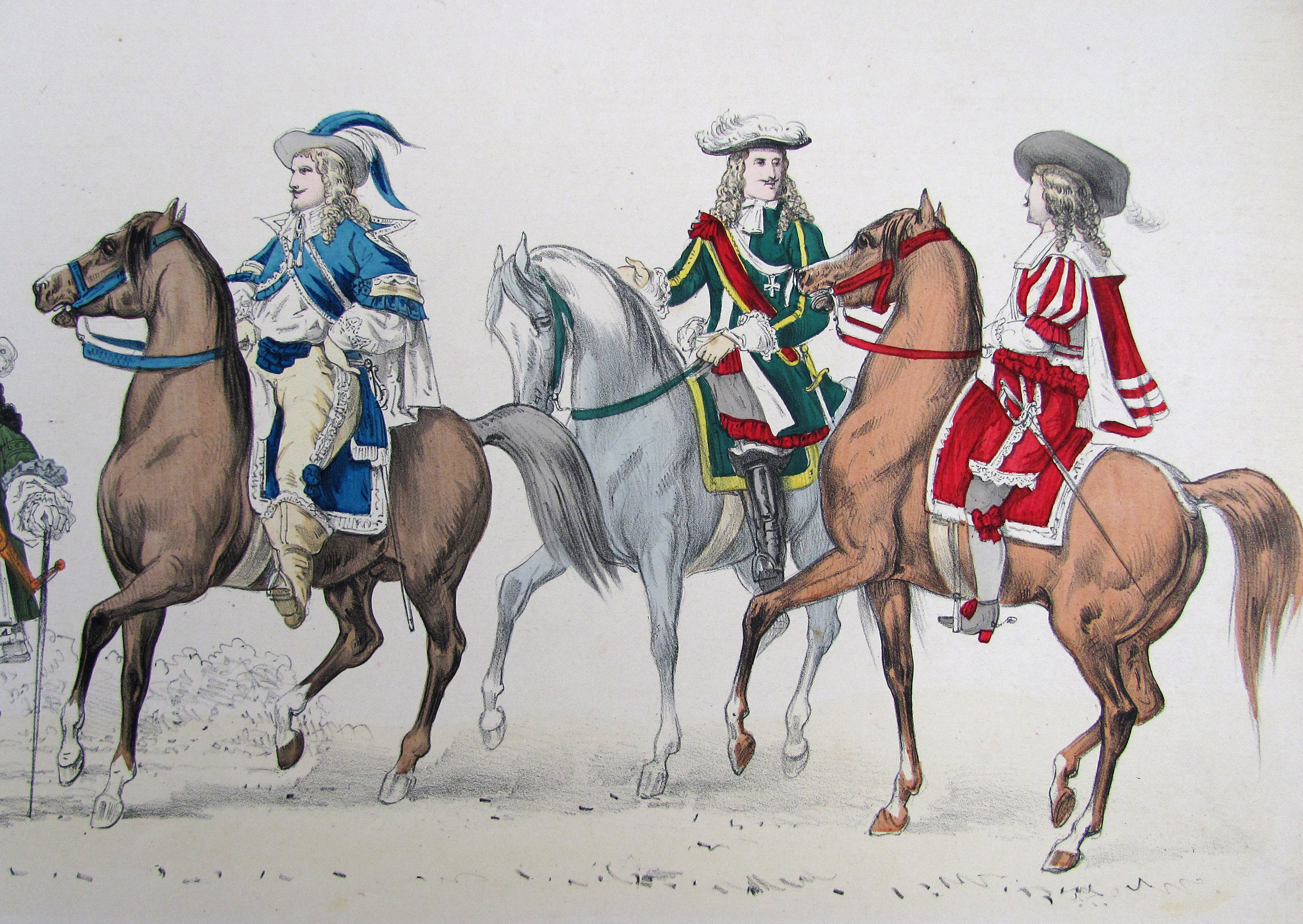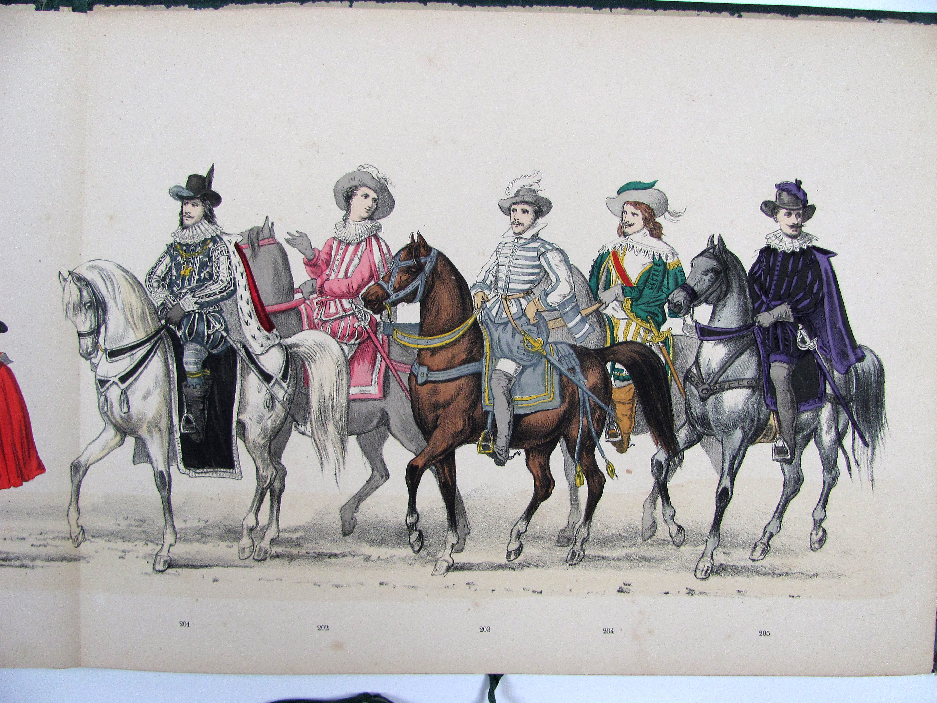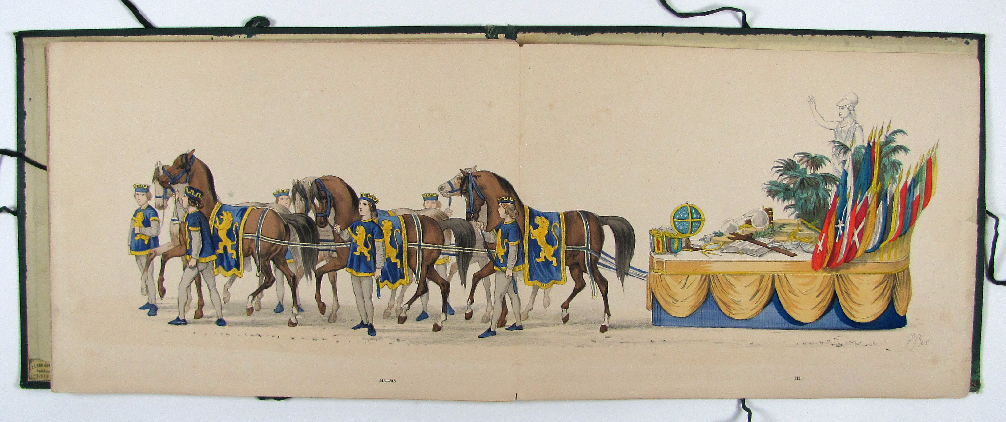 Hübsches, ungewöhnlich großformatiges Leporello zur Feier des 300-jährigen Bestehens der Universität. Die Mitglieder der Studentenverbindungen in historischen Kostümen und zu Fuß oder beritten unterwegs, stellen die nahmhaftesten Persönlichkeiten in der Geschichte der Hochschule dar. Das Ende des Zuges bildete en Prunkwagen mit Allegorien der unterrichteten Fächer.– Ein hier nicht vorhandenes Begleitheft mit 8 Seiten trägt den Titel: „Maskerade gehouden door de leden van het Leidsche Studenten-Corps den 15den Juni 1875, ter viering van den 300sten verjaardag der Leidsche Hoogeschool, voorstellende de Leidsche Hoogeschool, afgebeeld in de beroemdste en merkwaardigste mannen, die van hare stichting af hun naam aan den haren hebben verbonden. Overeenkomstig de teekeningen door de commissarissen tot regeling van de maskerade verstrekt en onder hun toezicht geteekend en op steen gebragt door G.J. Bos.“.– Das Leporello vom Einband gelöst, einige wenige kleine Einrisse an den Fälzen, ansonsten gut und farbfrisch erhalten.– Nicht bei Lipperheide Kostümbibliothek und Landwehr, Dutch books with coloured plates.